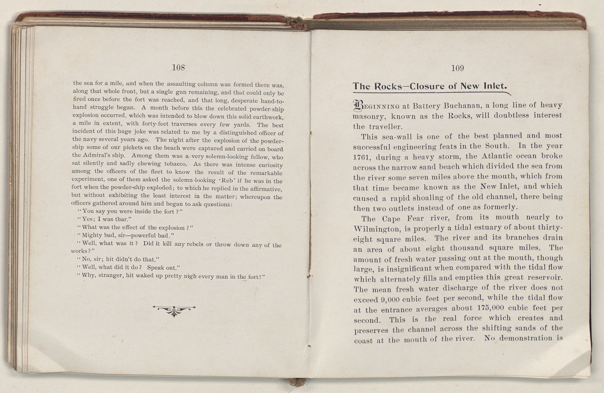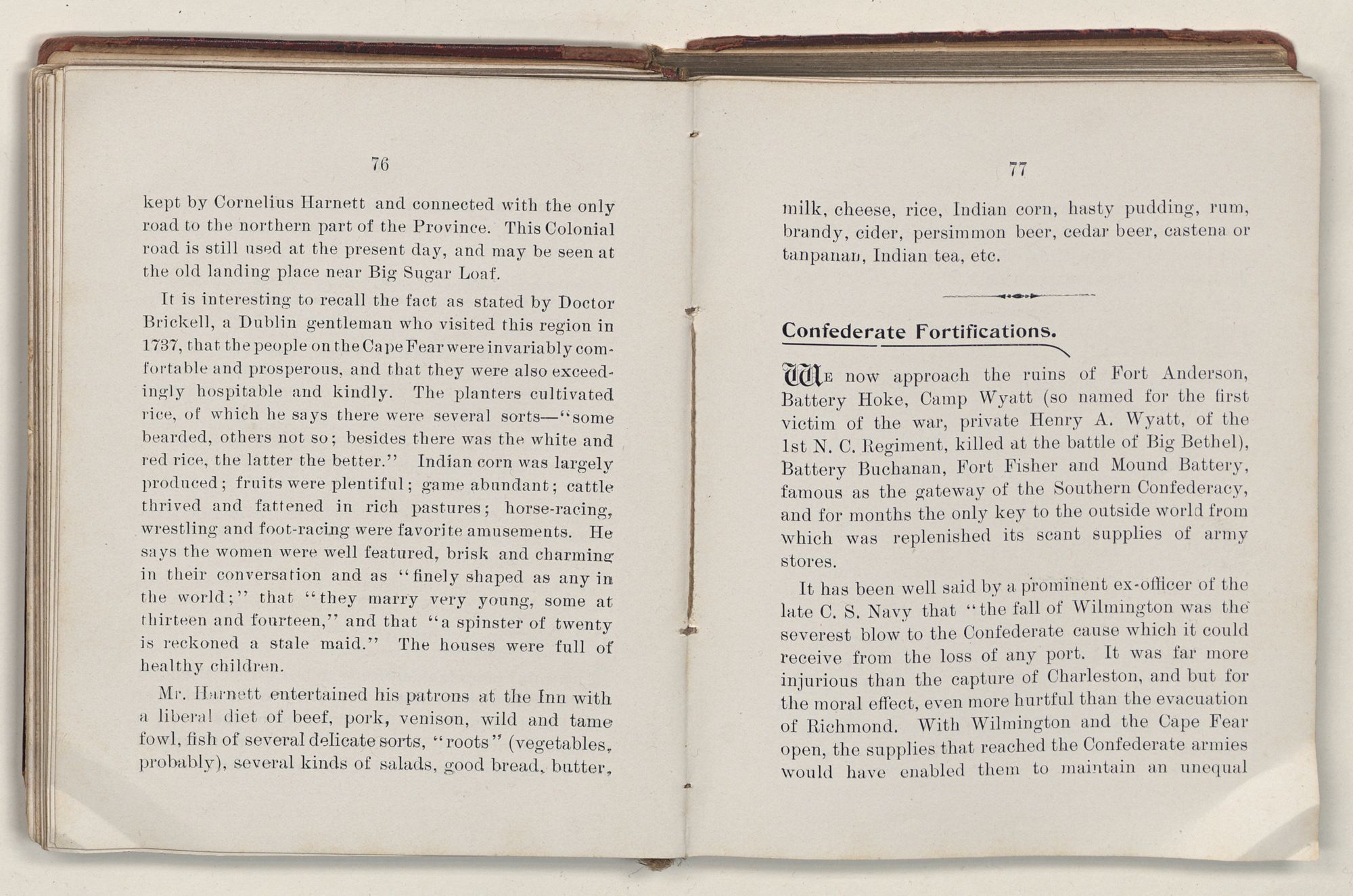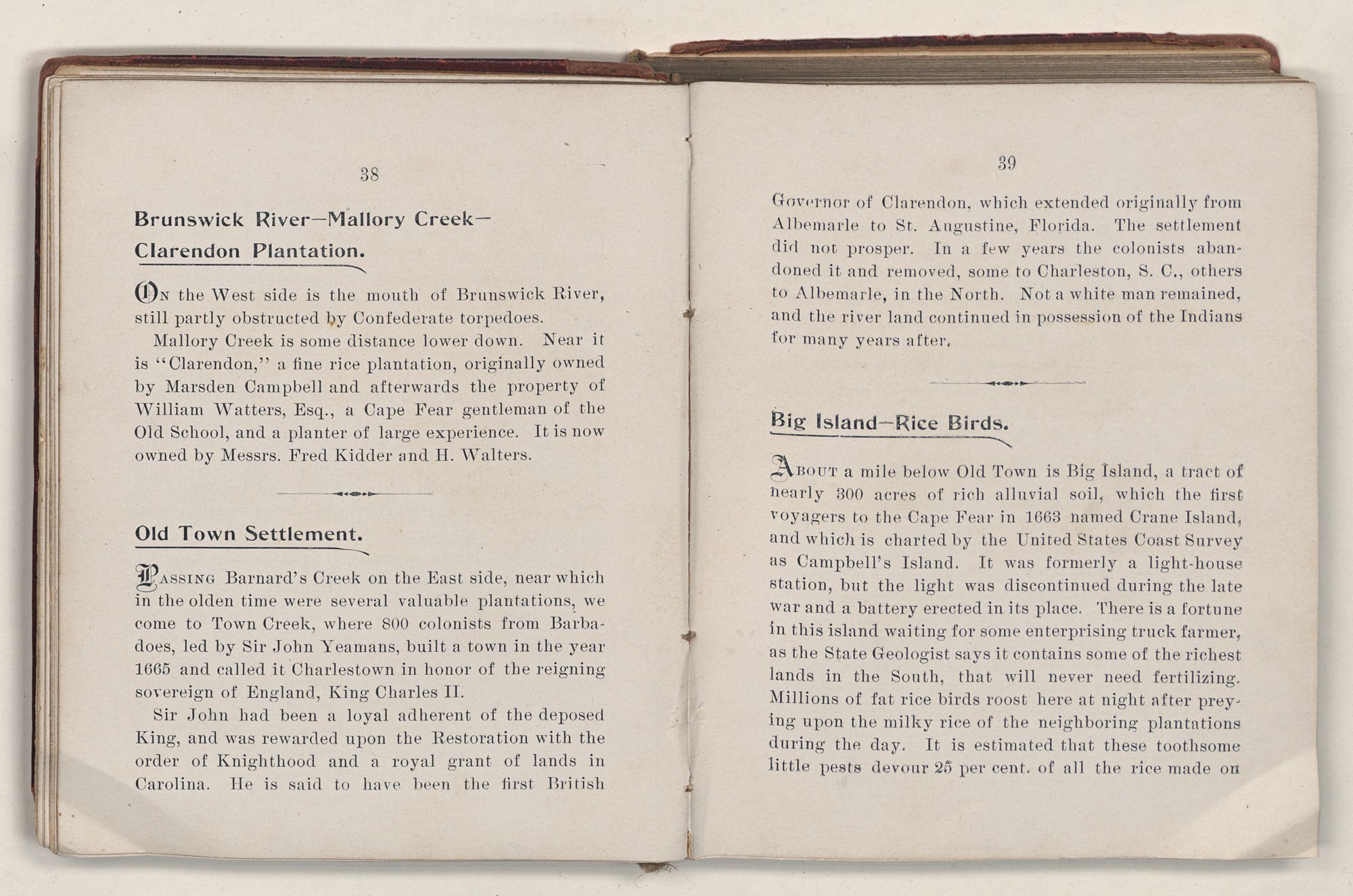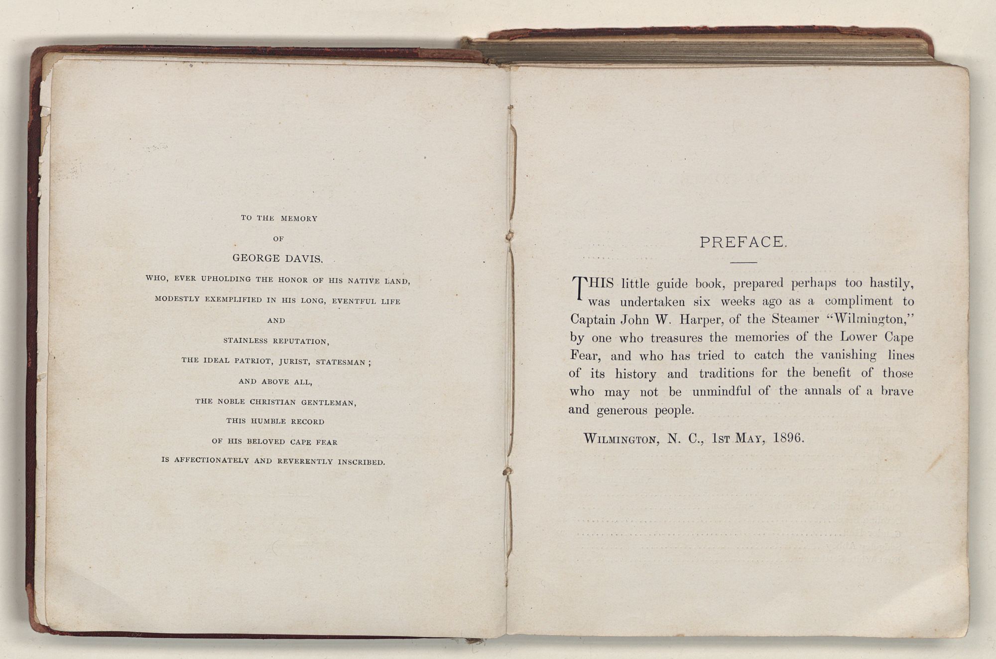 PREFACE.THIS little guide book, prepared perhaps too hastily, was undertaken six weeks ago as a compliment to Captain John W. Harper, of the Steamer “Wilmington,” by one who treasures the memories of the Lower Cape Fear, and who has tried to catch the vanishing lines of its history and traditions for the benefit of those who may not be unmindful of the annals of a brave and generous people.