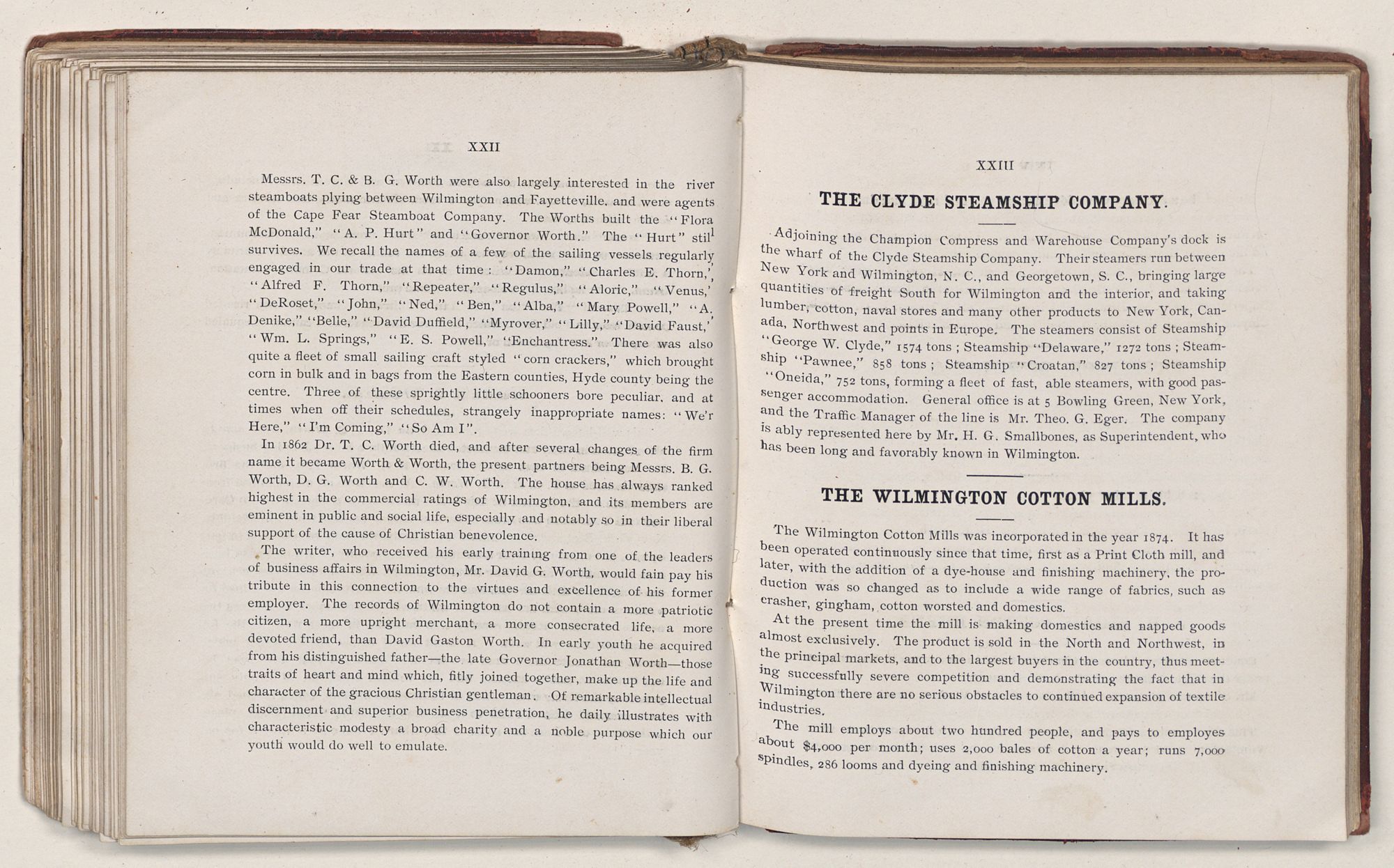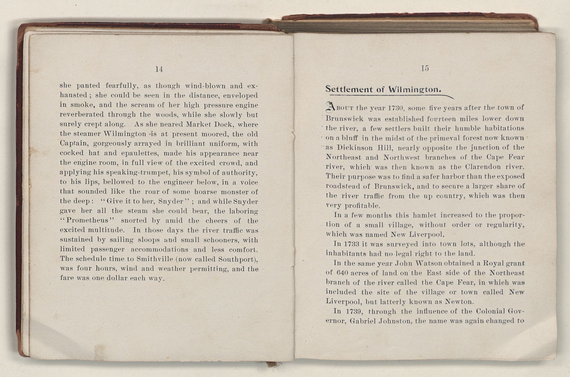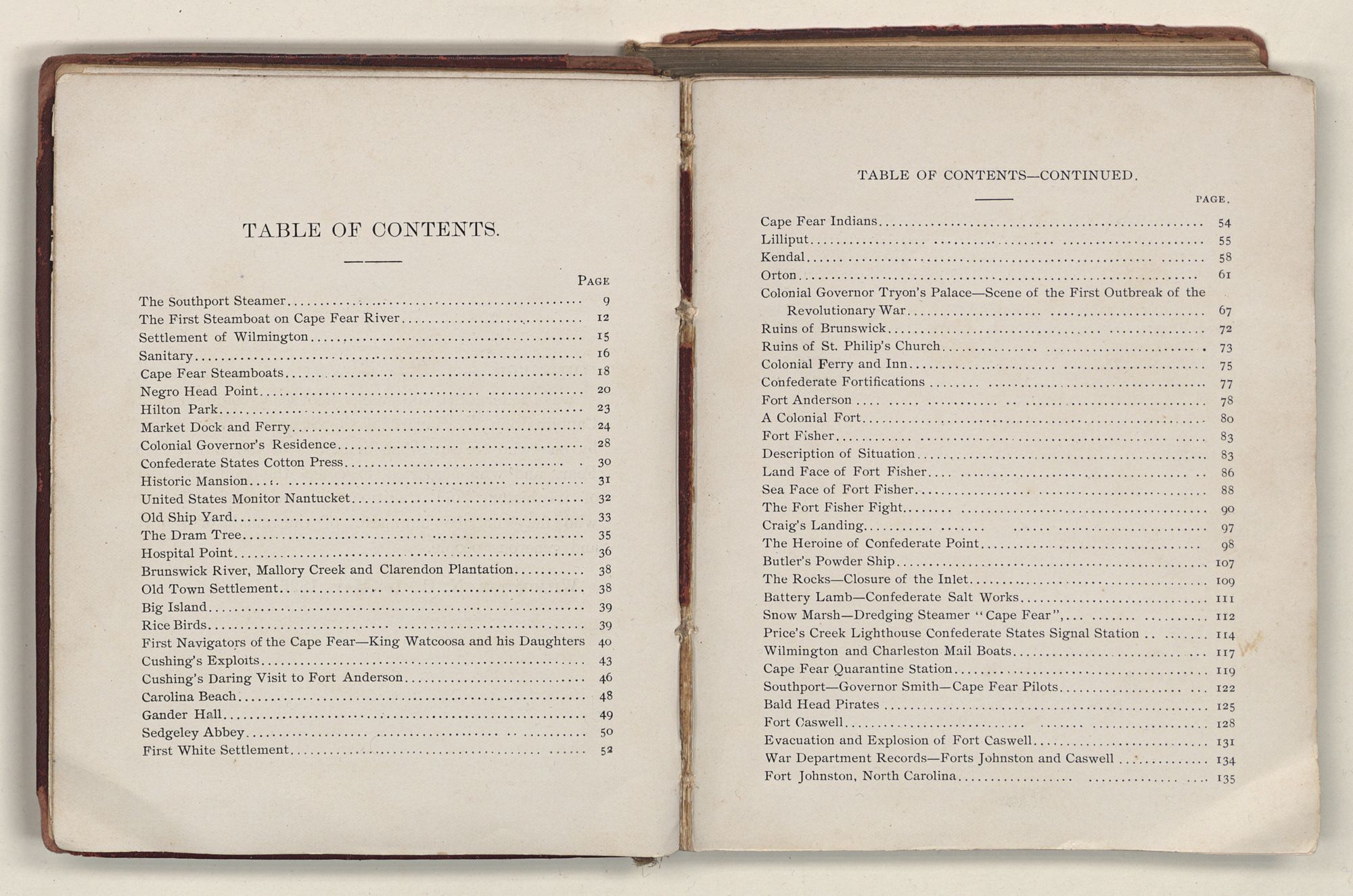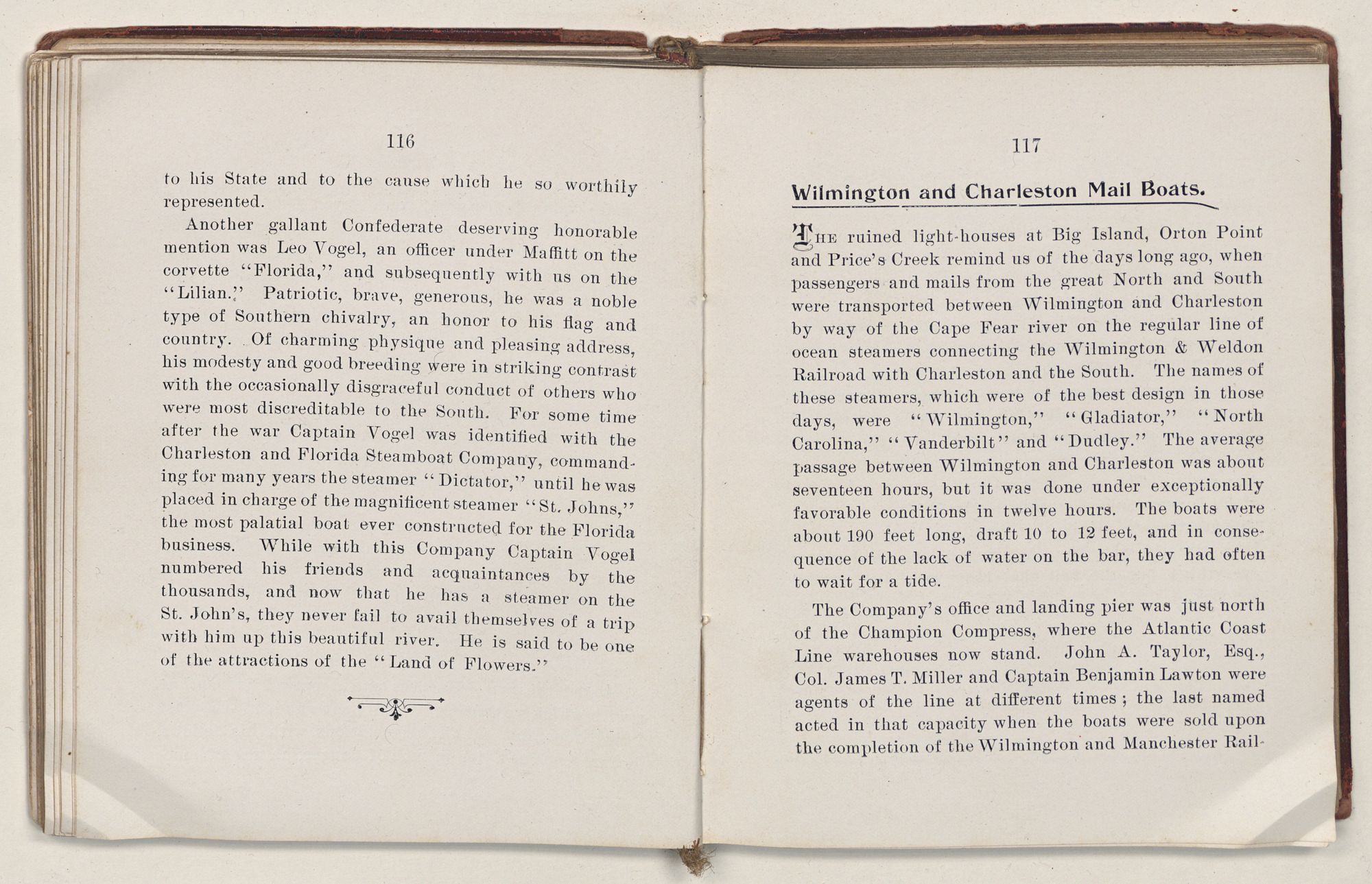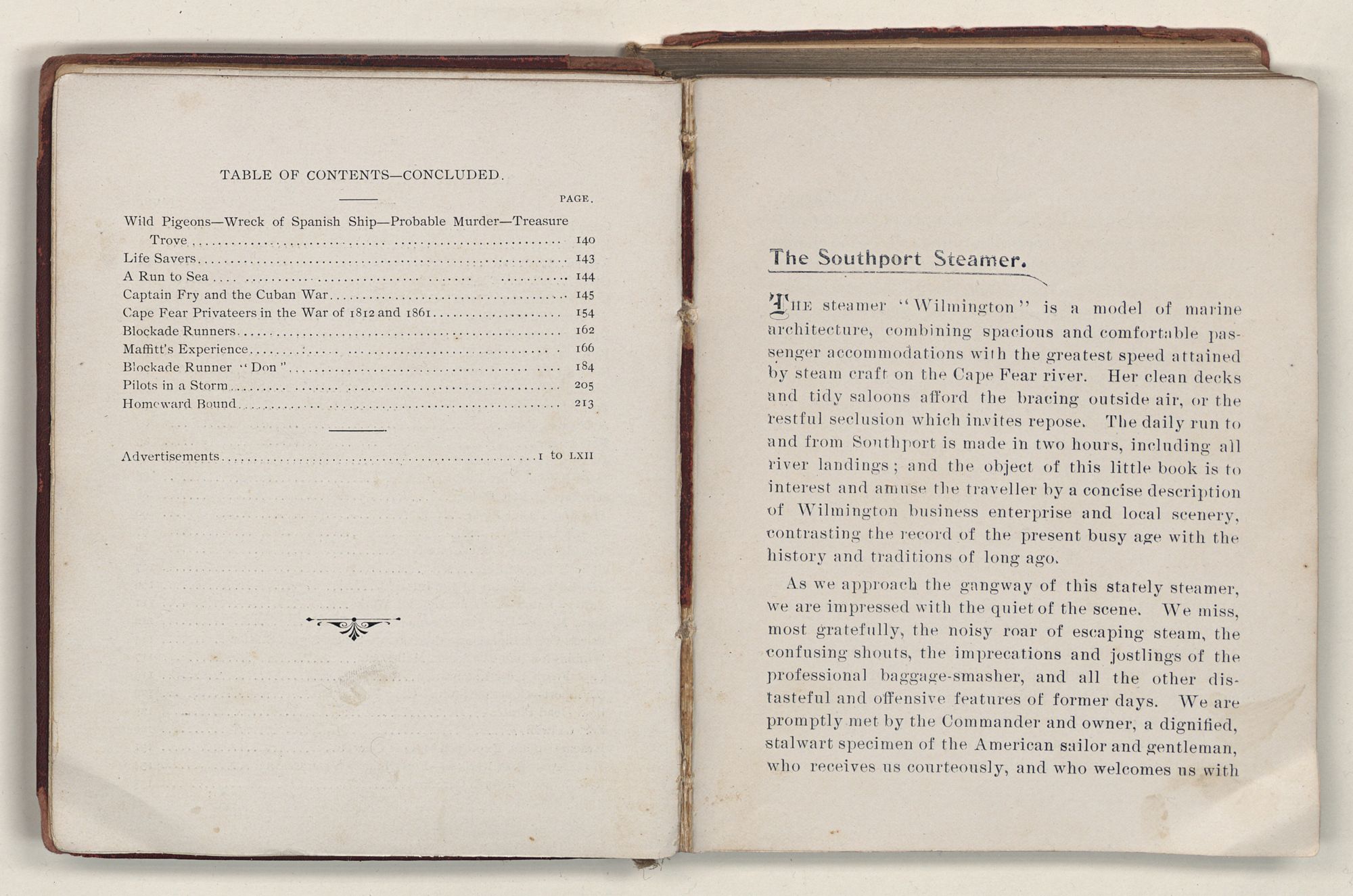 THE steamer “Wilmington” is a model of marine architecture, combining spacious and comfortable passenger accommodations with the greatest speed attained by steam craft on the Cape Fear river. Her clean decks and tidy saloons afford the bracing outside air, or the restful seclusion which invites repose. The daily run to and from Southport is made in two hours, including all river landings; and the object of this little book is to interest and amuse the traveller by a concise description of Wilmington business enterprise and local scenery, contrasting the record of the present busy age with the history and traditions of long ago.