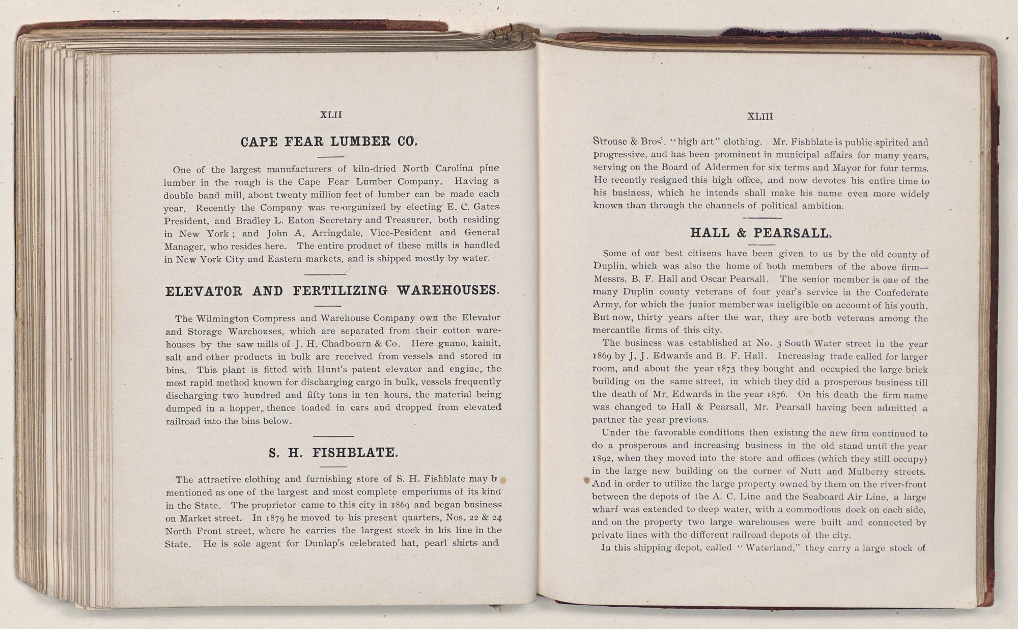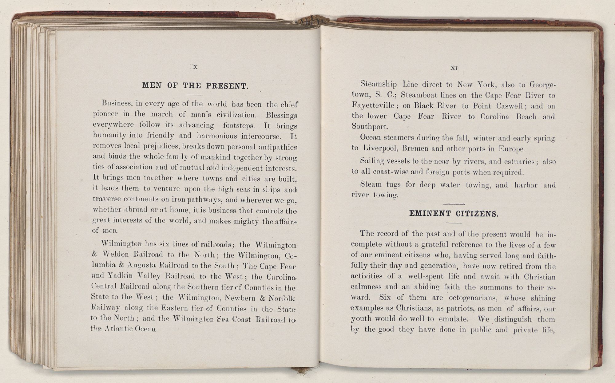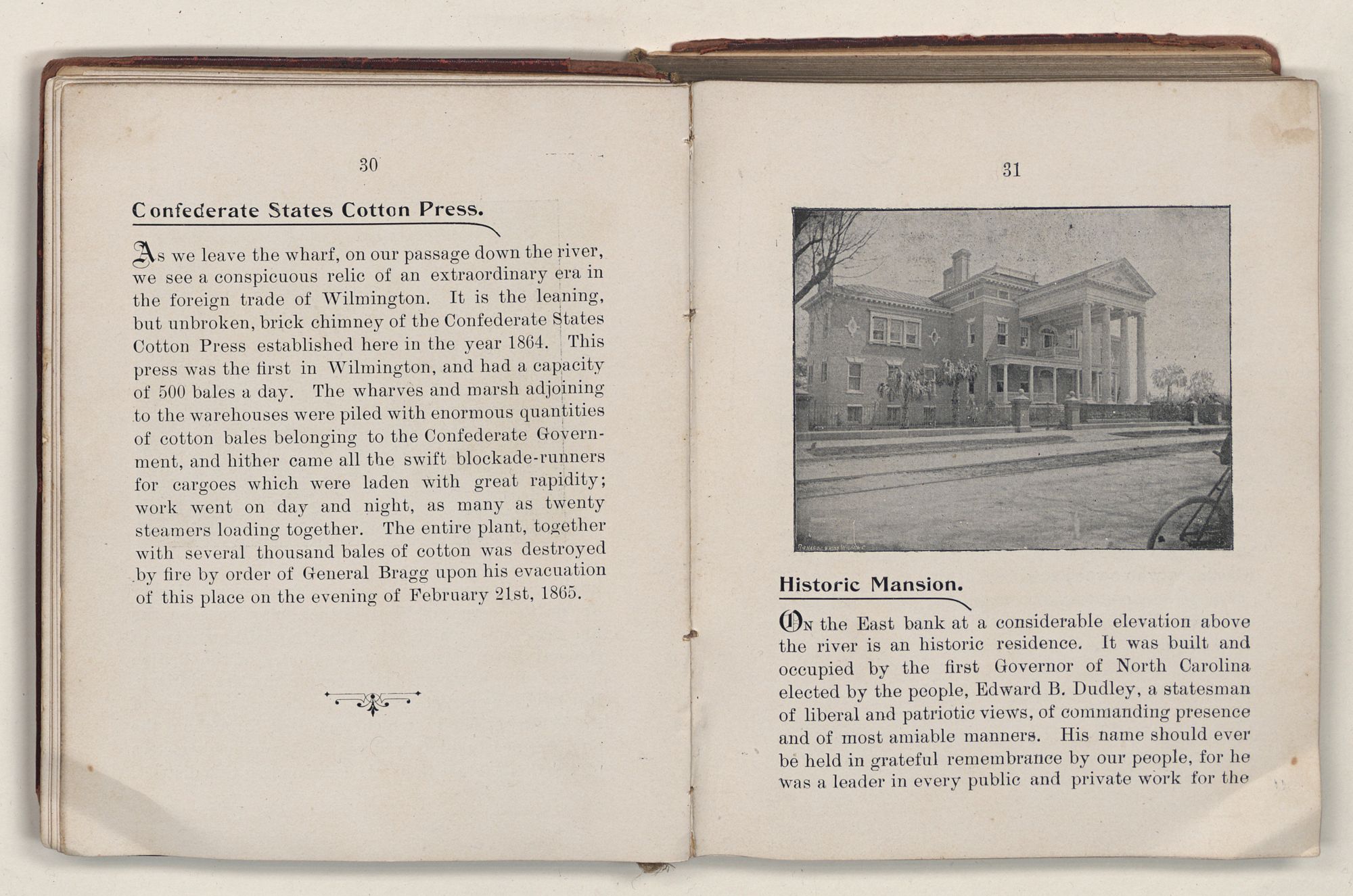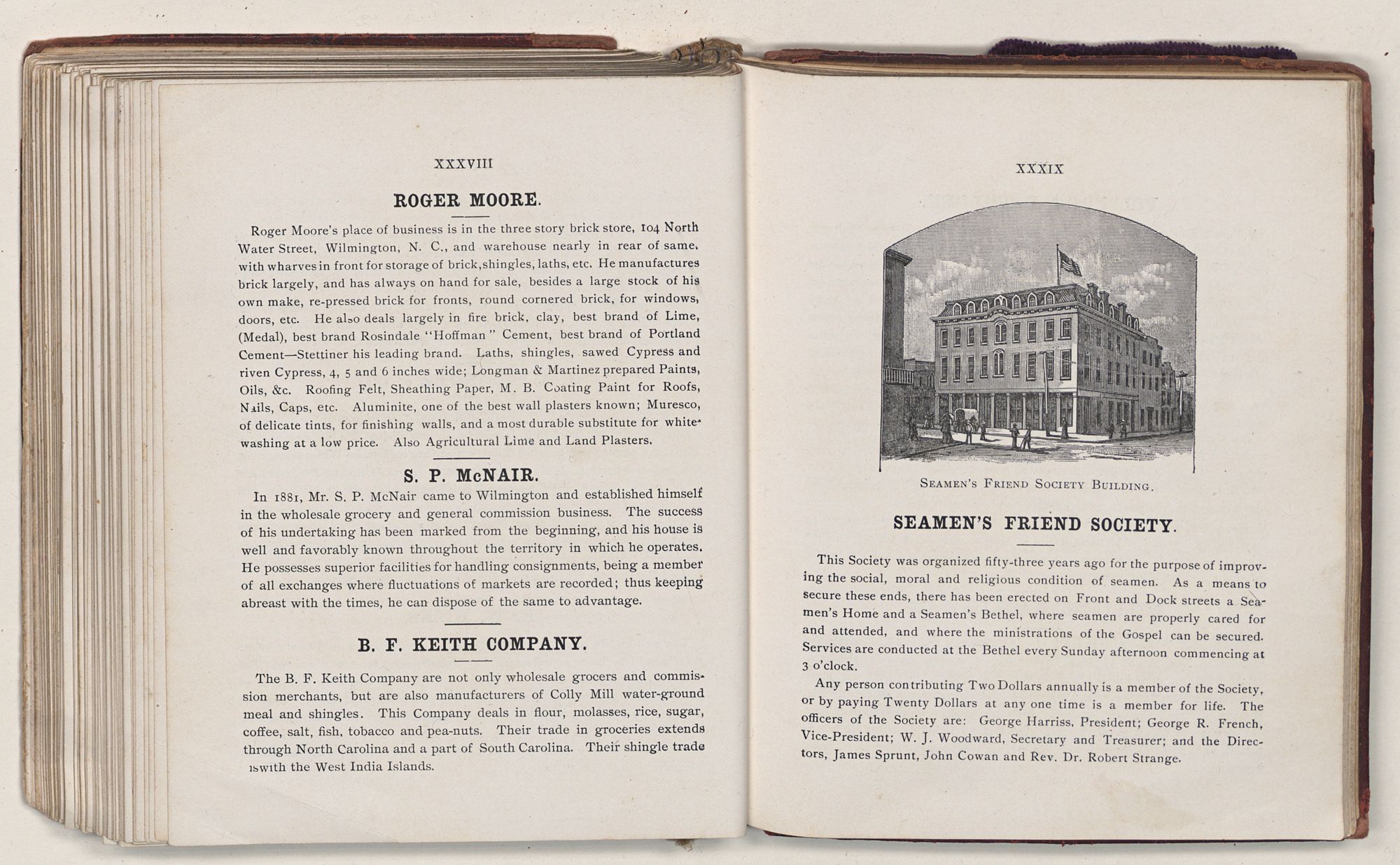 THE steamer “Wilmington” is a model of marine architecture, combining spacious and comfortable passenger accommodations with the greatest speed attained by steam craft on the Cape Fear river. Her clean decks and tidy saloons afford the bracing outside air, or the restful seclusion which invites repose. The daily run to and from Southport is made in two hours, including all river landings; and the object of this little book is to interest and amuse the traveller by a concise description of Wilmington business enterprise and local scenery, contrasting the record of the present busy age with the history and traditions of long ago.