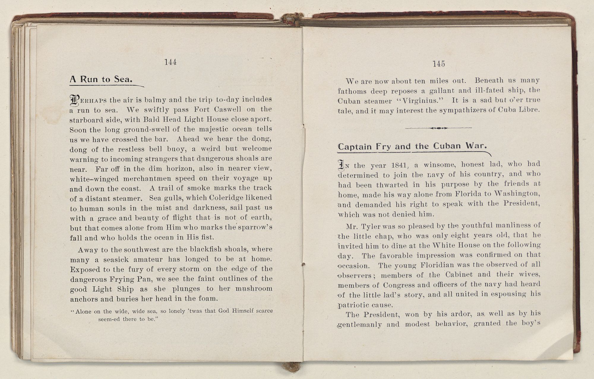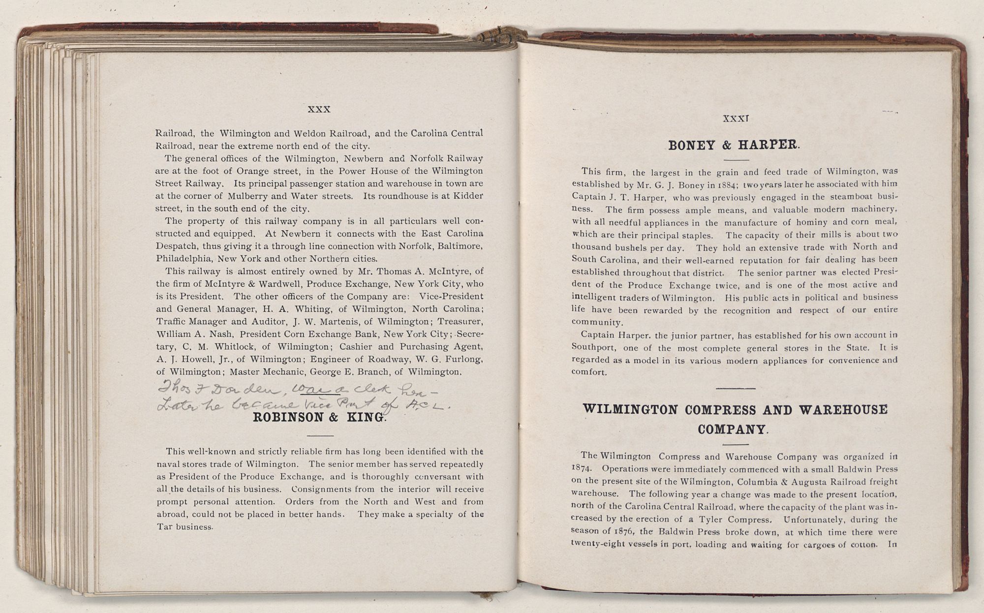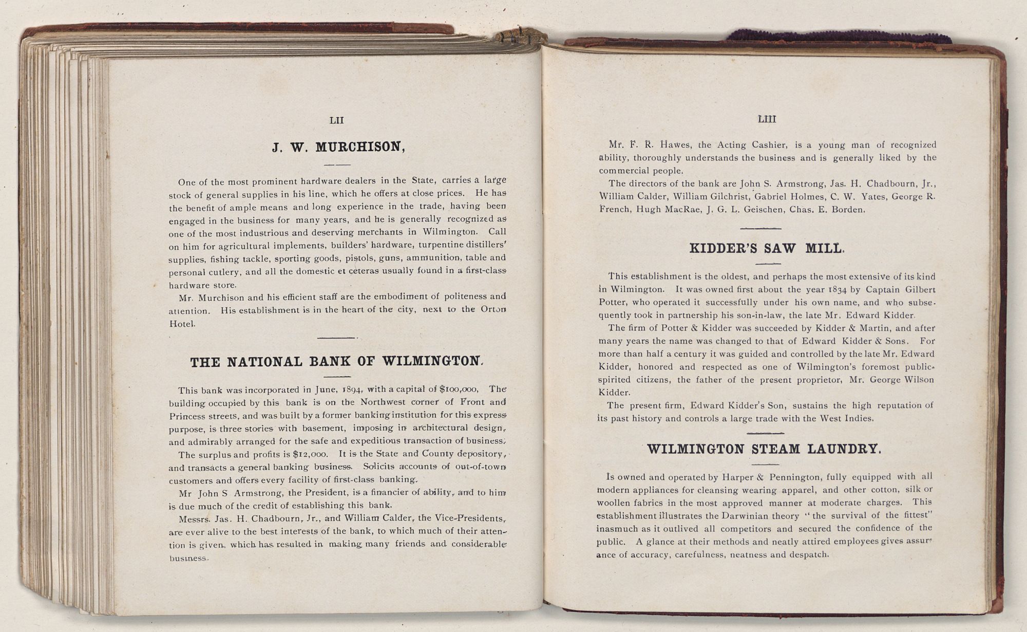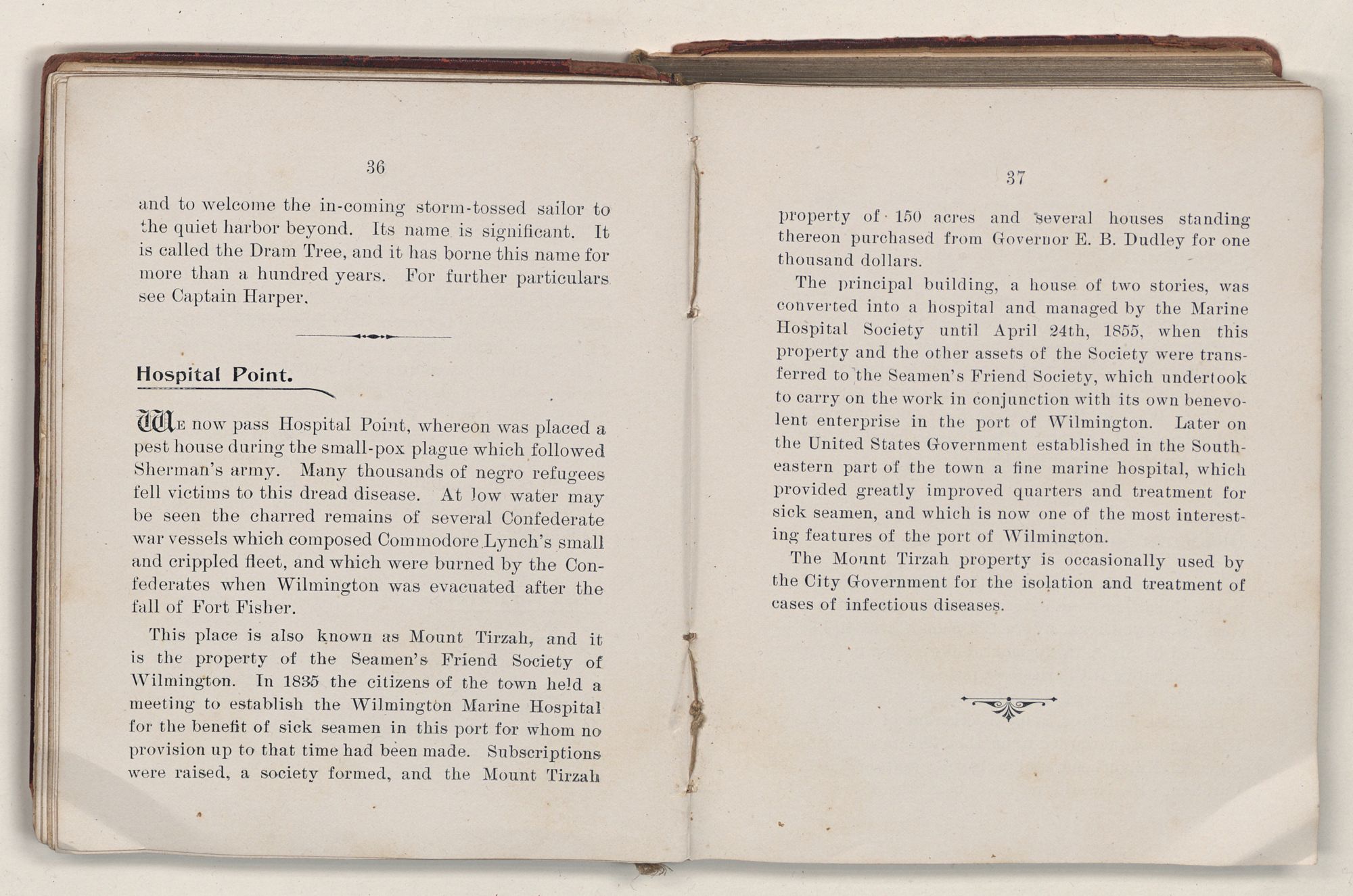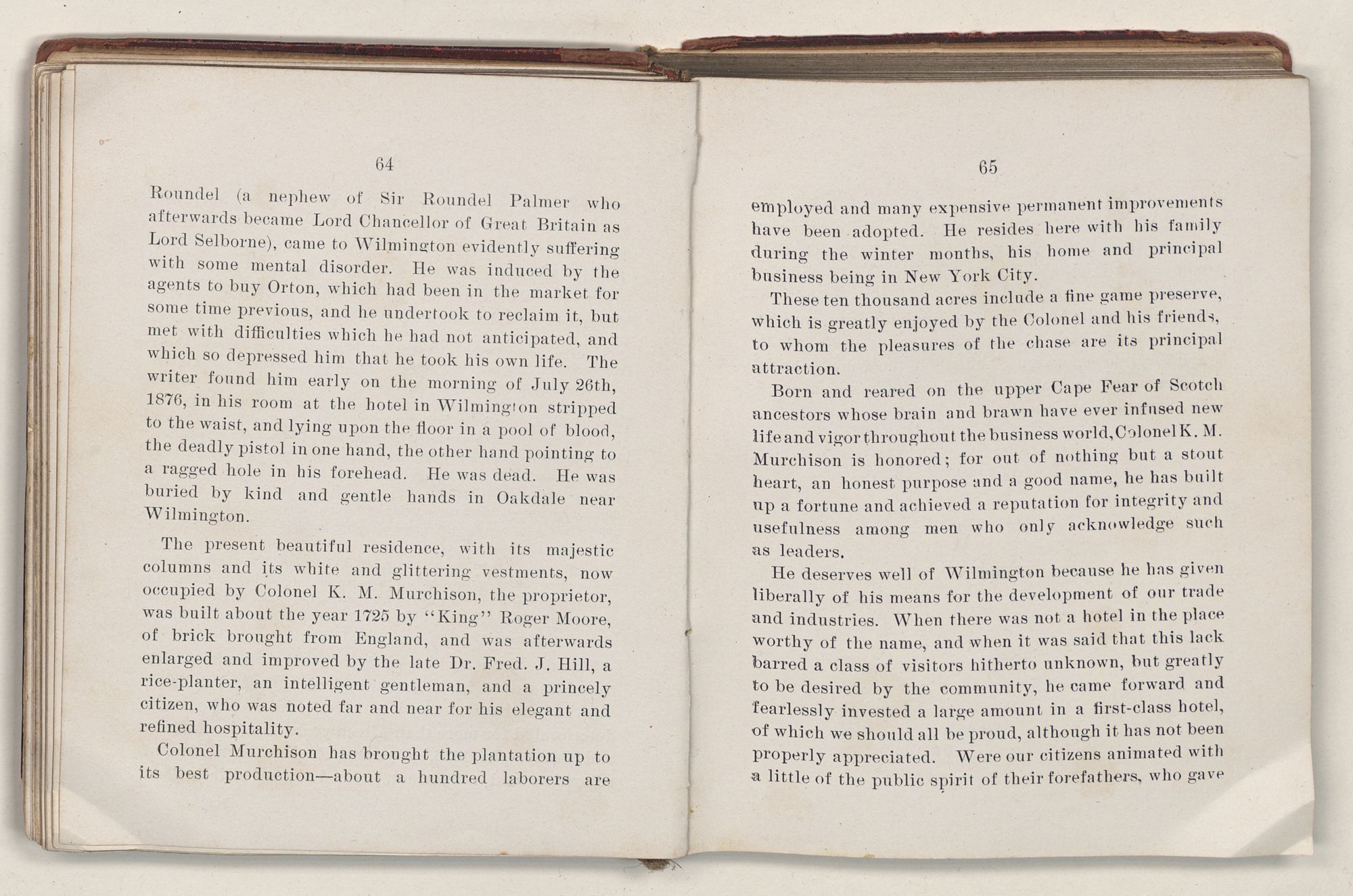 THE steamer “Wilmington” is a model of marine architecture, combining spacious and comfortable passenger accommodations with the greatest speed attained by steam craft on the Cape Fear river. Her clean decks and tidy saloons afford the bracing outside air, or the restful seclusion which invites repose. The daily run to and from Southport is made in two hours, including all river landings; and the object of this little book is to interest and amuse the traveller by a concise description of Wilmington business enterprise and local scenery, contrasting the record of the present busy age with the history and traditions of long ago.