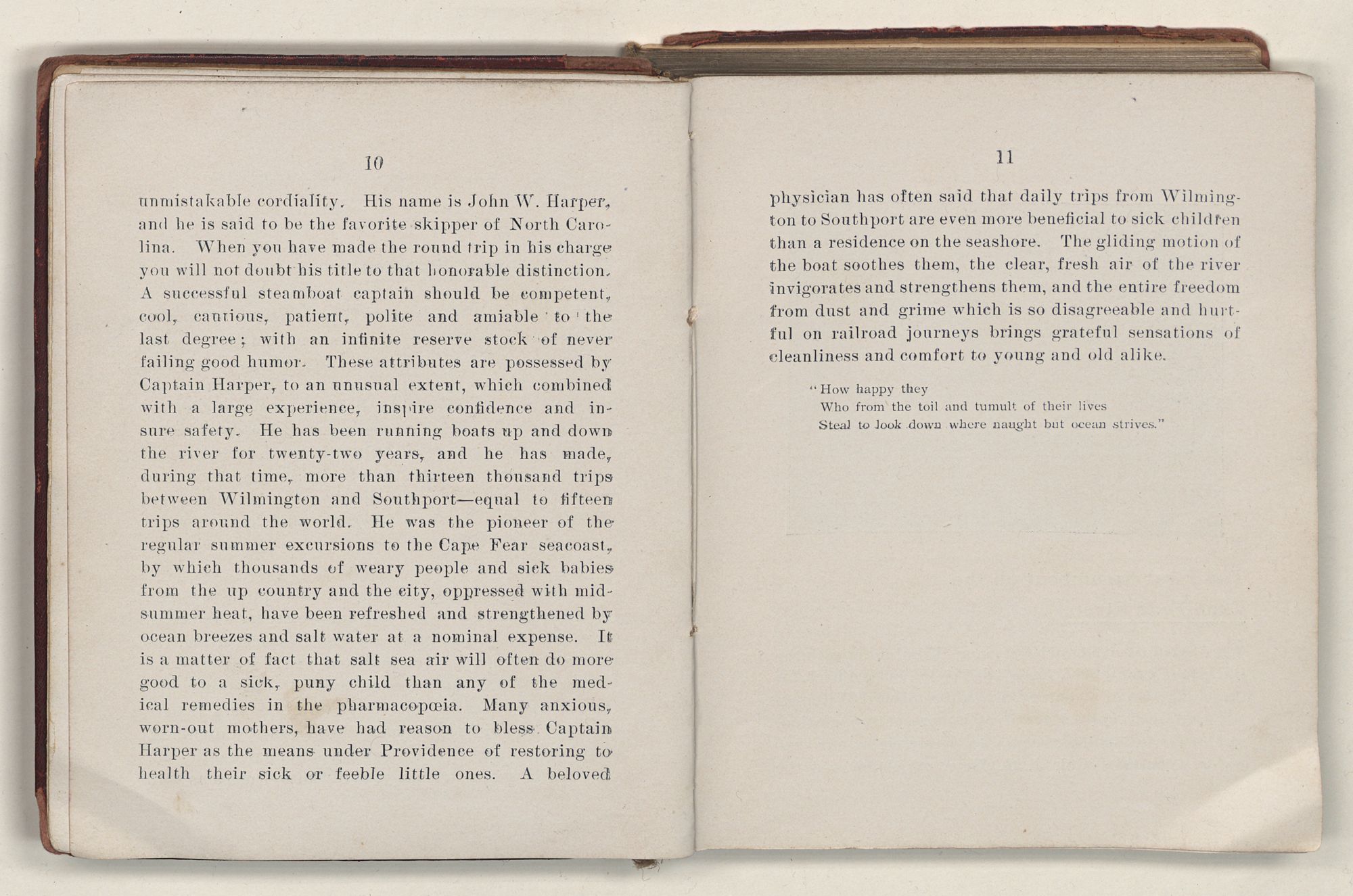 * * * * * * * Captain J. W. Harper's picture, and that of his fine steamer, very appropriately are in the first place of the book, and to-day no pleasanter trip can be made than on this steamer, which is commanded by the universally popular Captain John W. Harper.—Newbern Journal.