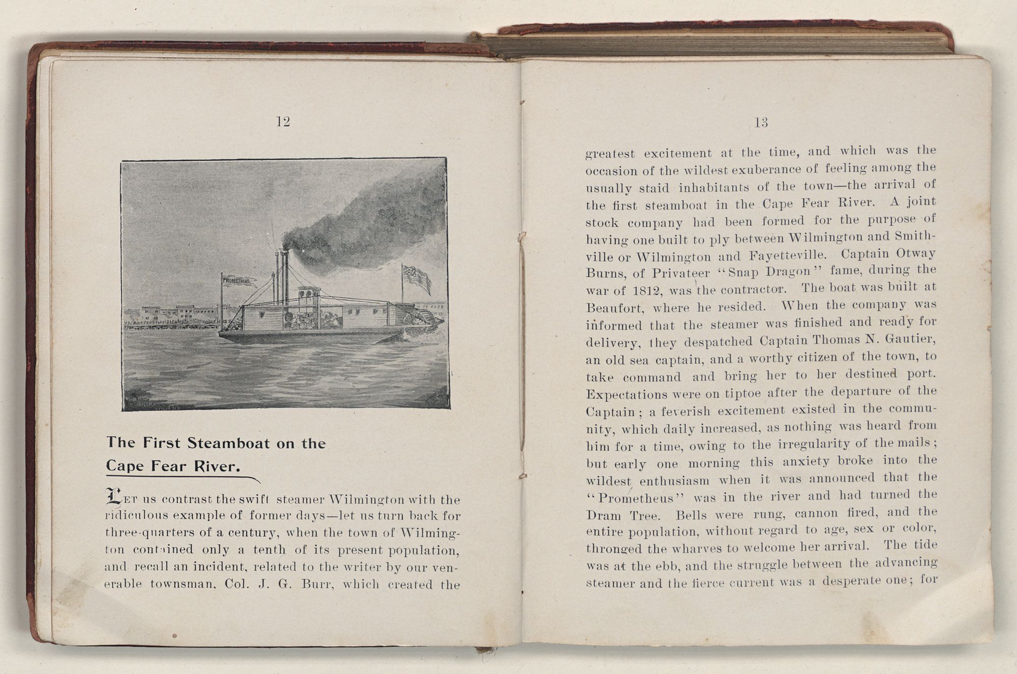 greatest excitement at the time, and which was the occasion of the wildest exuberance of feeling among the usually staid inhabitants of the town—the arrival of the first steamboat in the Cape Fear River. A joint stock company had been formed for the purpose of having one built to ply between Wilmington and Smithville or Wilmington and Fayetteville. Captain Otway Burns, of Privateer “Snap Dragon” fame, during the war of 1812, was the contractor. The boat was built at Beaufort, where he resided. When the company was informed that the steamer was finished and ready for delivery, they despatched Captain Thomas N. Gautier, an old sea captain, and a worthy citizen of the town, to take command and bring her to her destined port. Expectations were on tiptoe after the departure of the Captain; a feverish excitement existed in the community, which daily increased, as nothing was heard from him for a time, owing to the irregularity of the mails; but early one morning this anxiety broke into the wildest enthusiasm when it was announced that the “Prometheus” was in the river and had turned the Dram Tree. Bells were rung, cannon fired, and the entire population, without regard to age, sex or color, thronged the wharves to welcome her arrival. The tide was at the ebb, and the struggle between the advancing steamer and the fierce current was a desperate one; for