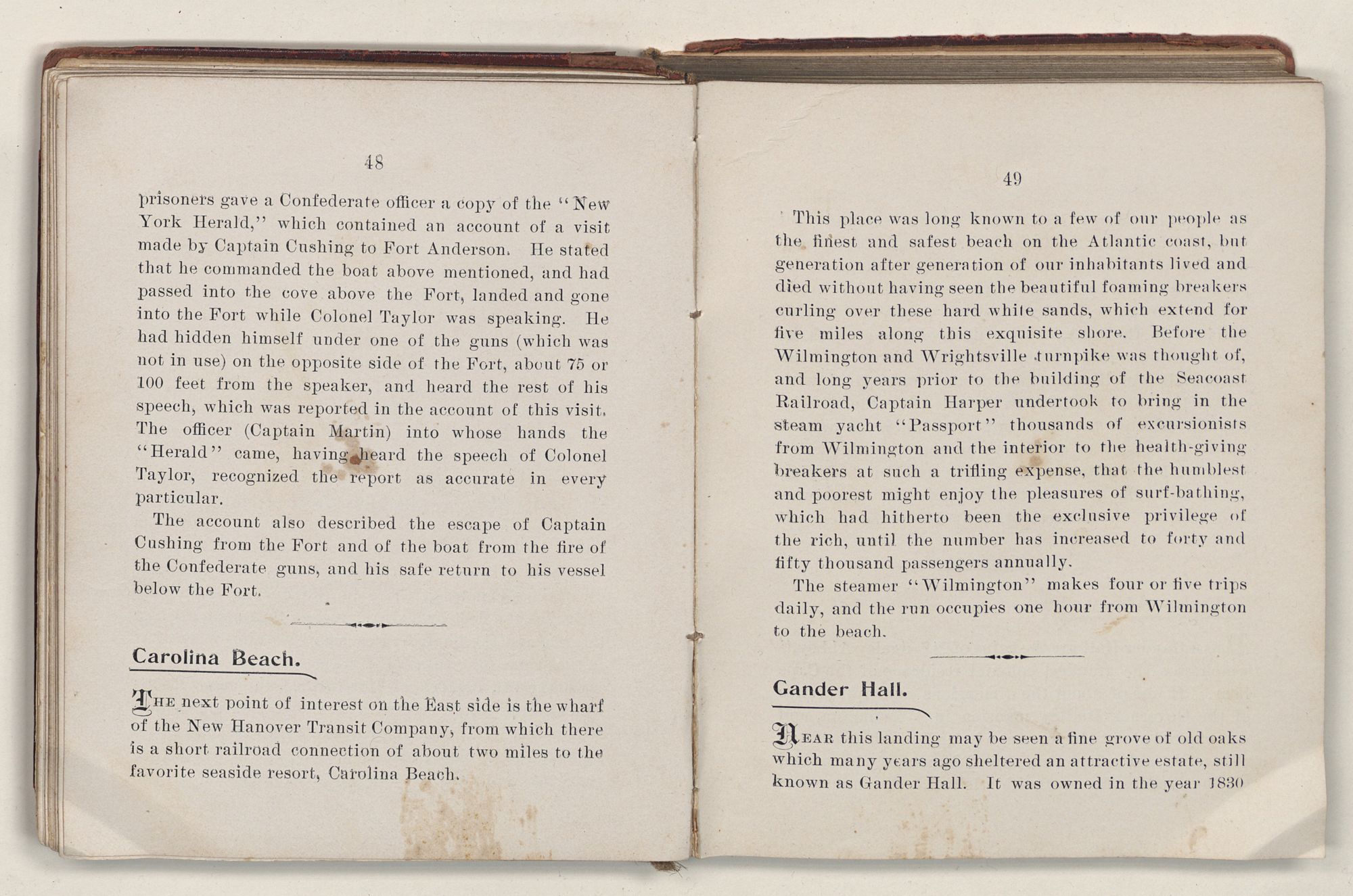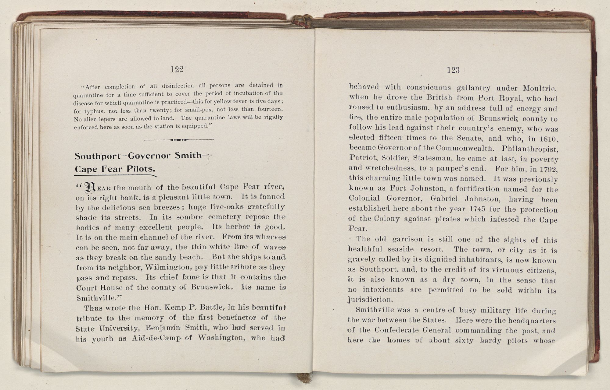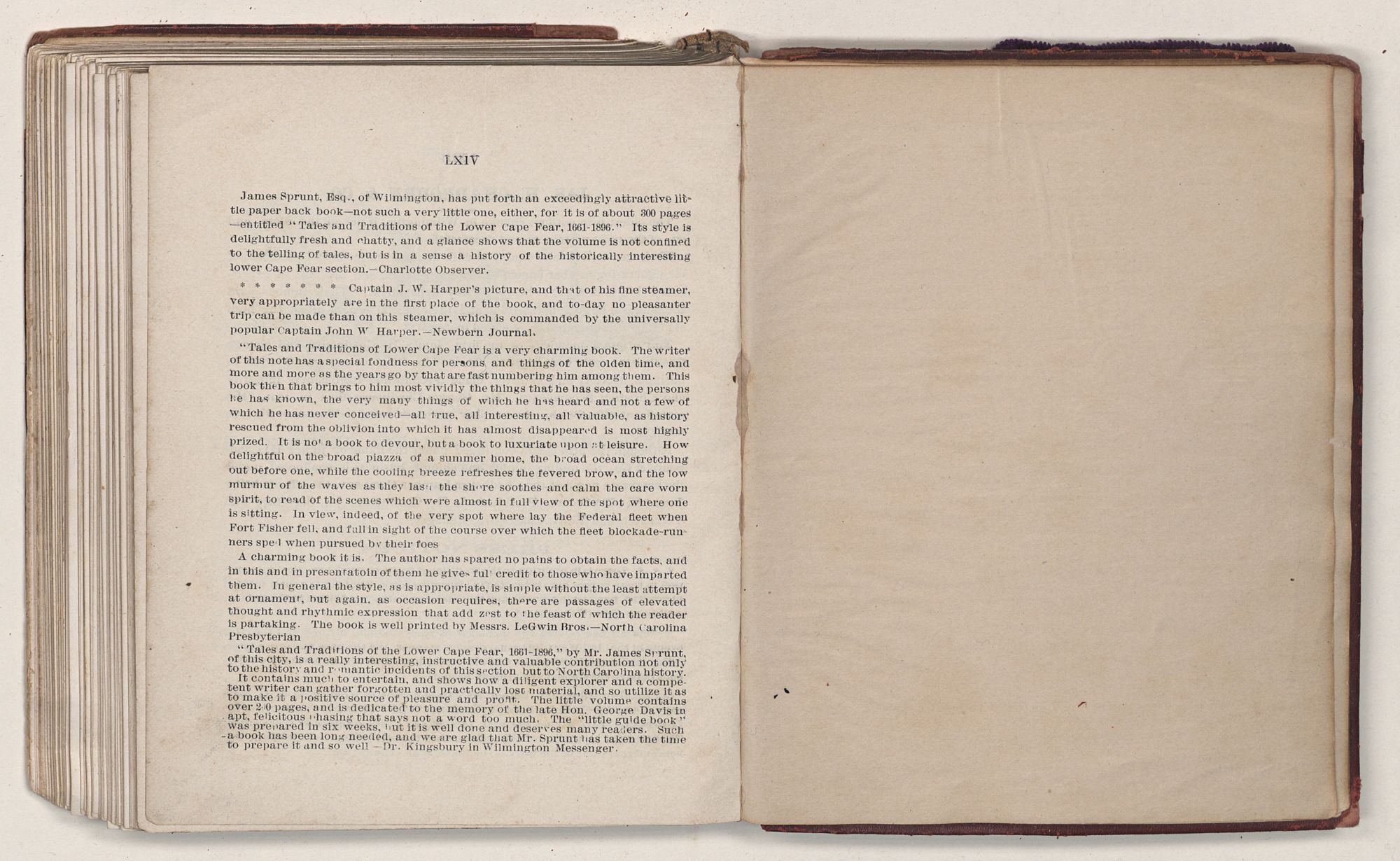 It contains much to entertain, and shows how a diligent explorer and a competent writer can gather forgotten and practically lost material, and so utilize it as to make it a positive source of pleasure and profit. The little volume contains over 200 pages, and is dedicated to the memory of the late Hon. George Davis in apt, felicitous phasing that says not a word too much. The “little guide book,” was prepared in six weeks, but it is well done and deserves many readers. Such a book has been long needed, and we are glad that Mr. Sprunt has taken the time to prepare it and so well. Dr. Kingsbury in Wilmington Messenger.