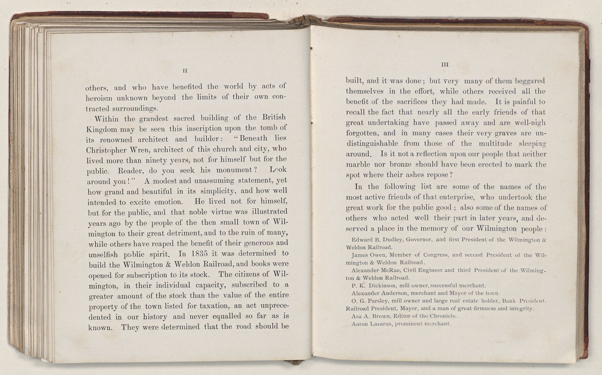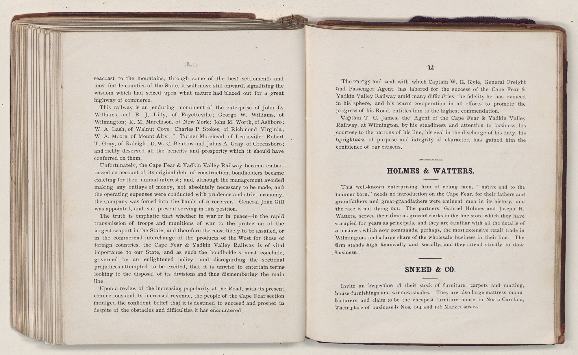 This railway is an enduring monument of the enterprise of John D. Williams and E. J. Lilly, of Fayetteville; George W. Williams, of Wilmington; K. M. Murchison, of New York; John M. Worth, of Ashboro; W. A. Lash, of Walnut Cove; Charles P. Stokes, of Richmond, Virginia; W. A. Moore, of Mount Airy; J. Turner Morehead, of Leaksville; Robert T. Gray, of Raleigh; D. W. C. Benbow and Julius A. Gray, of Greensboro; and richly deserved all the benefits and prosperity which it should have conferred on them.