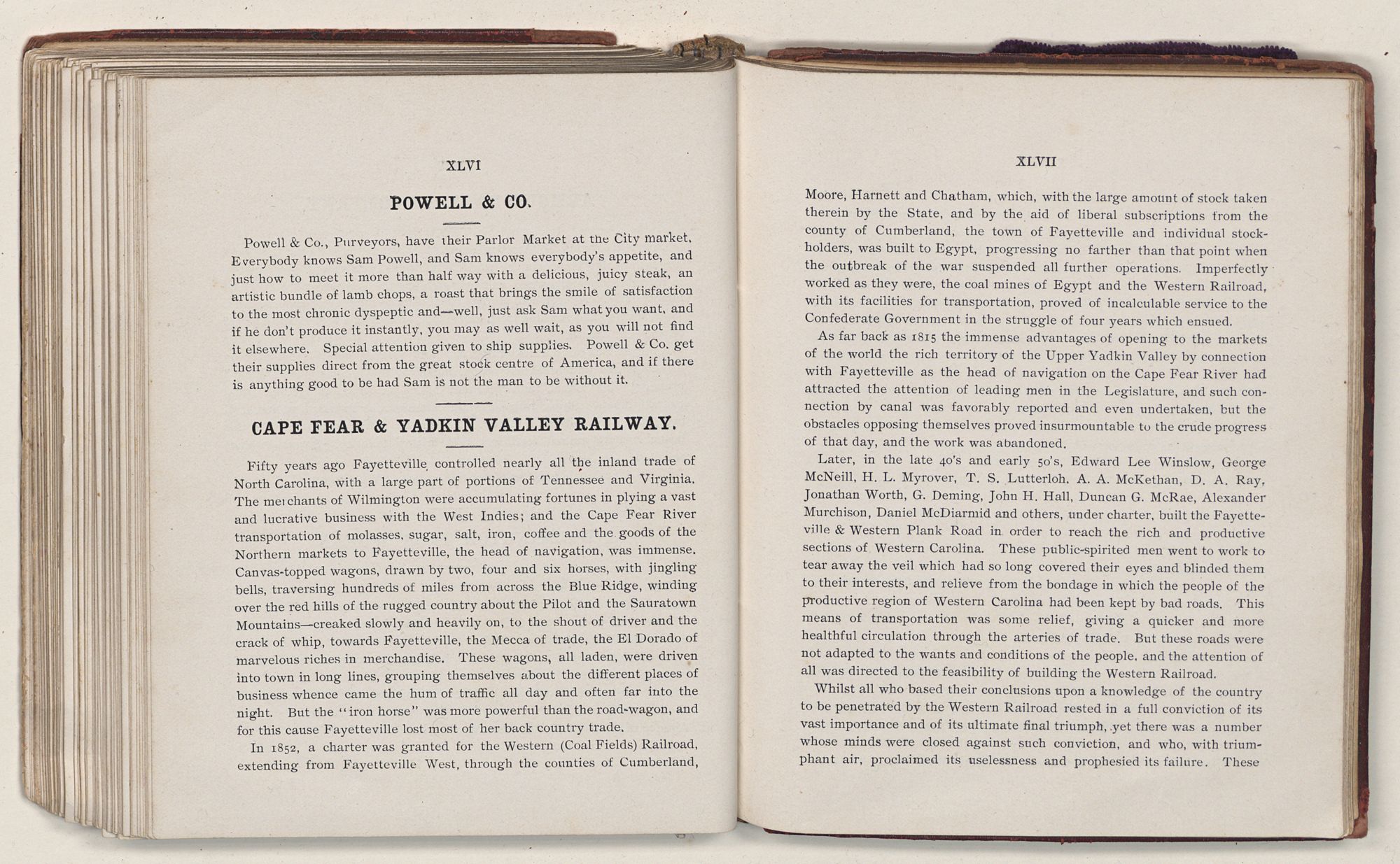 It will be noted that the Cape Fear & Yadkin Valley Railway system—conceived in the days of the wealth and prosperity of the tide-water and Upper Cape Fear section—lays the steel rail upon the disused old rut of this remunerative traffic, and its long trains bound with the swift life of steam power over the route of the slow-toiling wagon caravan; from the