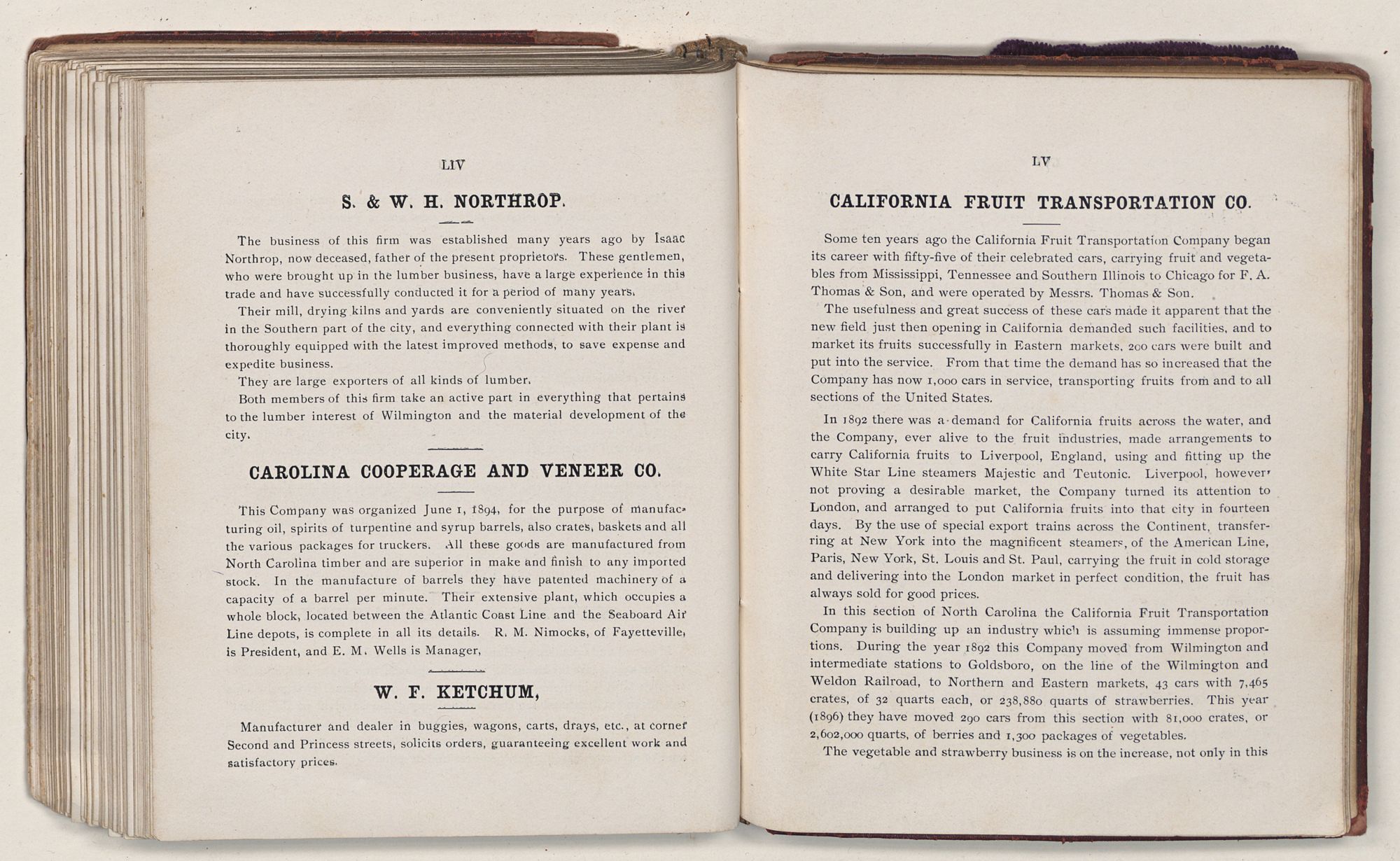 In this section of North Carolina the California Fruit Transportation Company is building up an industry which is assuming immense proportions. During the year 1892 this Company moved from Wilmington and intermediate stations to Goldsboro, on the line of the Wilmington and Weldon Railroad, to Northern and Eastern markets, 43 cars with 7,465 crates, of 32 quarts each, or 238,880 quarts of strawberries. This year (1896) they have moved 290 cars from this section with 81,000 crates, or 2,602,000 quarts, of berries and 1,300 packages of vegetables.