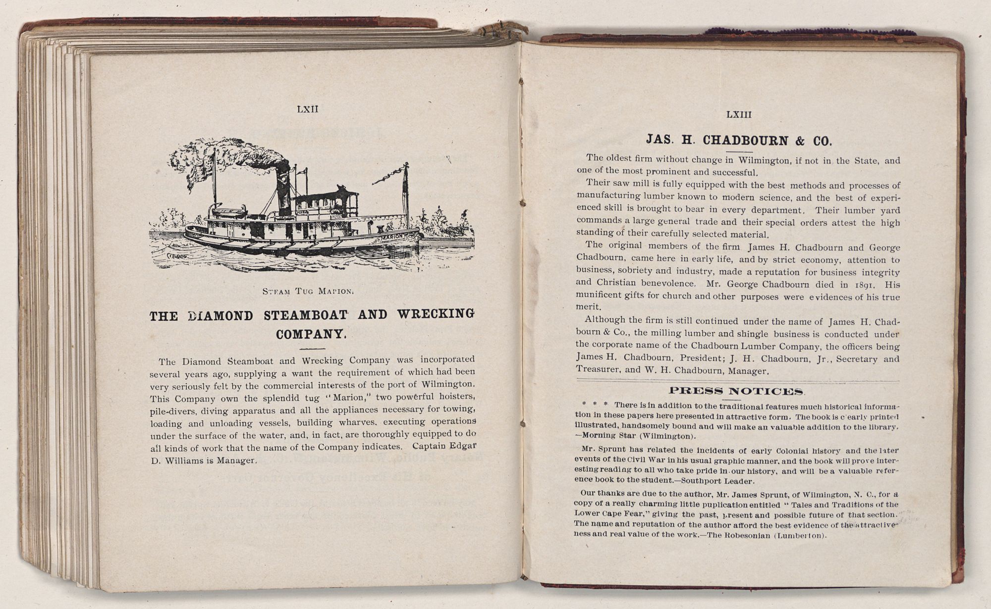 James Sprunt, Esq., of Wilmington, has put forth an exceedingly attractive little paper back book—not such a very little one, either, for it is of about 300 pages—entitled “Taies and Traditions of the Lower Cape Fear, 1661-1896.” Its style is delightfully fresh and chatty, and a glance shows that the volume is not confined to the telling of tales, but is in a sense a history of the historically interesting lower Cape Fear section.—Charlotte Observer.
