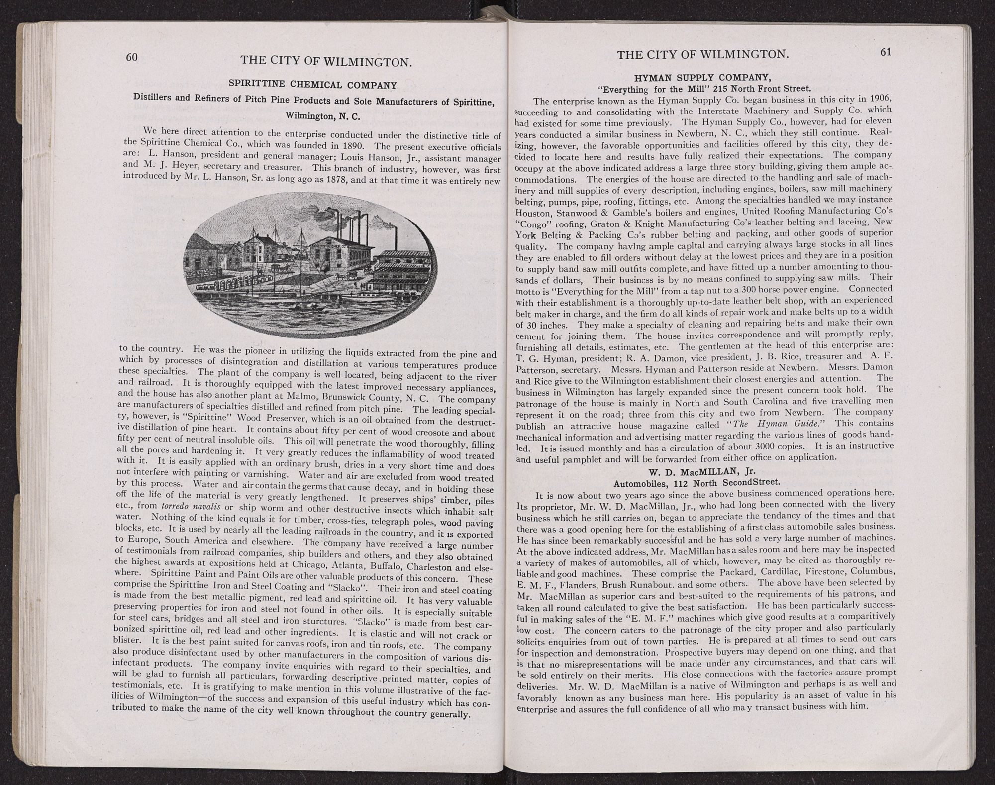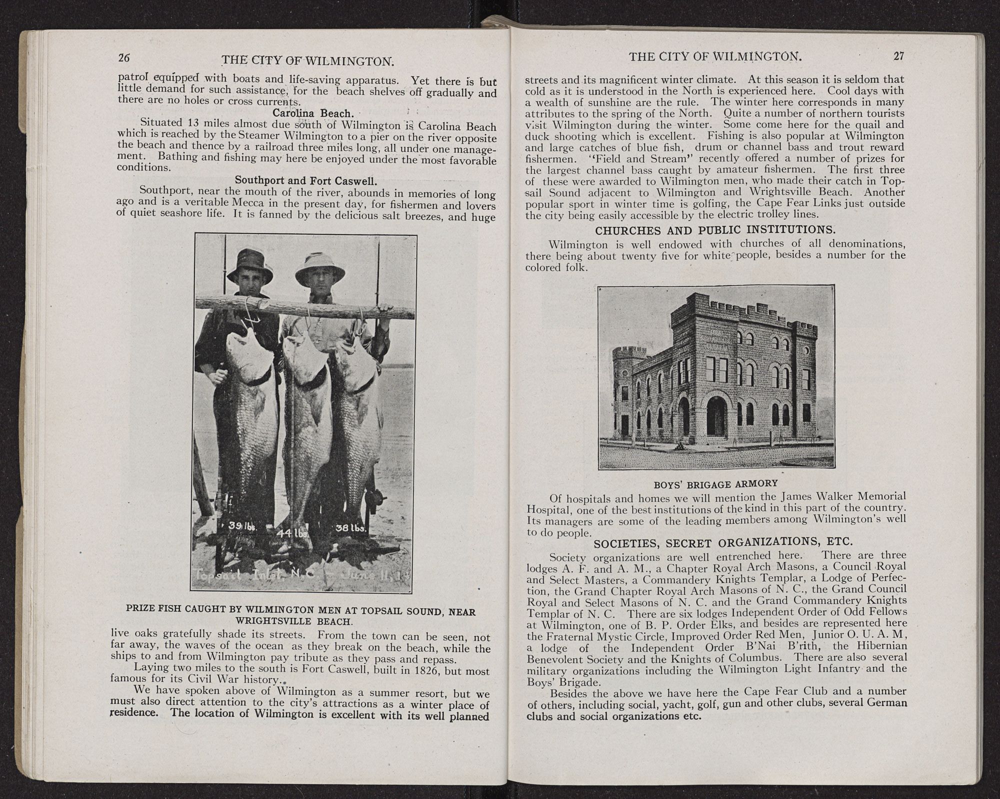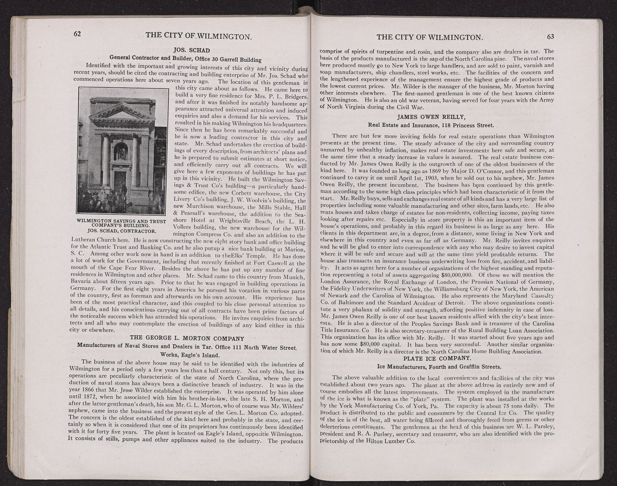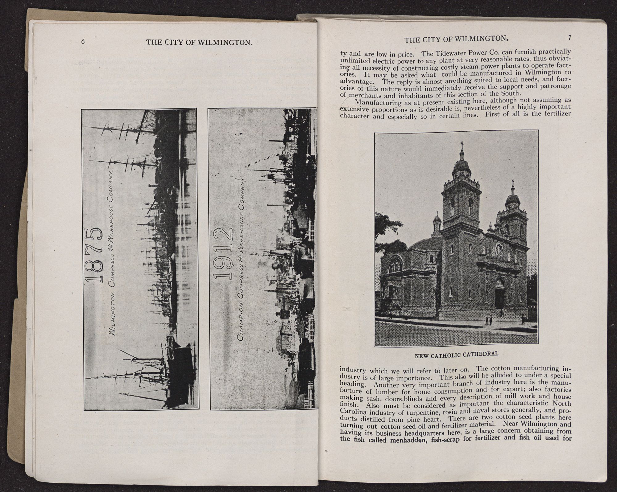 industry which we will refer to later on. The cotton manufacturing industry is of large importance. This also will be alluded to under a special heading. Another very important branch of industry here is the manufacture of lumber for home consumption and for export; also factories making sash, doors, blinds and every description of mill work and house finish. Also must be considered as important the characteristic North Carolina industry of turpentine, rosin and naval stores generally, and products distilled from pine heart. There are two cotton seed plants here turning out cotton seed oil and fertilizer material. Near Wilmington and having its business headquarters here, is a large concern obtaining from the fish called menhadden, fish-scrap for fertilizer and fish oil used for