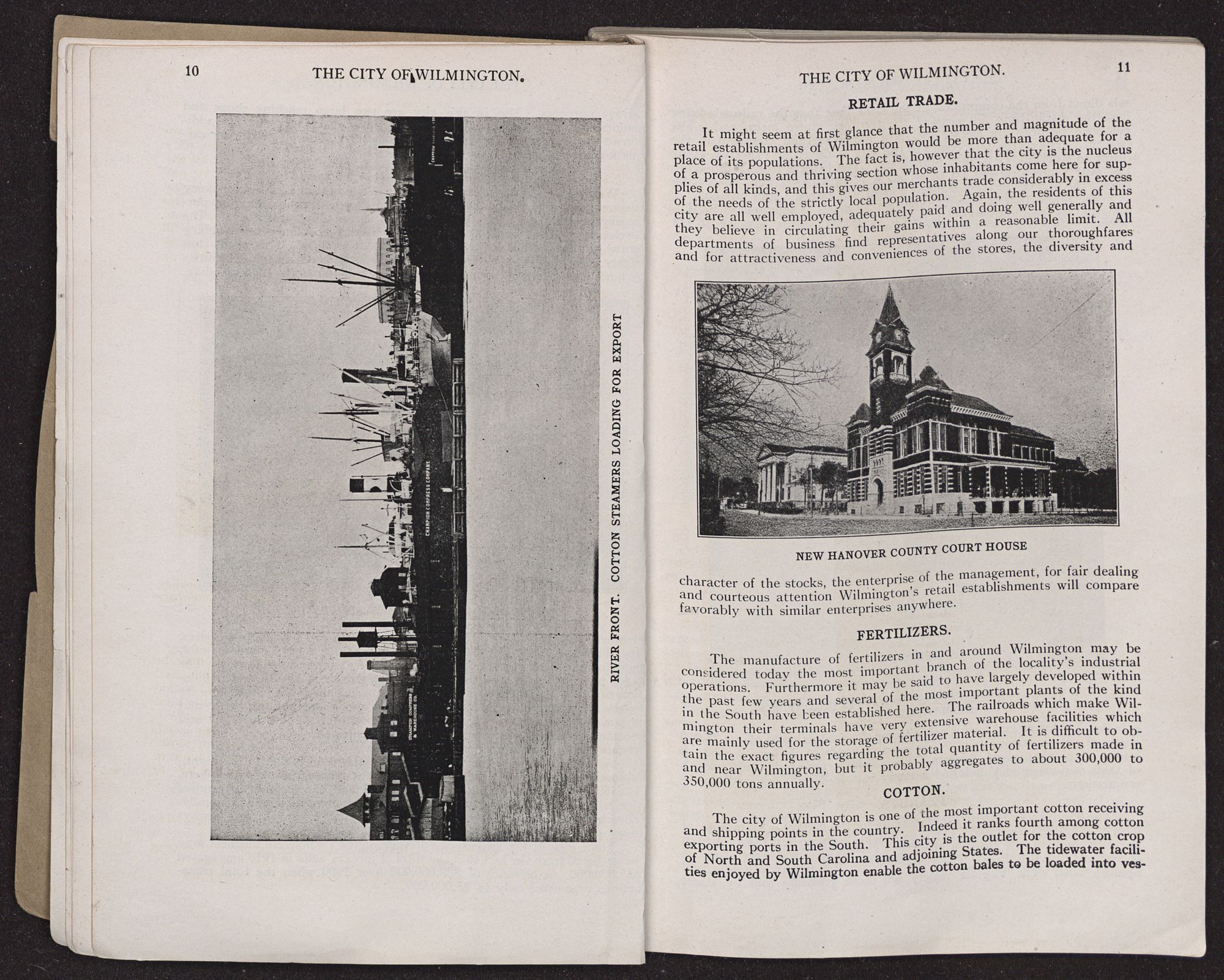 COTTON.The city of Wilmington is one of the most important cotton receiving and shipping points in the country. Indeed it ranks fourth among cotton exporting ports in the South. This city is the outlet for the cotton crop of North and South Carolina and adjoining States. The tidewater facilities enjoyed by Wilmington enable the cotton bales to be loaded into vessels