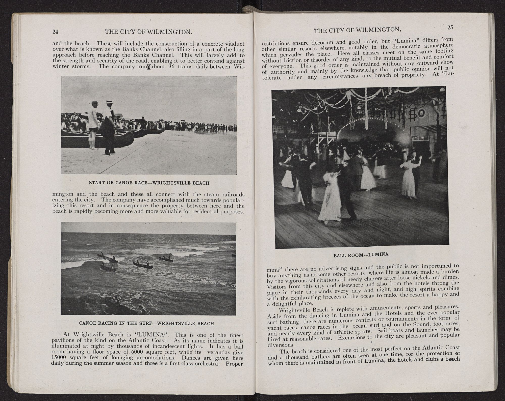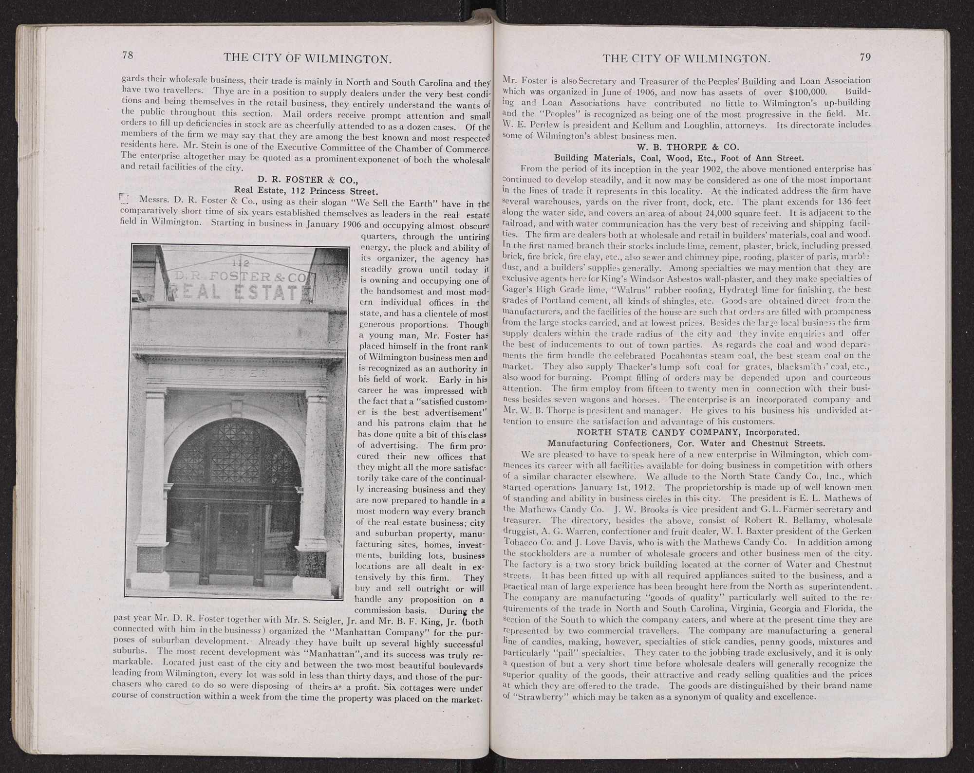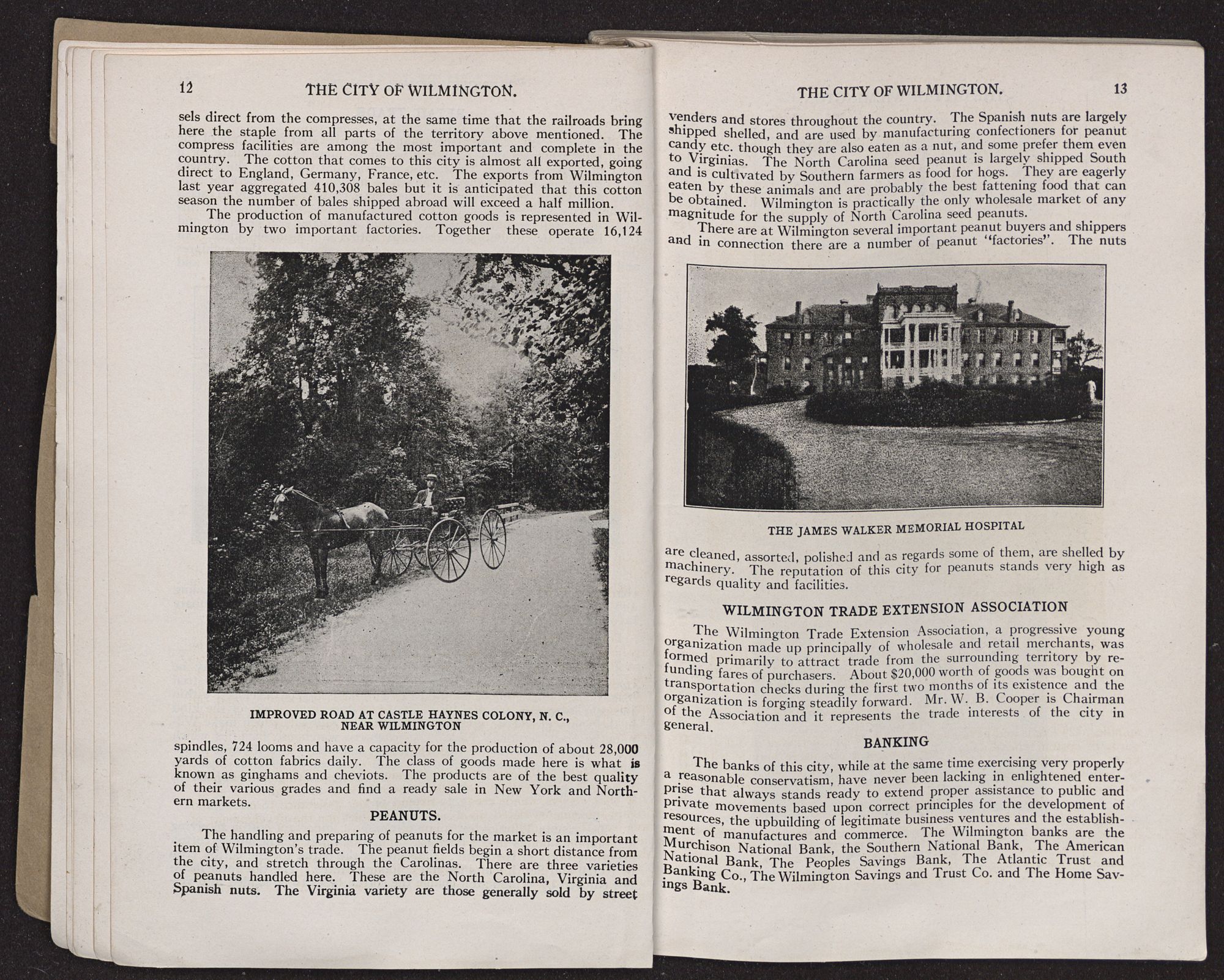 MANUFACTURING AND MANUFACTURING OPPORTUNITIES.That there exists today favorable conditions for the establishment of certain lines of manufacturing at Wilmington is a fact that is apparent. Primarily, the port and other shipping advantages, as enumerated above afford facilities for the receipt of raw materials and the shipment of finished products which are hardly surpassed in the Southern Atlantic States. Furthermore this city is the center of a rich surrounding country—producing large crops of agricultural products and notably cotton, corn, peanuts, garden truck, fruits, vegetables, etc, which looks to Wilmington as its source of supply. Thus we believe that opportunities are here at hand which are of a more advantageous character than in larger cities further north where every thing is apt to be overdone, while at the same time the cost of manufacture and the maintenance of plants here is lower than in the above sections. Some further advantages are that the climate permits of outdoor and indoor work being carried on every working day, also the expense of heating is only an item during a few weeks in the year. Suitable sites with water front or along the belt line encircling the city are plenty