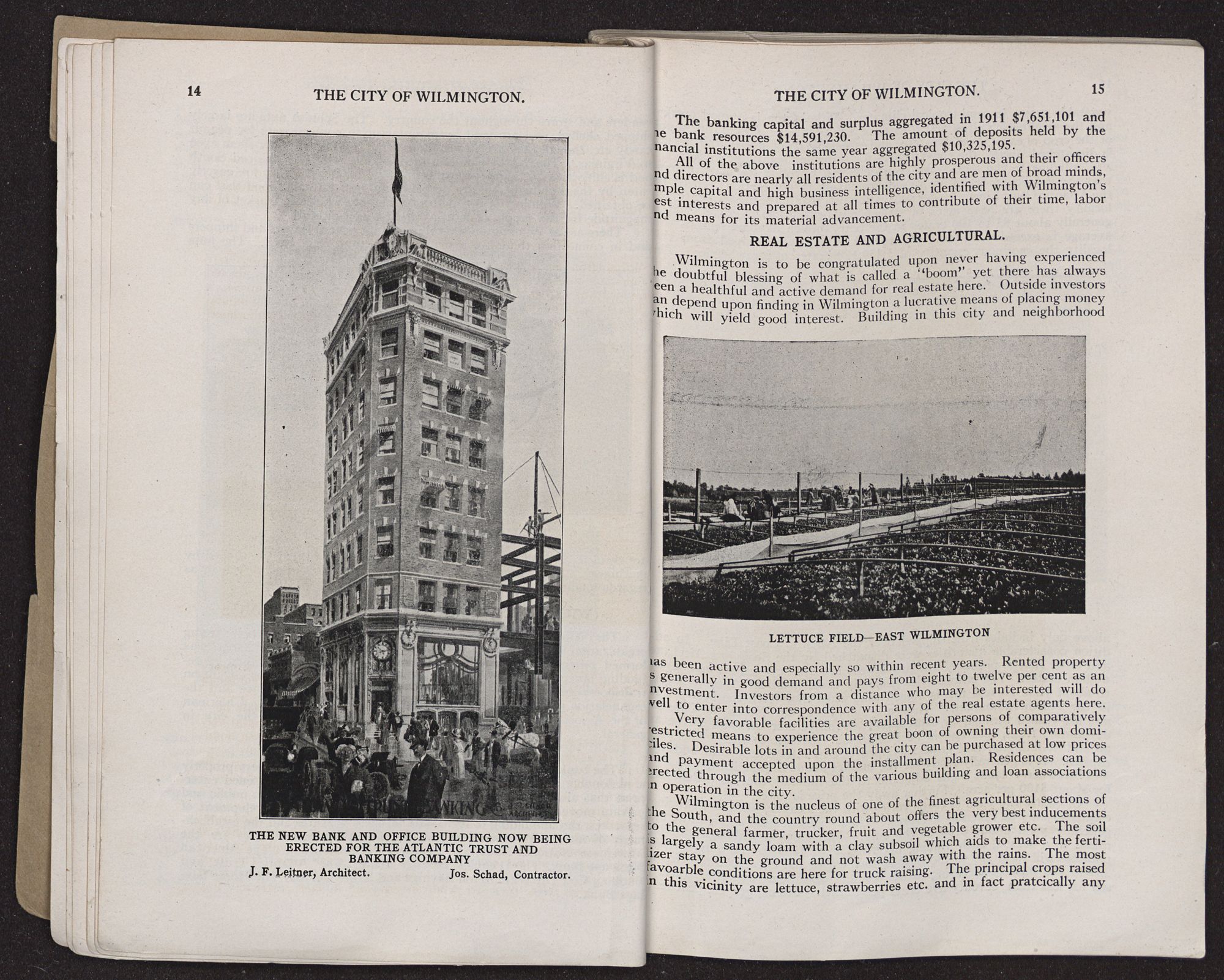Wilmington is the nucleus of one of the finest agricultural sections of the South, and the country round about offers the very best inducements to the general farmer, trucker, fruit and vegetable grower etc. The soil is largely a sandy loam with a clay subsoil which aids to make the fertilizer stay on the ground and not wash away with the rains. The most favoarble conditions are here for truck raising. The principal crops raised in this vicinity are lettuce, strawberries etc. and in fact pratcically any