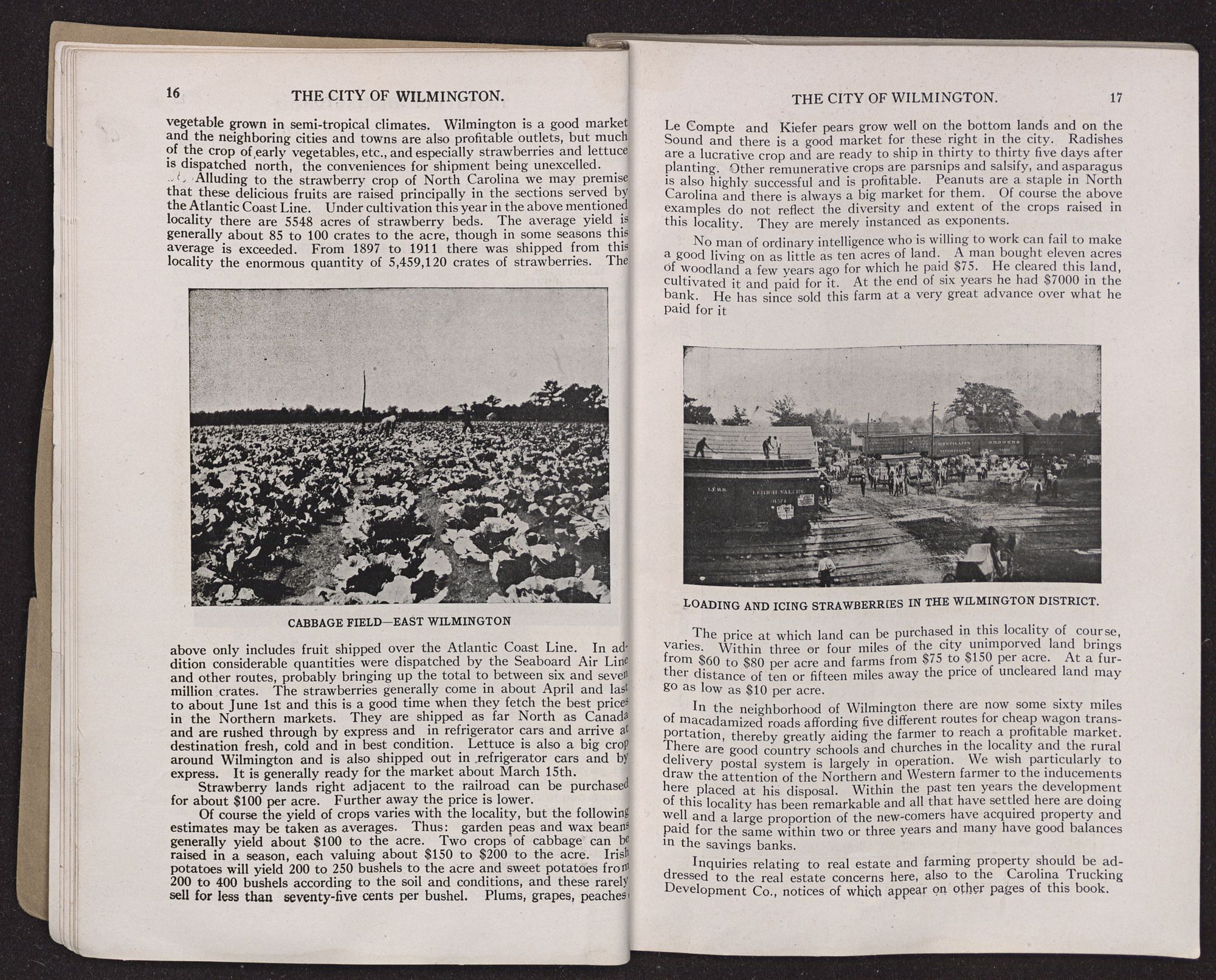 In the neighborhood of Wilmington there are now some sixty miles of macadamized roads affording five different routes for cheap wagon transportation, thereby greatly aiding the farmer to reach a profitable market. There are good country schools and churches in the locality and the rural delivery postal system is largely in operation. We wish particularly to draw the attention of the Northern and Western farmer to the inducements here placed at his disposal. Within the past ten years the development of this locality has been remarkable and all that have settled here are doing well and a large proportion of the new-comers have acquired property and paid for the same within two or three years and many have good balances in the savings banks.