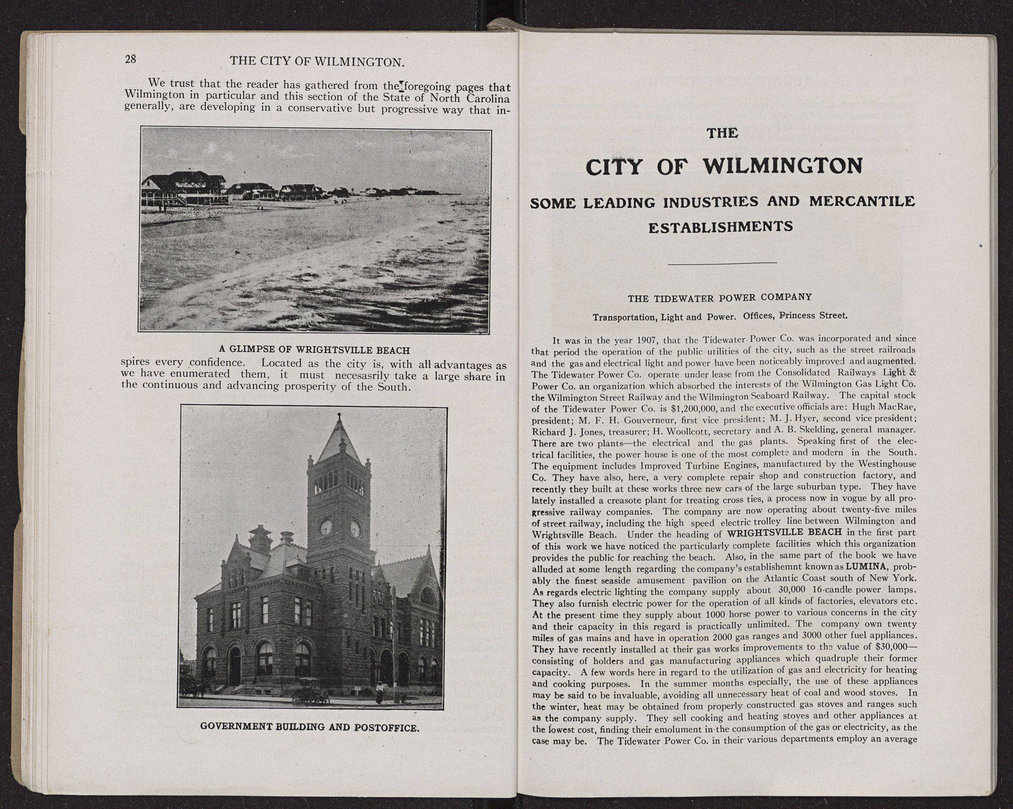 and are low in price. The Tidewater Power Co. can furnish practically unlimited electric power to any plant at very reasonable rates, thus obviating all necessity of constructing costly steam power plants to operate factories. It may be asked what could be manufactured in Wilmington to advantage. The reply is almost anything suited to local needs, and factories of this nature would immediately receive the support and patronage of merchants and inhabitants of this section of the South.
