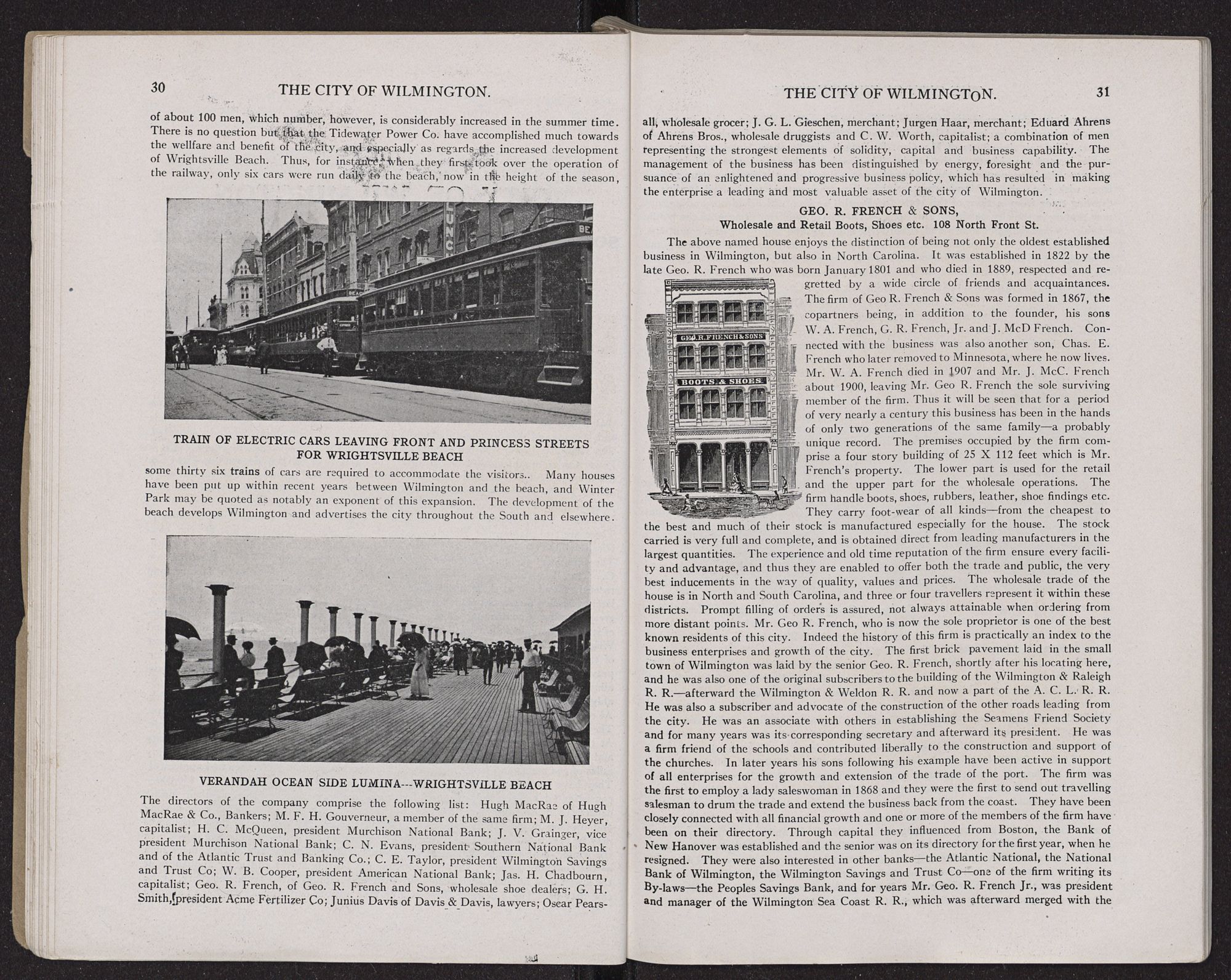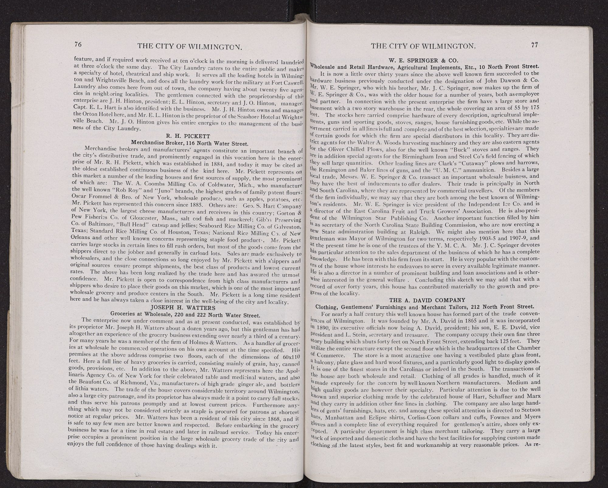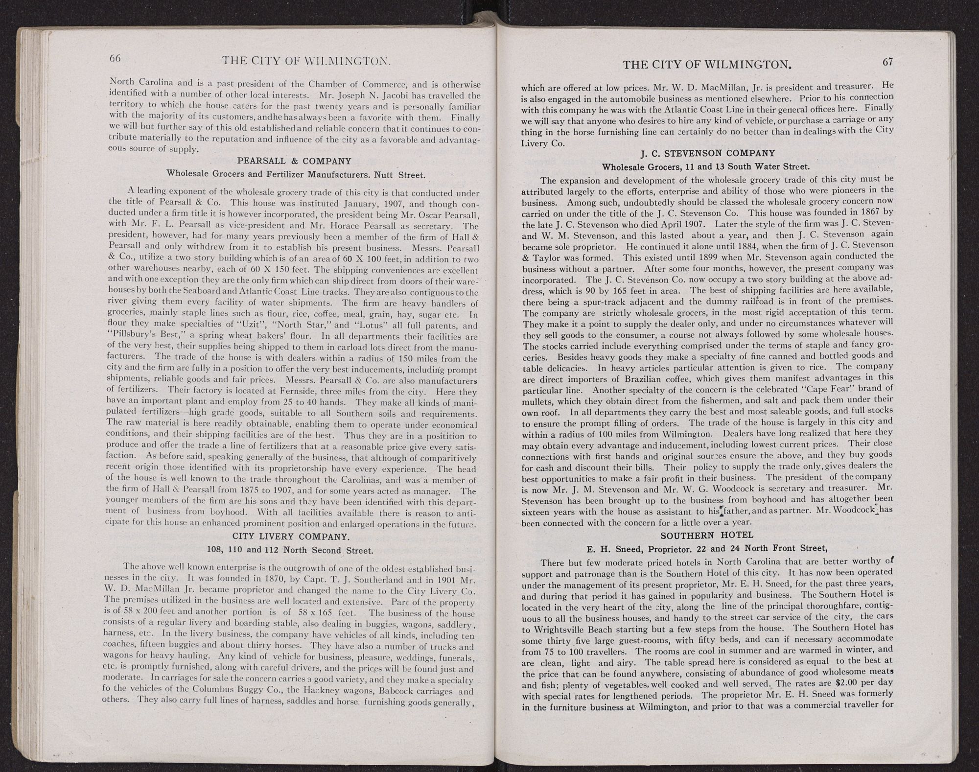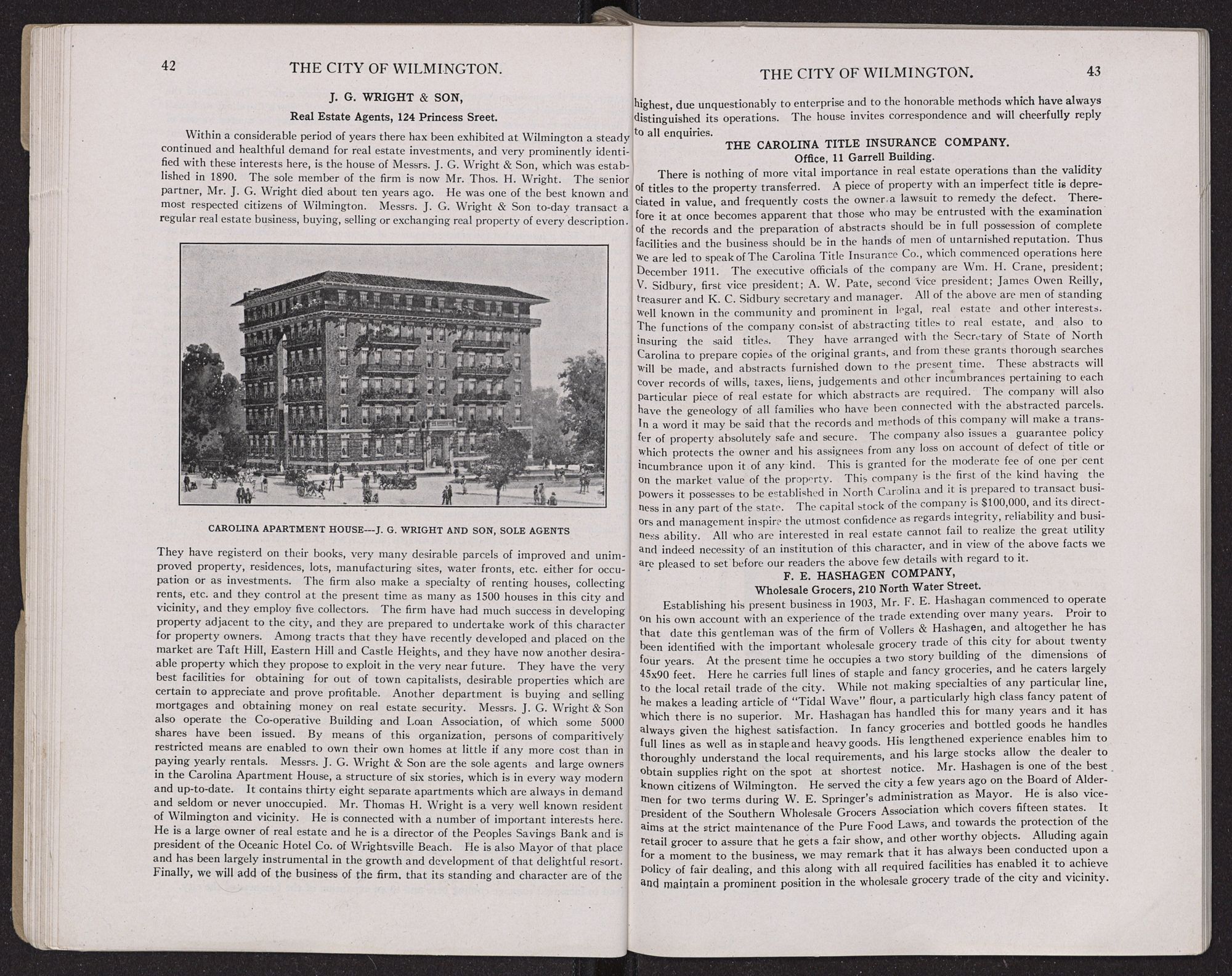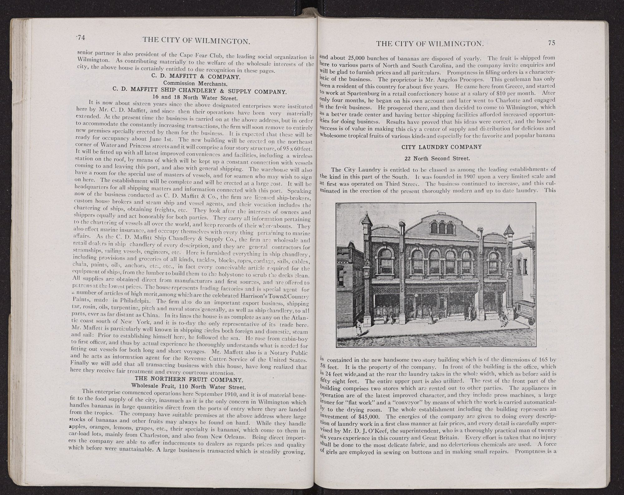 THE WHOLESALE TRADE.Wilmington's wholesale merchants have the best of facilities for doing business, this city being the metropolis of North Carolina and the purchasing centre for a rich and prosperous surrounding territory. The development is such that the city to-day is the most important jobbing centre of the State and perhaps of the two Carolinas. This result has largely been achieved by reason of particularly good shipping facilities by land and water. Much also should be attributed to the high standing,