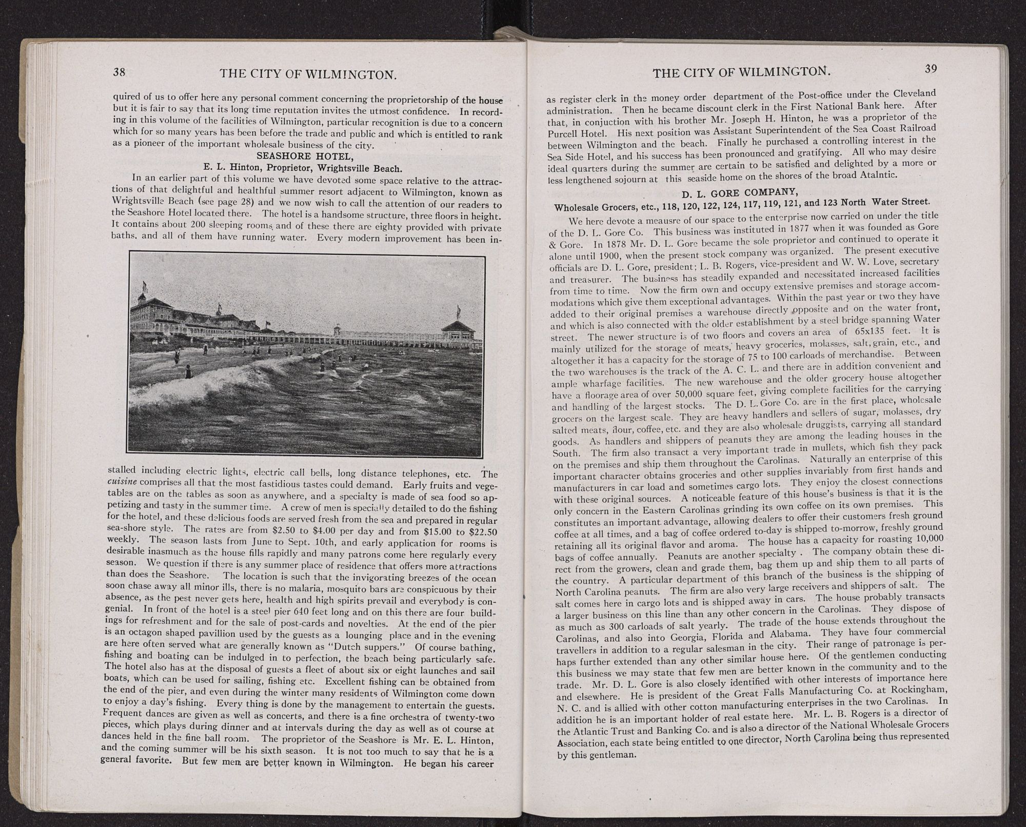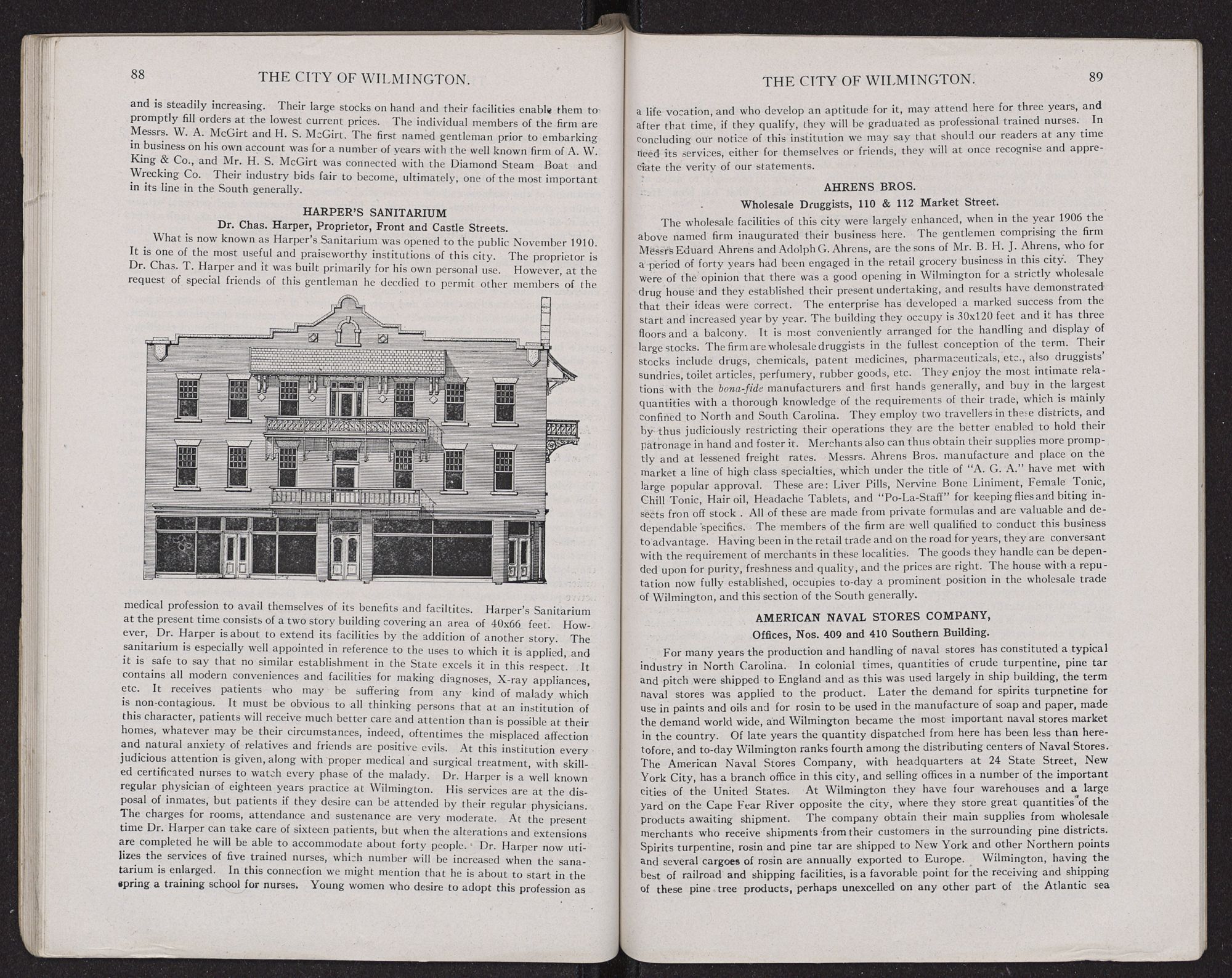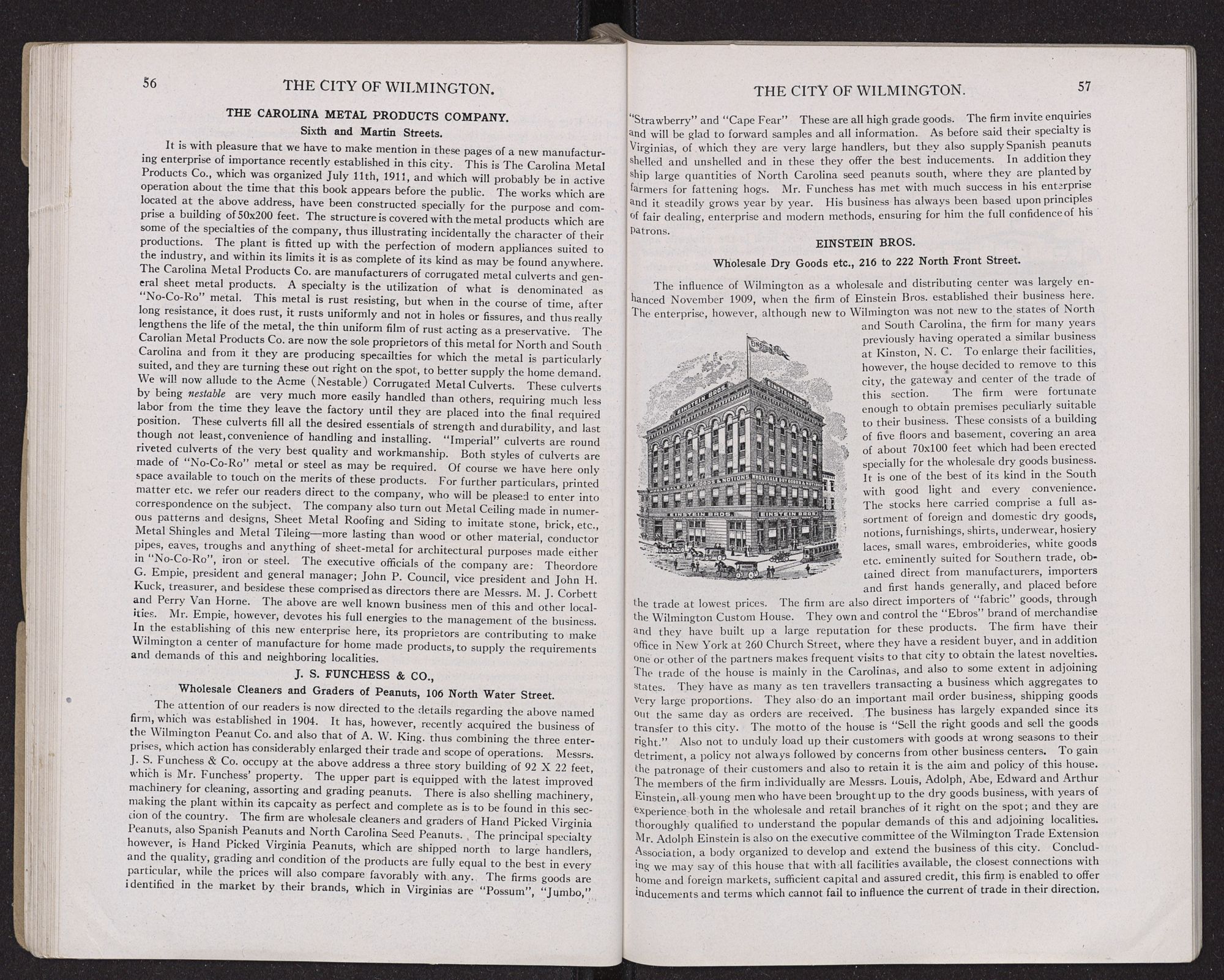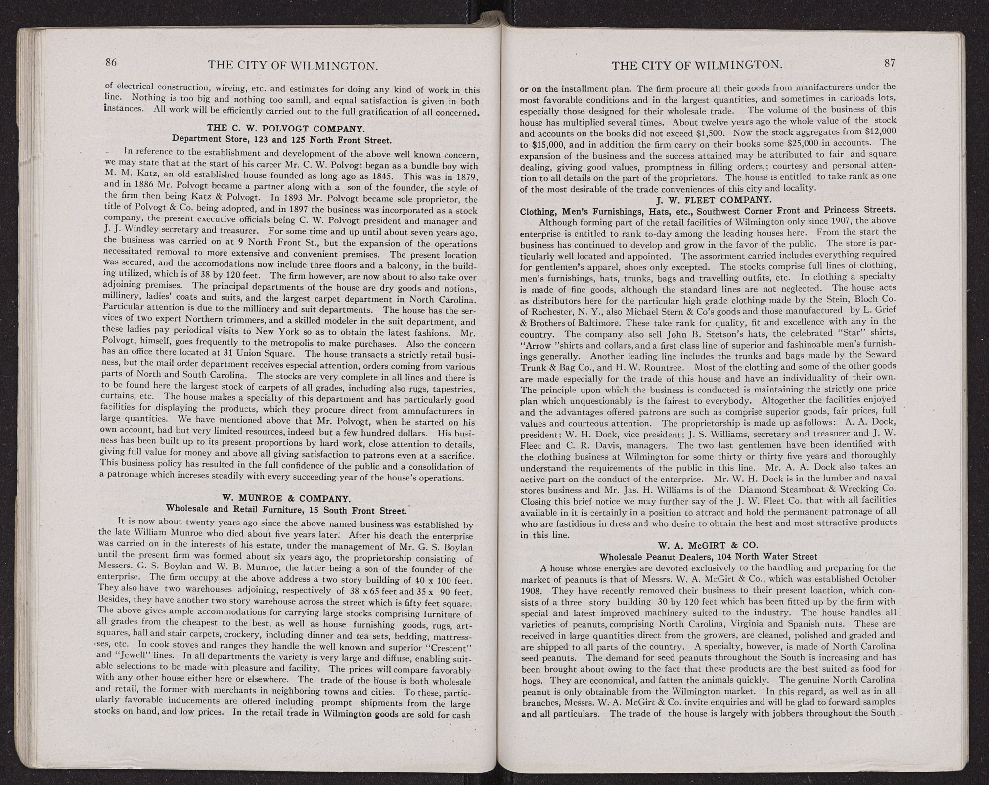 resources and character which are characteristics of Wilmington houses. The wholesale trade of this city is in the hands of men of ample capital, enjoying the best of credit and able to buy as low as the lowest. The trade has very greatly expanded with the increase in wealth and population of the surrounding country. The leading lines of goods jobbed here are heavy and fancy groceries, provisions, dry goods and notions, drugs and pharmaceutical preparations, boots and shoes, mill supplies and saw mill machinery, paints, oils, clothing, hats and caps, confectionery, building materials, lumber, naval stores, peanuts, etc.
