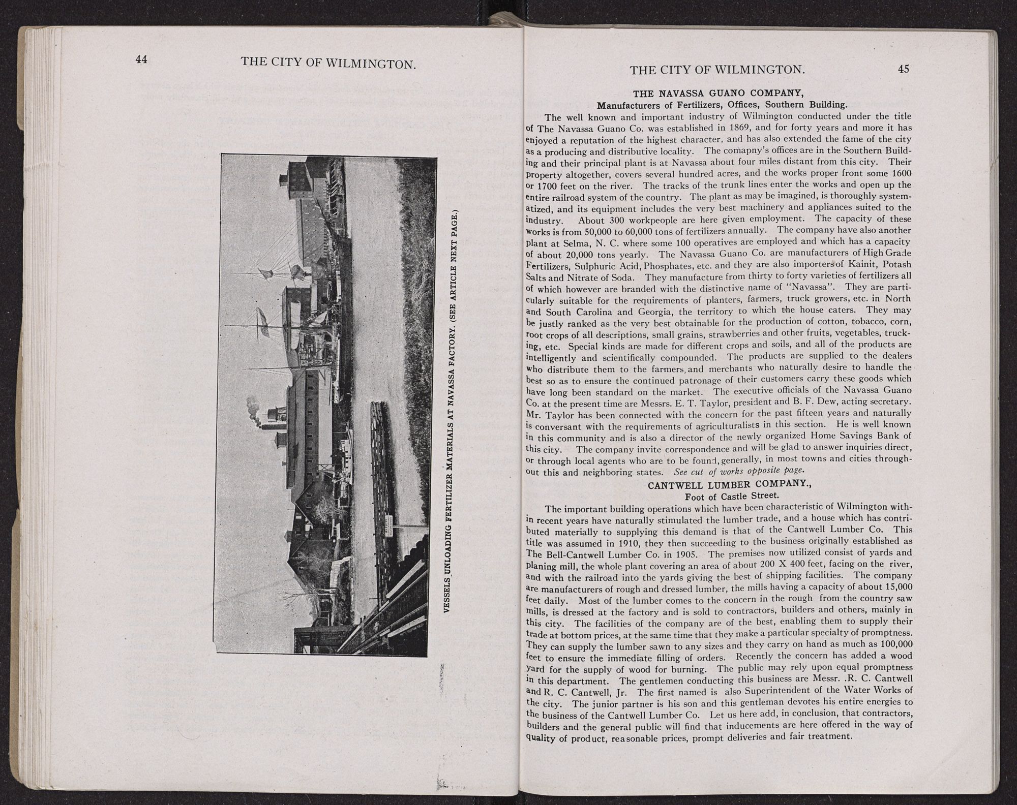 TERMINAL AND SHIPPING FACILITIES.Wilmington's facilities for reaching the markets of the country and abroad with her products, and for bringing raw material and merchandise to her doors are particularly favorable. The city has unexcelled conveniences for shipping by railroad and also lines of steamboats connecting with New York and local points and direct steamship service to and from European countries. The two great competing railway systems, the Atlantic Coast Line and the Seaboard Air Line, through their thousands of miles of rail, and through the other lines with which they connect penetrate to every section and combined with the sea-going and coastwise facilities offer to the city direct and cheap connection with the whole continent and, indeed, the world. Thus is brought here, at economical competing rates, merchandise of every description and raw materials for manafucturing. Of the latter notably may be mentioned fertilizer ingredients. Hence is dispatched to countries abroad cotton, naval stores, lumber and other commodities.