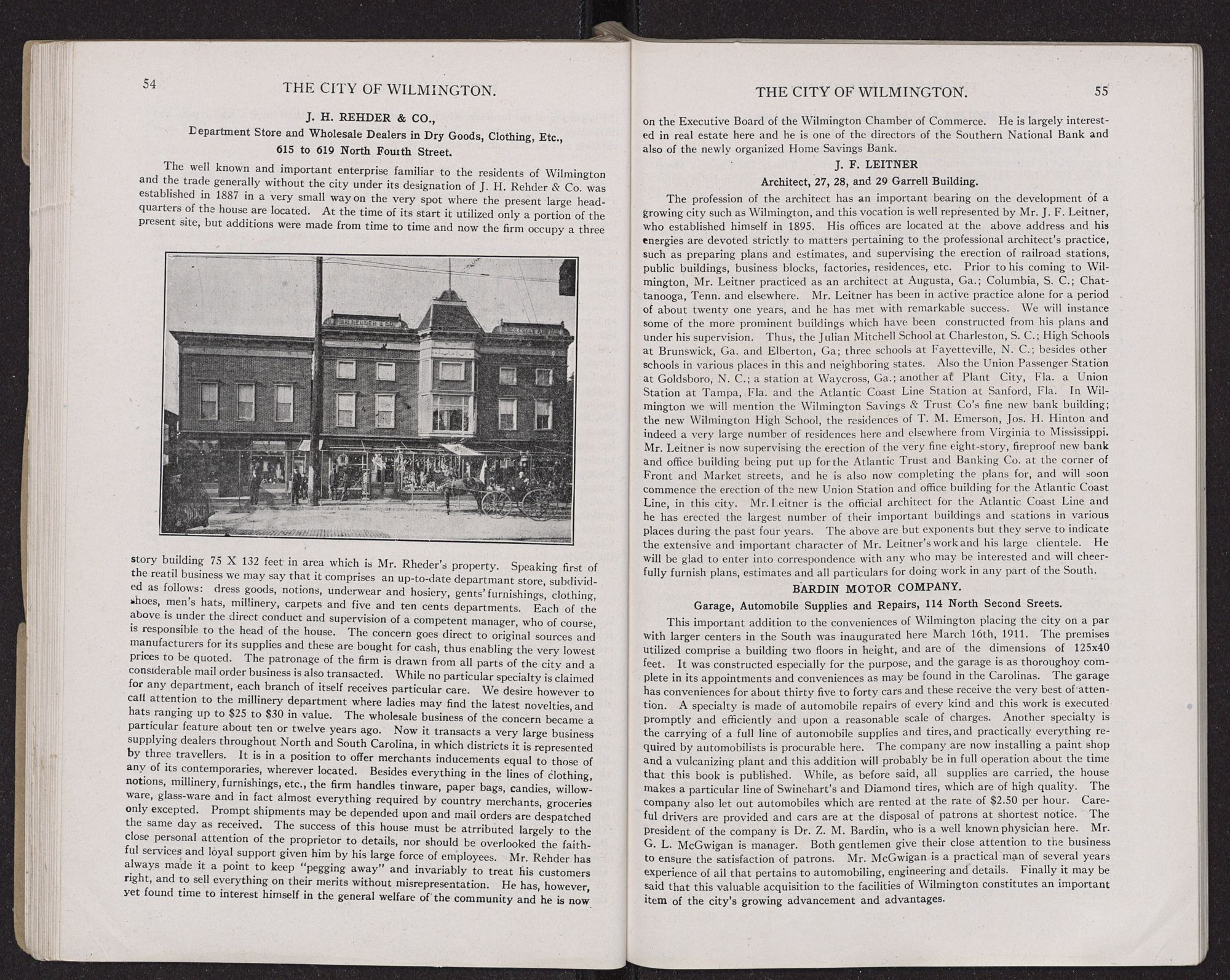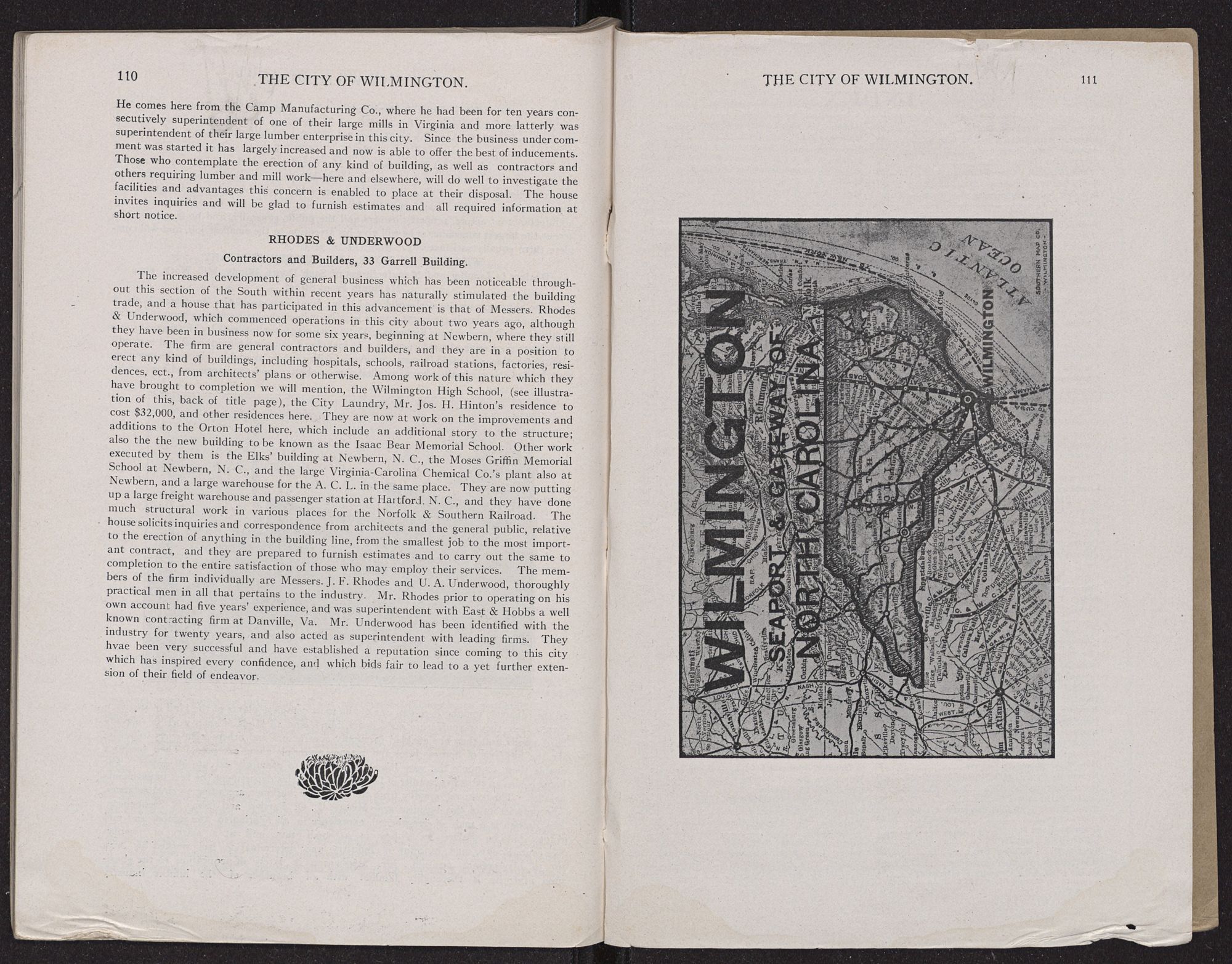The increased development of general business which has been noticeable throughout this section of the South within recent years has naturally stimulated the building trade, and a house that has participated in this advancement is that of Messers. Rhodes & Underwood, which commenced operations in this city about two years ago, although they have been in business now for some six years, beginning at Newbern, where they still operate. The firm are general contractors and builders, and they are in a position to erect any kind of buildings, including hospitals, schools, railroad stations, factories, residences, ect., from architects’ plans or otherwise. Among work of this nature which they have brought to completion we will mention, the Wilmington High School, (see illustration of this, back of title page), the City Laundry, Mr. Jos. H. Hinton's residence to cost $32,000, and other residences here. They are now at work on the improvements and additions to the Orton Hotel here, which include an additional story to the structure; also the the new building to be known as the Isaac Bear Memorial School. Other work executed by them is the Elks’ building at Newbern, N. C., the Moses Griffin Memorial School at Newbern, N. C., and the large Virginia-Carolina Chemical Co.’s plant also at Newbern, and a large warehouse for the A. C. L. in the same place. They are now putting up a large freight warehouse and passenger station at Hartford, N. C., and they have done much structural work in various places for the Norfolk & Southern Railroad. The house solicits inquiries and correspondence from architects and the general public, relative to the erection of anything in the building line, from the smallest job to the most important contract, and they are prepared to furnish estimates and to carry out the same to completion to the entire satisfaction of those who may employ their services. The members of the firm individually are Messers. J. F. Rhodes and U. A. Underwood, thoroughly practical men in all that pertains to the industry. Mr. Rhodes prior to operating on his own account had five years’ experience, and was superintendent with East & Hobbs a well known contracting firm at Danville, Va. Mr. Underwood has been identified with the industry for twenty years, and also acted as superintendent with leading firms. They hvae been very successful and have established a reputation since coming to this city which has inspired every confidence, and which bids fair to lead to a yet further extension of their field of endeavor.