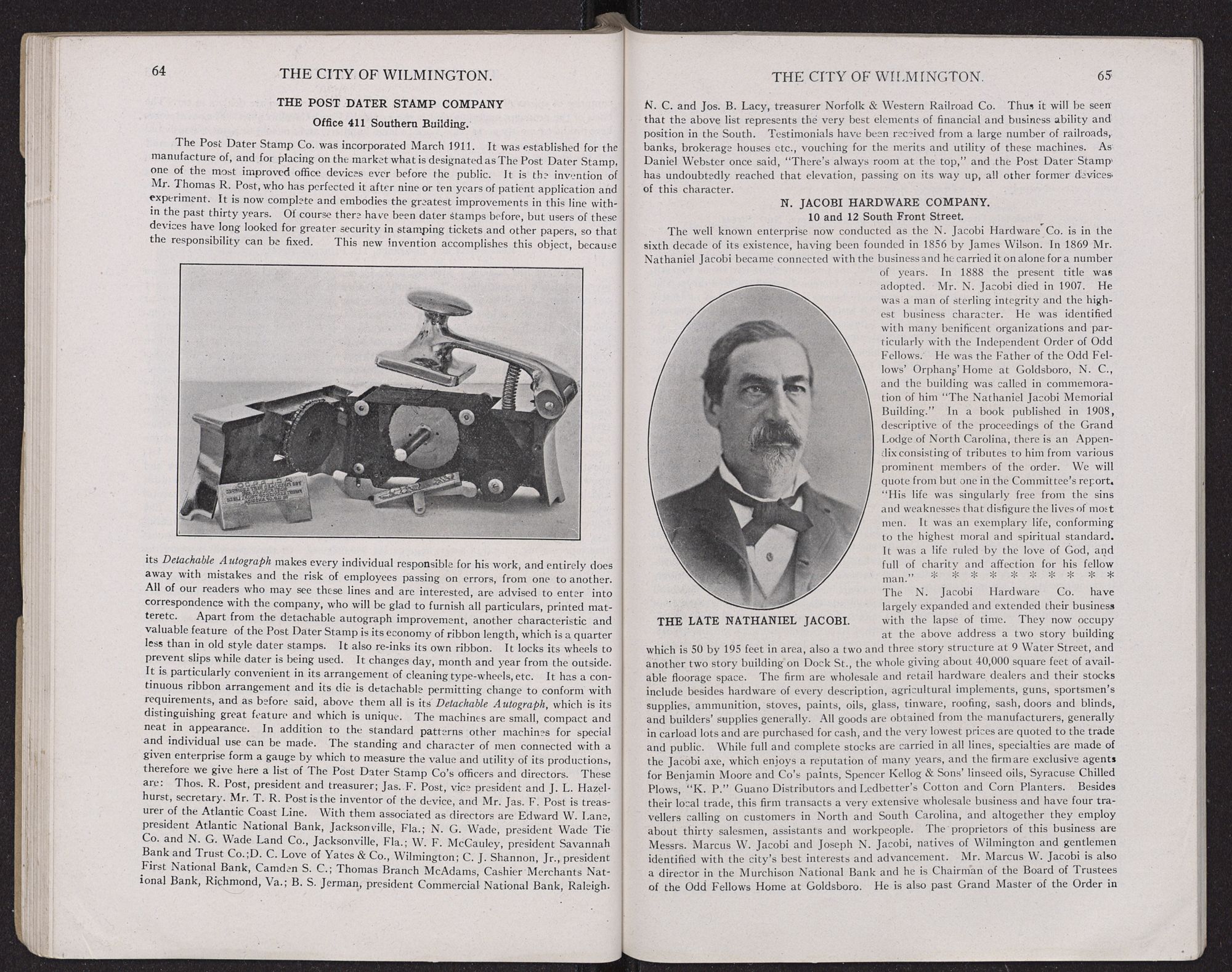 All of the above institutions are highly prosperous and their officers and directors are nearly all residents of the city and are men of broad minds, ample capital and high business intelligence, identified with Wilmington's best interests and prepared at all times to contribute of their time, labor and means for its material advancement.