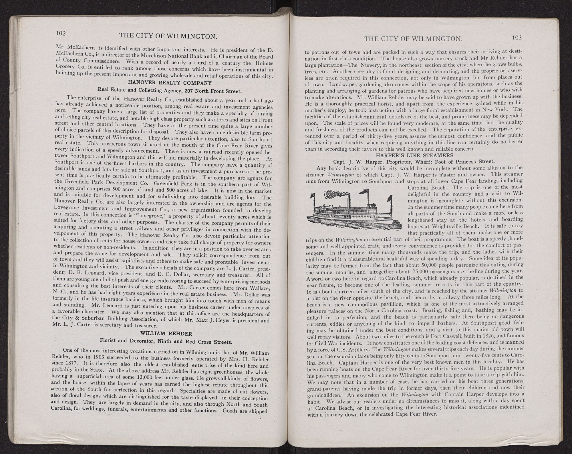 WILMINGTON is the metropolis, gateway and port of North Carolina and it is situated on the Cape Fear River thirty miles from its entrance to the ocean. It is, however, but eight miles distant from the seashore in an easterly direction. The population of Wilmington at the present time is in excess of 30,000 persons. Wilmington is located in latitude 34° 14′ north and in longitute 77° 57′ west of Greenwich and it has an elevation of about 50 feet above sea level. Next to the river is a gently rolling surface on which the city is built, and this allows of good drainage. The climate is a most delightful one, not excelled at any point in the United States. It is the best adapted for the successful operation of any branch of industry at all seasons of the year. The average temperature is 63 degrees. The warmest month of the year is July and the normal temperature is then about 80 degrees, the mean temperature for this month ranging from 77 degrees to 84 degrees in different years. The humidity at Wilmington is much below many places in the country both North and South, and in the evening of each summer day, there usually comes a refreshing breeze which has a most revivifying and exhilarating effect. The average rainfall for a period of about thirty years has been around fifty-four inches. The greatest rains come during the heated season, and thus aids to stimulate vegetation, affording luxuriant crops. However quite a considerable quantity of rain is precipitated in the spring, and this is very beneficial to the truck, fruit and strawberry crops. There is very little snow, often none at all during the winter months, and even when it does fall, it is very seldom that it remains on the ground more than a few hours.