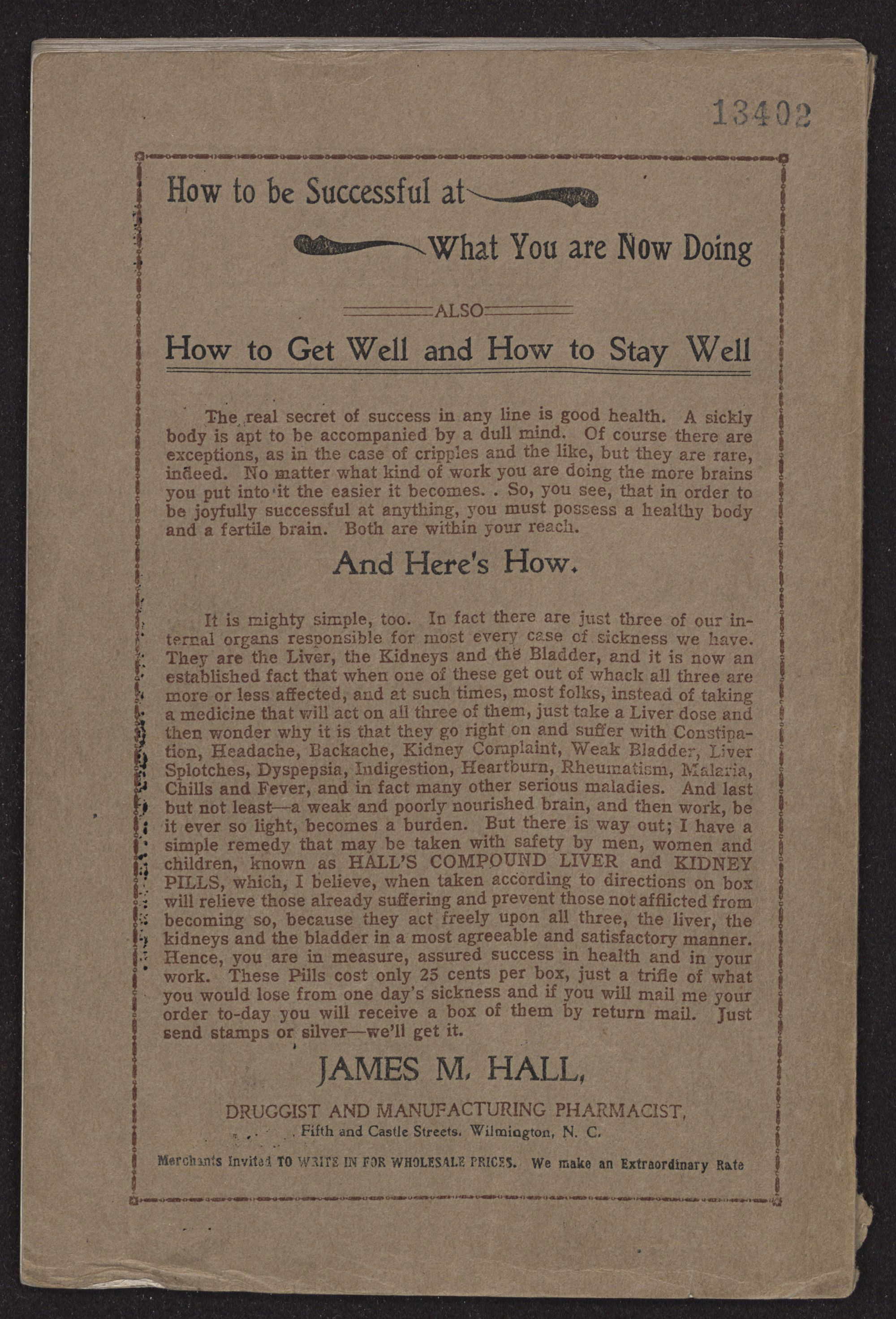 It is mighty simple, too. In fact there are just three of our internal organs responsible for most every case of sickness we have. They are the Liver, the Kidneys and the Bladder, and it is now an established fact that when one of these get out of whack all three are more or less affected, and at such times, most folks, instead of taking a medicine that will act on all three of them, just take a Liver dose and then wonder why it is that they go right on and suffer with Constipation, Headache, Backache, Kidney Complaint, Weak Bladder, Liver Splotches, Dyspepsia, Indigestion, Heartburn, Rheumatism, Malaria, Chills and Fever, and in fact many other serious maladies. And last but not least—a weak and poorly nourished brain, and then work, be it ever so light, becomes a burden. But there is way out; I have a simple remedy that may be taken with safety by men, women and children, known as HALL'S COMPOUND LIVER and KIDNEY PILLS, which, I believe, when taken according to directions on box will relieve those already suffering and prevent those not afflicted from becoming so, because they act freely upon all three, the liver, the kidneys and the bladder in a most agreeable and satisfactory manner. Hence, you are in measure, assured success in health and in your work. These Pills cost only 25 cents per box, just a trifle of what you would lose from one day's sickness and if you will mail me your order to-day you will receive a box of them by return mail. Just send stamps or silver—we'll get it.