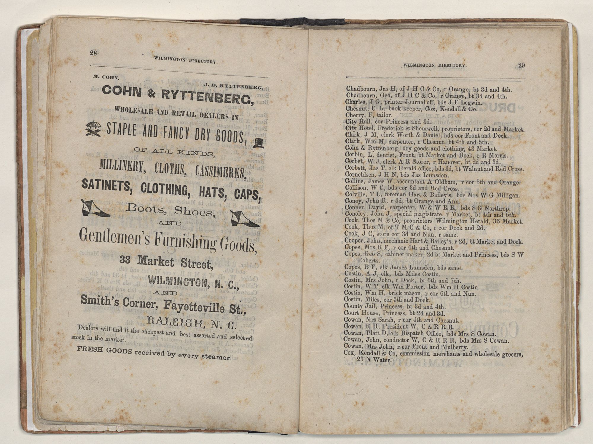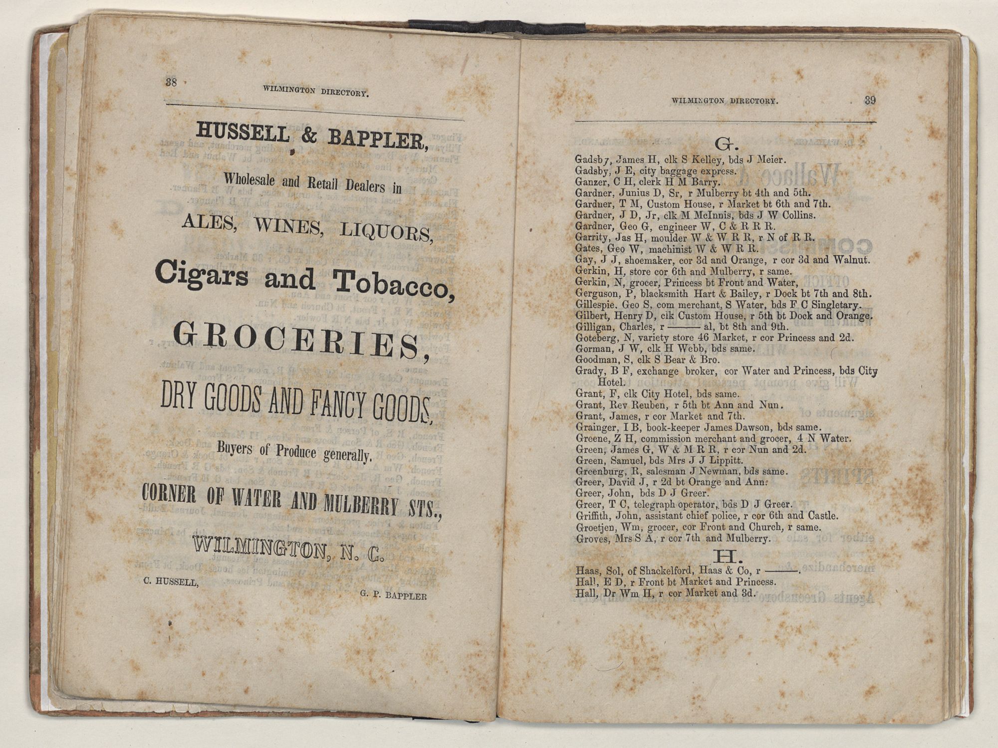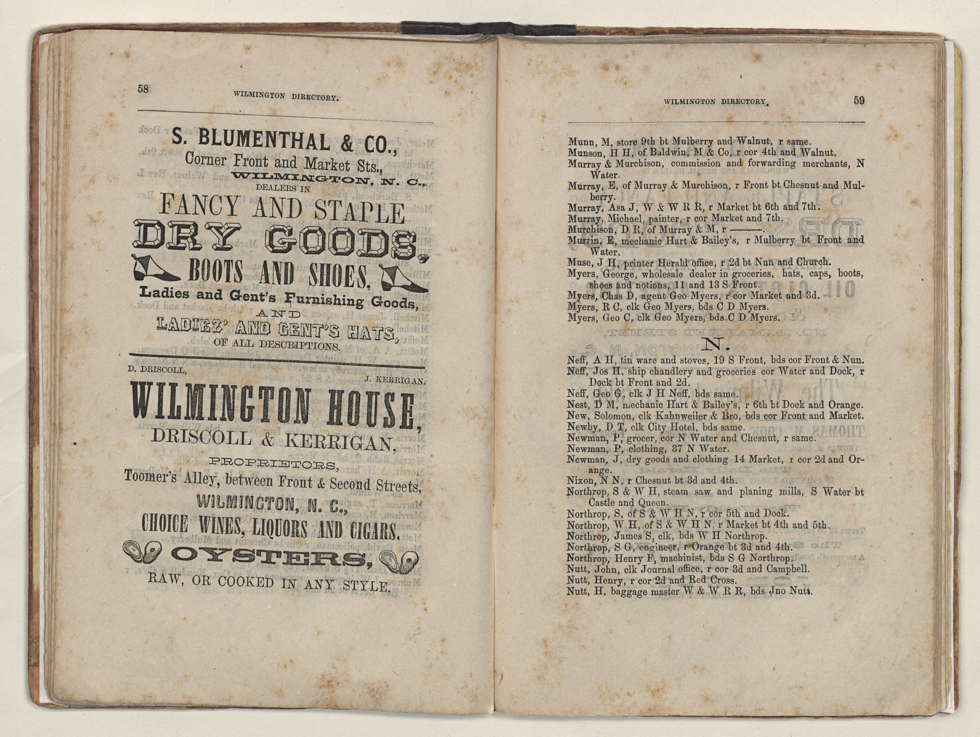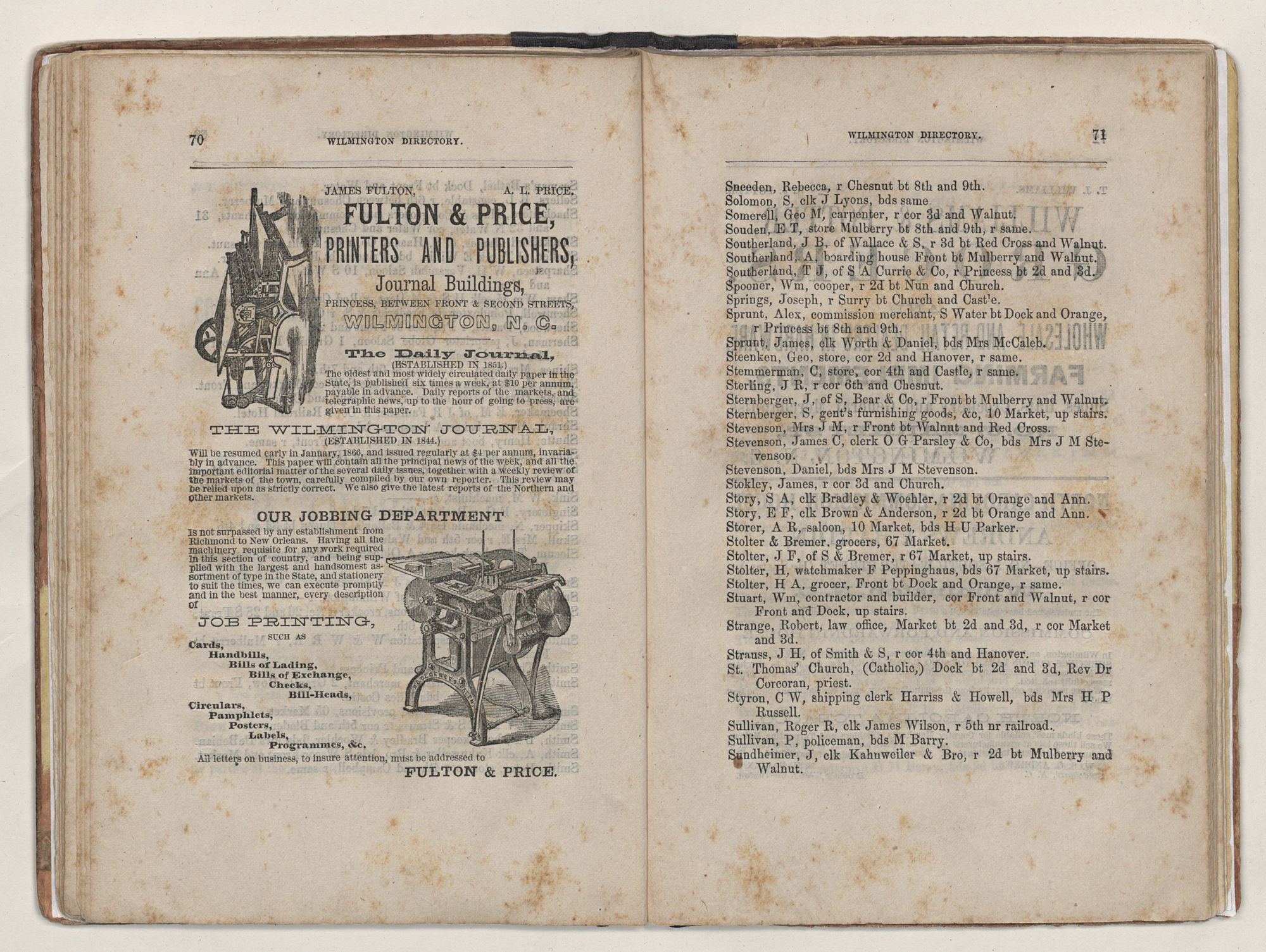 WILMINGTON DIRECTORY, INCLUDING A General and City Business DIRECTORY, FOR 1865—66.COMPILED BY FRANK. D. SMAW. JR.WILMINGTON, N. C.:PUBLISHED BY P. HEINSBERGER, BOOK-BINDER AND BLANK BOOK MANUFACTURER, JOURNAL BUILDINGS.FULTON & PRICE, STEAM POWER PRESS PRINTERS: 1865.