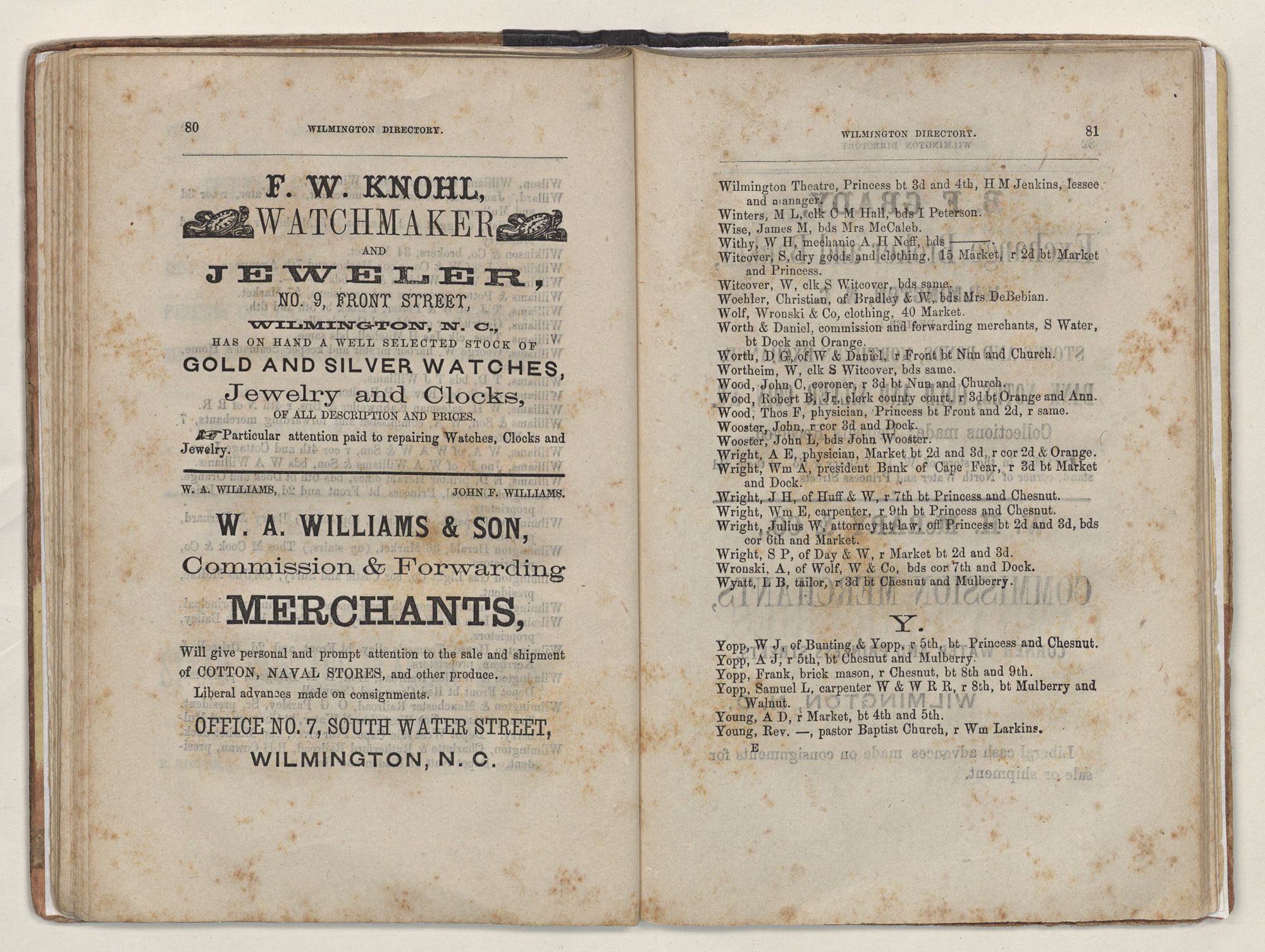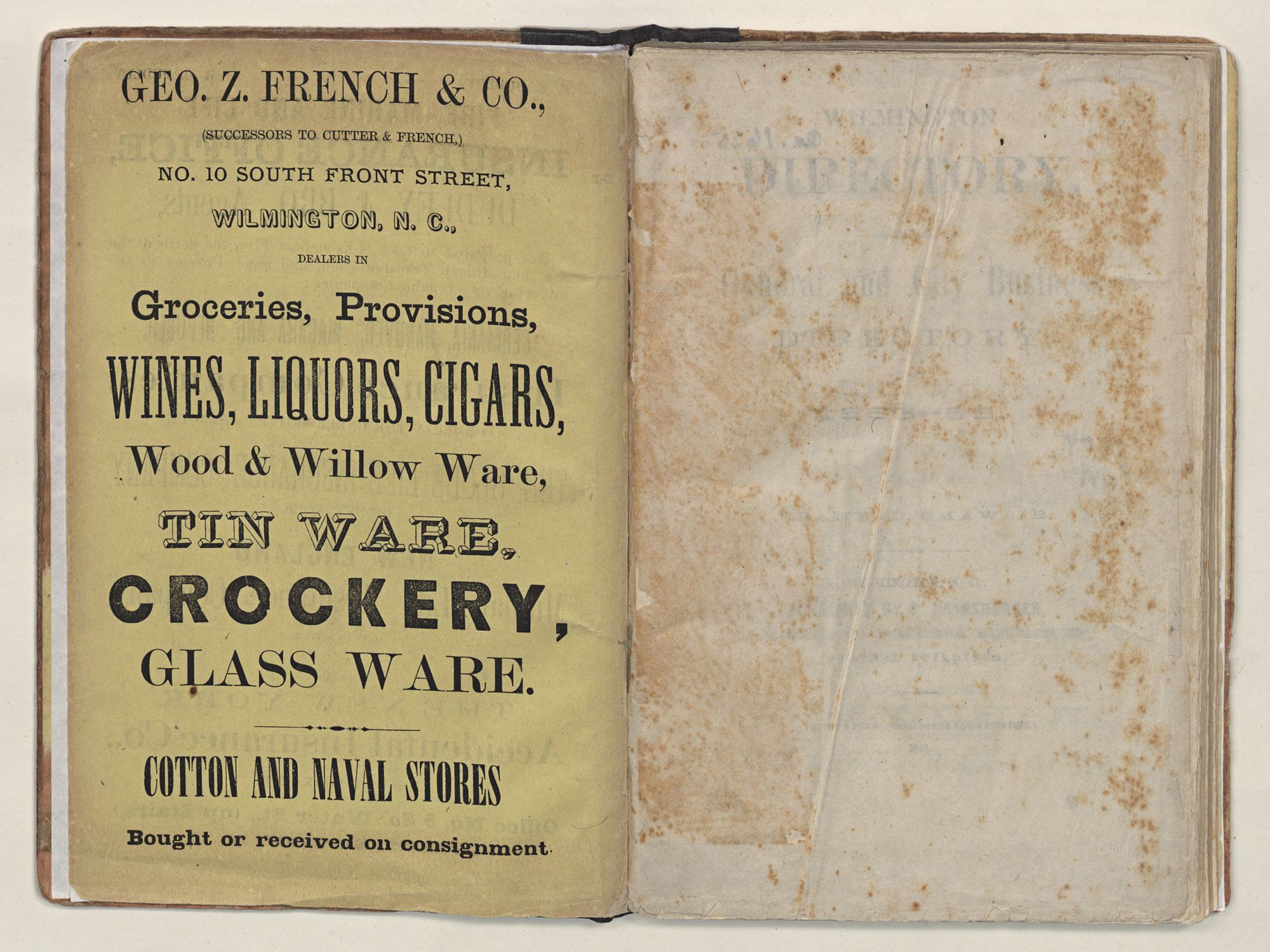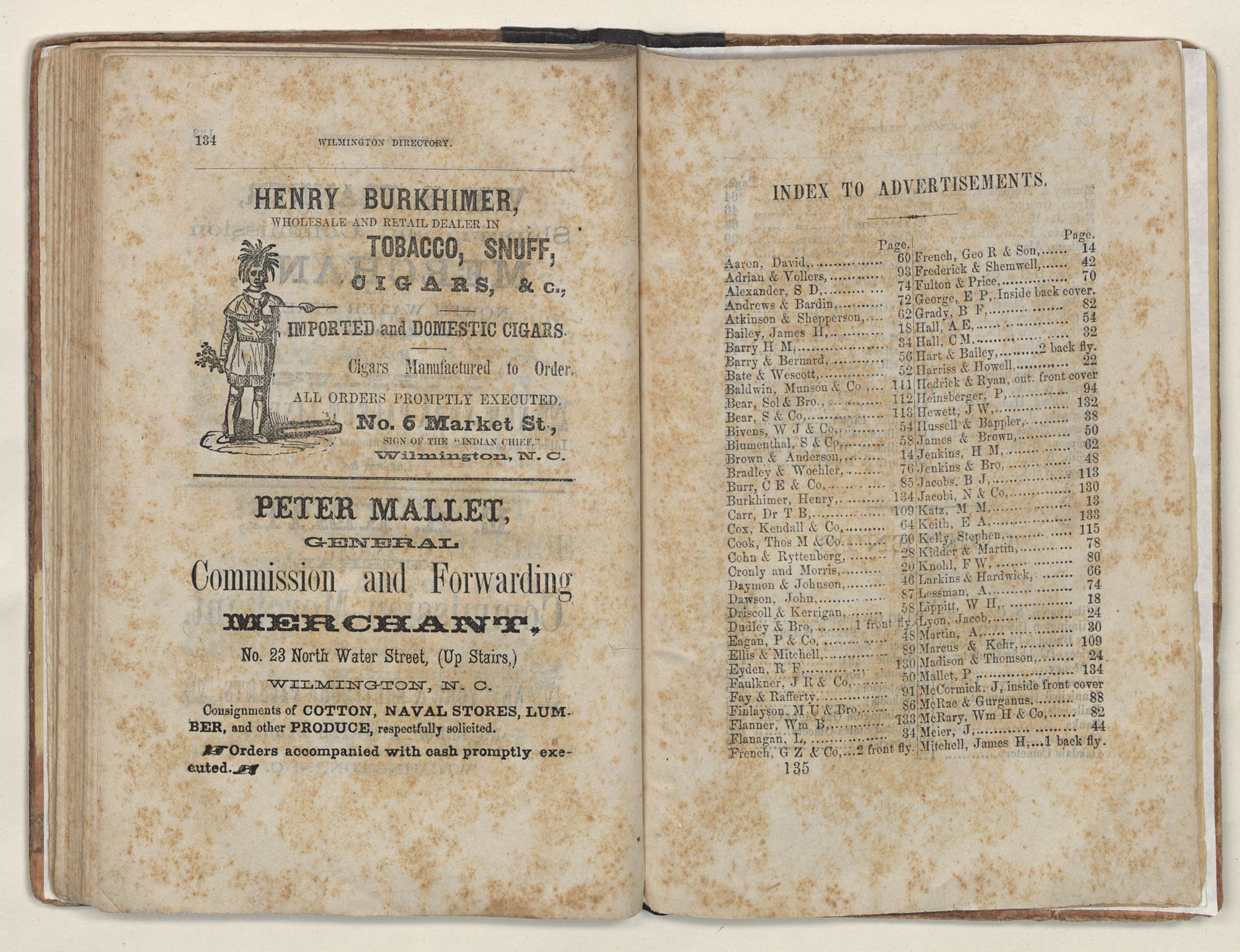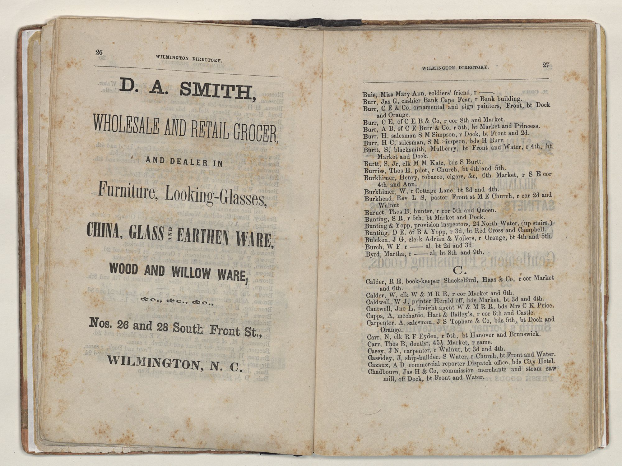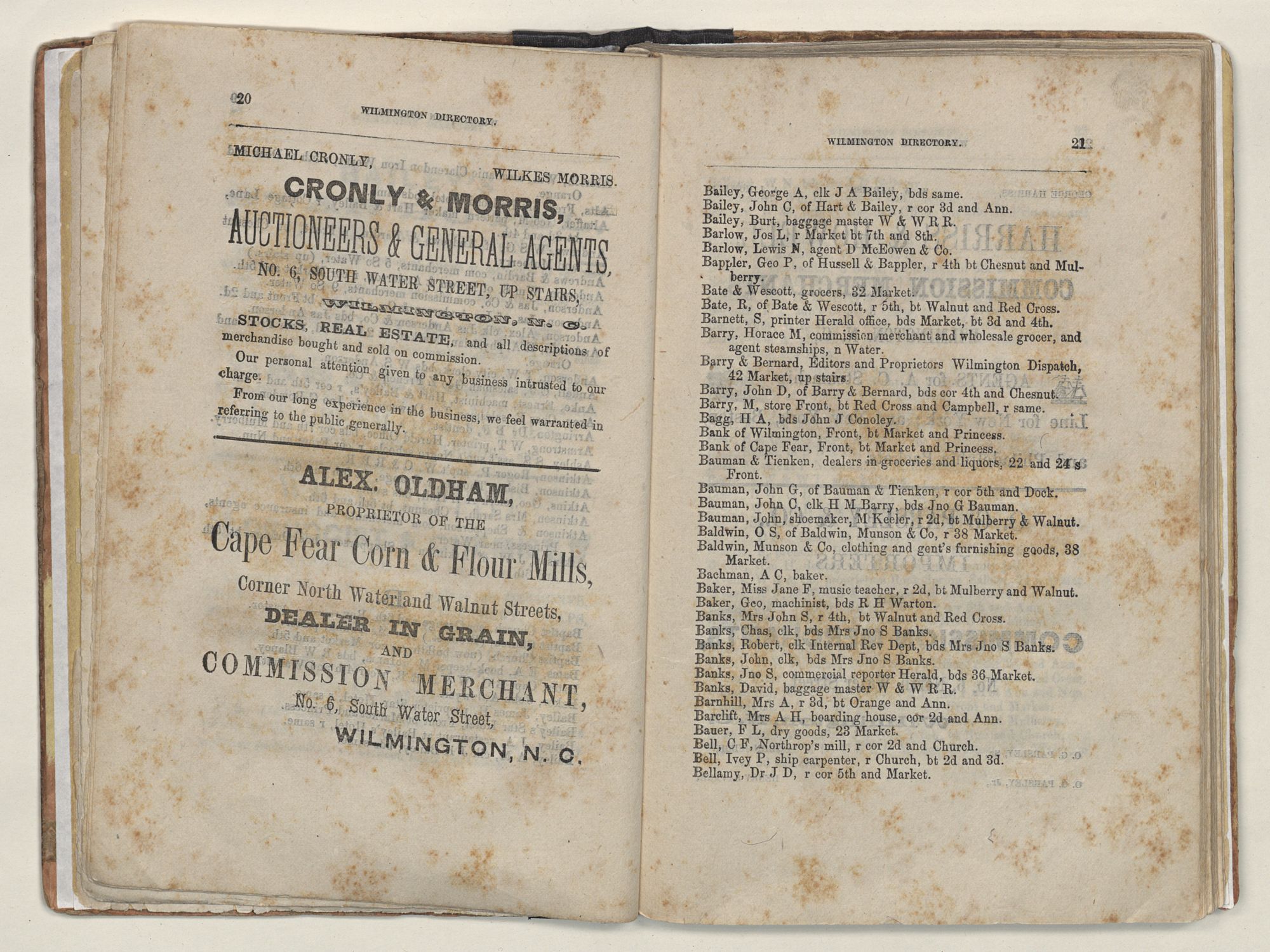 WILMINGTON DIRECTORY, INCLUDING A General and City Business DIRECTORY, FOR 1865—66.COMPILED BY FRANK. D. SMAW. JR.WILMINGTON, N. C.:PUBLISHED BY P. HEINSBERGER, BOOK-BINDER AND BLANK BOOK MANUFACTURER, JOURNAL BUILDINGS.FULTON & PRICE, STEAM POWER PRESS PRINTERS: 1865.
