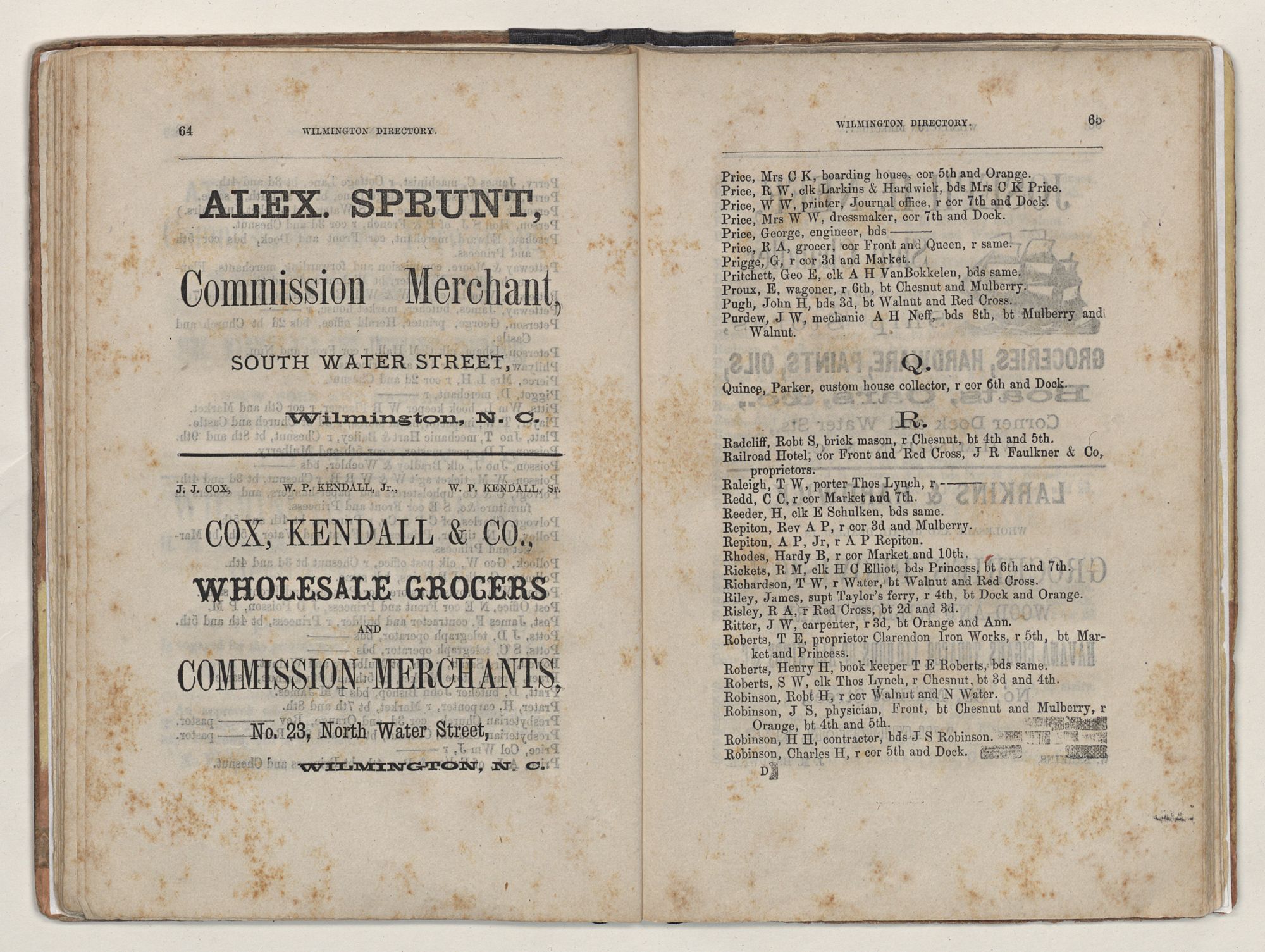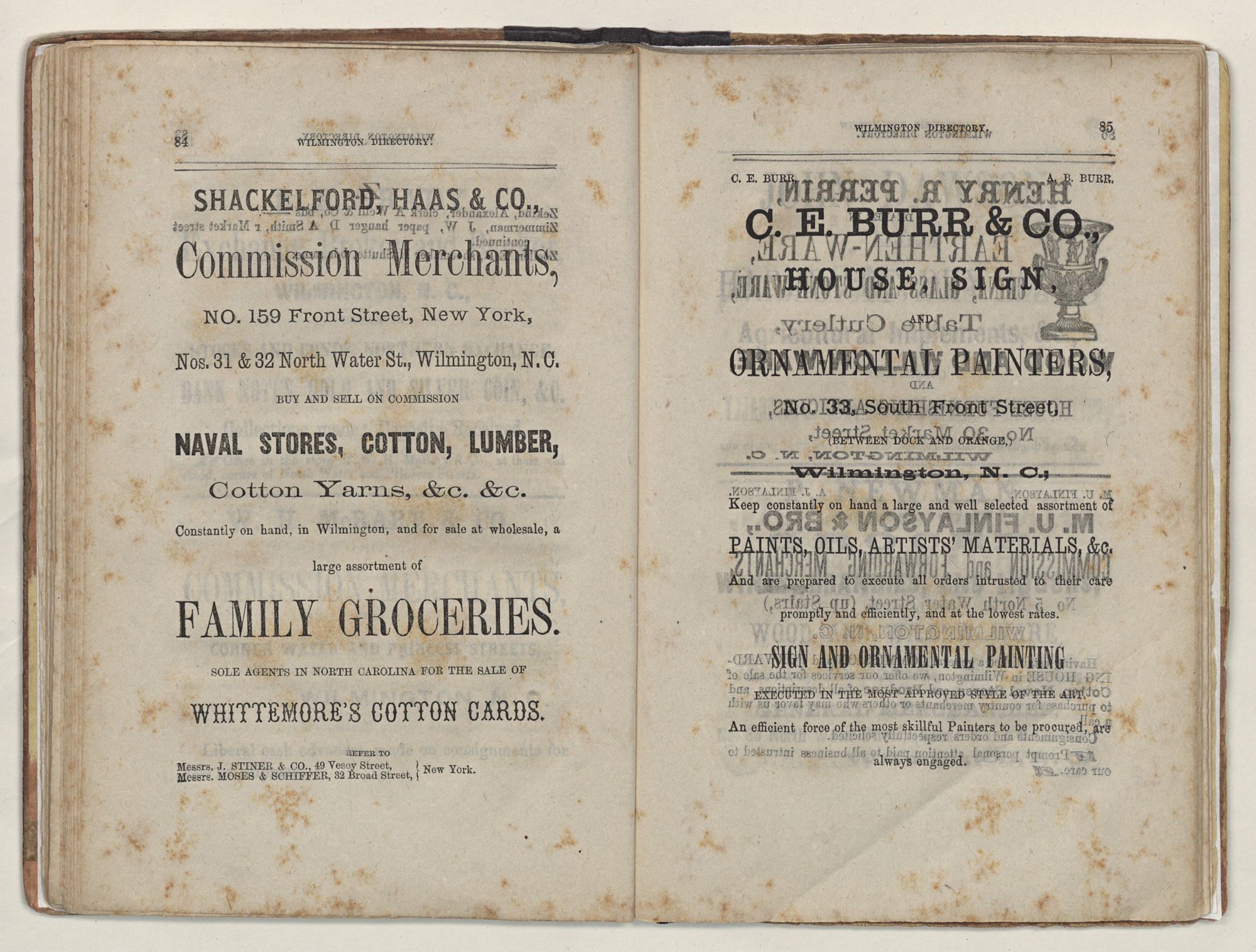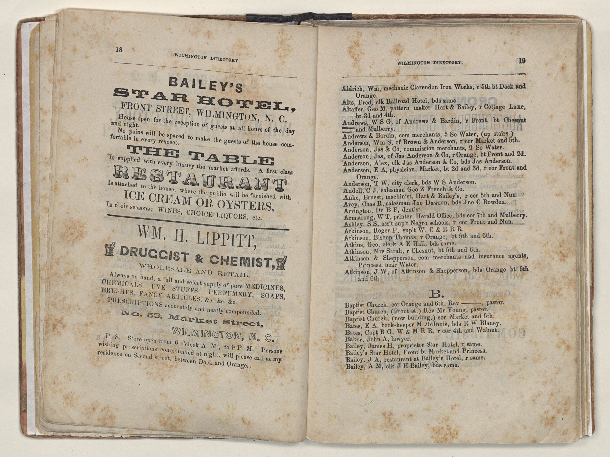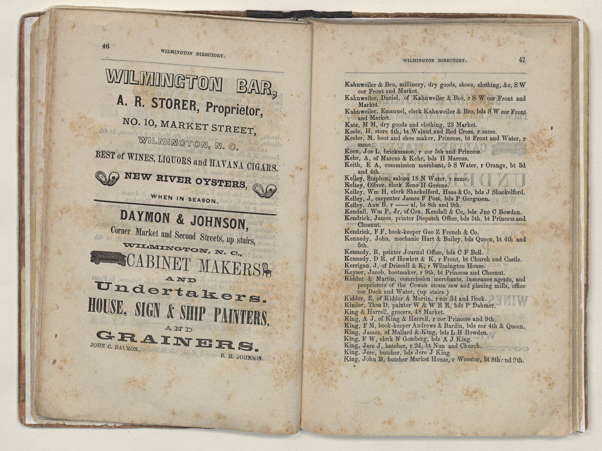 WILMINGTON DIRECTORY, INCLUDING A General and City Business DIRECTORY, FOR 1865—66.COMPILED BY FRANK. D. SMAW. JR.WILMINGTON, N. C.:PUBLISHED BY P. HEINSBERGER, BOOK-BINDER AND BLANK BOOK MANUFACTURER, JOURNAL BUILDINGS.FULTON & PRICE, STEAM POWER PRESS PRINTERS: 1865.