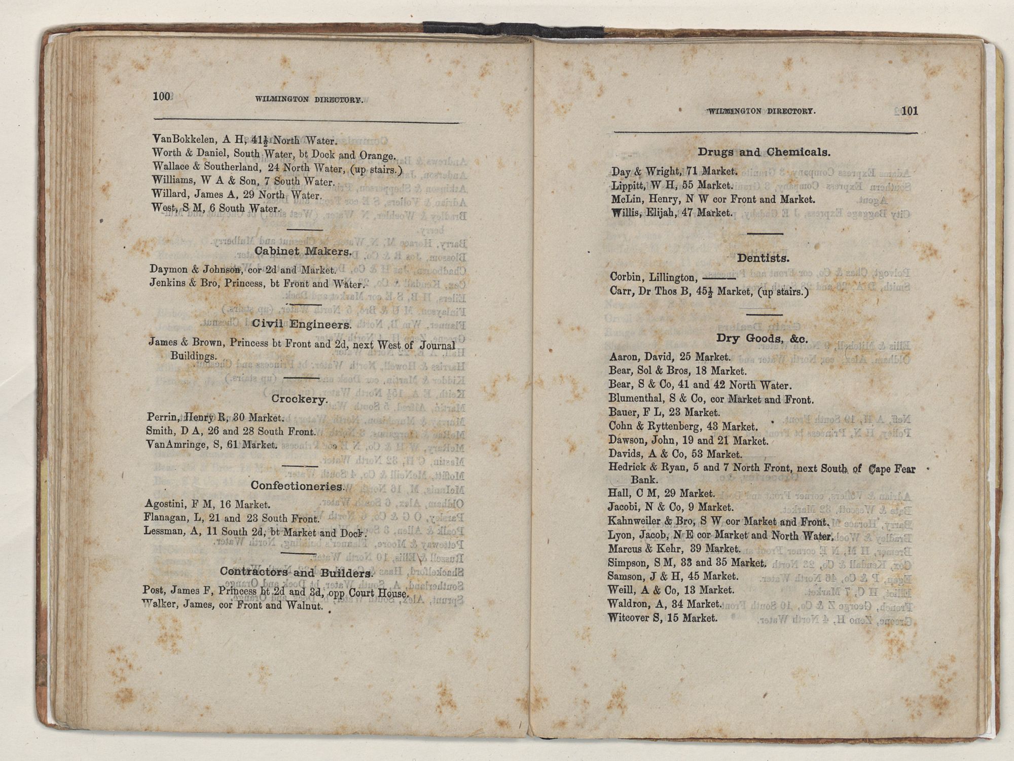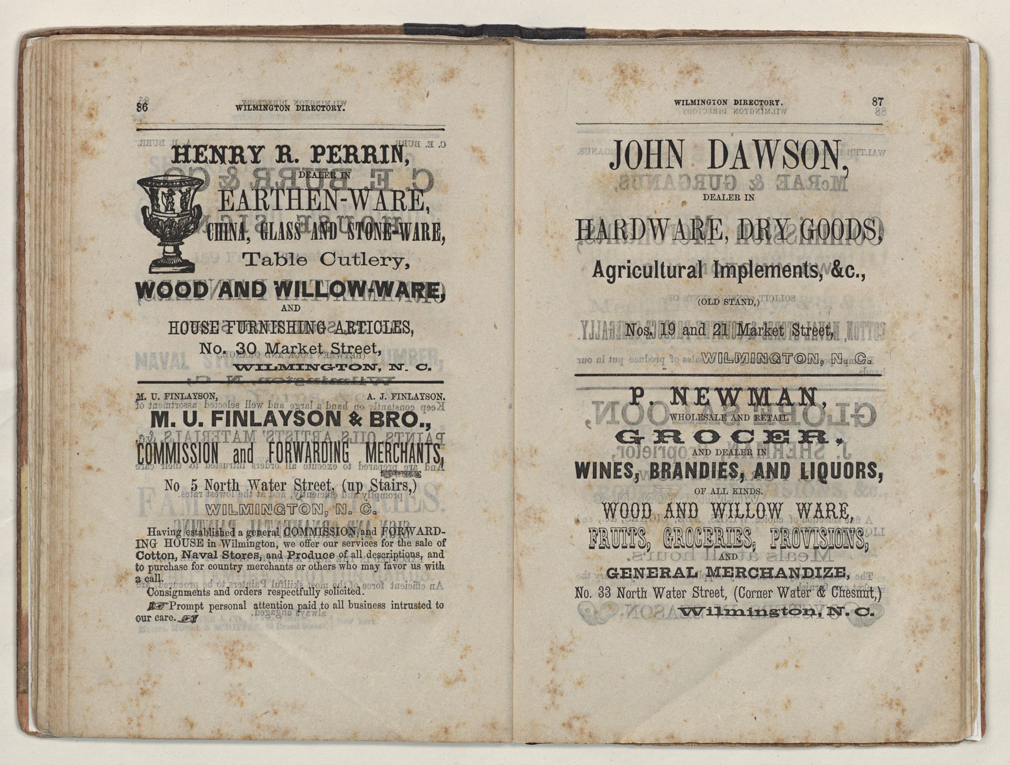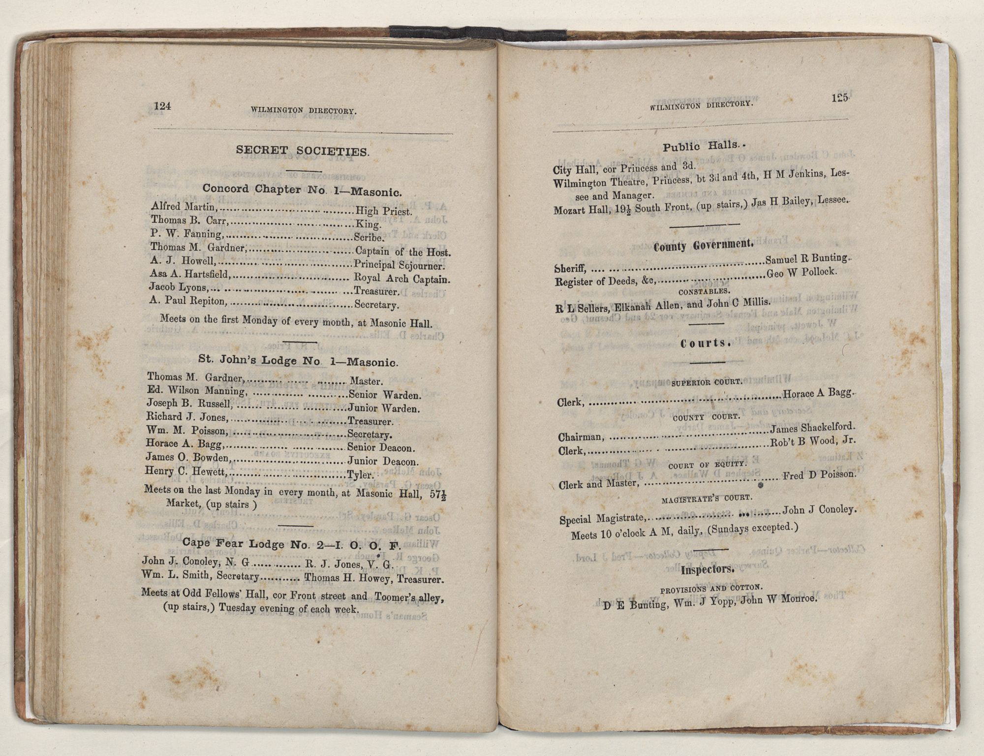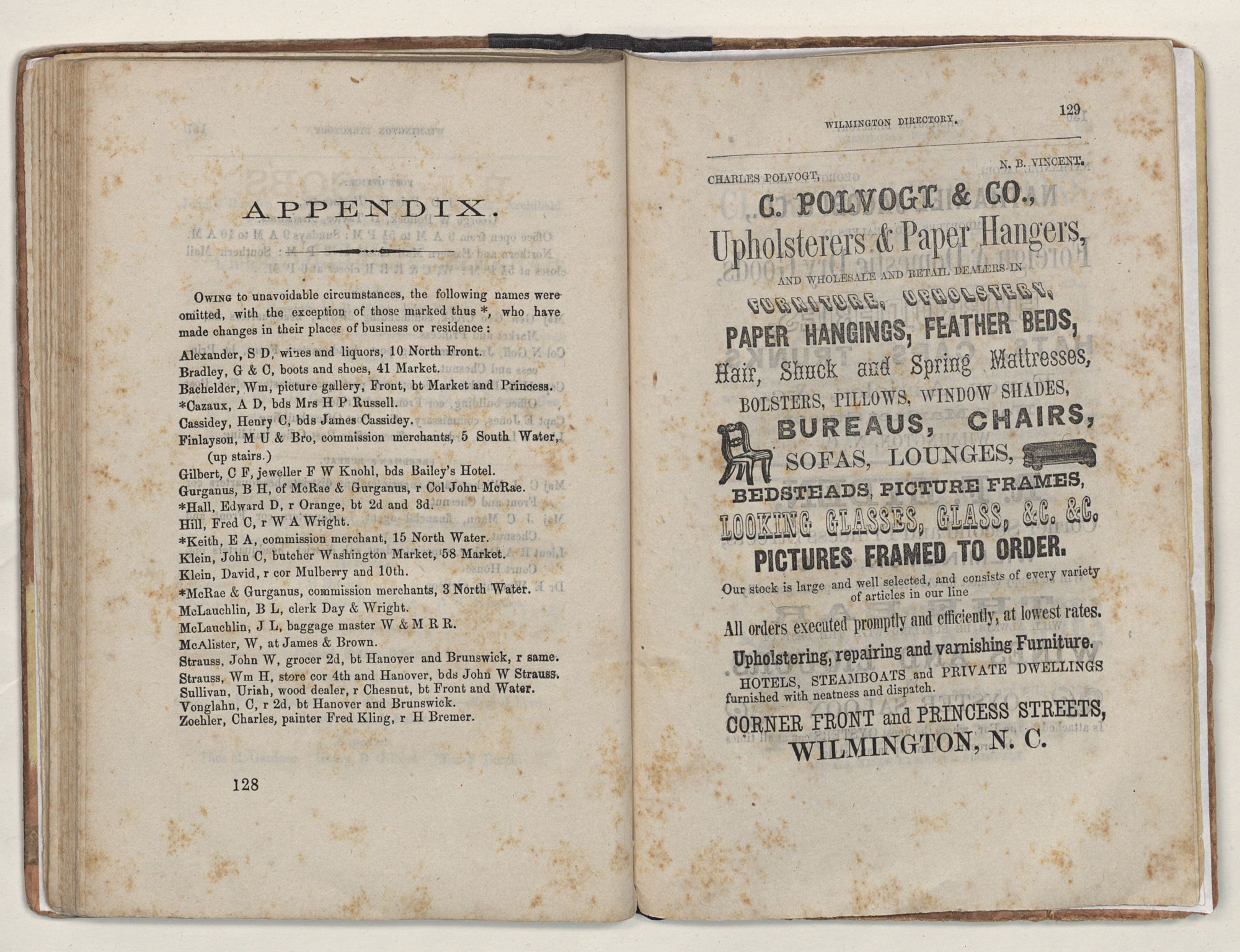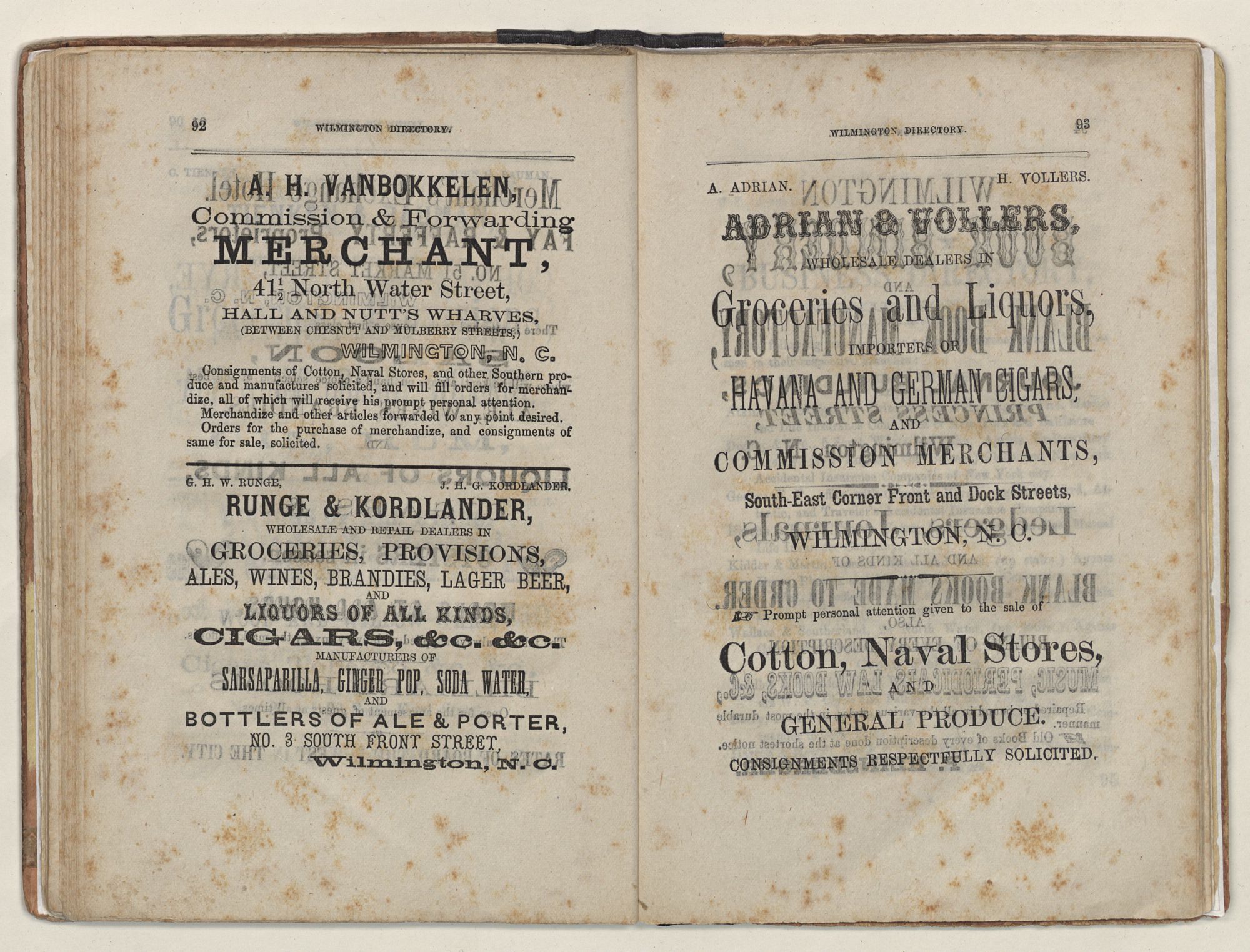 WILMINGTON DIRECTORY, INCLUDING A General and City Business DIRECTORY, FOR 1865—66.COMPILED BY FRANK. D. SMAW. JR.WILMINGTON, N. C.:PUBLISHED BY P. HEINSBERGER, BOOK-BINDER AND BLANK BOOK MANUFACTURER, JOURNAL BUILDINGS.FULTON & PRICE, STEAM POWER PRESS PRINTERS: 1865.