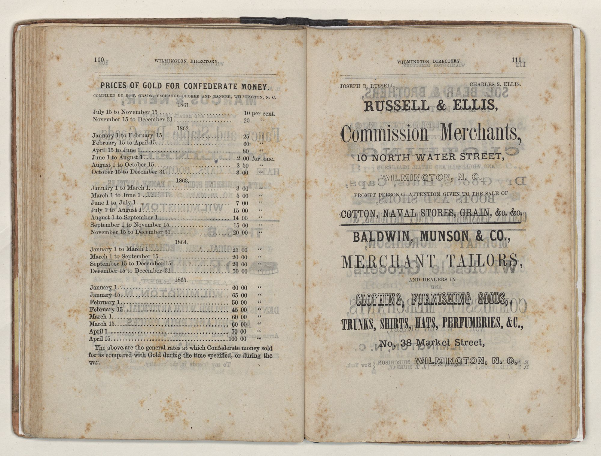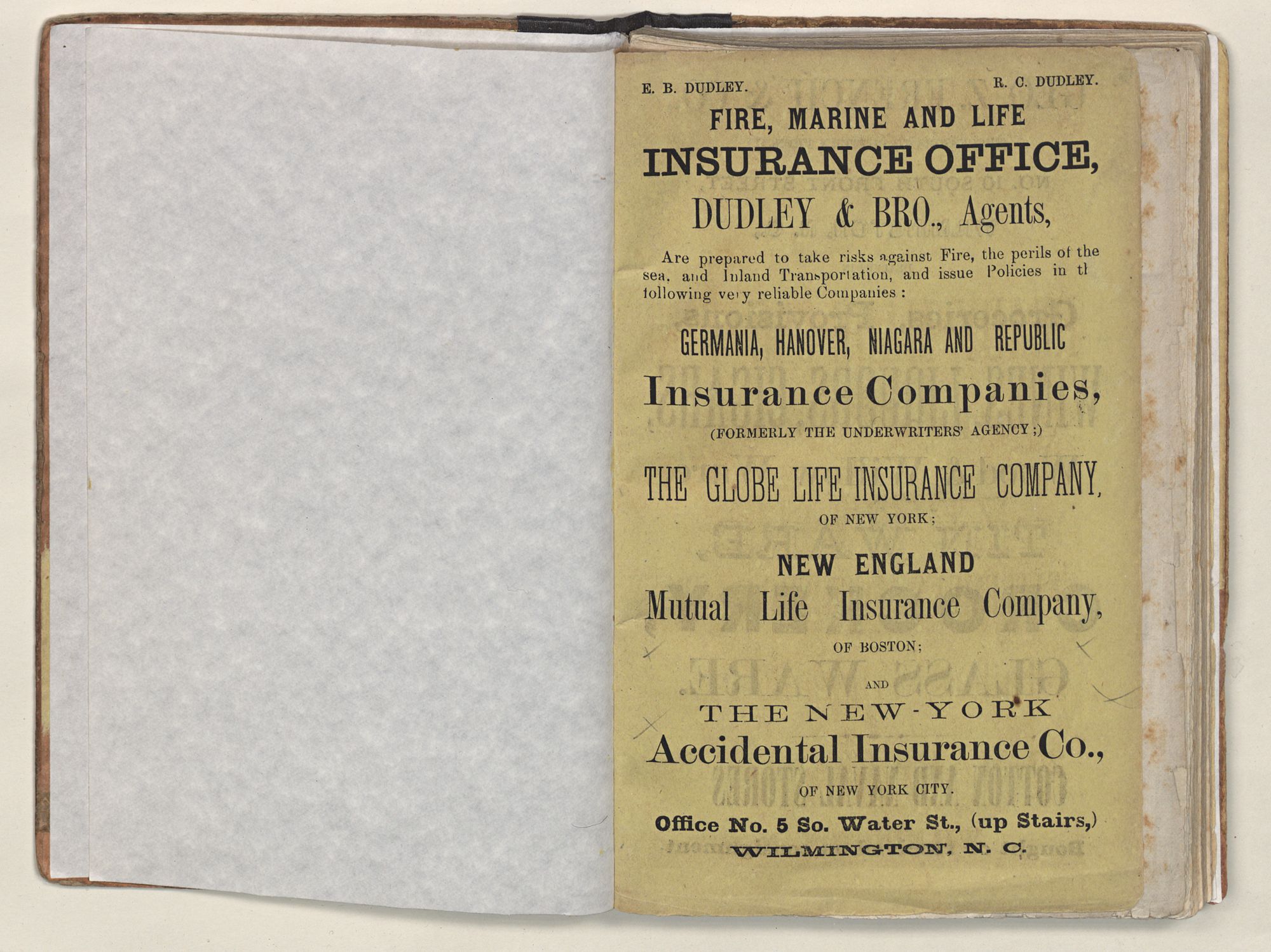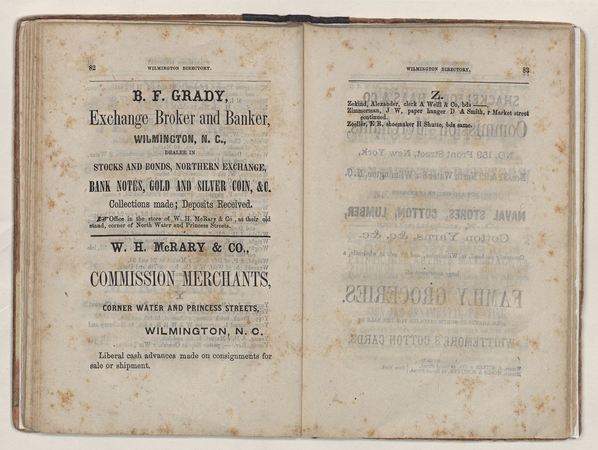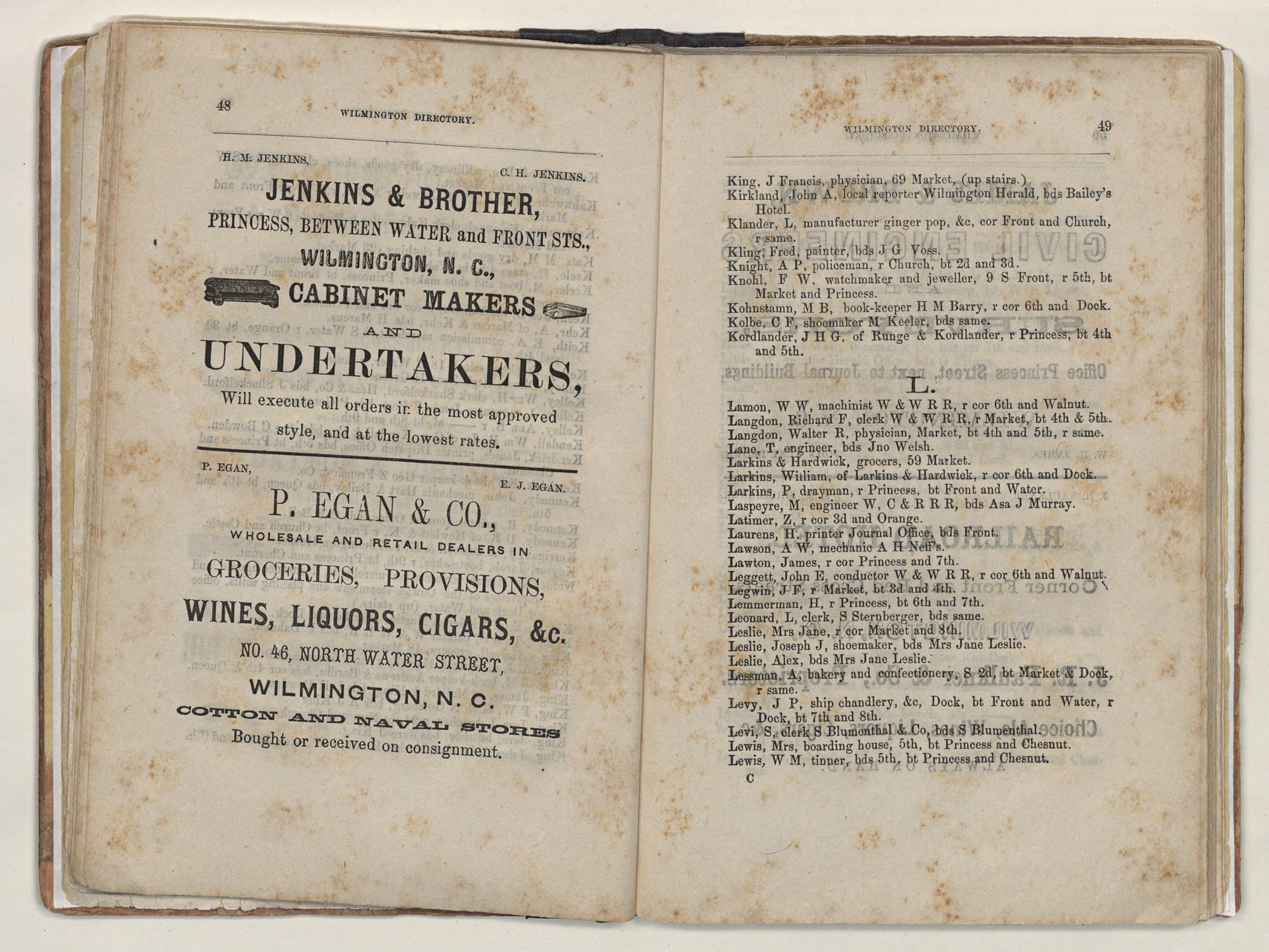 WILMINGTON DIRECTORY, INCLUDING A General and City Business DIRECTORY, FOR 1865—66.COMPILED BY FRANK. D. SMAW. JR.WILMINGTON, N. C.:PUBLISHED BY P. HEINSBERGER, BOOK-BINDER AND BLANK BOOK MANUFACTURER, JOURNAL BUILDINGS.FULTON & PRICE, STEAM POWER PRESS PRINTERS: 1865.