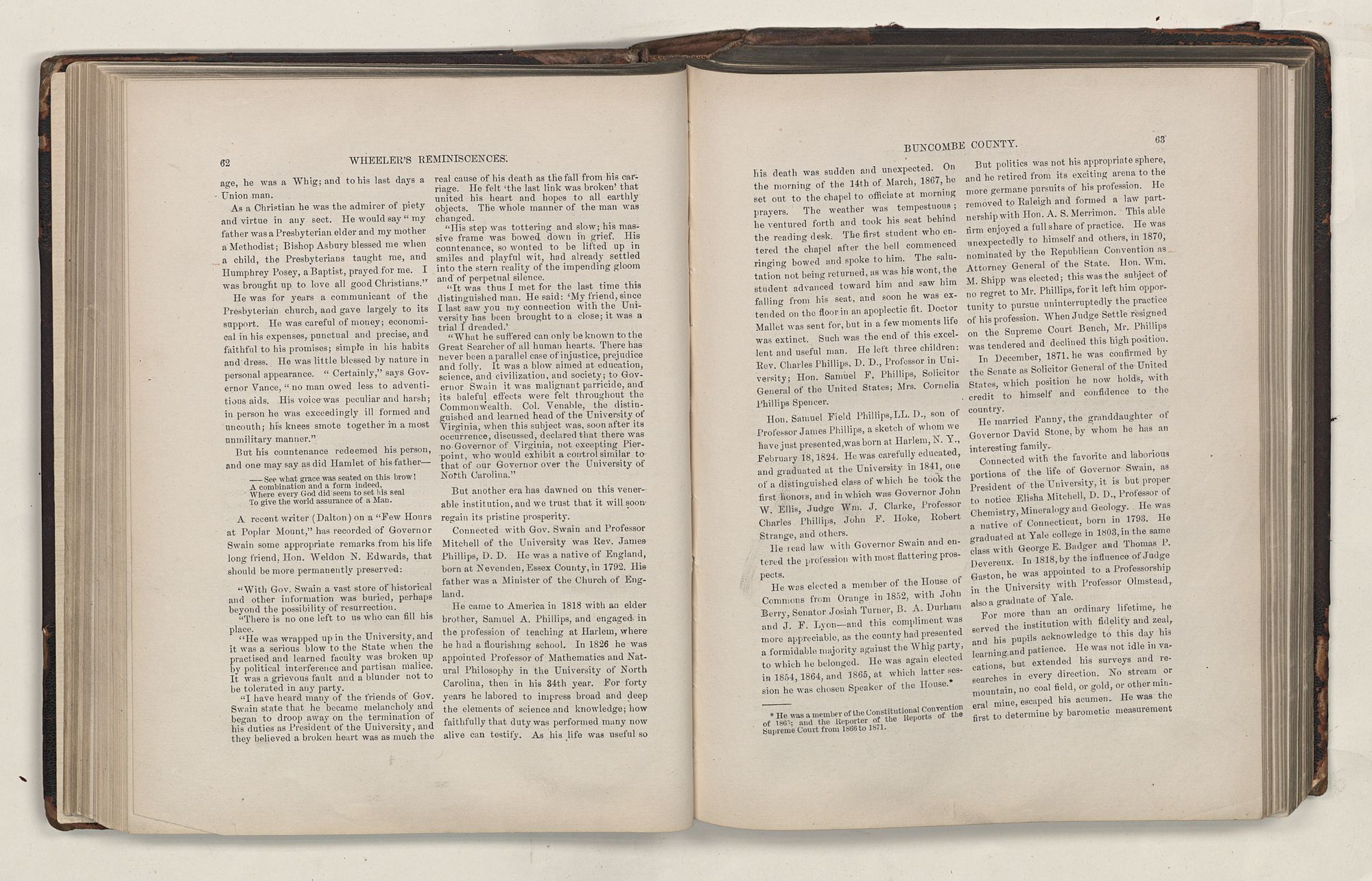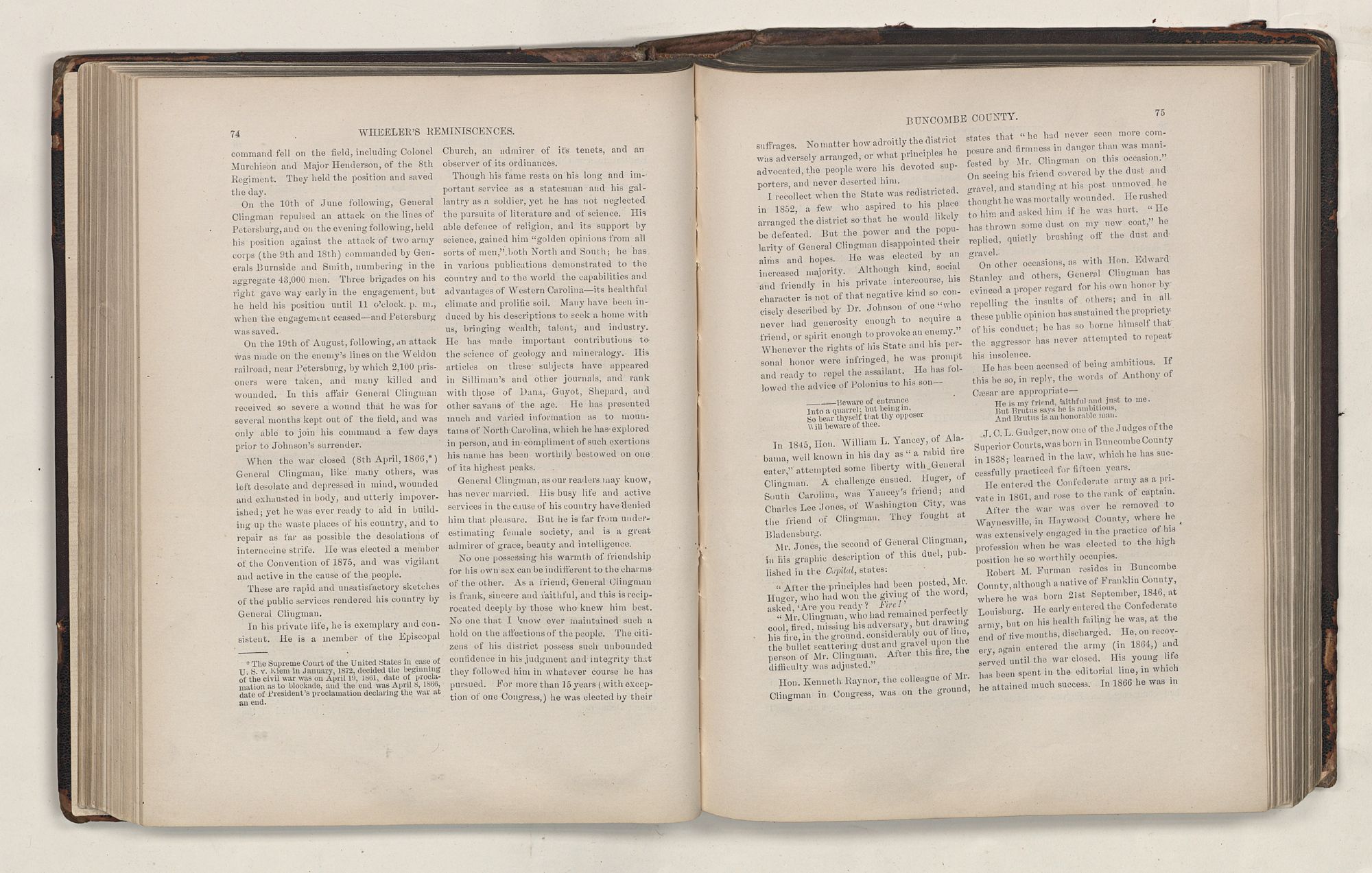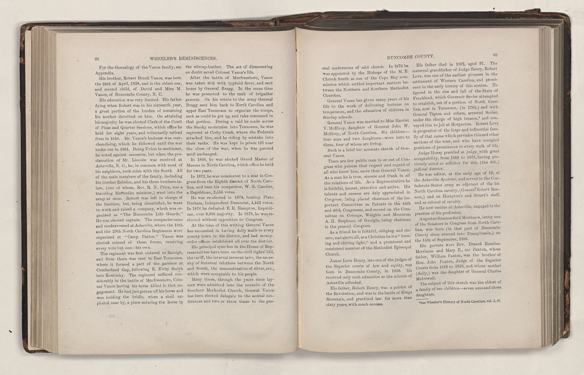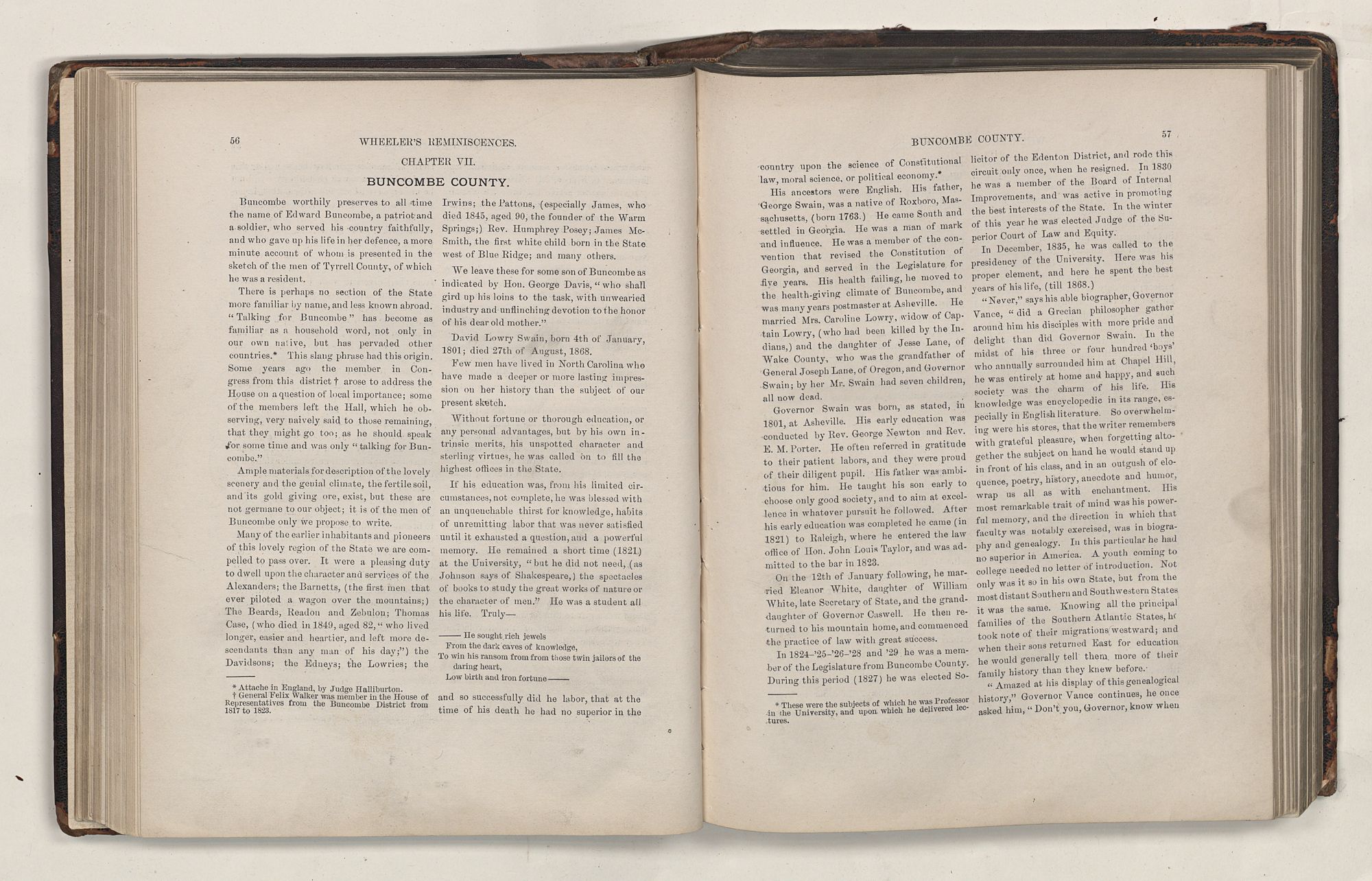 Character and services of Colonel Edward Buncombe, after whom this County is named. Sketch of David L. Swain, his life, services and death; Sketches of Professors Mitchell and Phillips of the University of North Carolina; of Samuel F. Phillips. Sketch of Zebulon B. Vance; extracts from a work on the Vance family, printed at Cork, Ireland, showing the relationship of General Andrew Jackson to the Vances; letter to General Kilpatrick from Governor Z. B. Vance. Sketch of Robert B. Vance; of James L. Henry, late one of the Judges of the Superior Court; of Augustus S. Merrimon, late Judge and U. S. Senator; of Thomas L. Clingman, late U. S. Senator, his life and services; duel with William L. Yancey; of John L. Bailey, late Judge of the Superior Court; of Robert M. Furman; of Thomas D. Johnston.