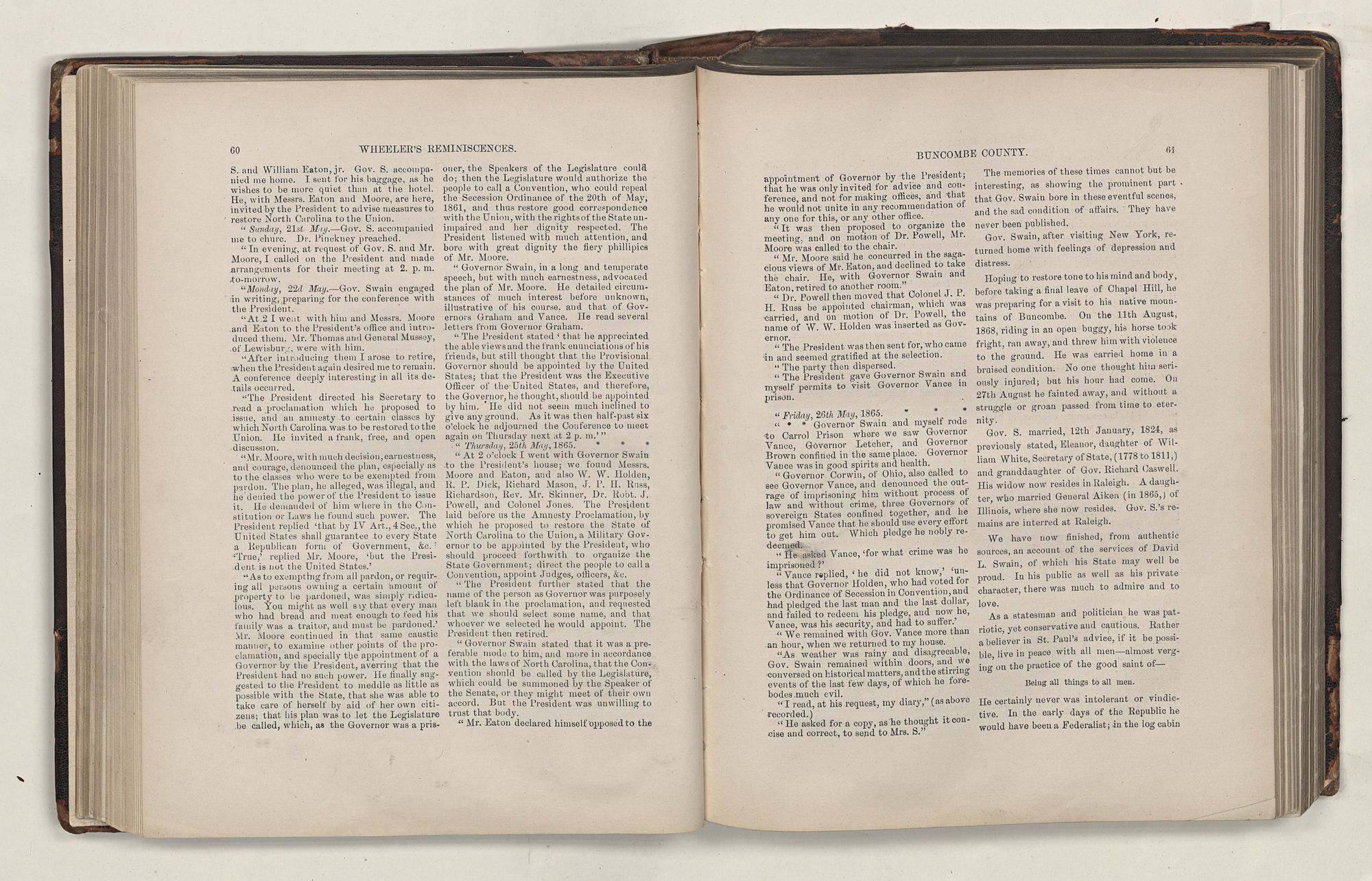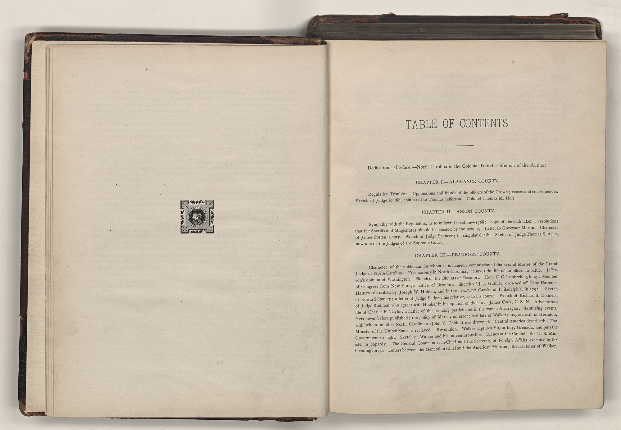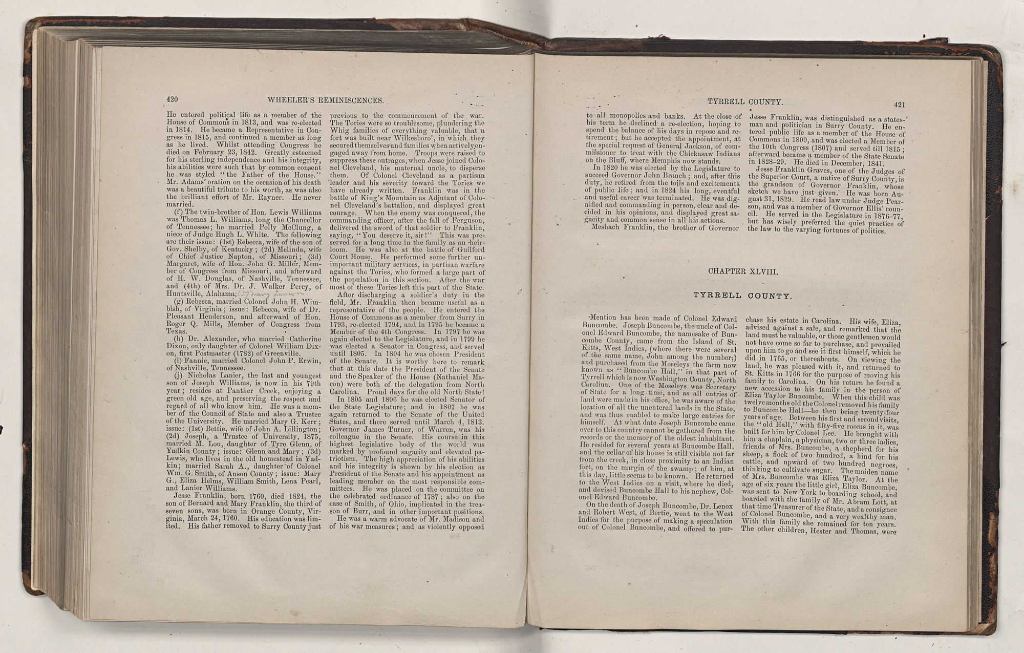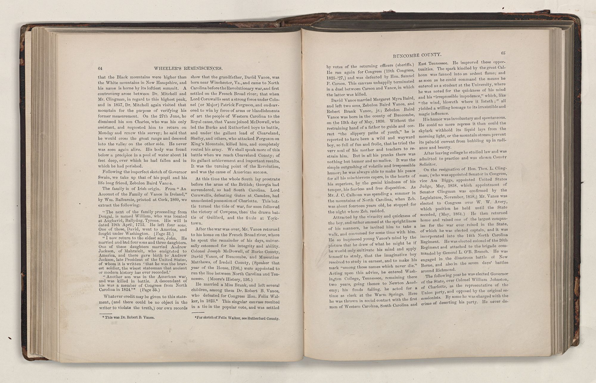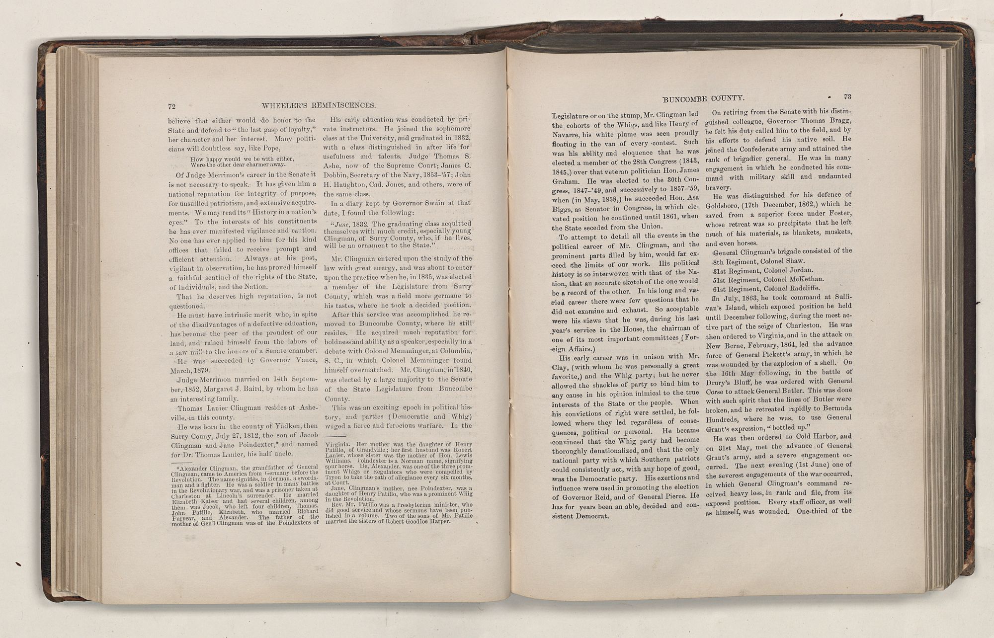 Character and services of Colonel Edward Buncombe, after whom this County is named. Sketch of David L. Swain, his life, services and death; Sketches of Professors Mitchell and Phillips of the University of North Carolina; of Samuel F. Phillips. Sketch of Zebulon B. Vance; extracts from a work on the Vance family, printed at Cork, Ireland, showing the relationship of General Andrew Jackson to the Vances; letter to General Kilpatrick from Governor Z. B. Vance. Sketch of Robert B. Vance; of James L. Henry, late one of the Judges of the Superior Court; of Augustus S. Merrimon, late Judge and U. S. Senator; of Thomas L. Clingman, late U. S. Senator, his life and services; duel with William L. Yancey; of John L. Bailey, late Judge of the Superior Court; of Robert M. Furman; of Thomas D. Johnston.