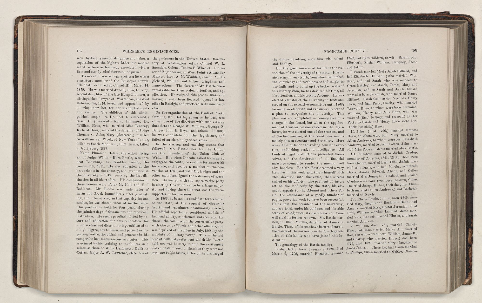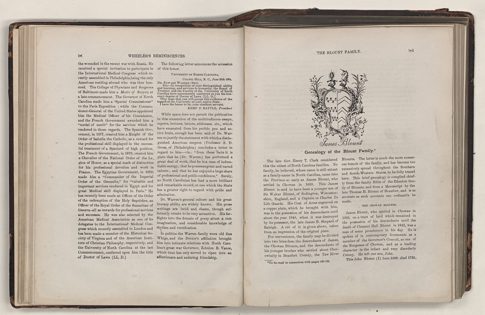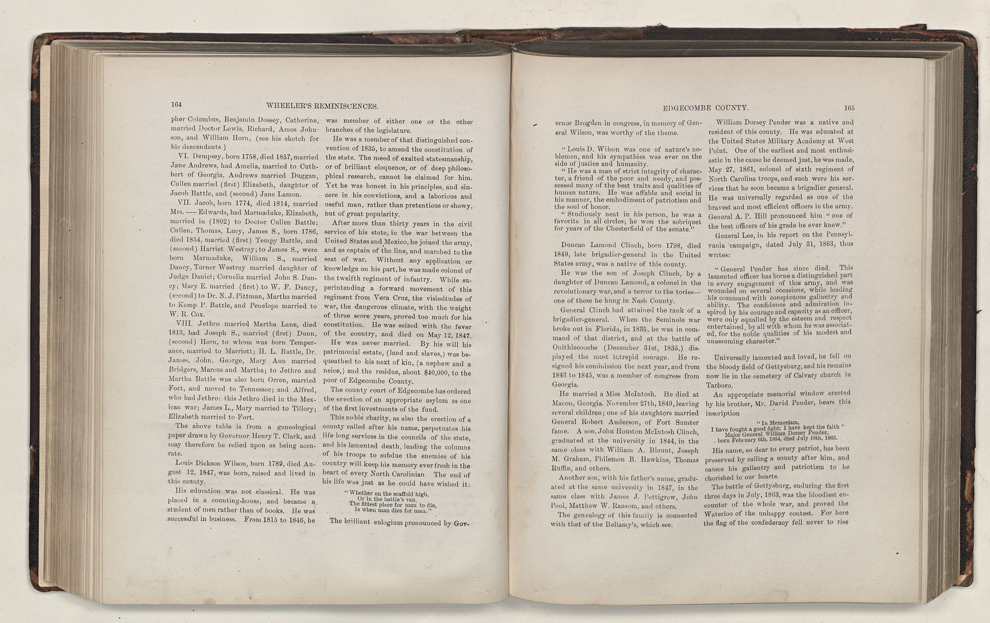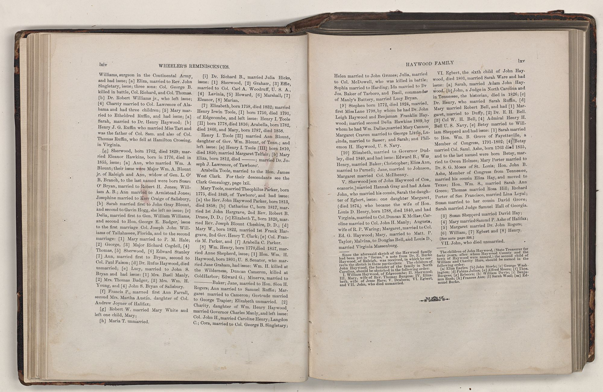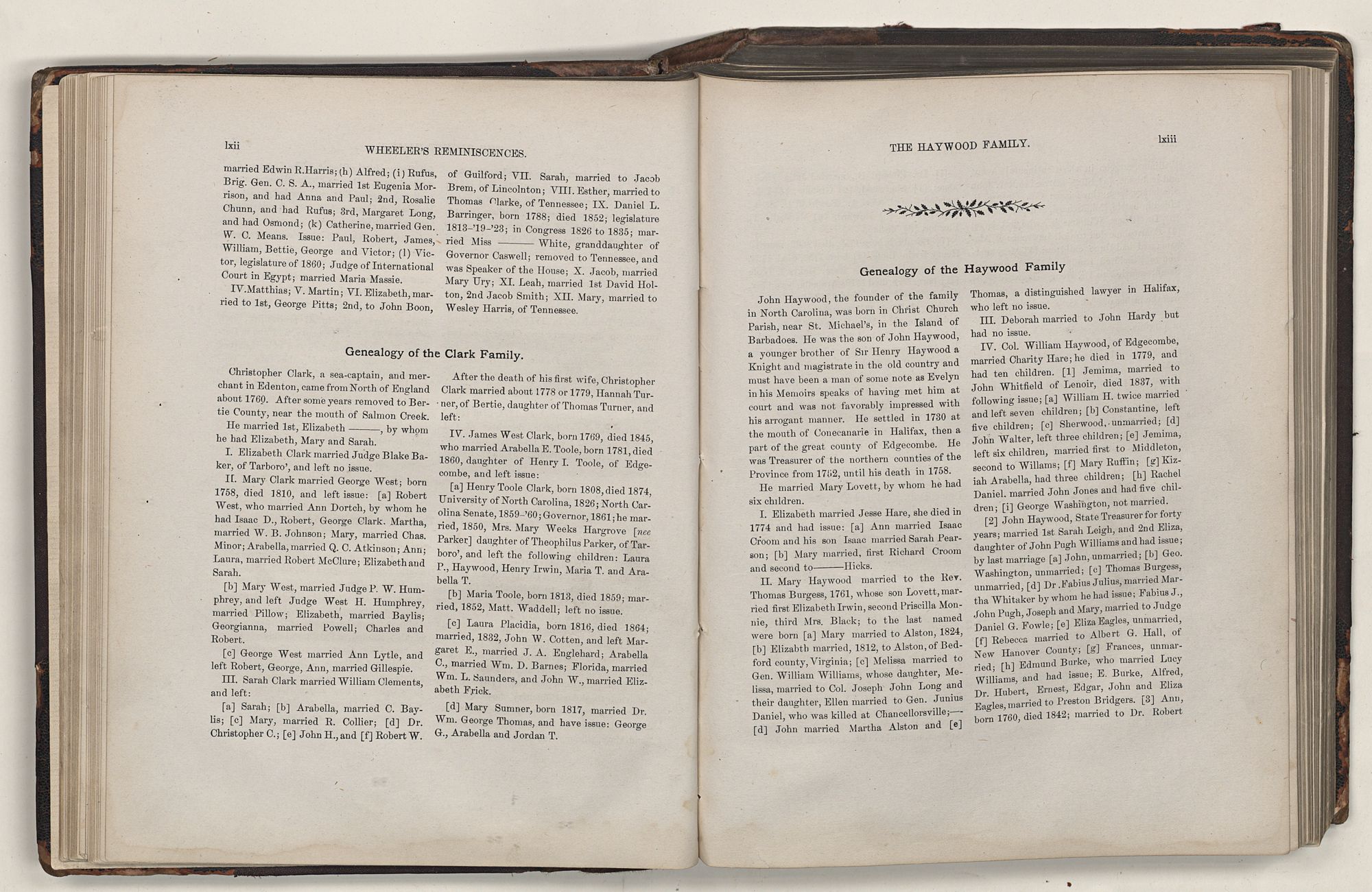 Sketch of James M. Leach of Davidson; of James Gillaspie; of Thomas and O. Kenan; of Charles Hooks of Duplin Co. Sketch of Henry Irwin, a Revolutionary hero; of Jonas Johnston; of John Haywood; genealogy of the Haywood family. Sketch of Henry T. Clark, Governor of North Carolina. The Battle Family, and their genealogy, including Judge Wm. H. Battle, and his son, Kemp P. Battle. Sketch of Duncan L. Clark, of U. S. Army; of Wm. D. Pender; of R. R. Bridgers; of Charles Price of Davie; of John B. Hussey of Davie.