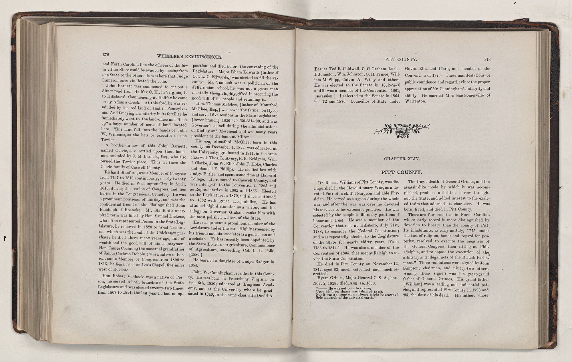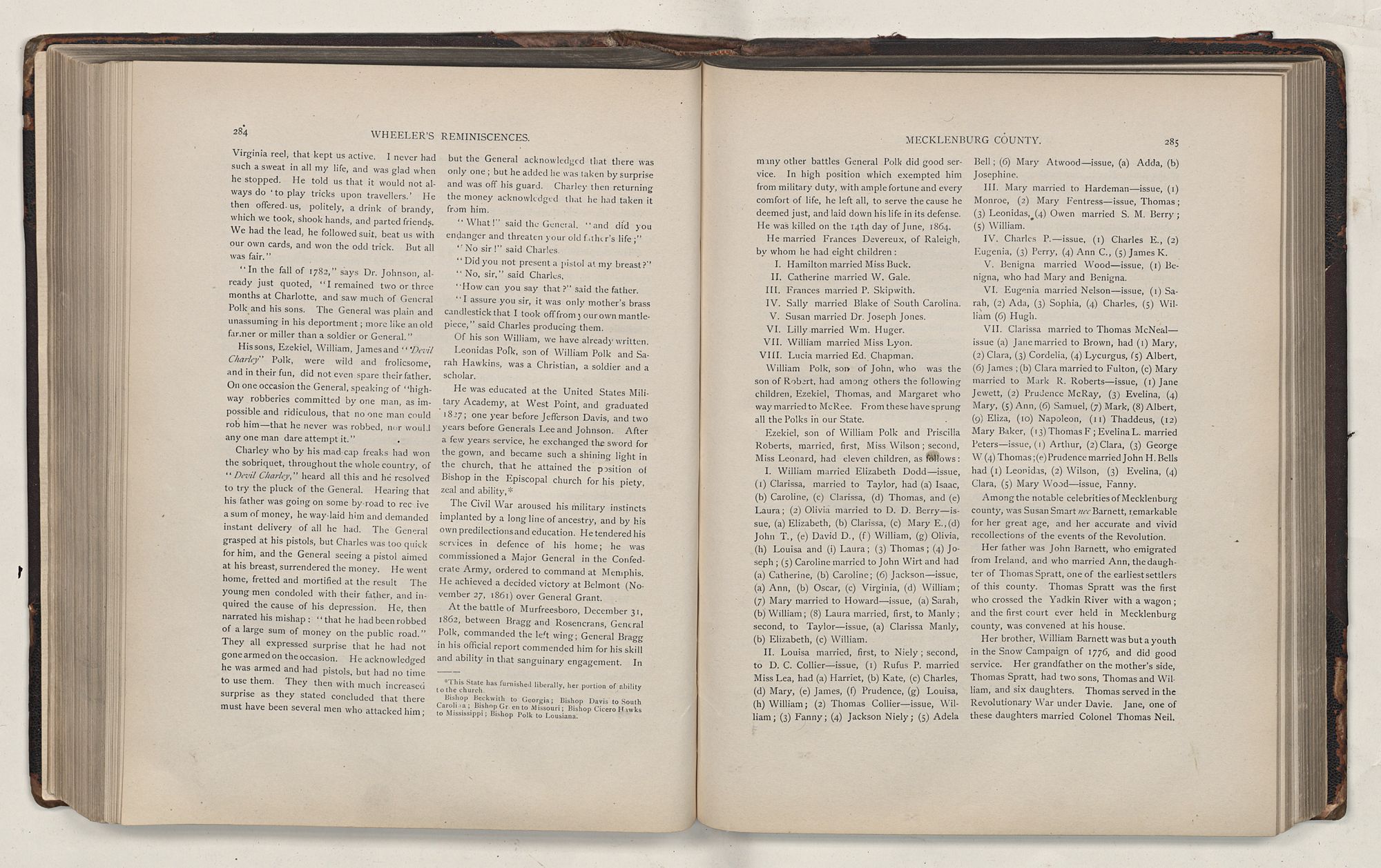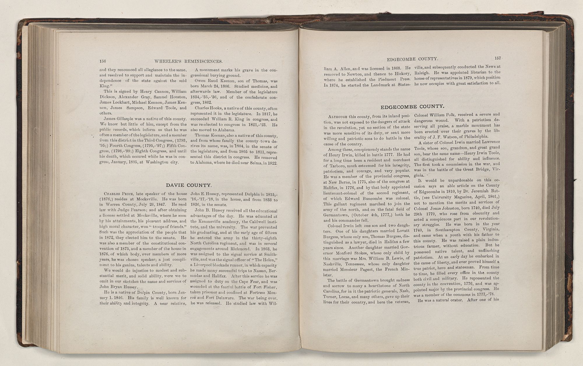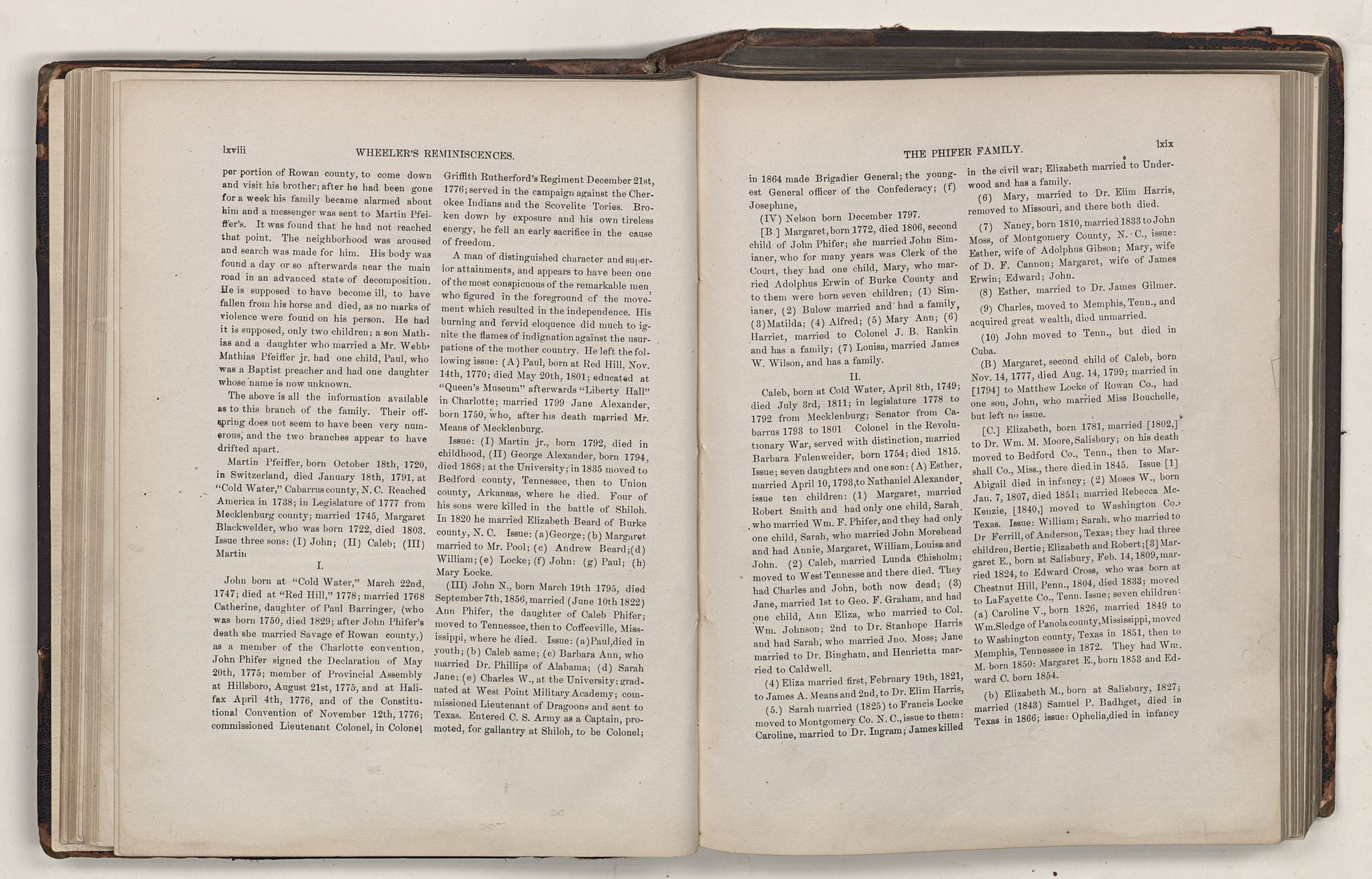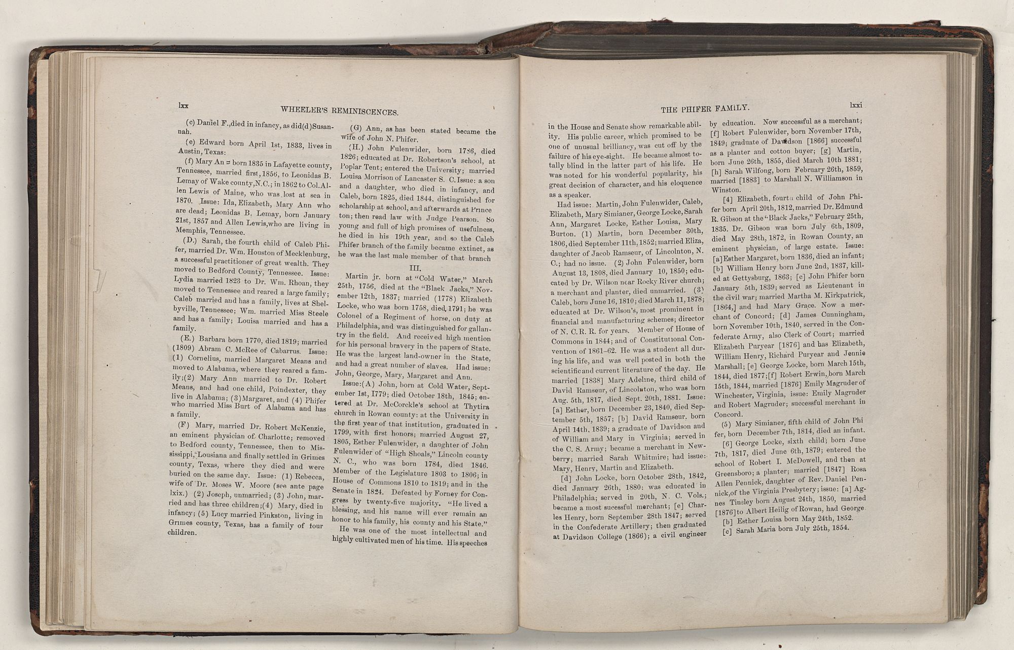 Sketch of James M. Leach of Davidson; of James Gillaspie; of Thomas and O. Kenan; of Charles Hooks of Duplin Co. Sketch of Henry Irwin, a Revolutionary hero; of Jonas Johnston; of John Haywood; genealogy of the Haywood family. Sketch of Henry T. Clark, Governor of North Carolina. The Battle Family, and their genealogy, including Judge Wm. H. Battle, and his son, Kemp P. Battle. Sketch of Duncan L. Clark, of U. S. Army; of Wm. D. Pender; of R. R. Bridgers; of Charles Price of Davie; of John B. Hussey of Davie.