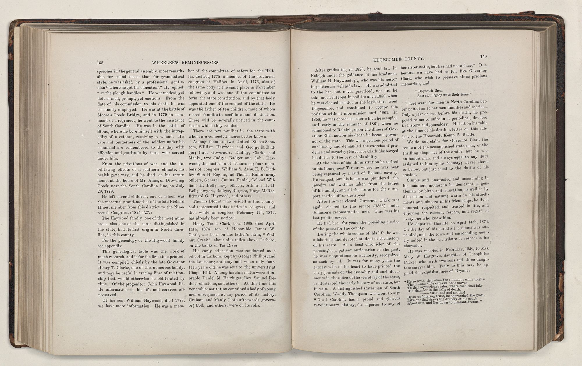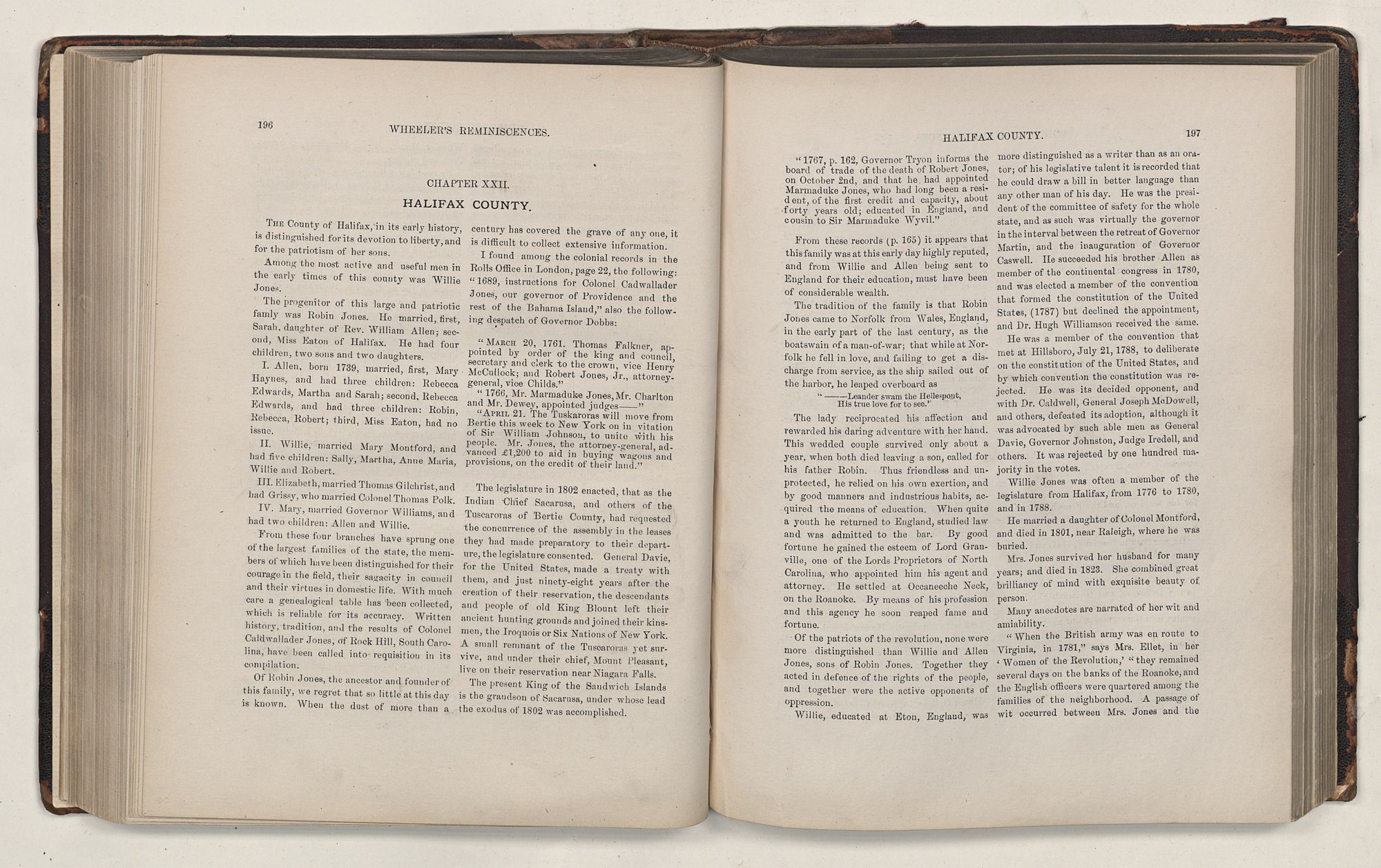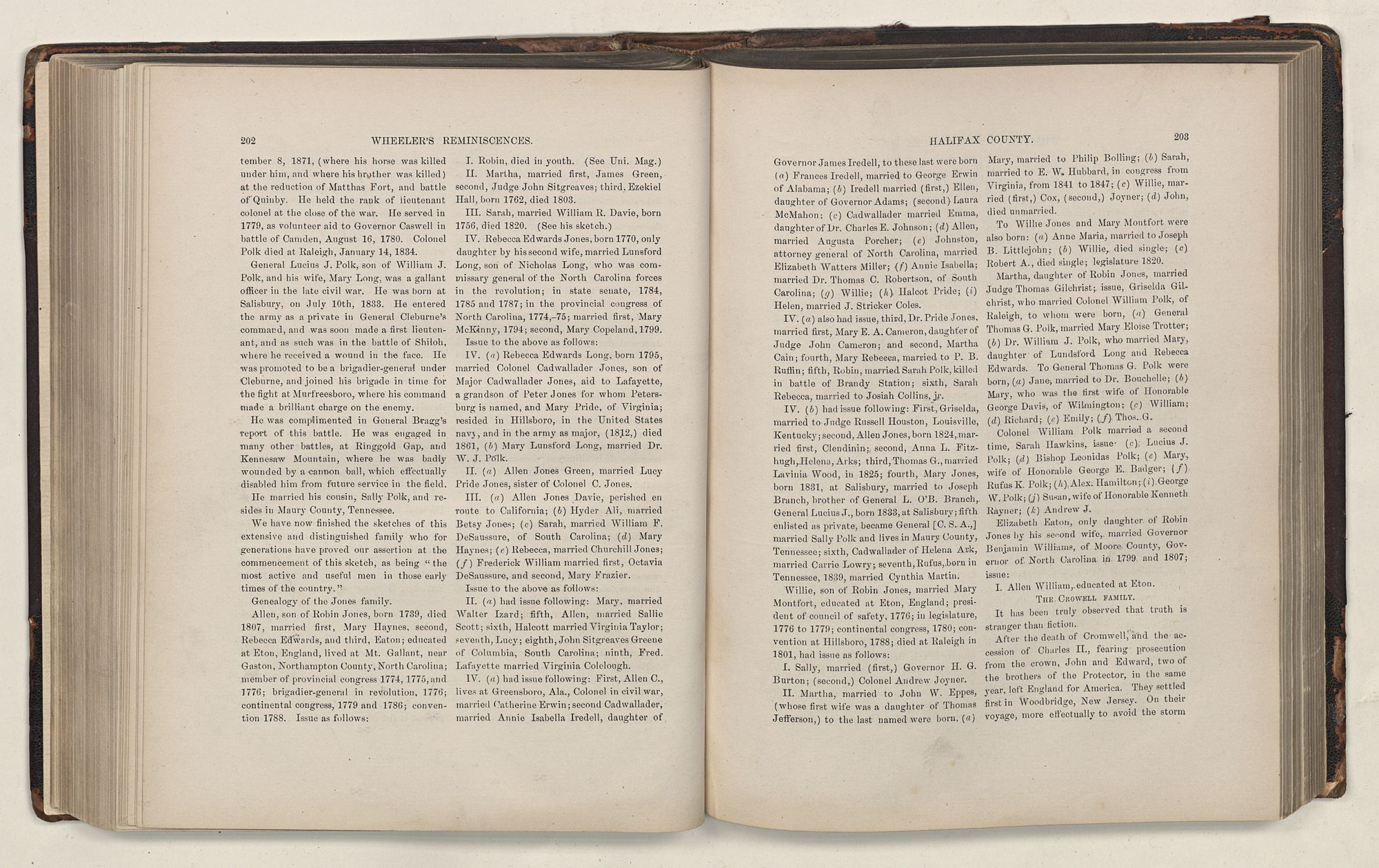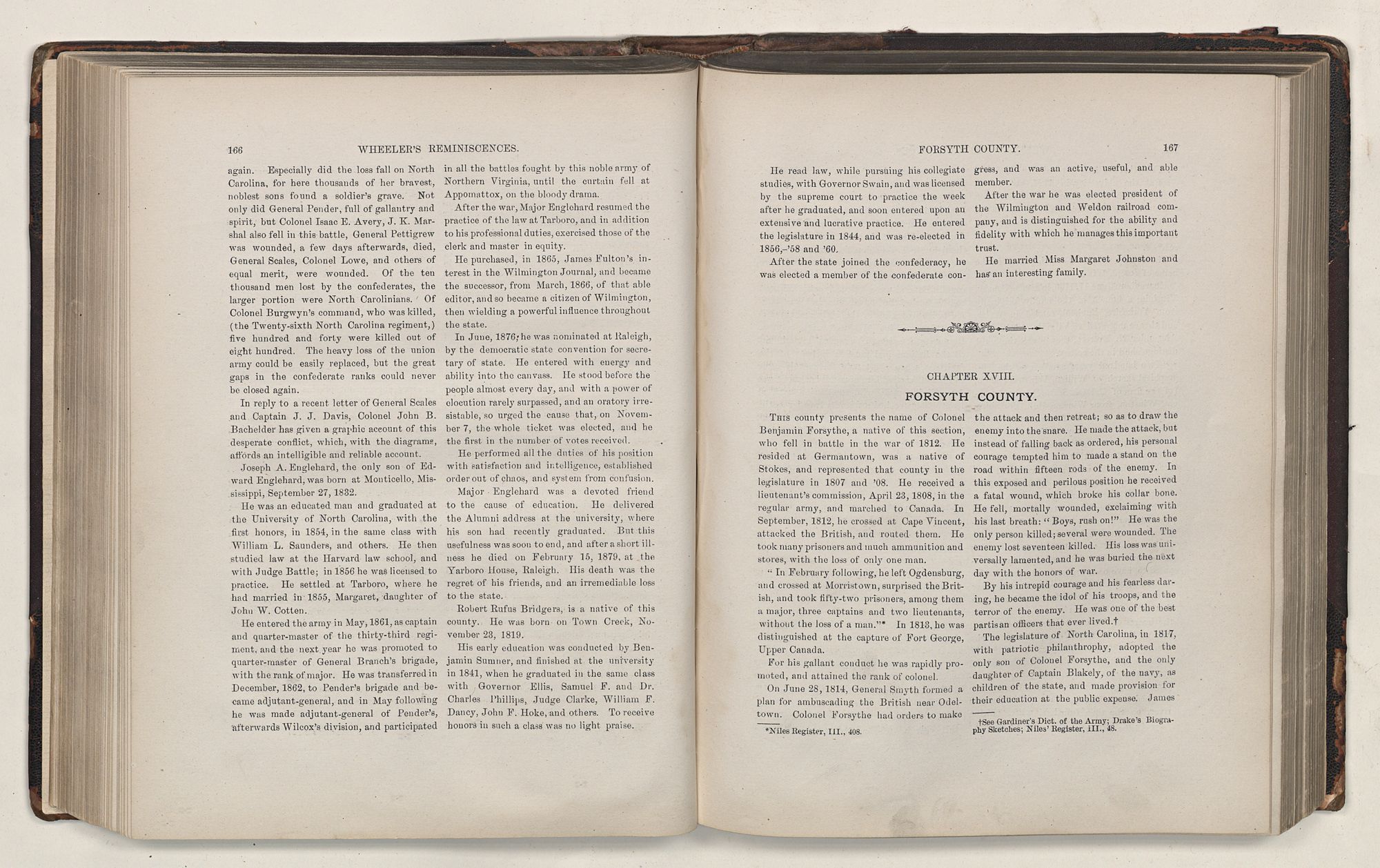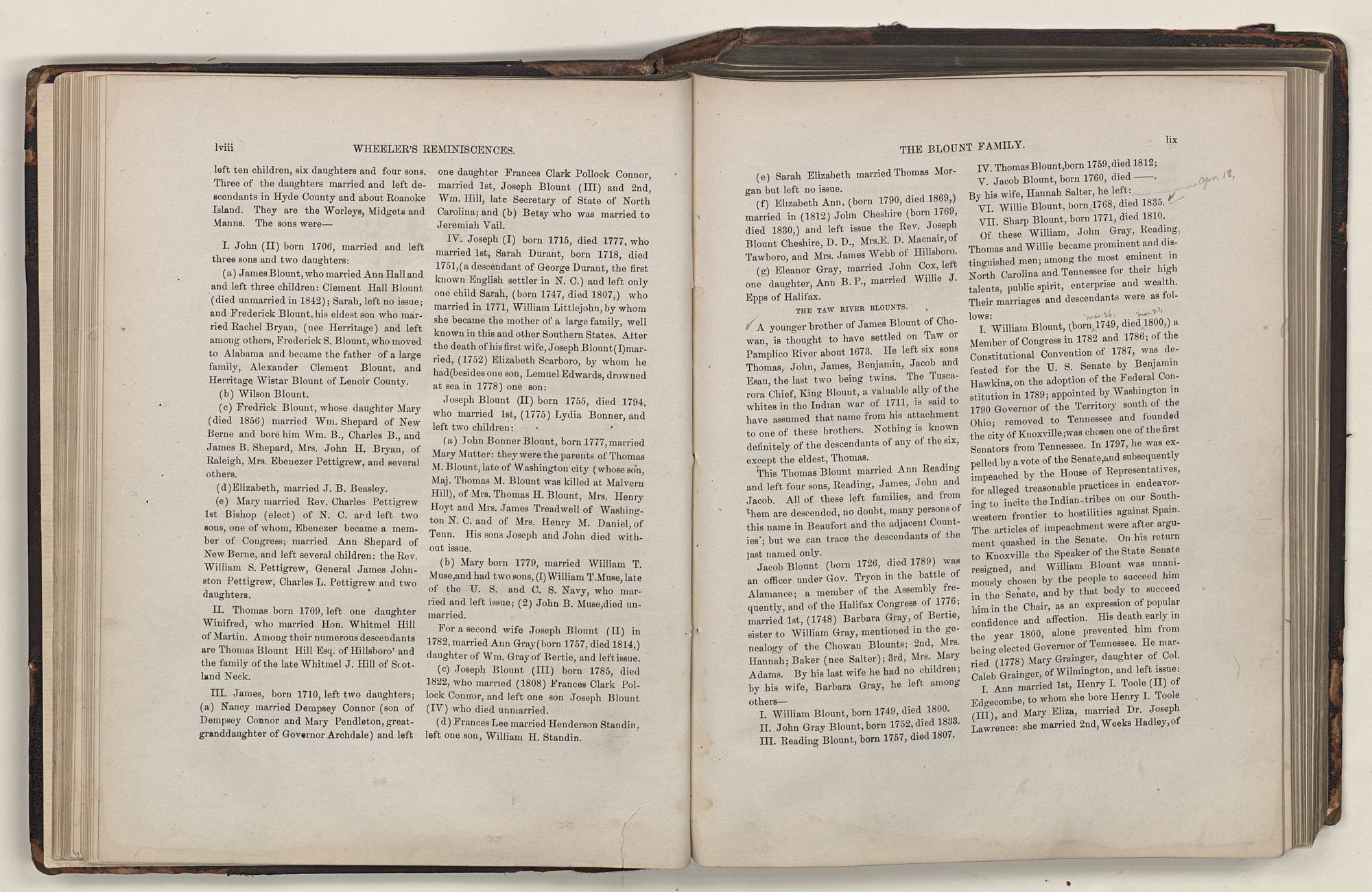 Sketch of James M. Leach of Davidson; of James Gillaspie; of Thomas and O. Kenan; of Charles Hooks of Duplin Co. Sketch of Henry Irwin, a Revolutionary hero; of Jonas Johnston; of John Haywood; genealogy of the Haywood family. Sketch of Henry T. Clark, Governor of North Carolina. The Battle Family, and their genealogy, including Judge Wm. H. Battle, and his son, Kemp P. Battle. Sketch of Duncan L. Clark, of U. S. Army; of Wm. D. Pender; of R. R. Bridgers; of Charles Price of Davie; of John B. Hussey of Davie.