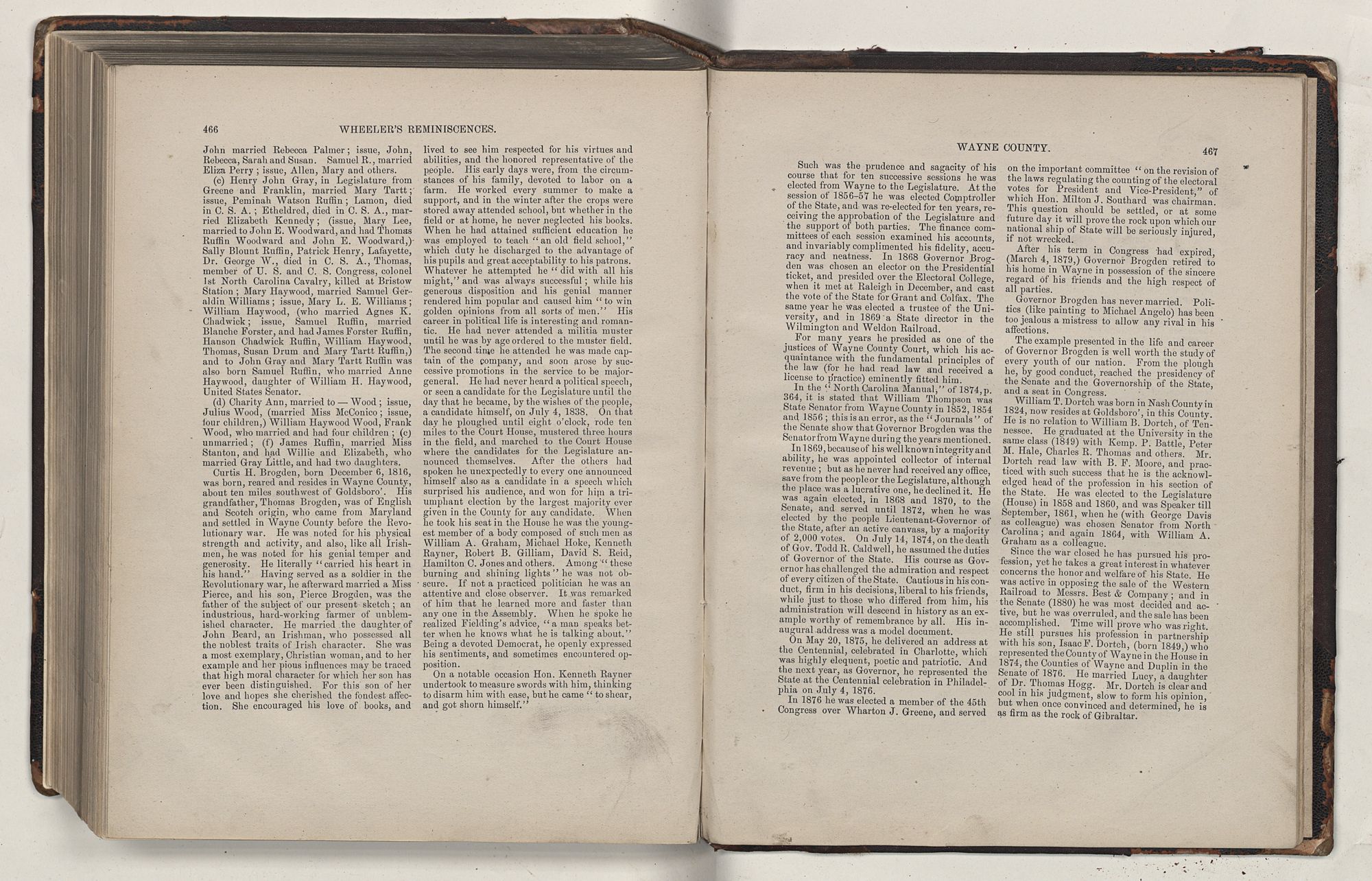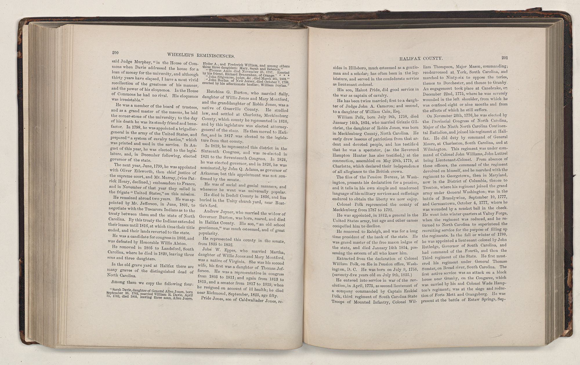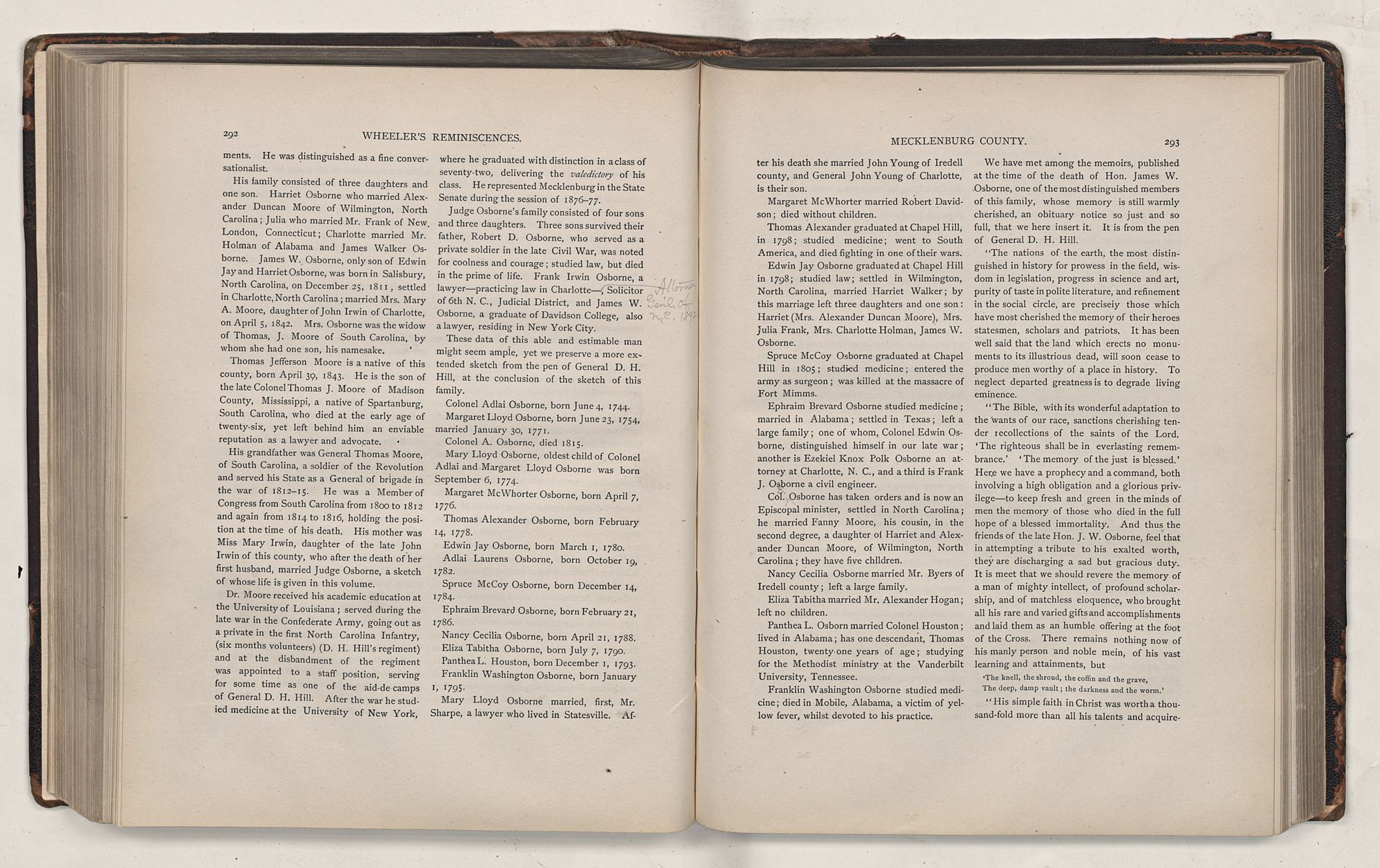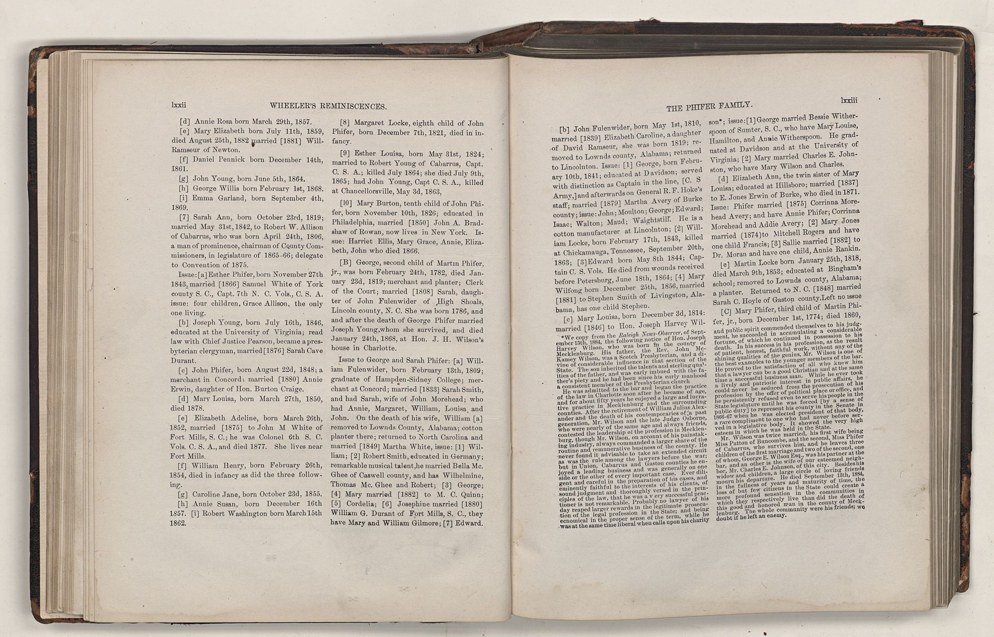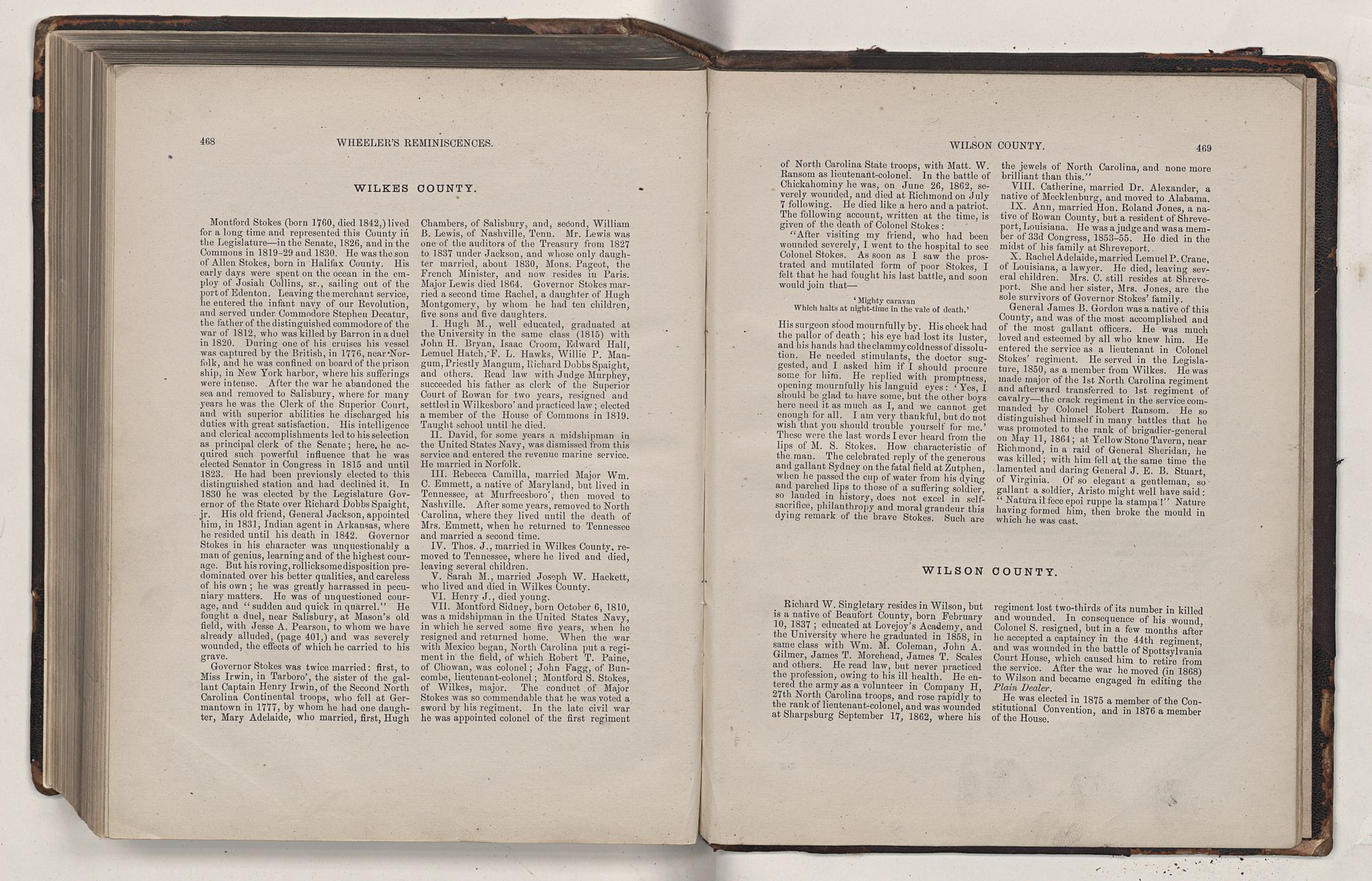 Sketch of James M. Leach of Davidson; of James Gillaspie; of Thomas and O. Kenan; of Charles Hooks of Duplin Co. Sketch of Henry Irwin, a Revolutionary hero; of Jonas Johnston; of John Haywood; genealogy of the Haywood family. Sketch of Henry T. Clark, Governor of North Carolina. The Battle Family, and their genealogy, including Judge Wm. H. Battle, and his son, Kemp P. Battle. Sketch of Duncan L. Clark, of U. S. Army; of Wm. D. Pender; of R. R. Bridgers; of Charles Price of Davie; of John B. Hussey of Davie.