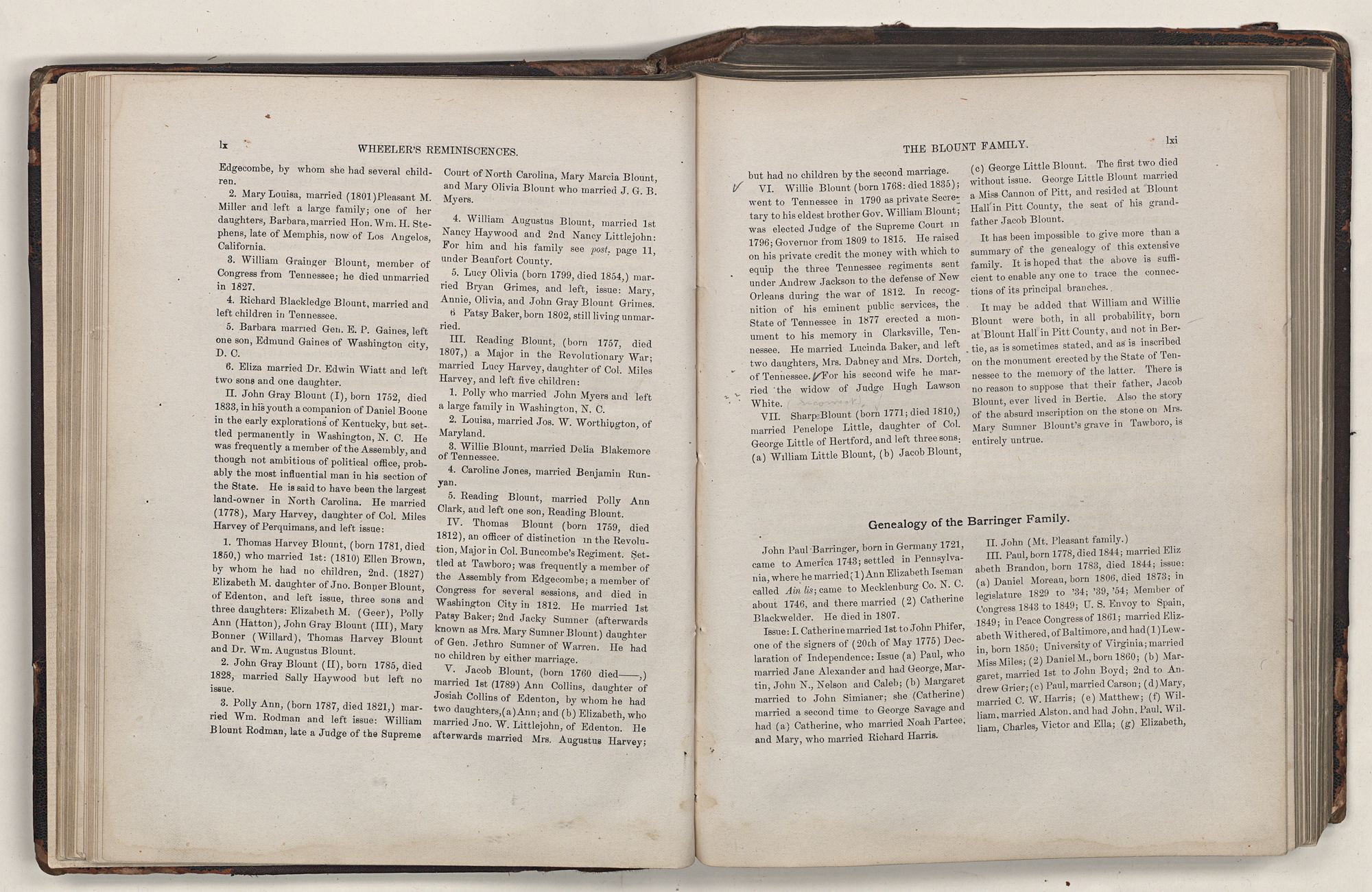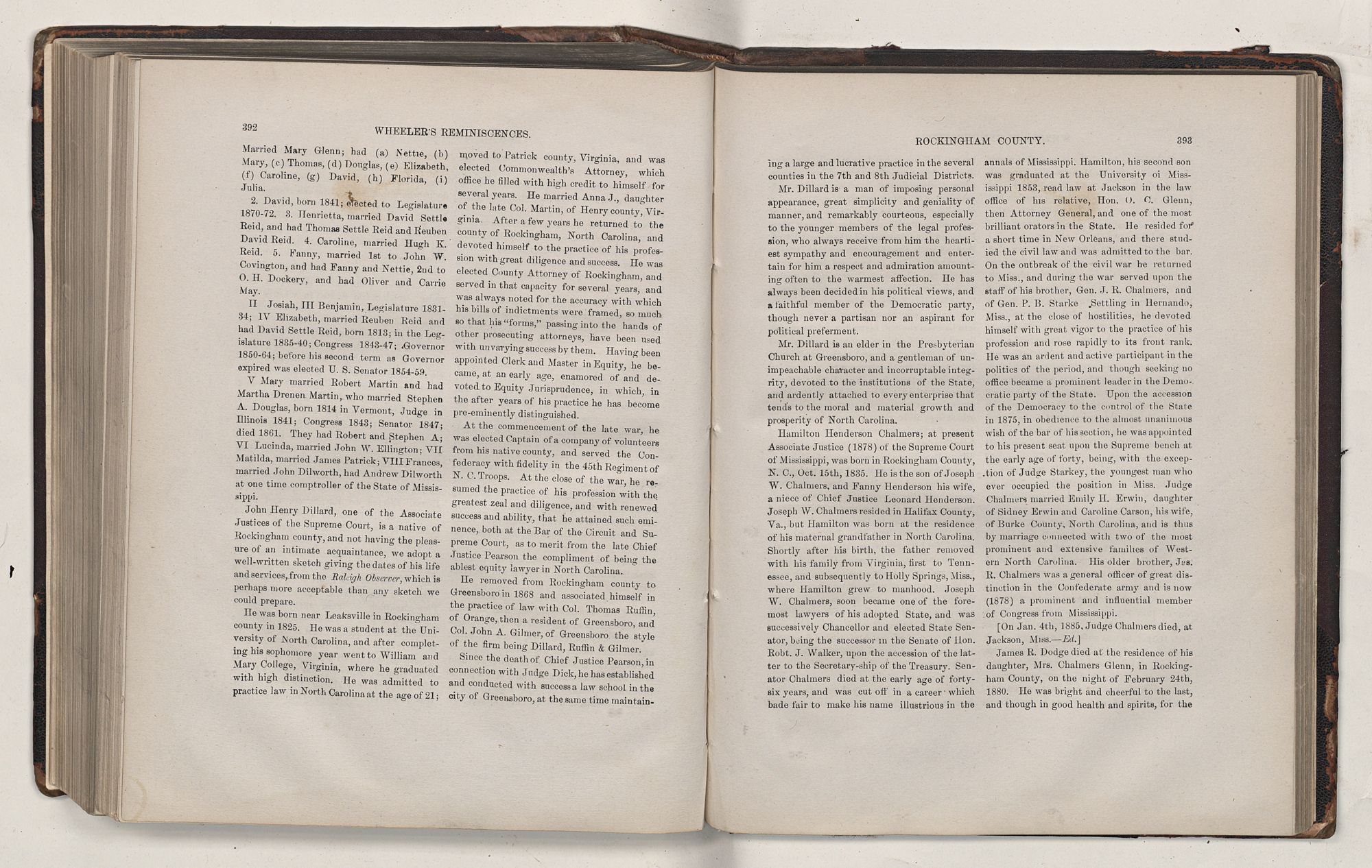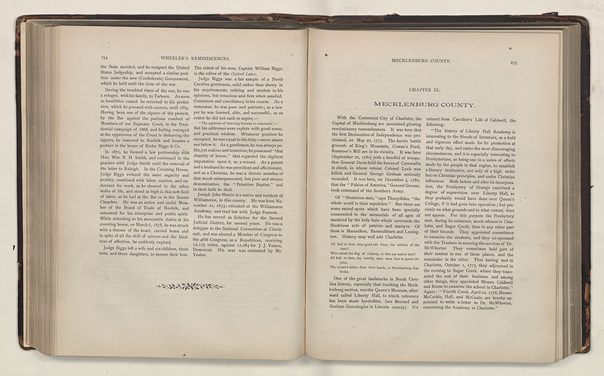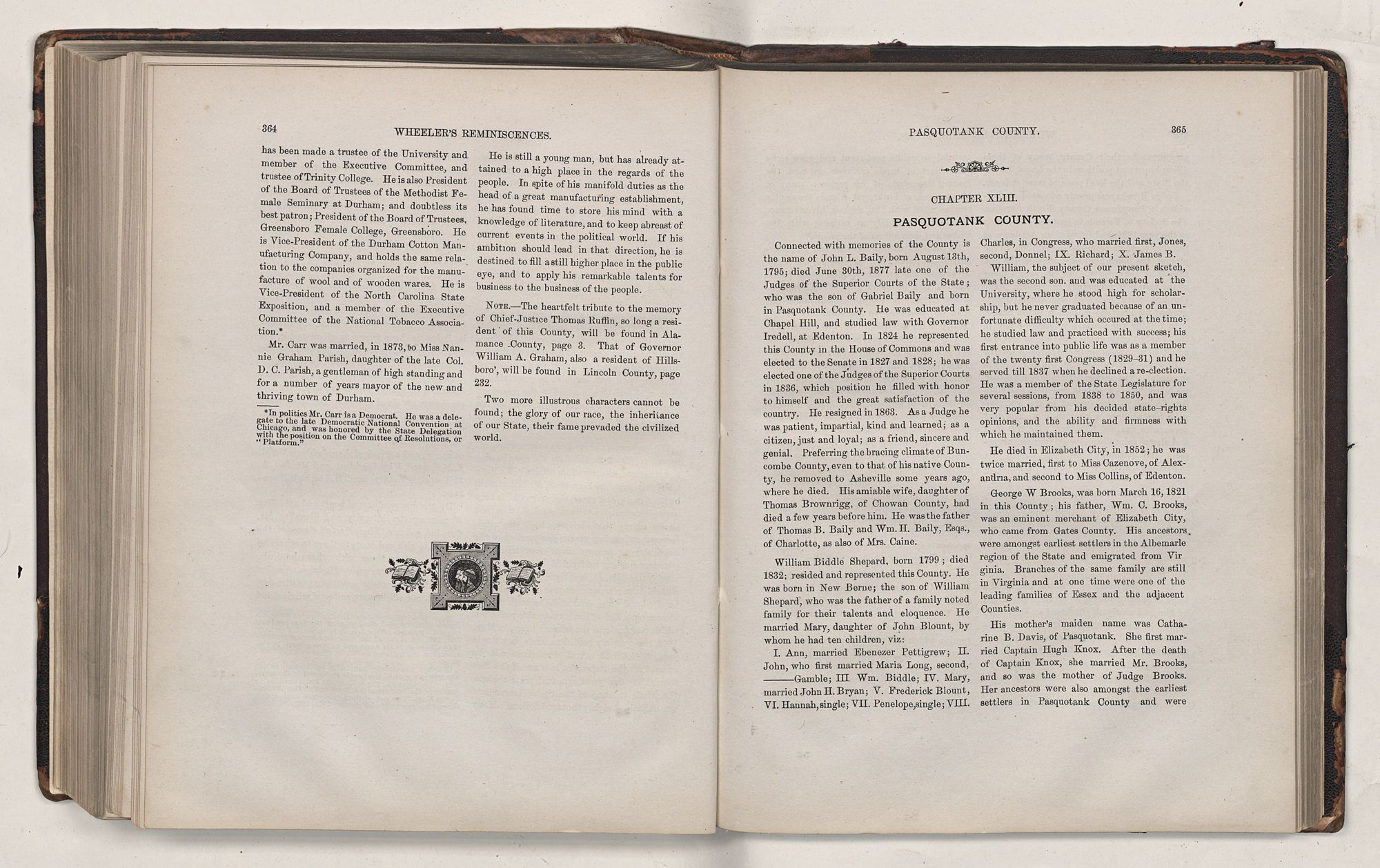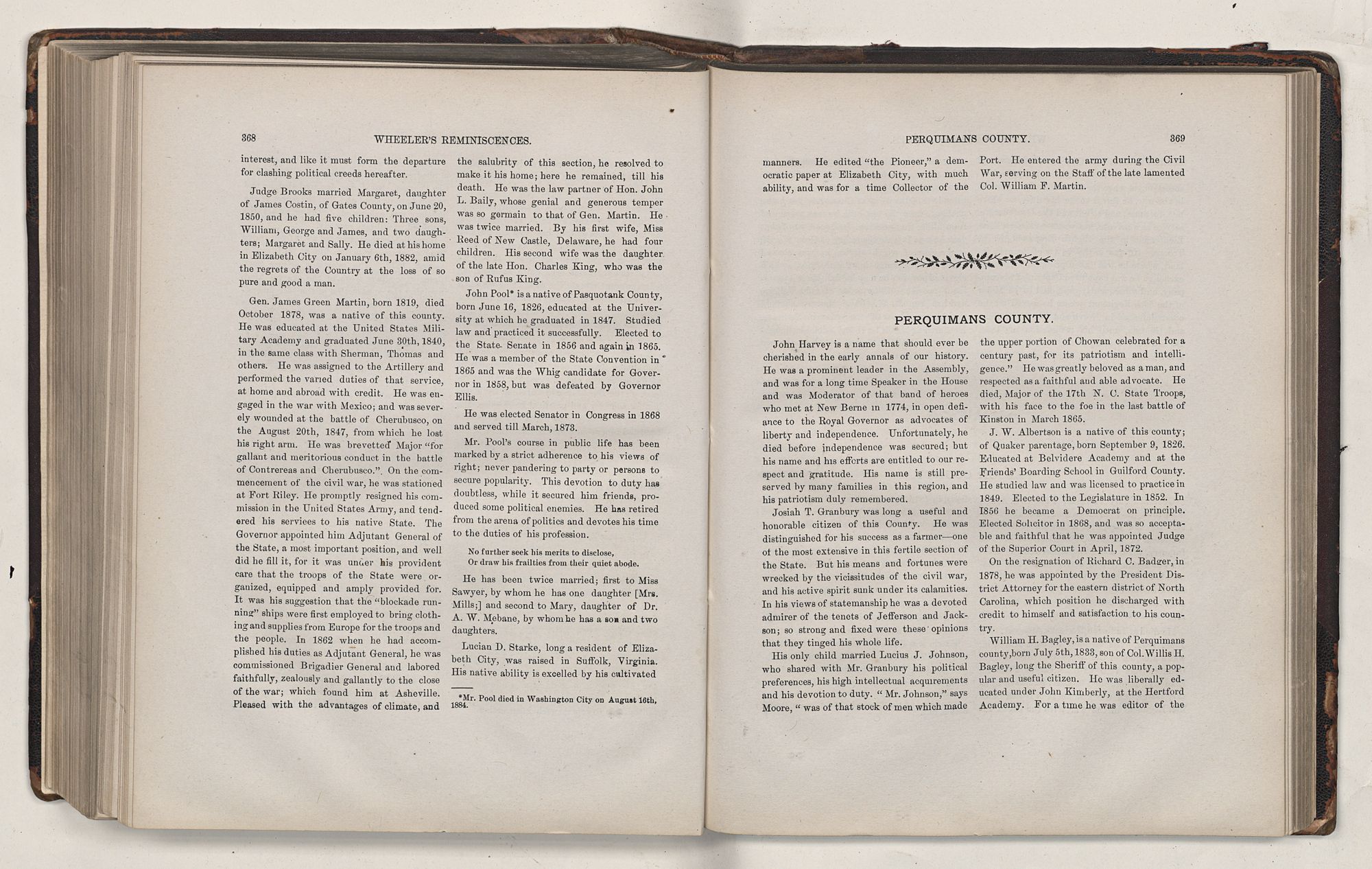 Sketch of James M. Leach of Davidson; of James Gillaspie; of Thomas and O. Kenan; of Charles Hooks of Duplin Co. Sketch of Henry Irwin, a Revolutionary hero; of Jonas Johnston; of John Haywood; genealogy of the Haywood family. Sketch of Henry T. Clark, Governor of North Carolina. The Battle Family, and their genealogy, including Judge Wm. H. Battle, and his son, Kemp P. Battle. Sketch of Duncan L. Clark, of U. S. Army; of Wm. D. Pender; of R. R. Bridgers; of Charles Price of Davie; of John B. Hussey of Davie.