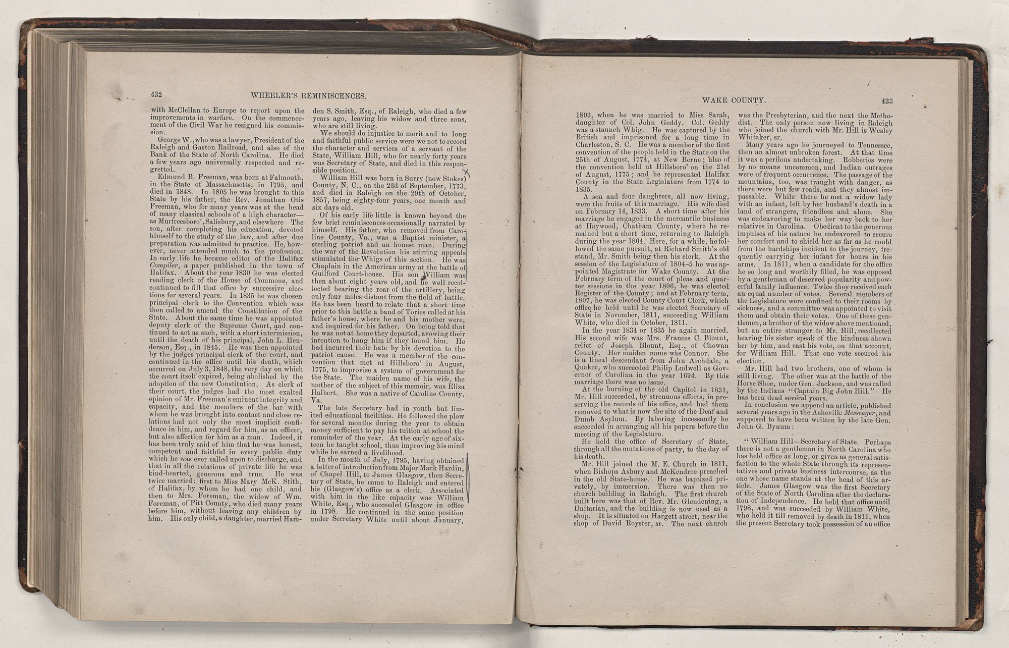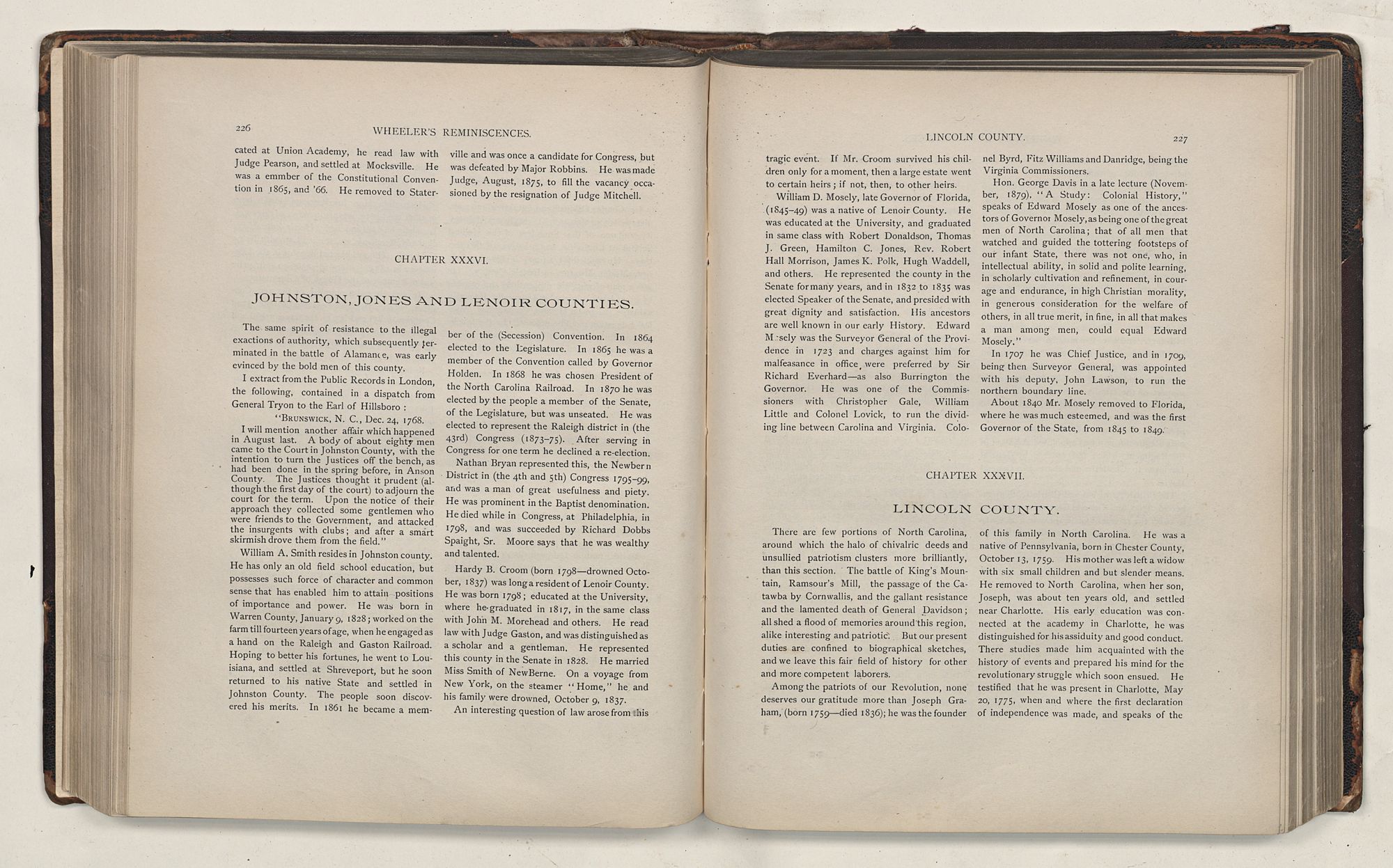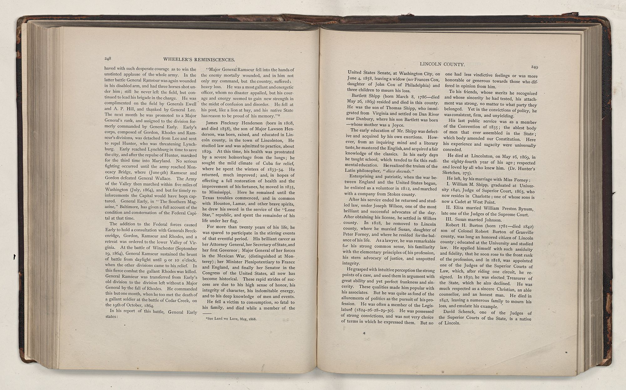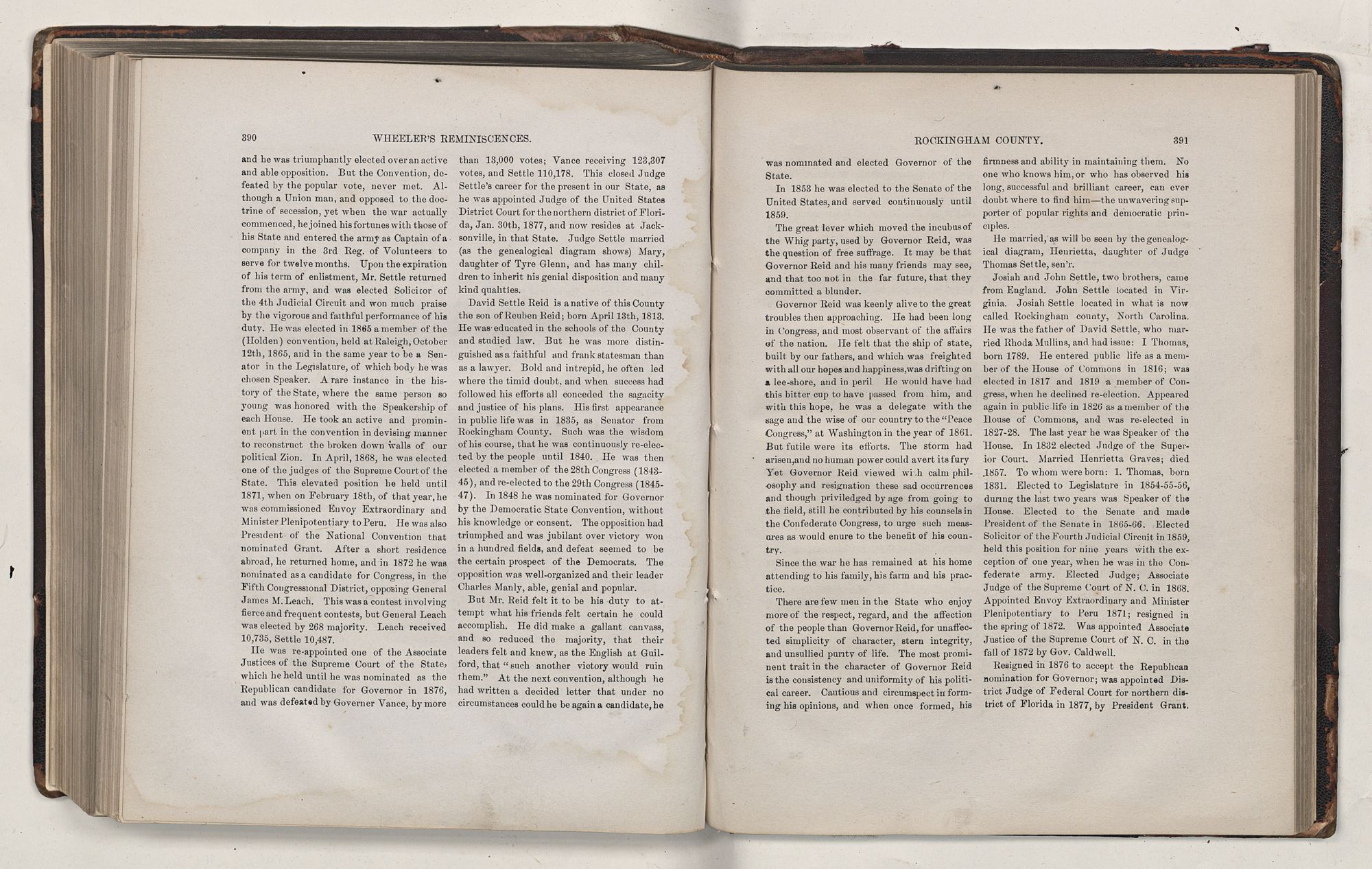 Sketch of James M. Leach of Davidson; of James Gillaspie; of Thomas and O. Kenan; of Charles Hooks of Duplin Co. Sketch of Henry Irwin, a Revolutionary hero; of Jonas Johnston; of John Haywood; genealogy of the Haywood family. Sketch of Henry T. Clark, Governor of North Carolina. The Battle Family, and their genealogy, including Judge Wm. H. Battle, and his son, Kemp P. Battle. Sketch of Duncan L. Clark, of U. S. Army; of Wm. D. Pender; of R. R. Bridgers; of Charles Price of Davie; of John B. Hussey of Davie.