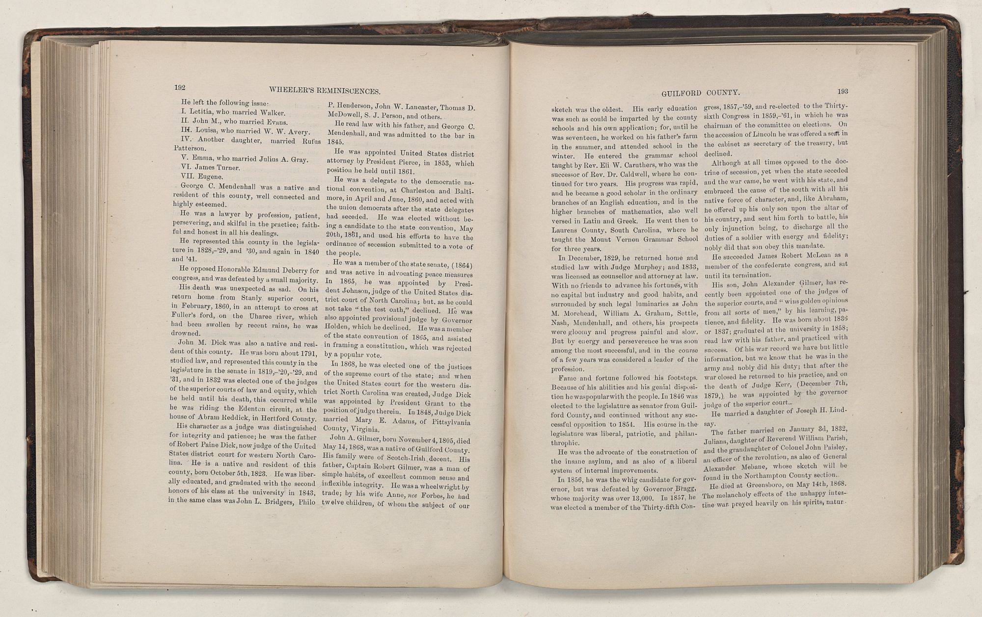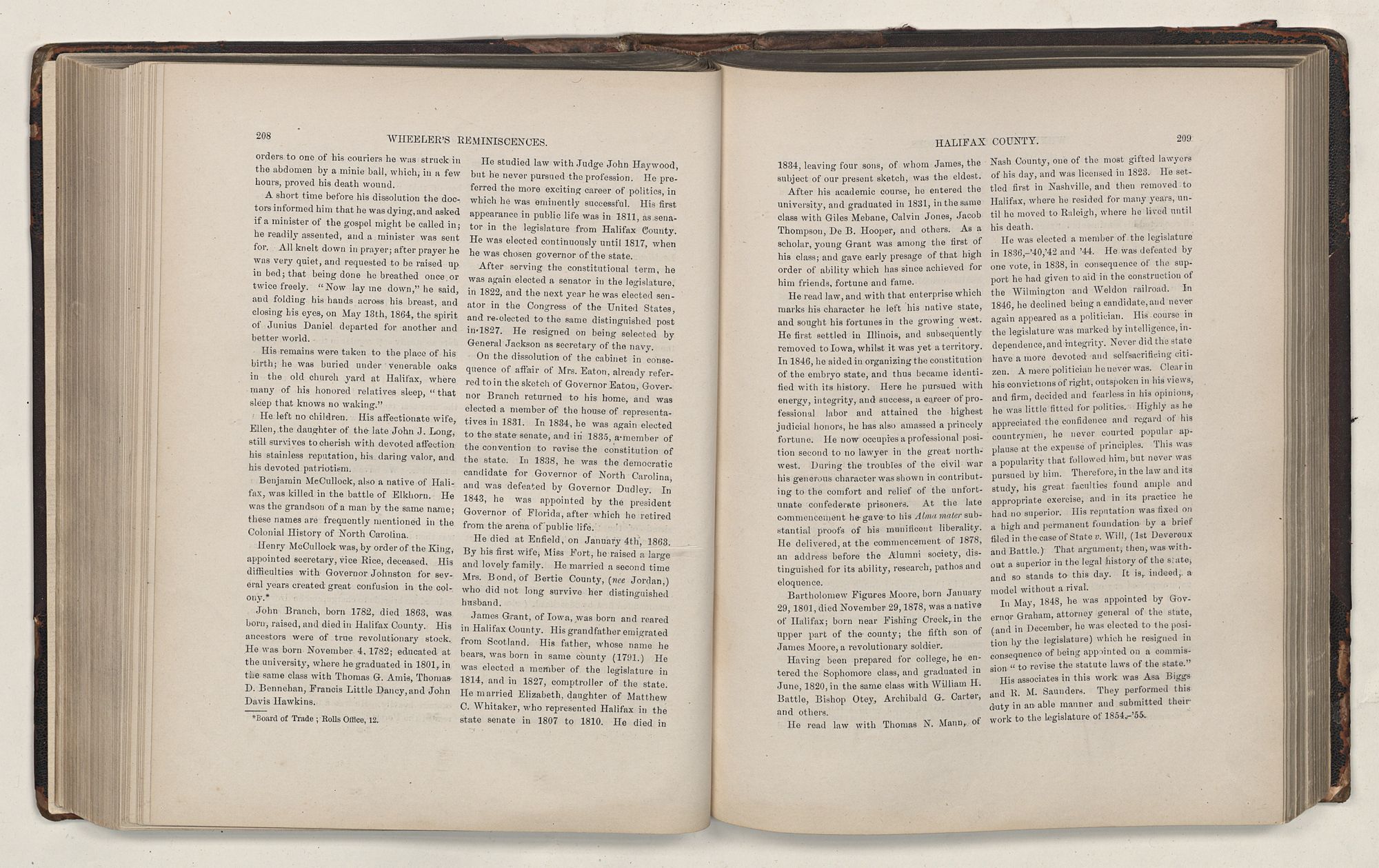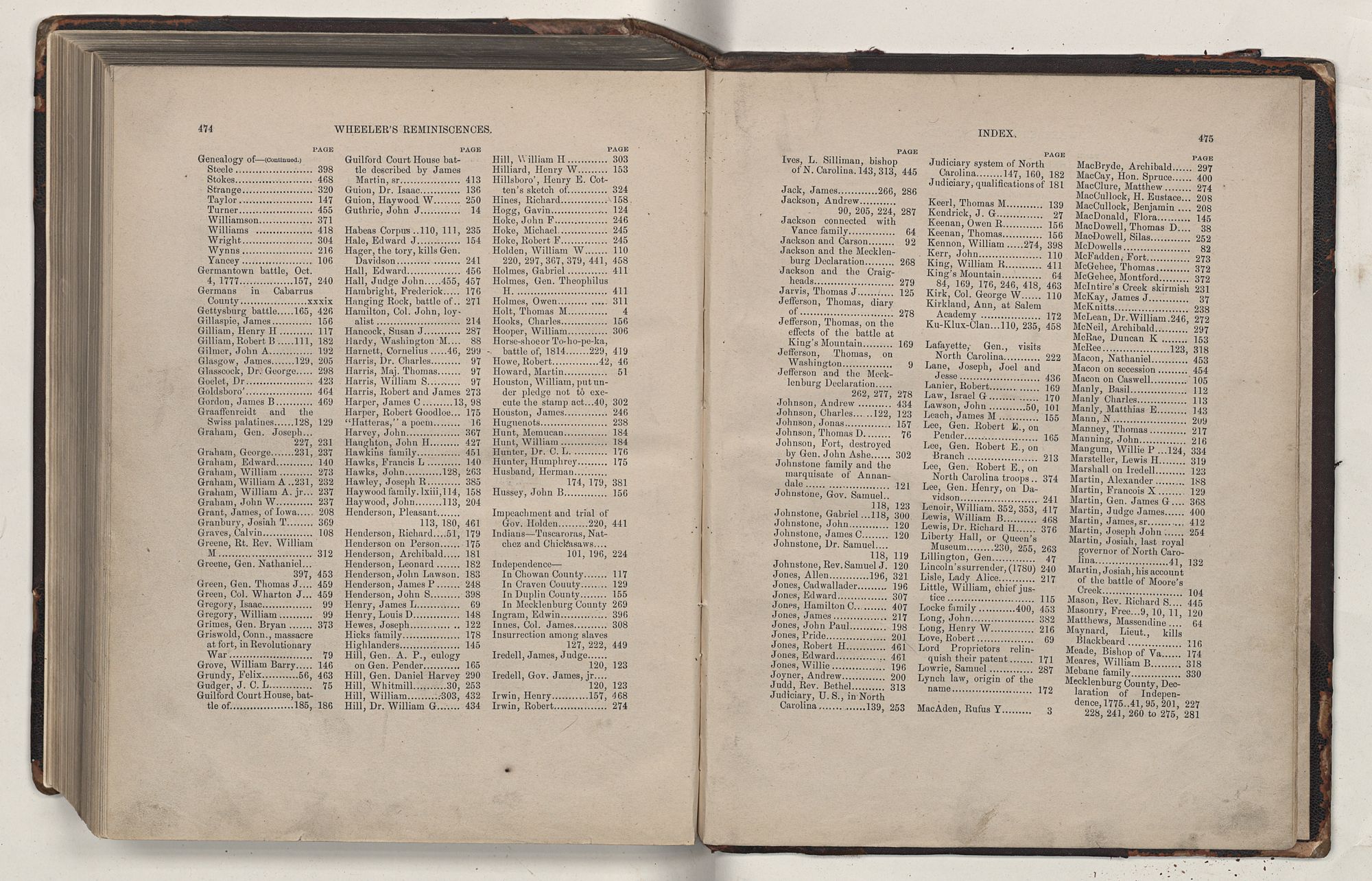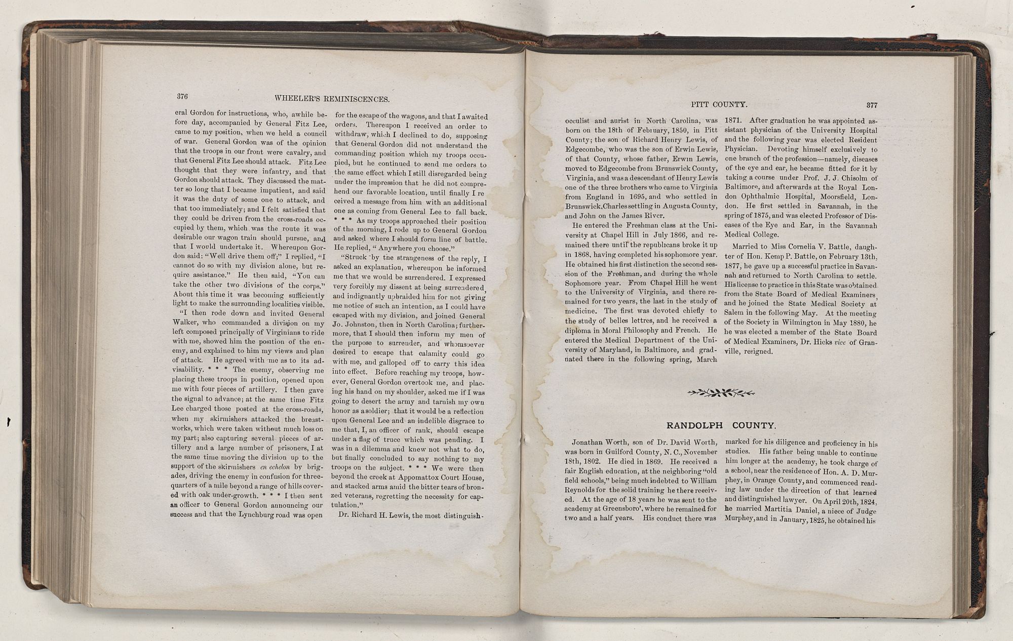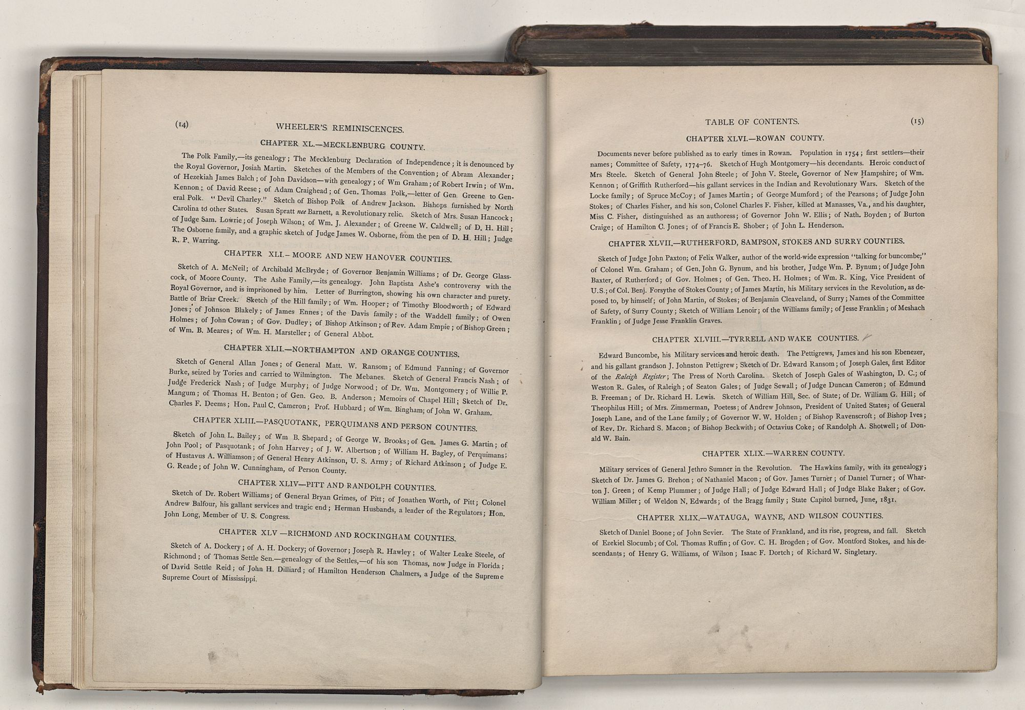 Sketch of James M. Leach of Davidson; of James Gillaspie; of Thomas and O. Kenan; of Charles Hooks of Duplin Co. Sketch of Henry Irwin, a Revolutionary hero; of Jonas Johnston; of John Haywood; genealogy of the Haywood family. Sketch of Henry T. Clark, Governor of North Carolina. The Battle Family, and their genealogy, including Judge Wm. H. Battle, and his son, Kemp P. Battle. Sketch of Duncan L. Clark, of U. S. Army; of Wm. D. Pender; of R. R. Bridgers; of Charles Price of Davie; of John B. Hussey of Davie.