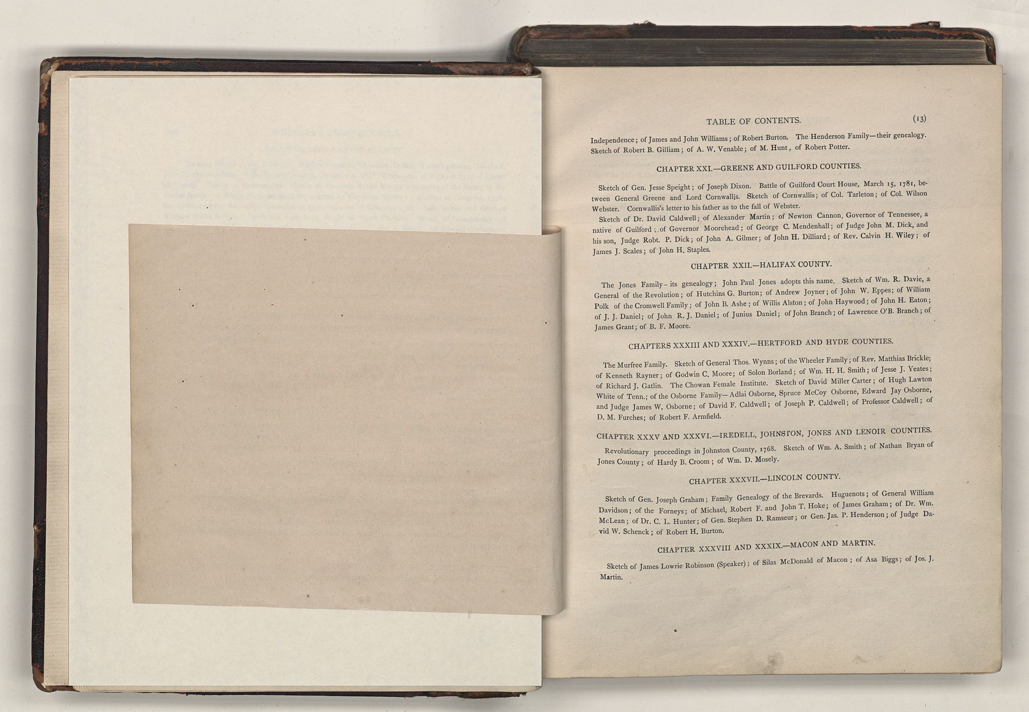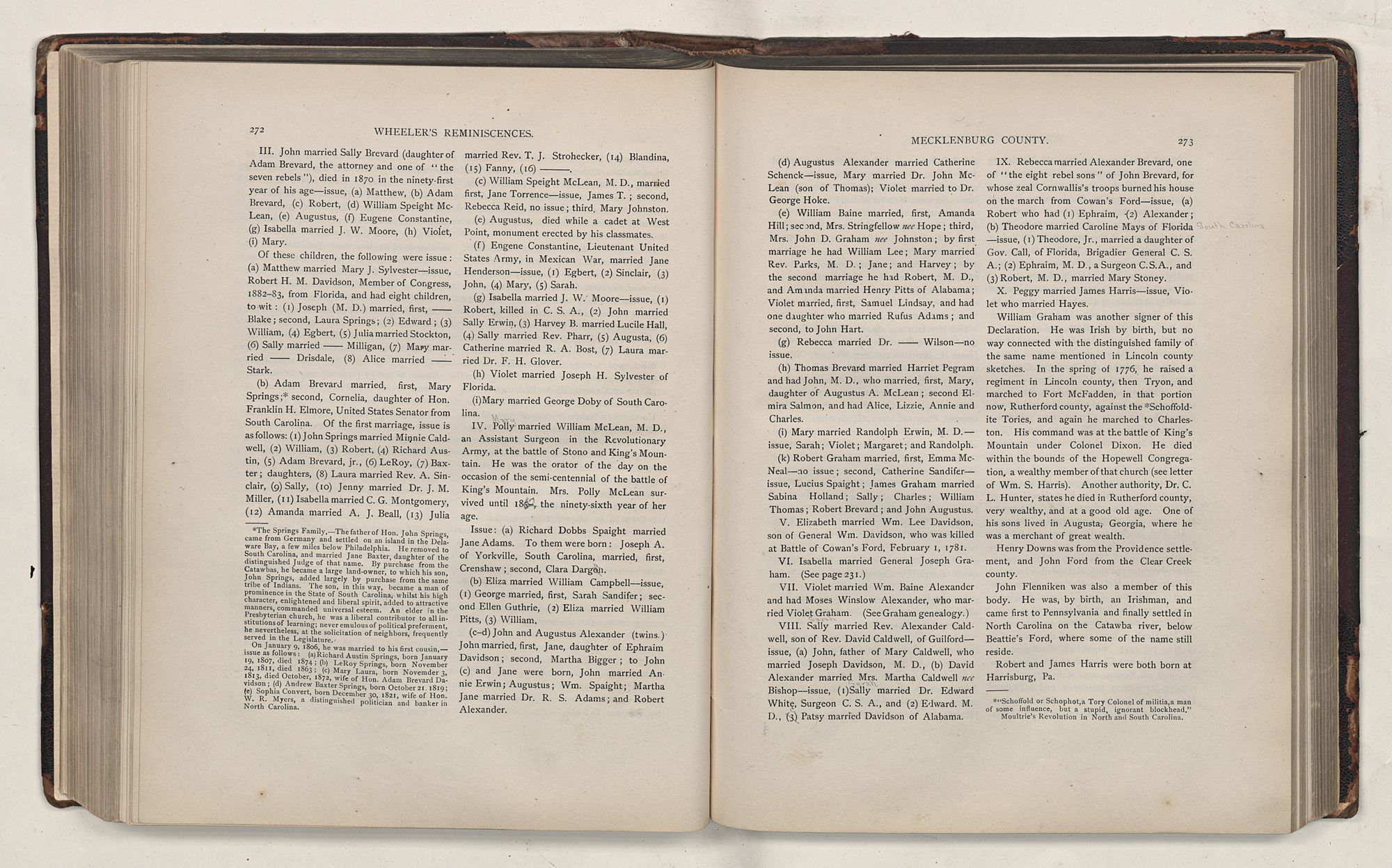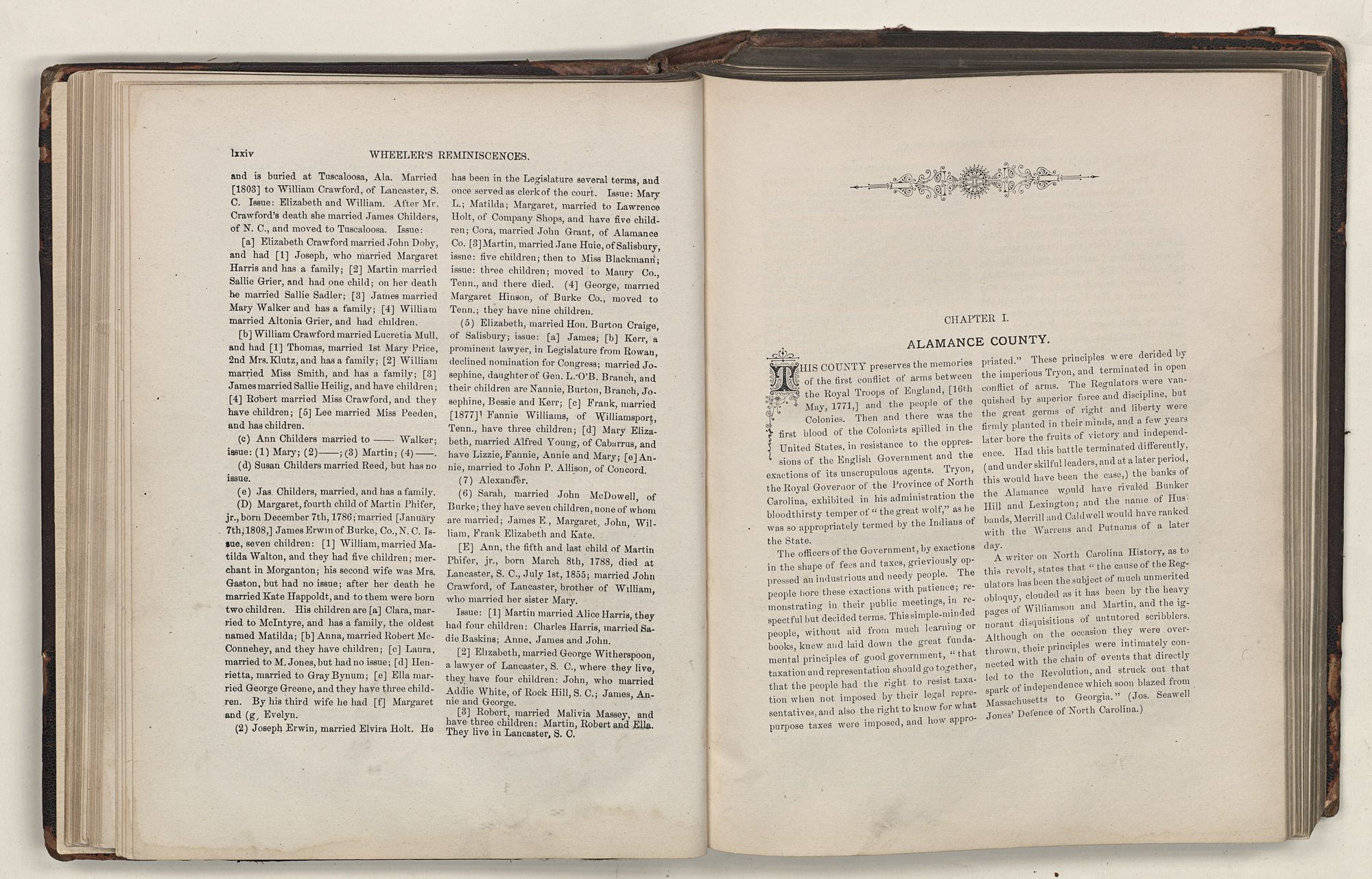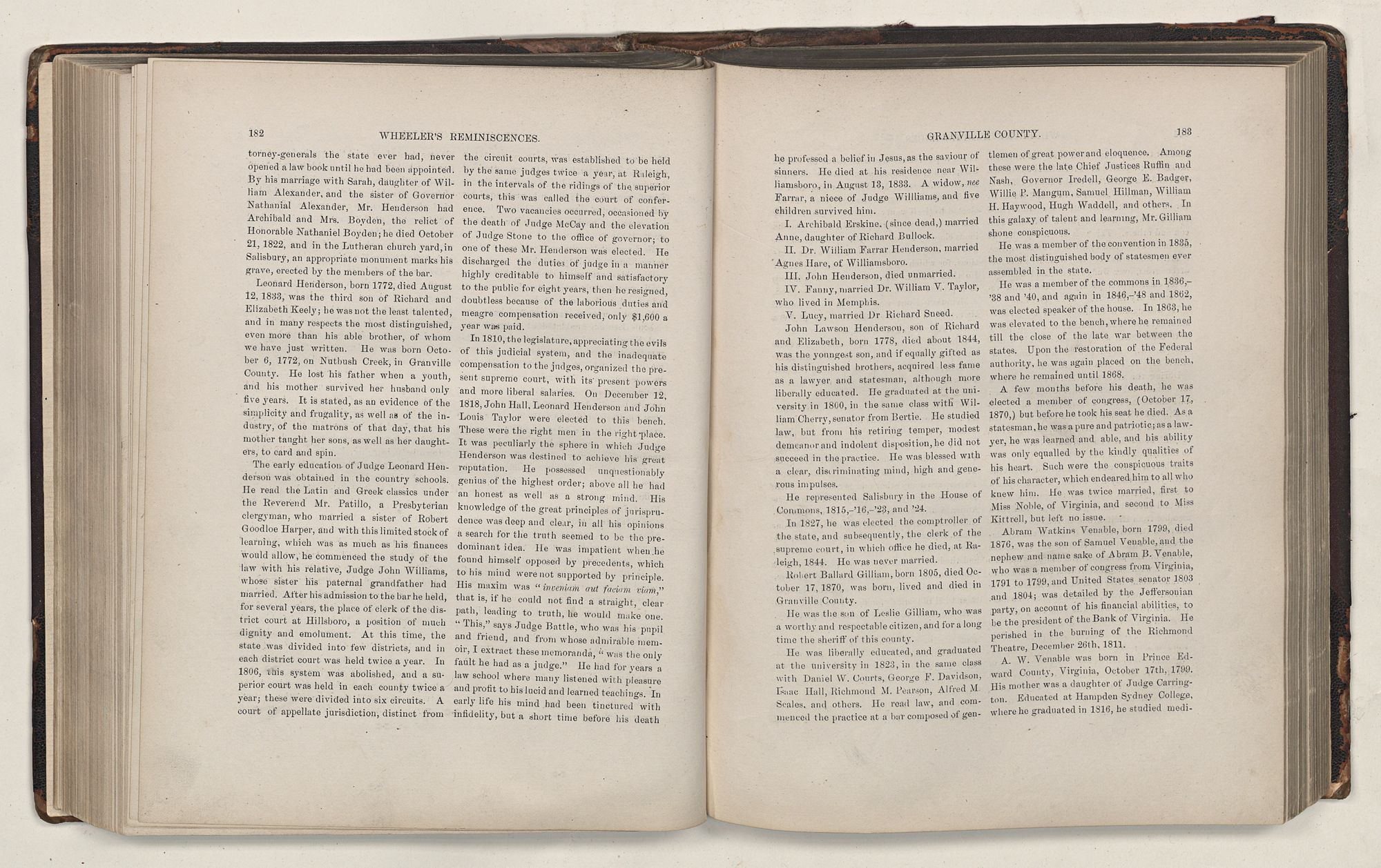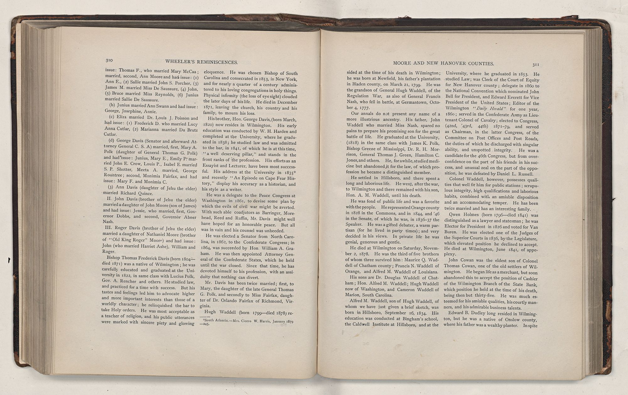 Sketch of James M. Leach of Davidson; of James Gillaspie; of Thomas and O. Kenan; of Charles Hooks of Duplin Co. Sketch of Henry Irwin, a Revolutionary hero; of Jonas Johnston; of John Haywood; genealogy of the Haywood family. Sketch of Henry T. Clark, Governor of North Carolina. The Battle Family, and their genealogy, including Judge Wm. H. Battle, and his son, Kemp P. Battle. Sketch of Duncan L. Clark, of U. S. Army; of Wm. D. Pender; of R. R. Bridgers; of Charles Price of Davie; of John B. Hussey of Davie.