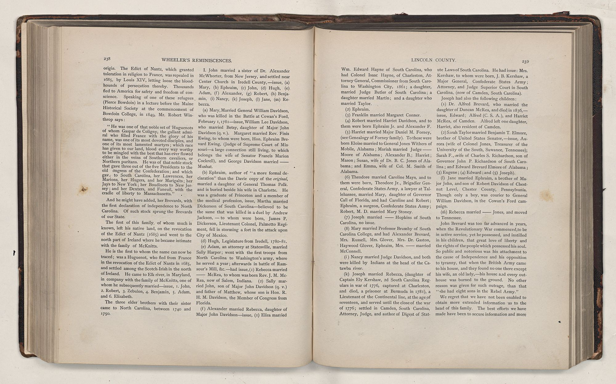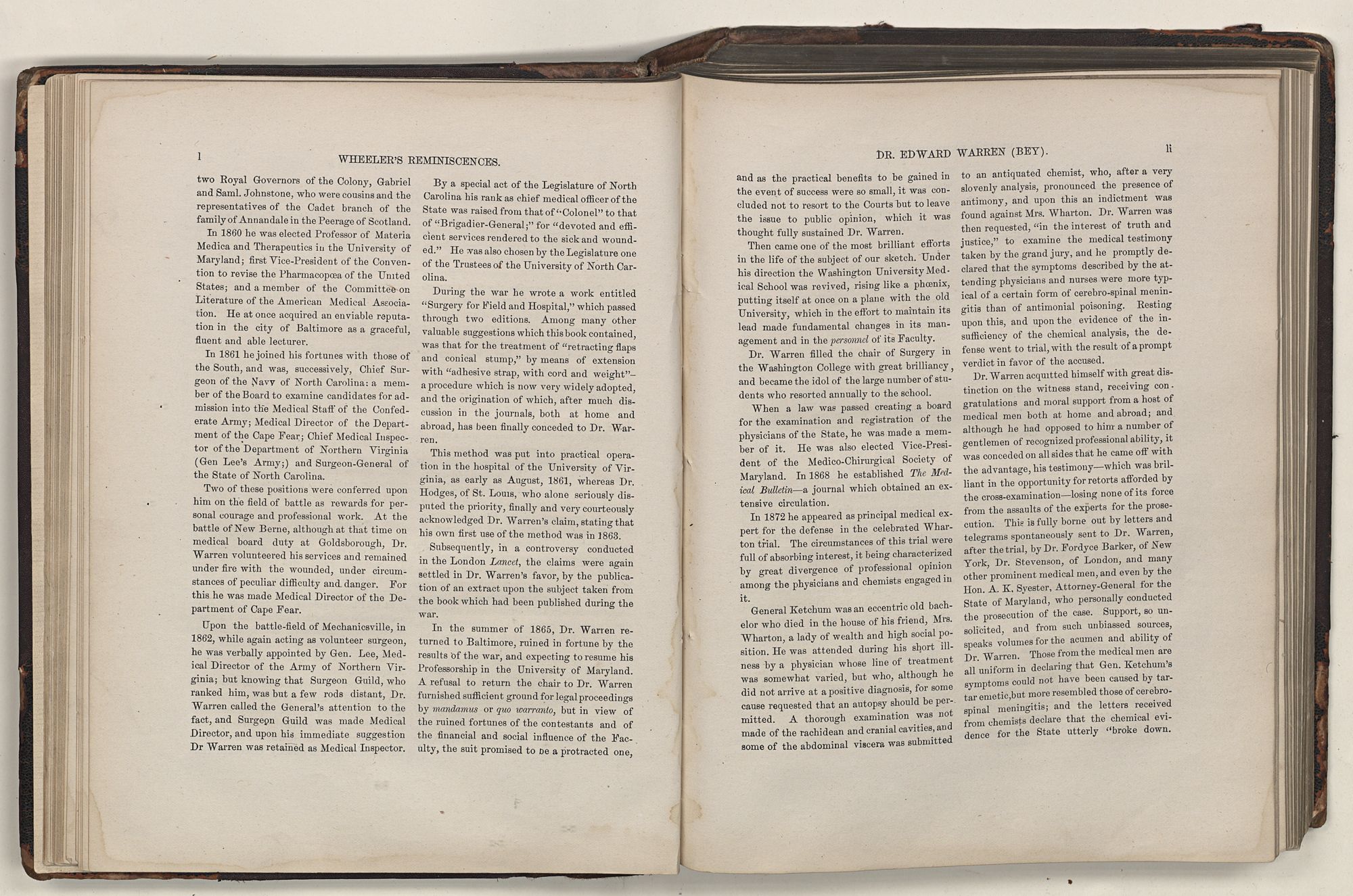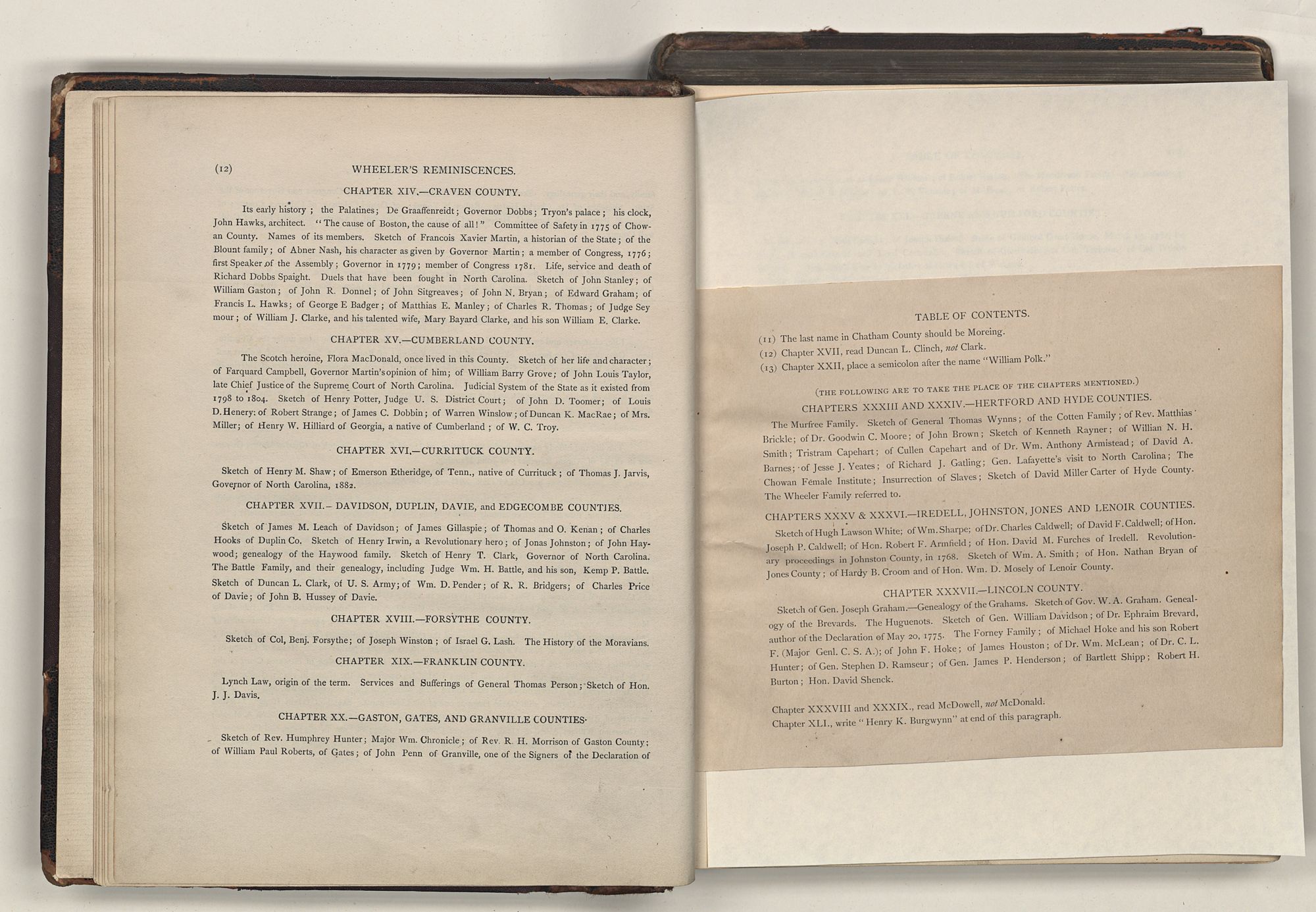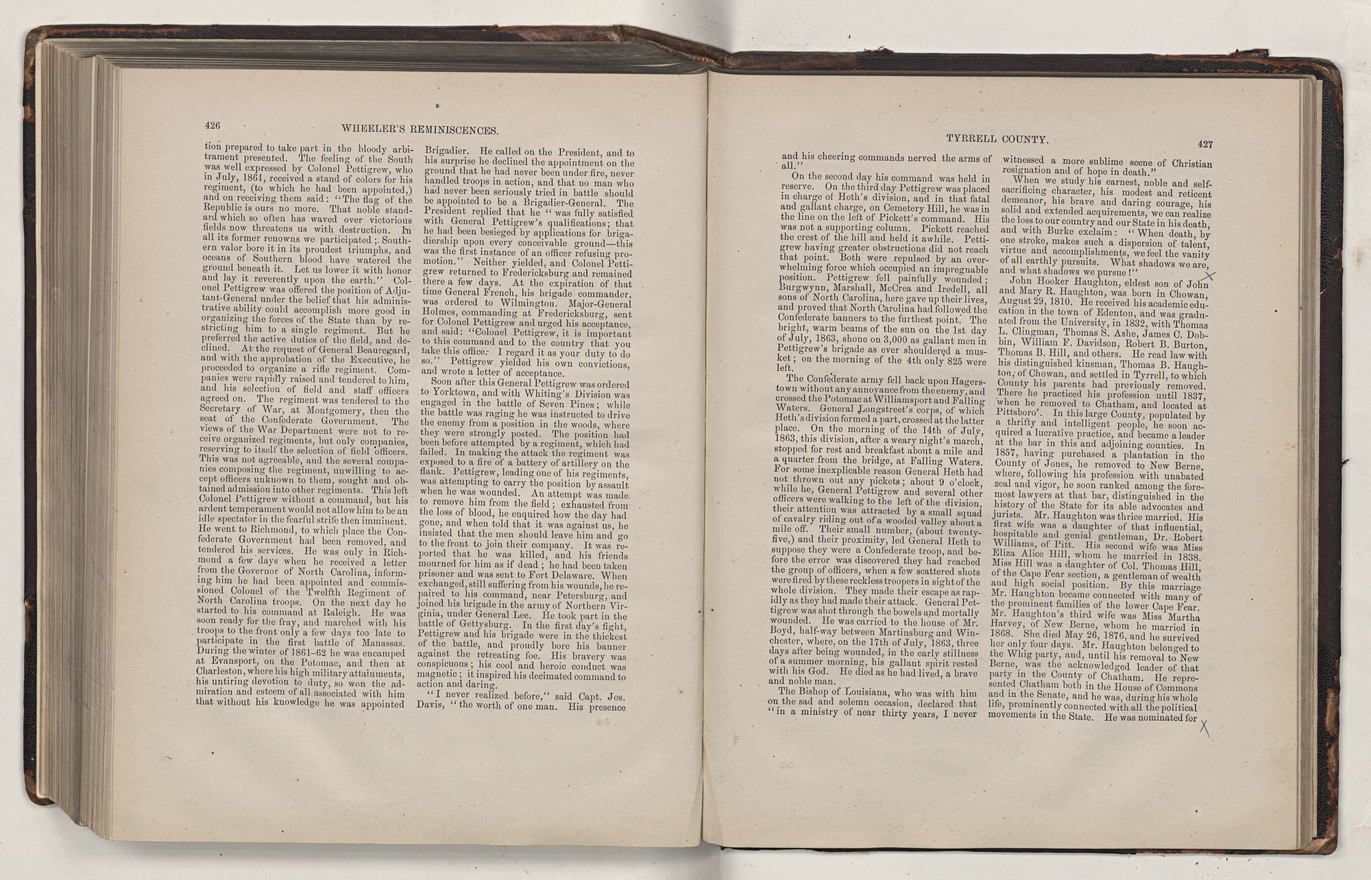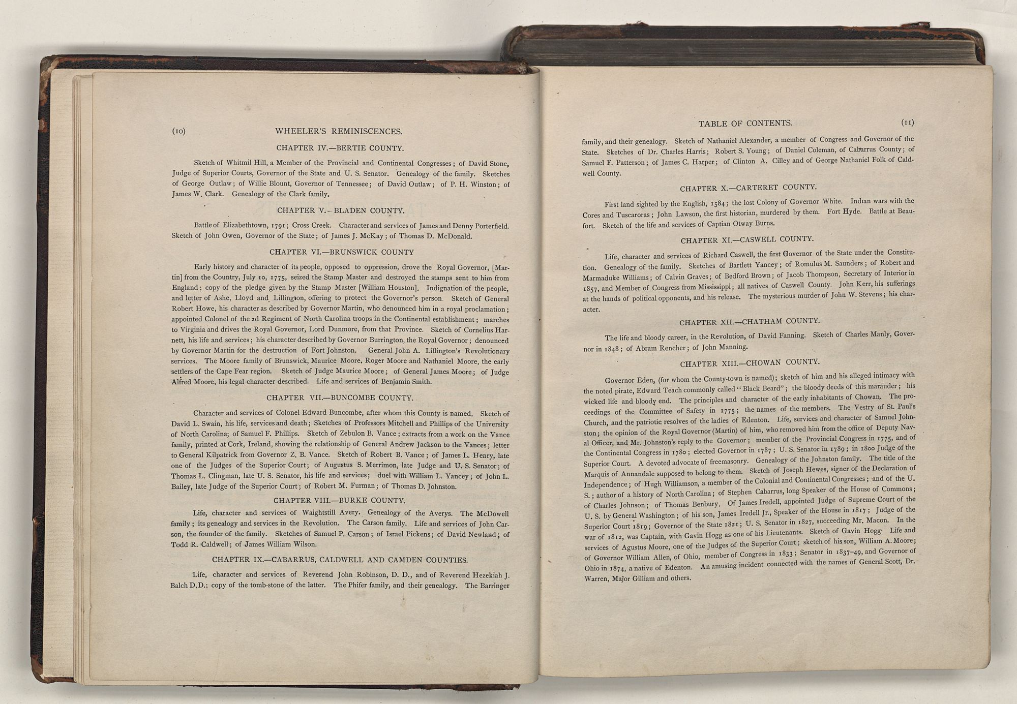 Sketch of James M. Leach of Davidson; of James Gillaspie; of Thomas and O. Kenan; of Charles Hooks of Duplin Co. Sketch of Henry Irwin, a Revolutionary hero; of Jonas Johnston; of John Haywood; genealogy of the Haywood family. Sketch of Henry T. Clark, Governor of North Carolina. The Battle Family, and their genealogy, including Judge Wm. H. Battle, and his son, Kemp P. Battle. Sketch of Duncan L. Clark, of U. S. Army; of Wm. D. Pender; of R. R. Bridgers; of Charles Price of Davie; of John B. Hussey of Davie.