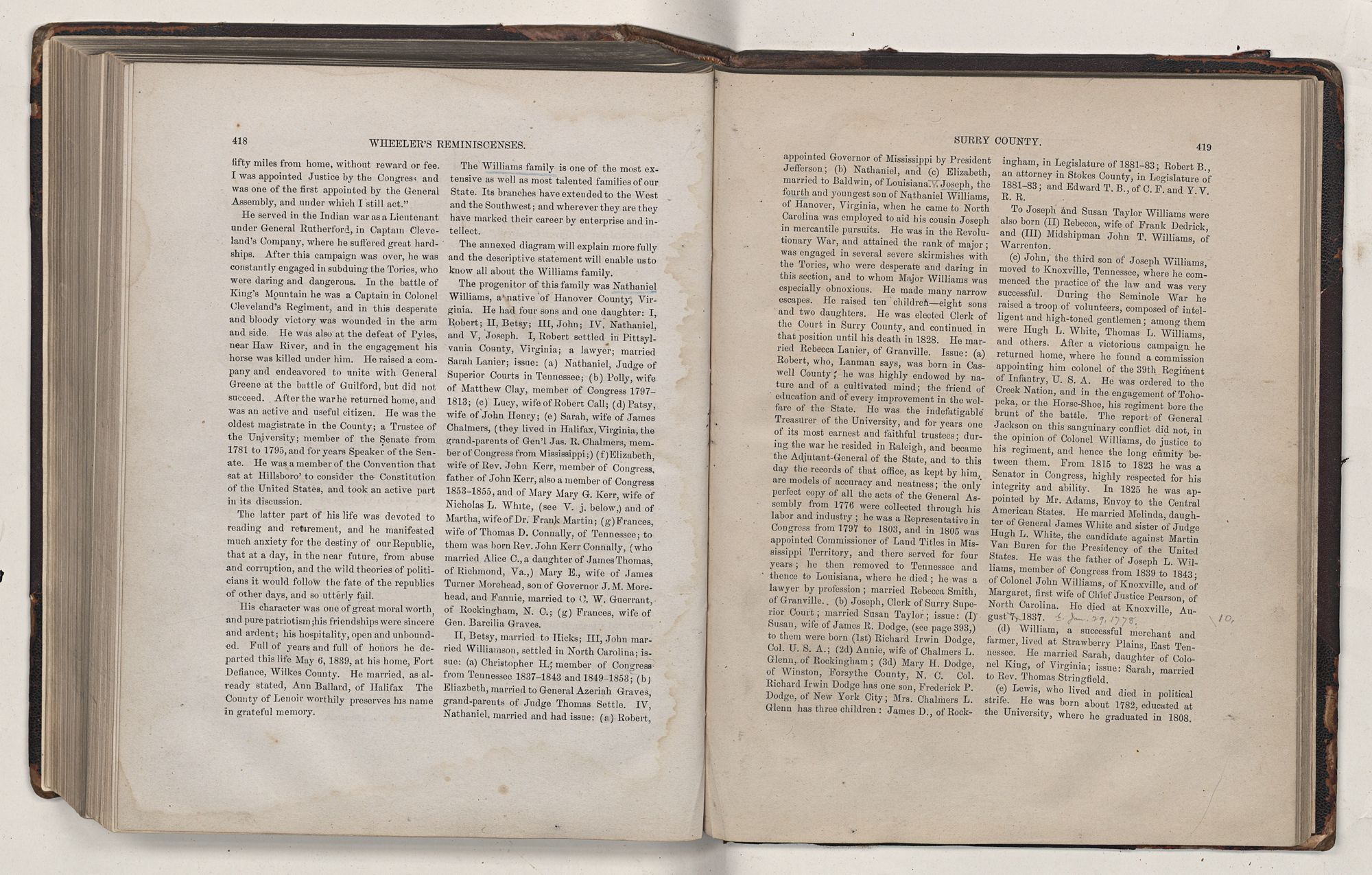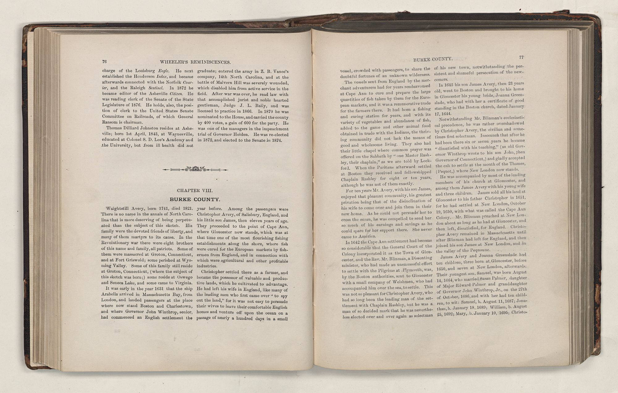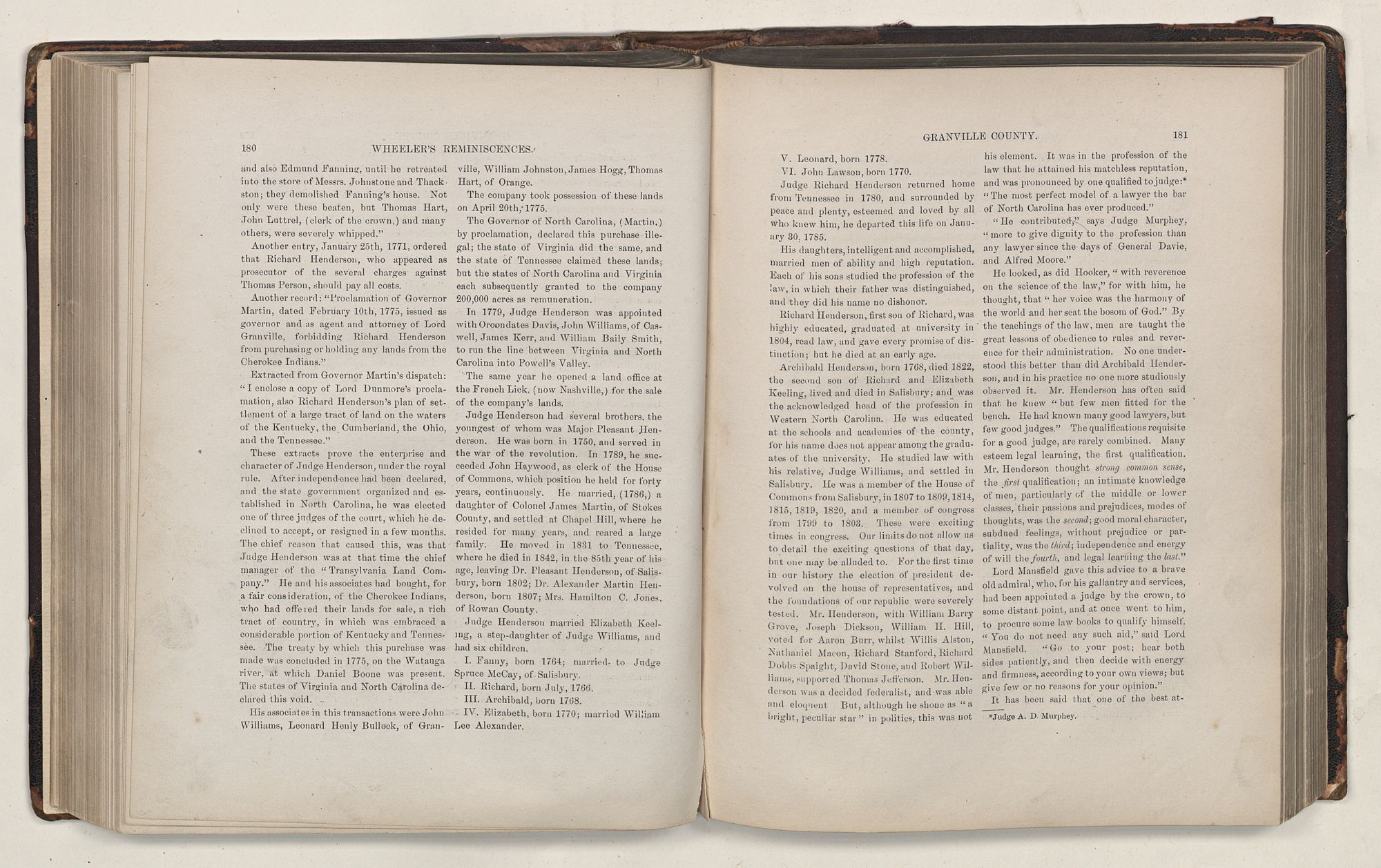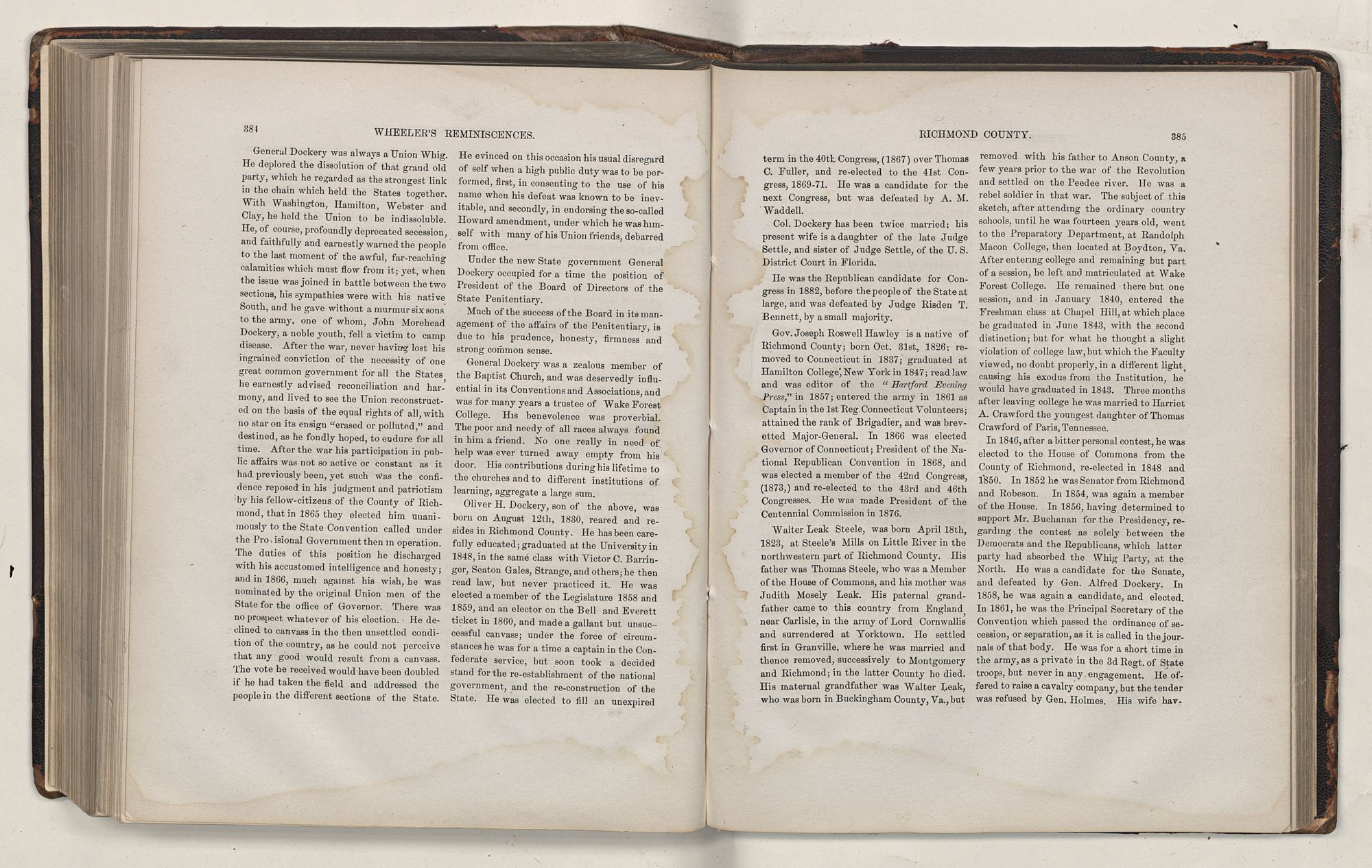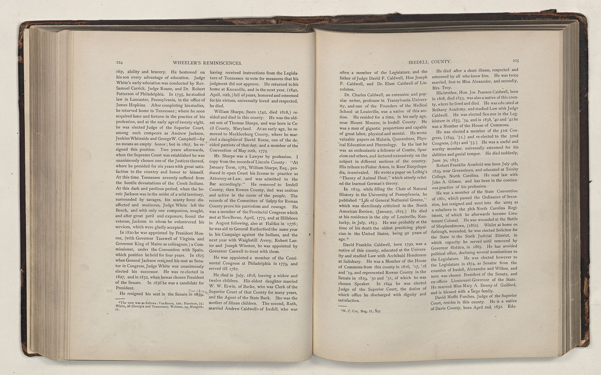 Sketch of James M. Leach of Davidson; of James Gillaspie; of Thomas and O. Kenan; of Charles Hooks of Duplin Co. Sketch of Henry Irwin, a Revolutionary hero; of Jonas Johnston; of John Haywood; genealogy of the Haywood family. Sketch of Henry T. Clark, Governor of North Carolina. The Battle Family, and their genealogy, including Judge Wm. H. Battle, and his son, Kemp P. Battle. Sketch of Duncan L. Clark, of U. S. Army; of Wm. D. Pender; of R. R. Bridgers; of Charles Price of Davie; of John B. Hussey of Davie.