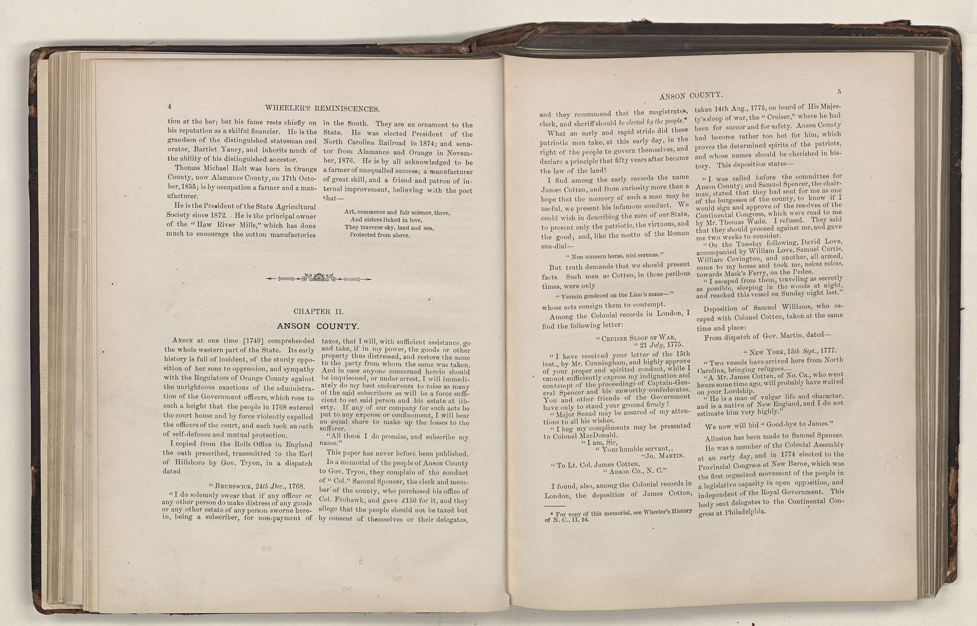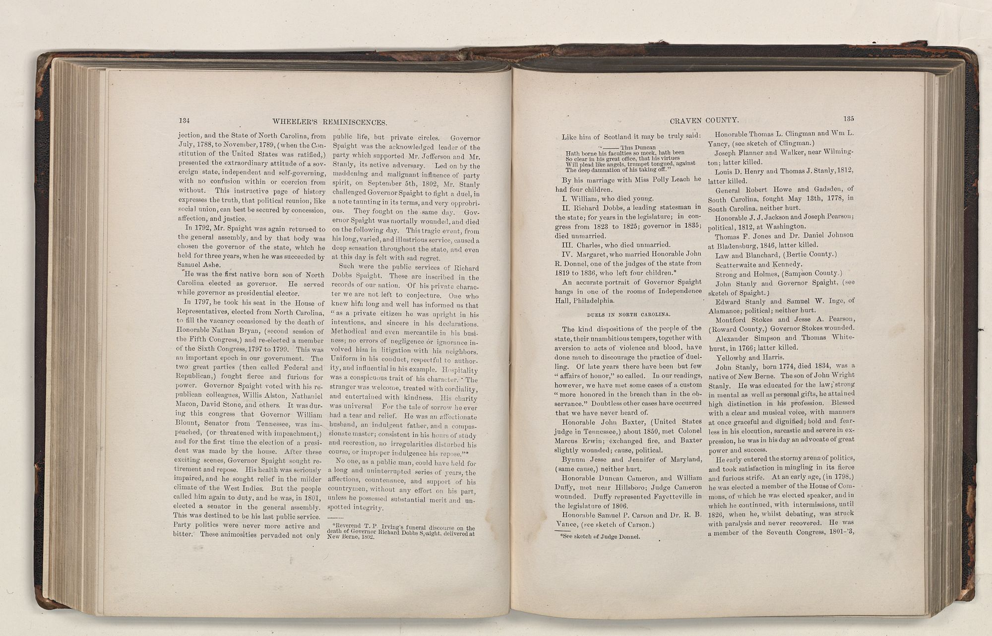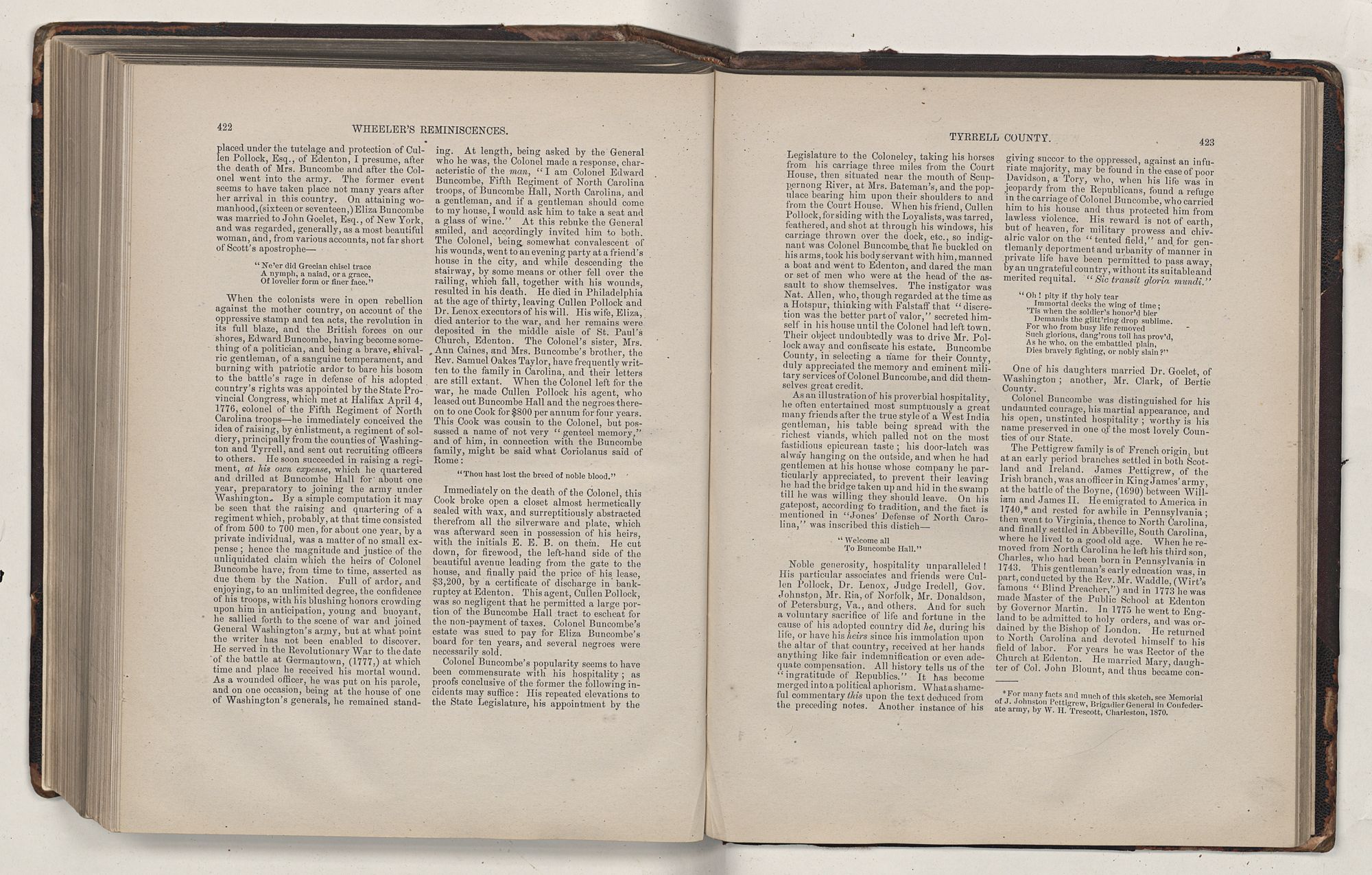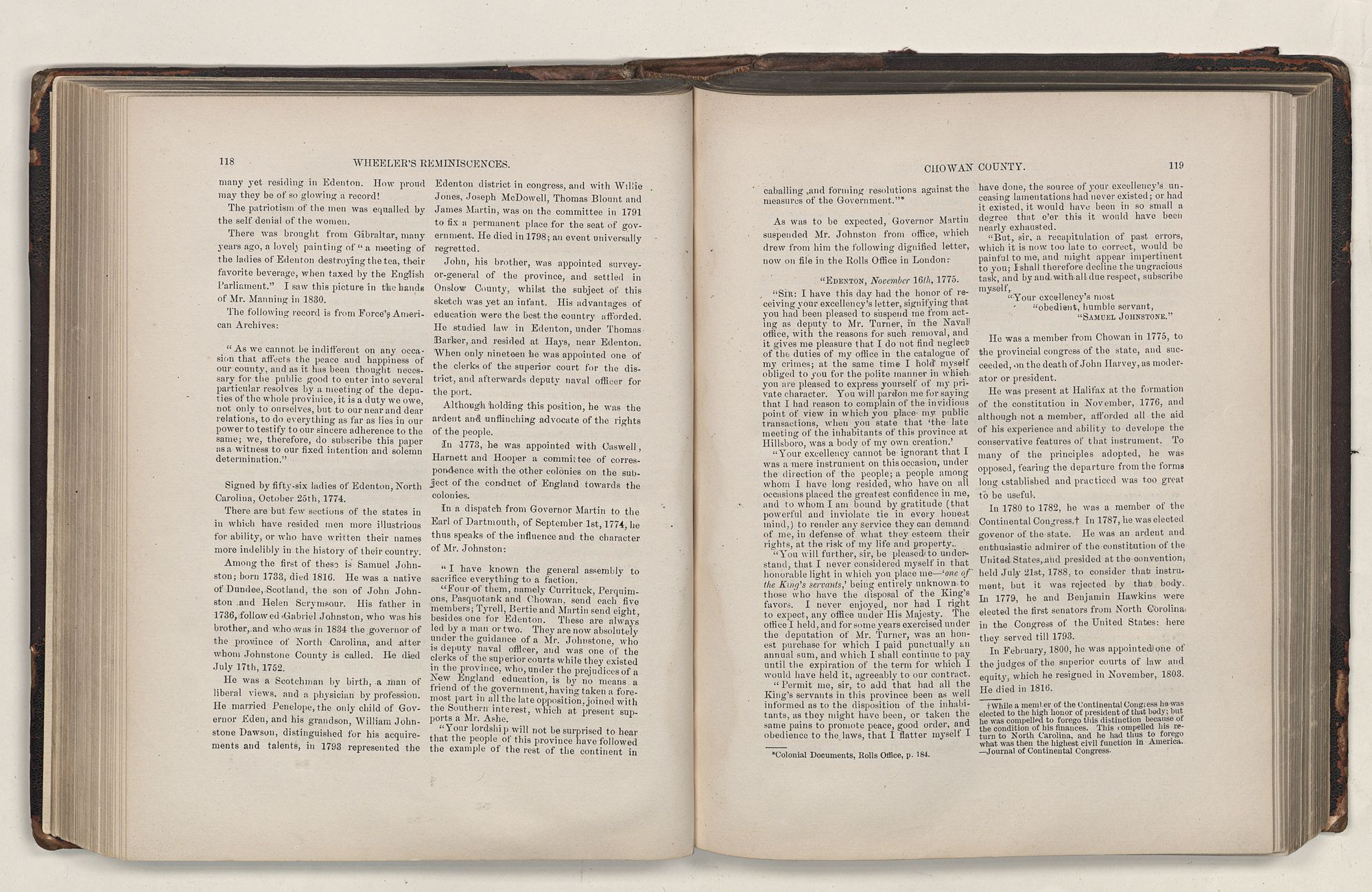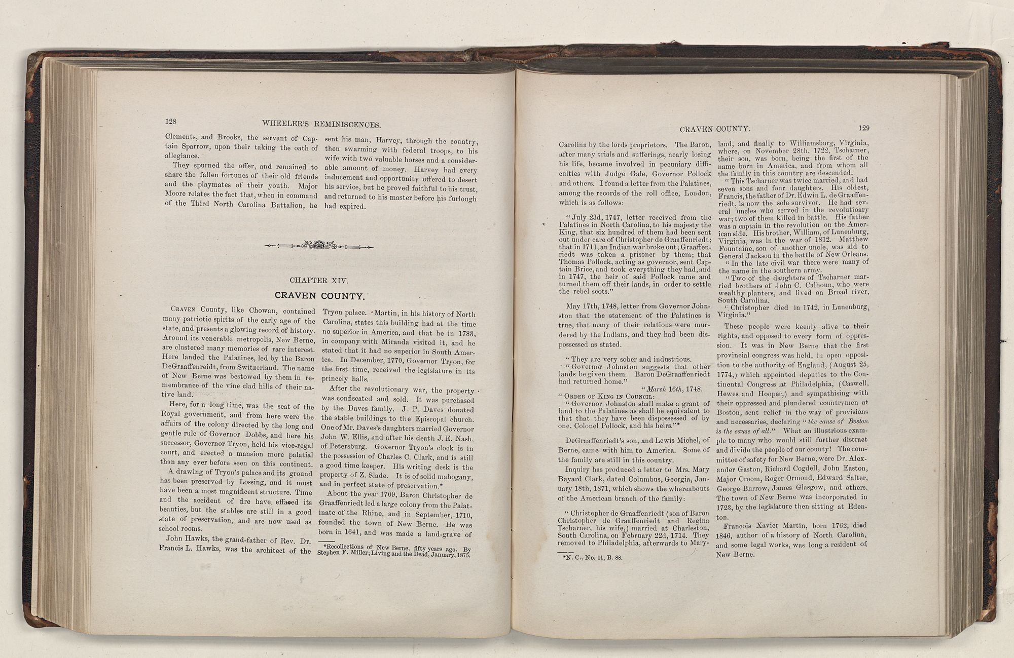 Its early history; the Palatines; De Graaffenreidt; Governor Dobbs; Tryon's palace; his clock, John Hawks, architect. “The cause of Boston, the cause of all!” Committee of Safety in 1775 of Chowan County. Names of its members. Sketch of Francois Xavier Martin, a historian of the State; of the Blount family; of Abner Nash, his character as given by Governor Martin; a member of Congress, 1776; first Speaker of the Assembly; Governor in 1779; member of Congress 1781. Life, service and death of Richard Dobbs Spaight. Duels that have been fought in North Carolina. Sketch of John Stanley; of William Gaston; of John R. Donnel; of John Sitgreaves; of John N. Bryan; of Edward Graham; of Francis L. Hawks; of George E Badger; of Matthias E. Manley; of Charles R. Thomas; of Judge Sey mour; of William J. Clarke, and his talented wife, Mary Bayard Clarke, and his son William E. Clarke.