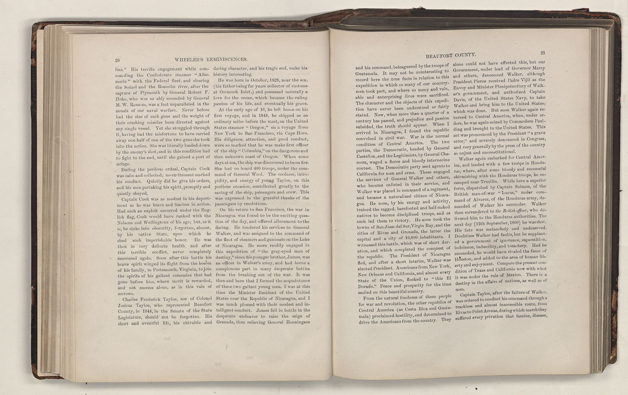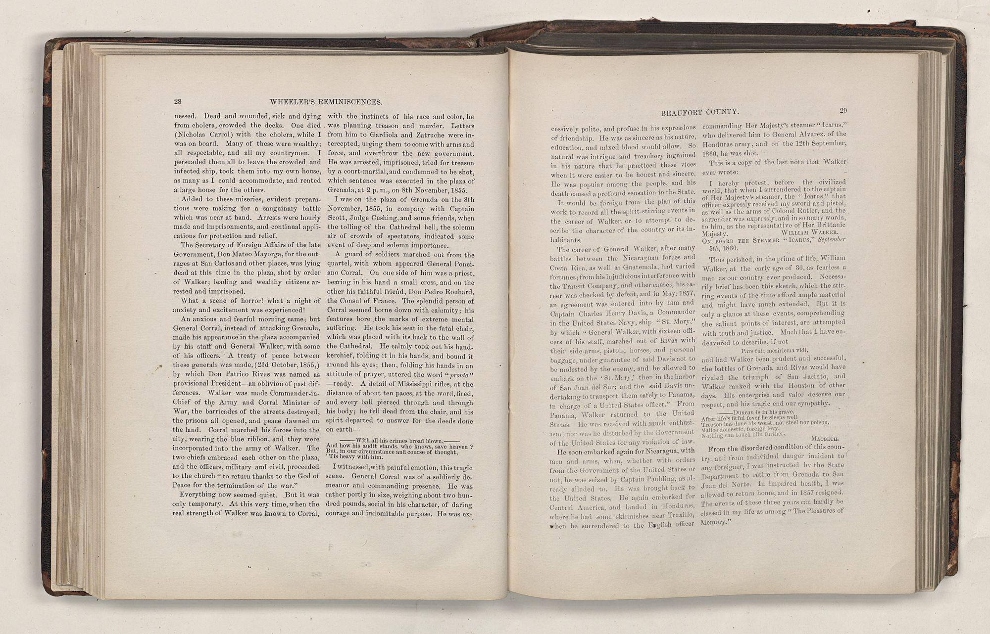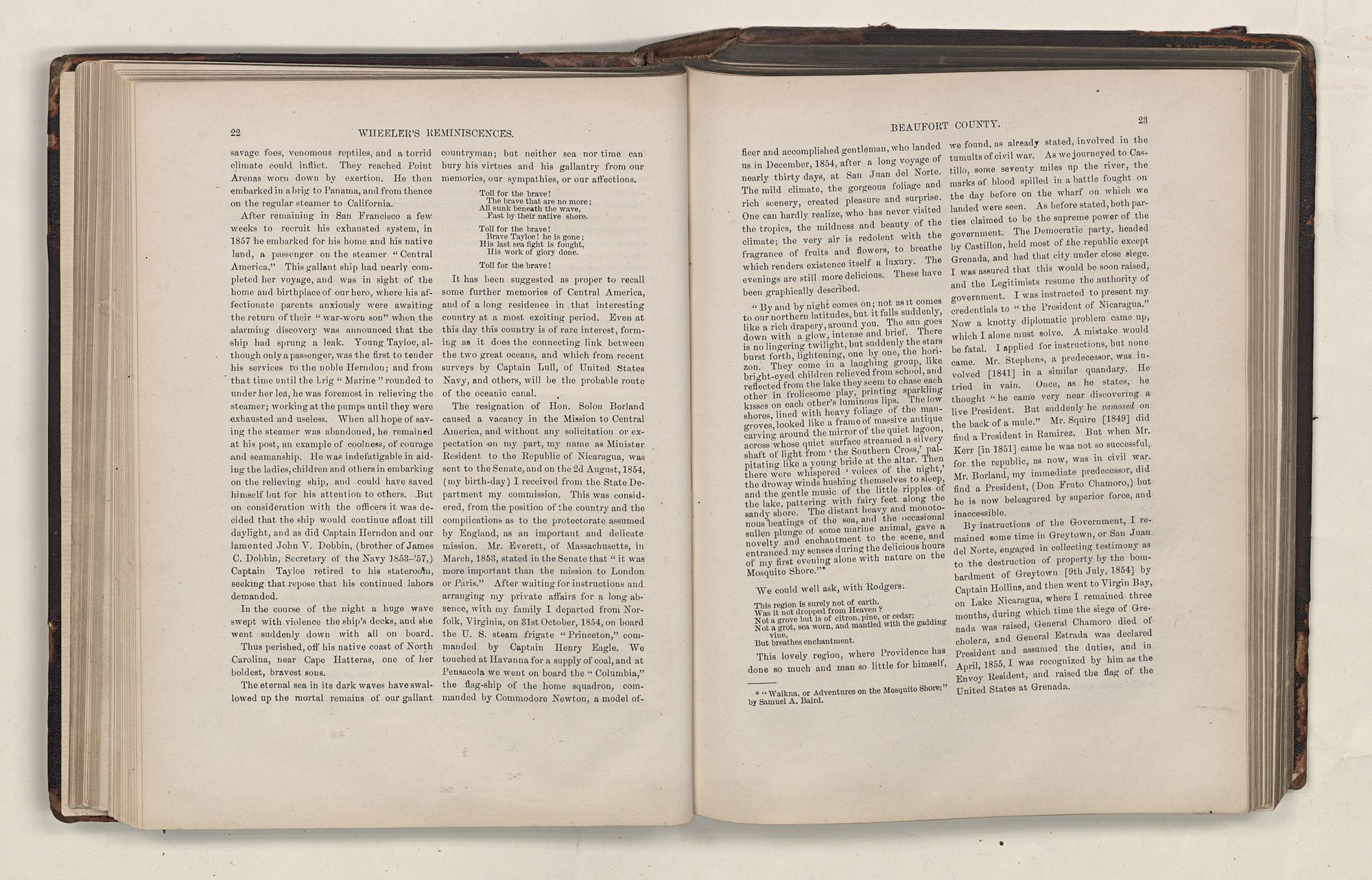Character of the nobleman for whom it is named; commissioned the Grand Master of the Grand Lodge of North Carolina. Freemasonry in North Carolina; it saves the life of an officer in battle. Jefferson's opinion of Washington. Sketch of the Blounts of Beaufort. Hon. C. C. Cambreling, long a Member of Congress from New York, a native of Beaufort. Sketch of J. J. Guthrie, drowned off Cape Hatteras. Hatteras described by Joseph W. Holden, and in the National Gazette of Philadelphia, in 1792. Sketch of Edward Stanley; a letter of Judge Badger, his relative, as to his course. Sketch of Richard S. Donnell; of Judge Rodman, who agrees with Hooker in his opinion of the law. James Cook, C. S N. Adventurous life of Charles F. Taylor, a native of this section; participates in the war in Nicaragua; its stirring events, facts never before published: the policy of Marcey an error; sad fate of Walker; tragic death of Herndon, with whom another North Carolinian (John V. Dobbin) was drowned. Central America described. The Minister of the United States is recieved. Revolution. Walker captures Virgin Bay, Grenada, and puts the Government to flight. Sketch of Walker and his adventurous life. Scenes at the Capital; the U. S. Minister in jeopardy. The General Commander-in-Chief and the Secretary of Foreign Affairs executed by the invading forces. Letters between the General-in-Chief and the American Minister; the last letter of Walker.