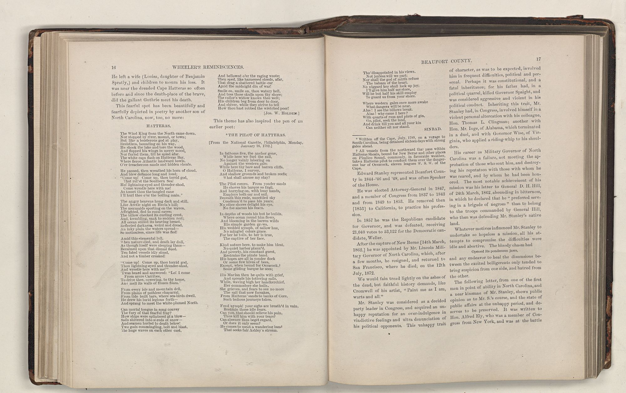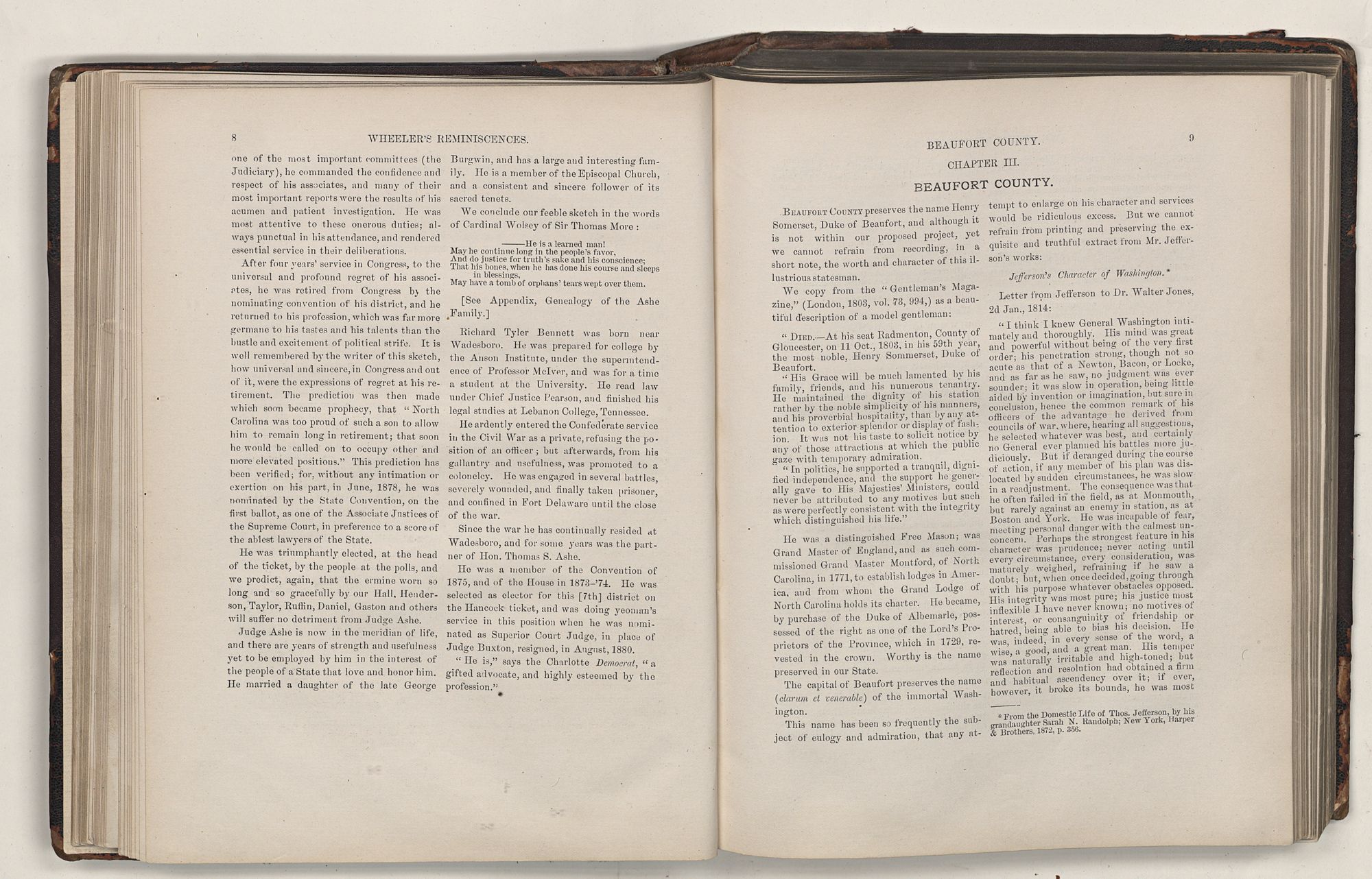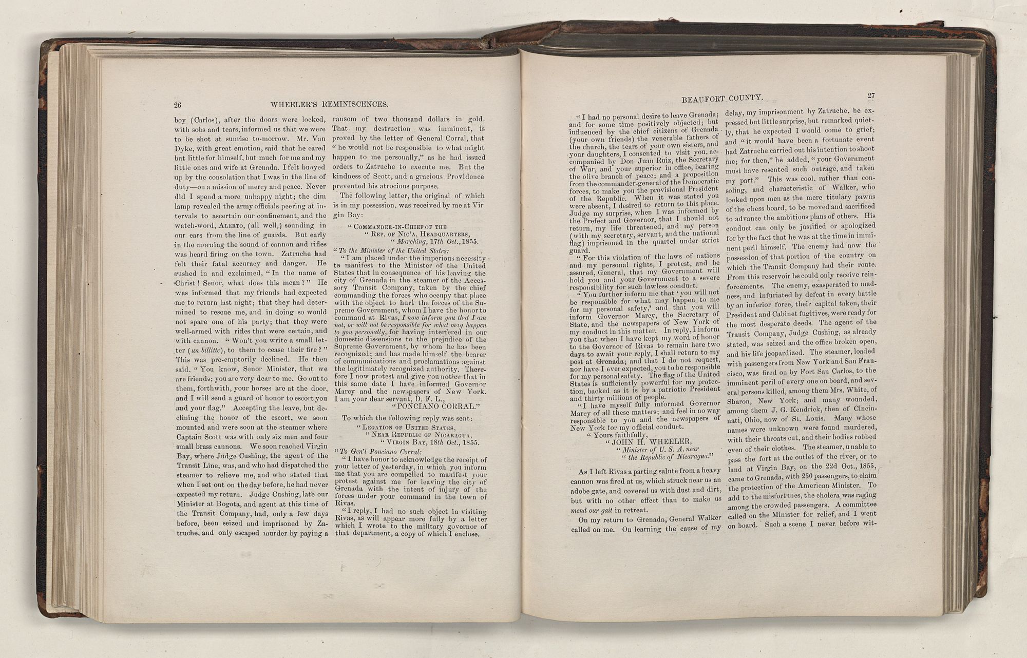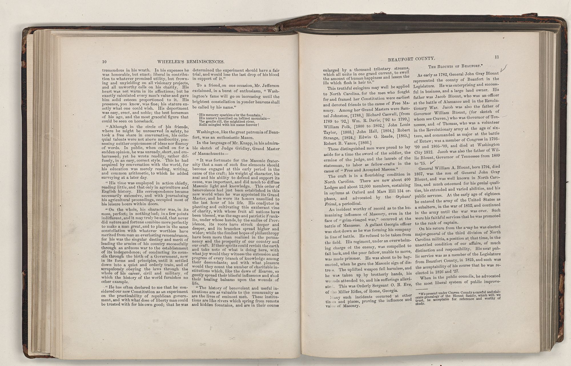 Character of the nobleman for whom it is named; commissioned the Grand Master of the Grand Lodge of North Carolina. Freemasonry in North Carolina; it saves the life of an officer in battle. Jefferson's opinion of Washington. Sketch of the Blounts of Beaufort. Hon. C. C. Cambreling, long a Member of Congress from New York, a native of Beaufort. Sketch of J. J. Guthrie, drowned off Cape Hatteras. Hatteras described by Joseph W. Holden, and in the National Gazette of Philadelphia, in 1792. Sketch of Edward Stanley; a letter of Judge Badger, his relative, as to his course. Sketch of Richard S. Donnell; of Judge Rodman, who agrees with Hooker in his opinion of the law. James Cook, C. S N. Adventurous life of Charles F. Taylor, a native of this section; participates in the war in Nicaragua; its stirring events, facts never before published: the policy of Marcey an error; sad fate of Walker; tragic death of Herndon, with whom another North Carolinian (John V. Dobbin) was drowned. Central America described. The Minister of the United States is recieved. Revolution. Walker captures Virgin Bay, Grenada, and puts the Government to flight. Sketch of Walker and his adventurous life. Scenes at the Capital; the U. S. Minister in jeopardy. The General Commander-in-Chief and the Secretary of Foreign Affairs executed by the invading forces. Letters between the General-in-Chief and the American Minister; the last letter of Walker.