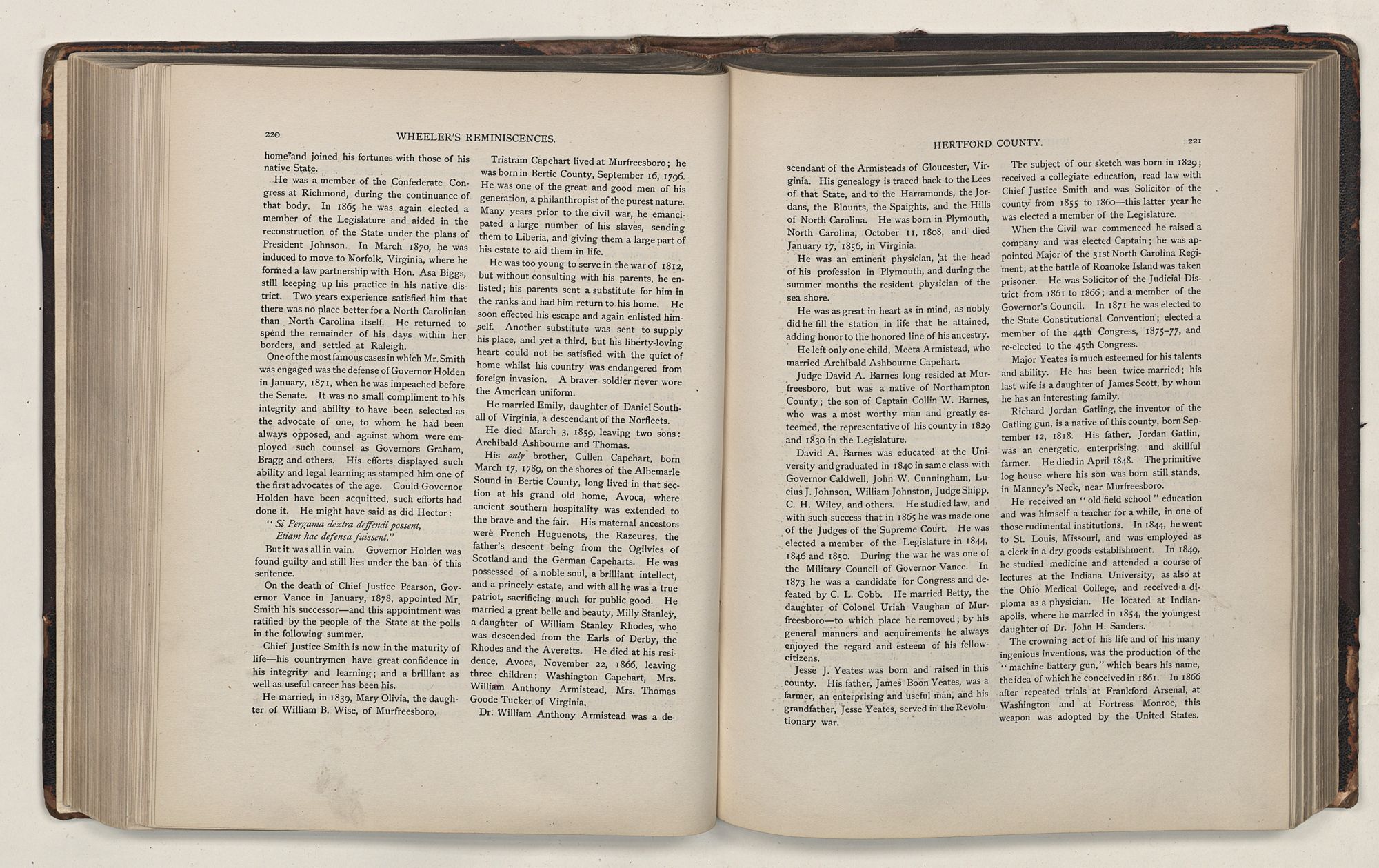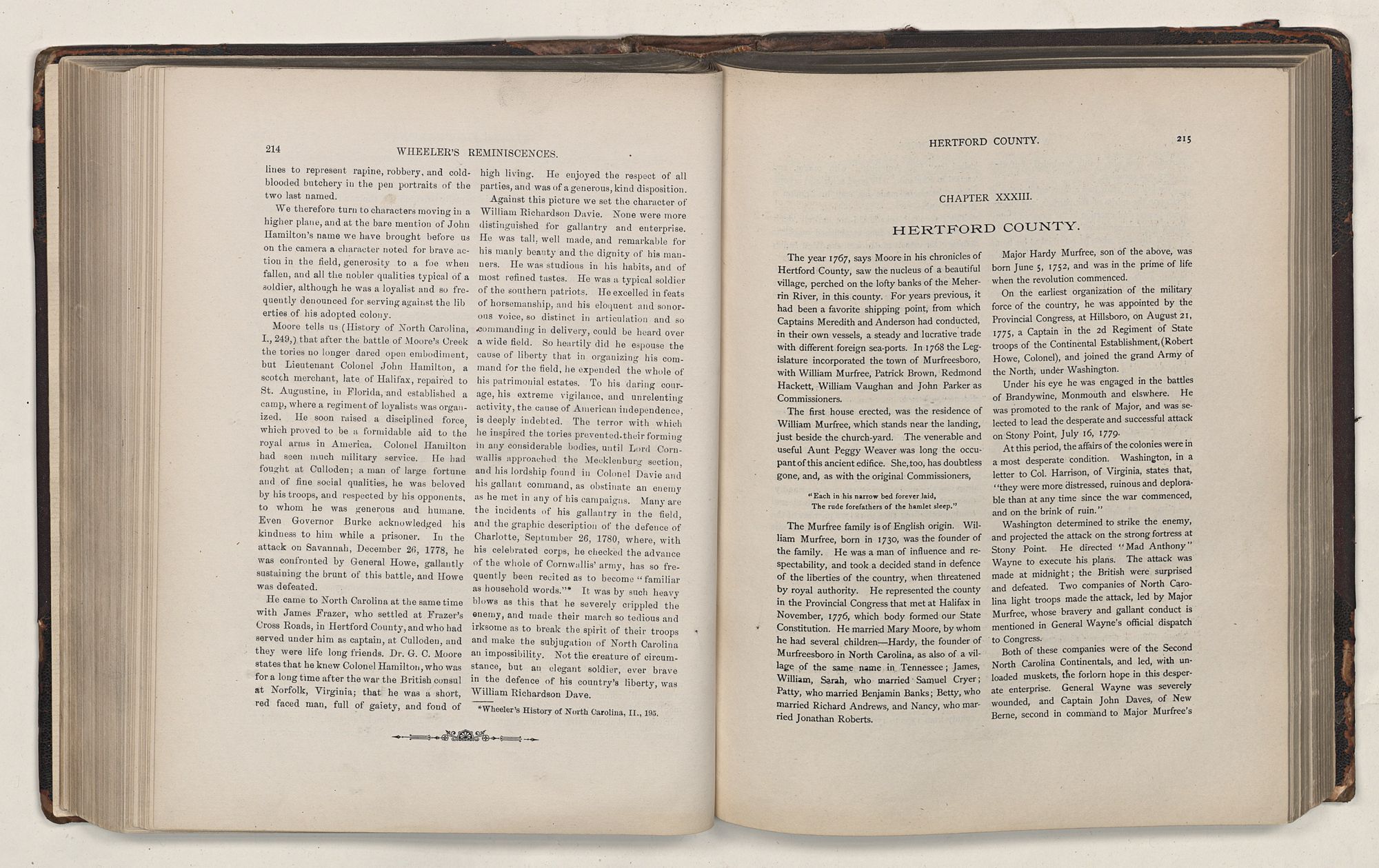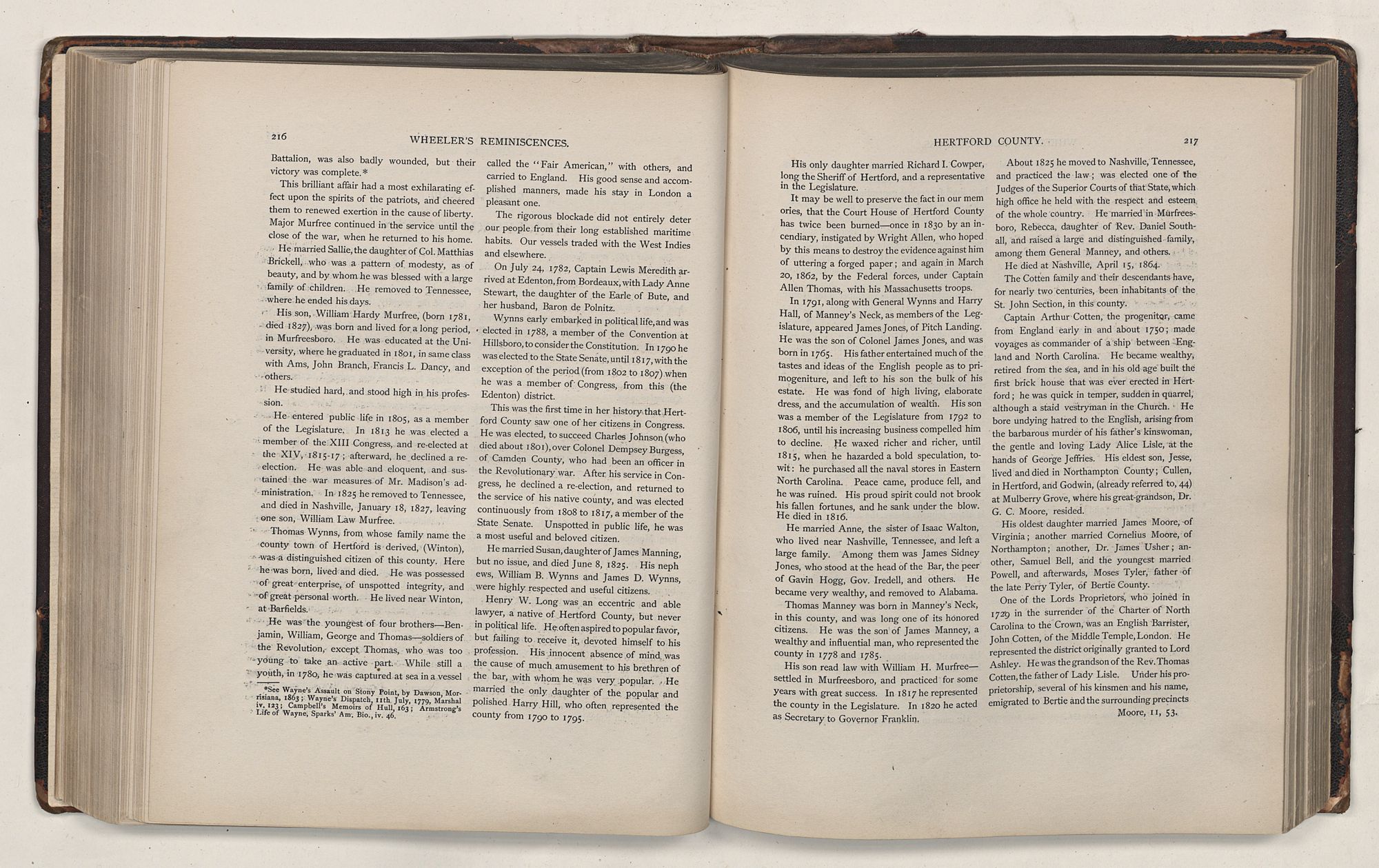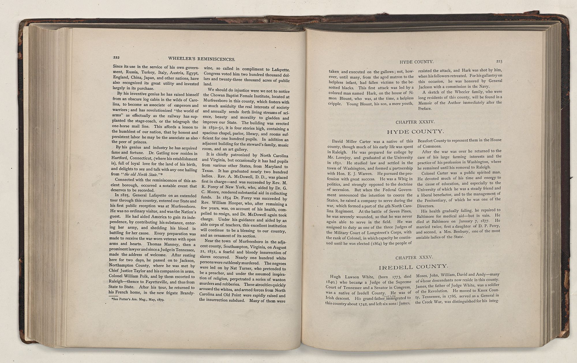 The Murfree Family. Sketch of General Thomas Wynns; of the Cotten Family; of Rev. Matthias Brickle; of Dr. Goodwin C. Moore; of John Brown; Sketch of Kenneth Rayner; of William N. H. Smith; Tristram Capehart; of Cullen Capehart and of Dr. Wm. Anthony Armistead; of David A. Barnes; of Jesse J. Yeates; of Richard J. Gatling; Gen. Lafayette's visit to North Carolina; The Chowan Female Institute; Insurrection of Slaves; Sketch of David Miller Carter of Hyde County. The Wheeler Family referred to.
