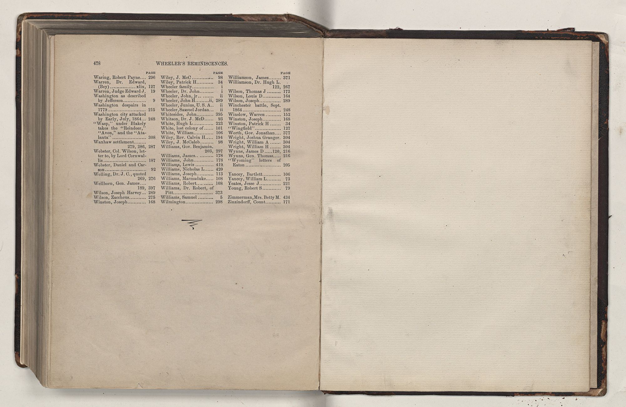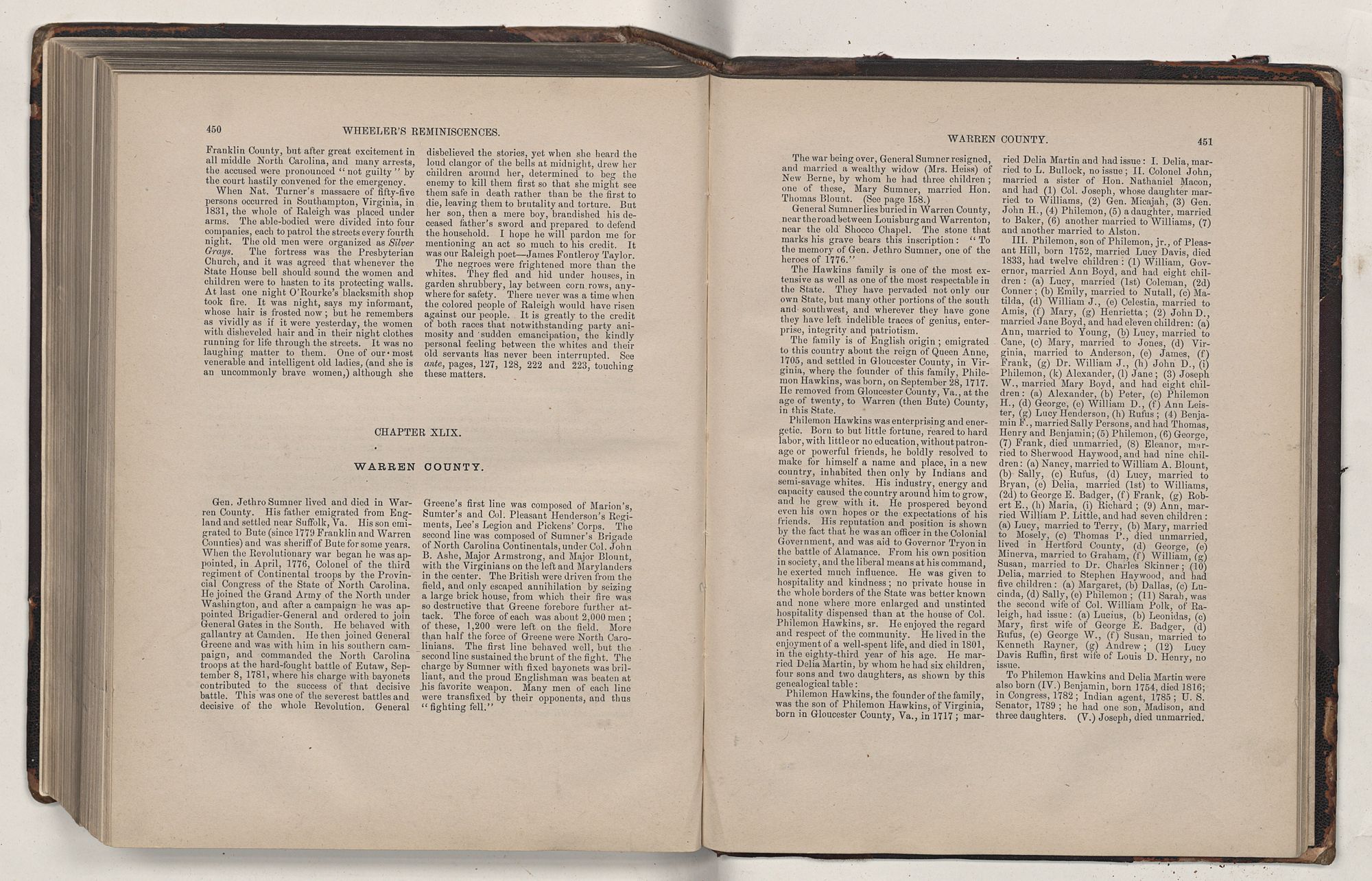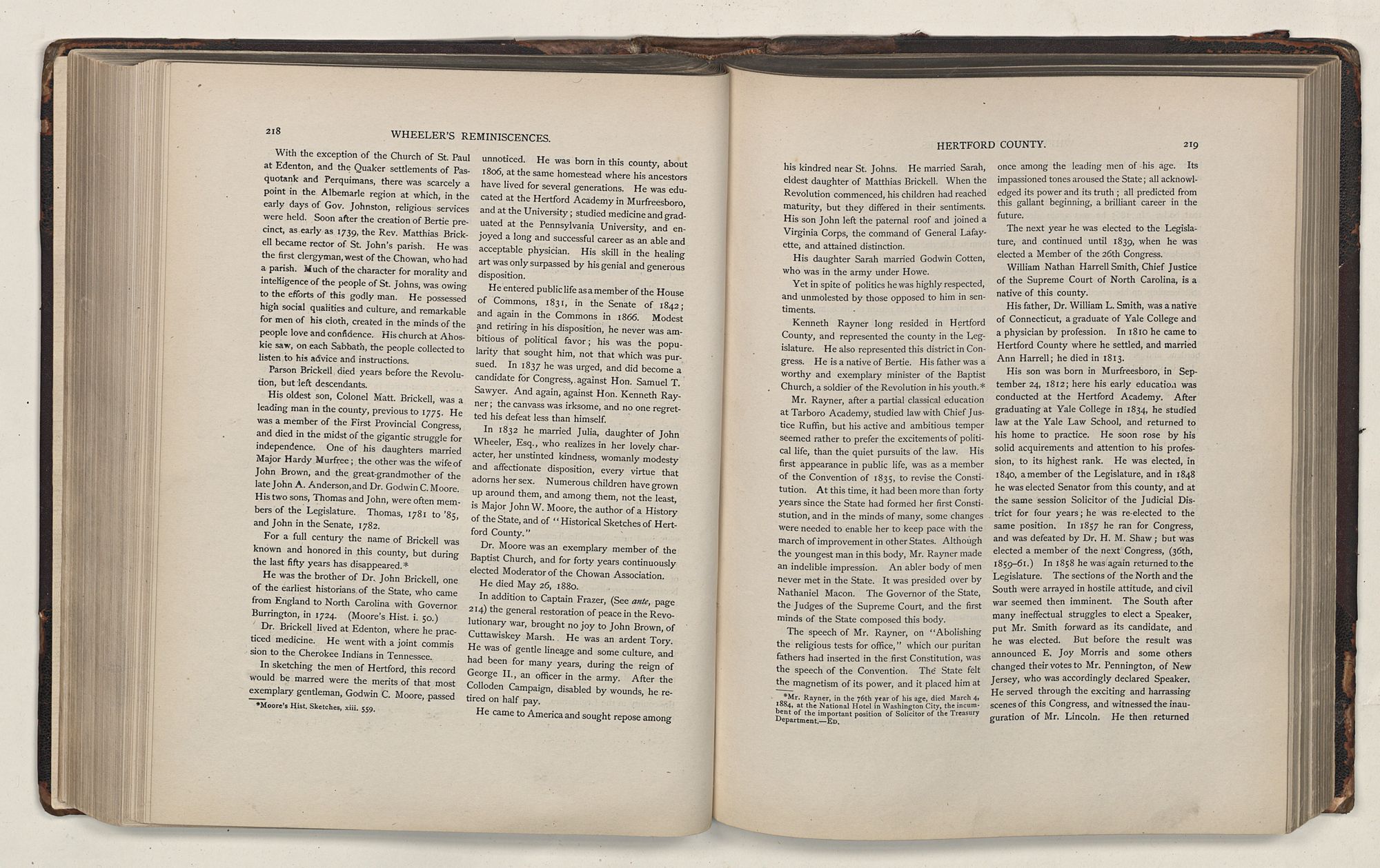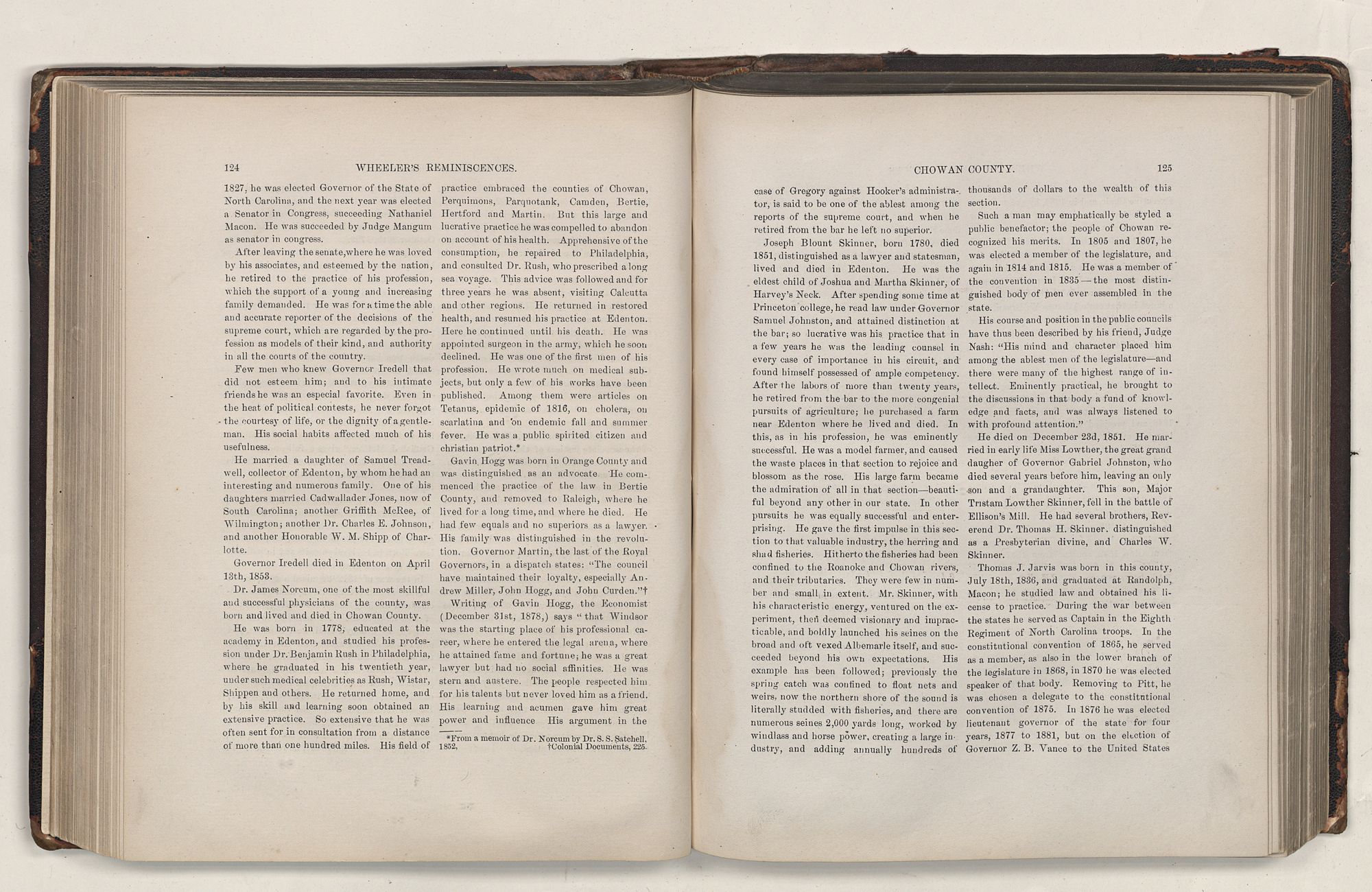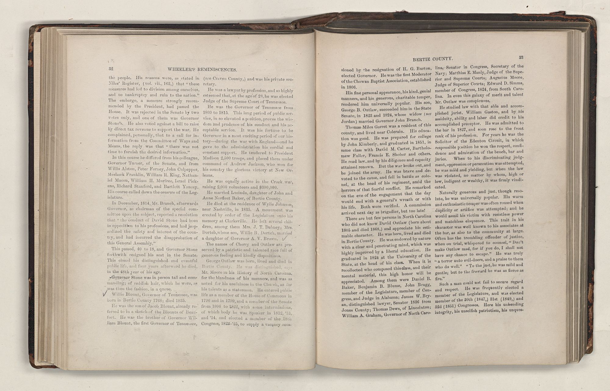 The Murfree Family. Sketch of General Thomas Wynns; of the Cotten Family; of Rev. Matthias Brickle; of Dr. Goodwin C. Moore; of John Brown; Sketch of Kenneth Rayner; of William N. H. Smith; Tristram Capehart; of Cullen Capehart and of Dr. Wm. Anthony Armistead; of David A. Barnes; of Jesse J. Yeates; of Richard J. Gatling; Gen. Lafayette's visit to North Carolina; The Chowan Female Institute; Insurrection of Slaves; Sketch of David Miller Carter of Hyde County. The Wheeler Family referred to.