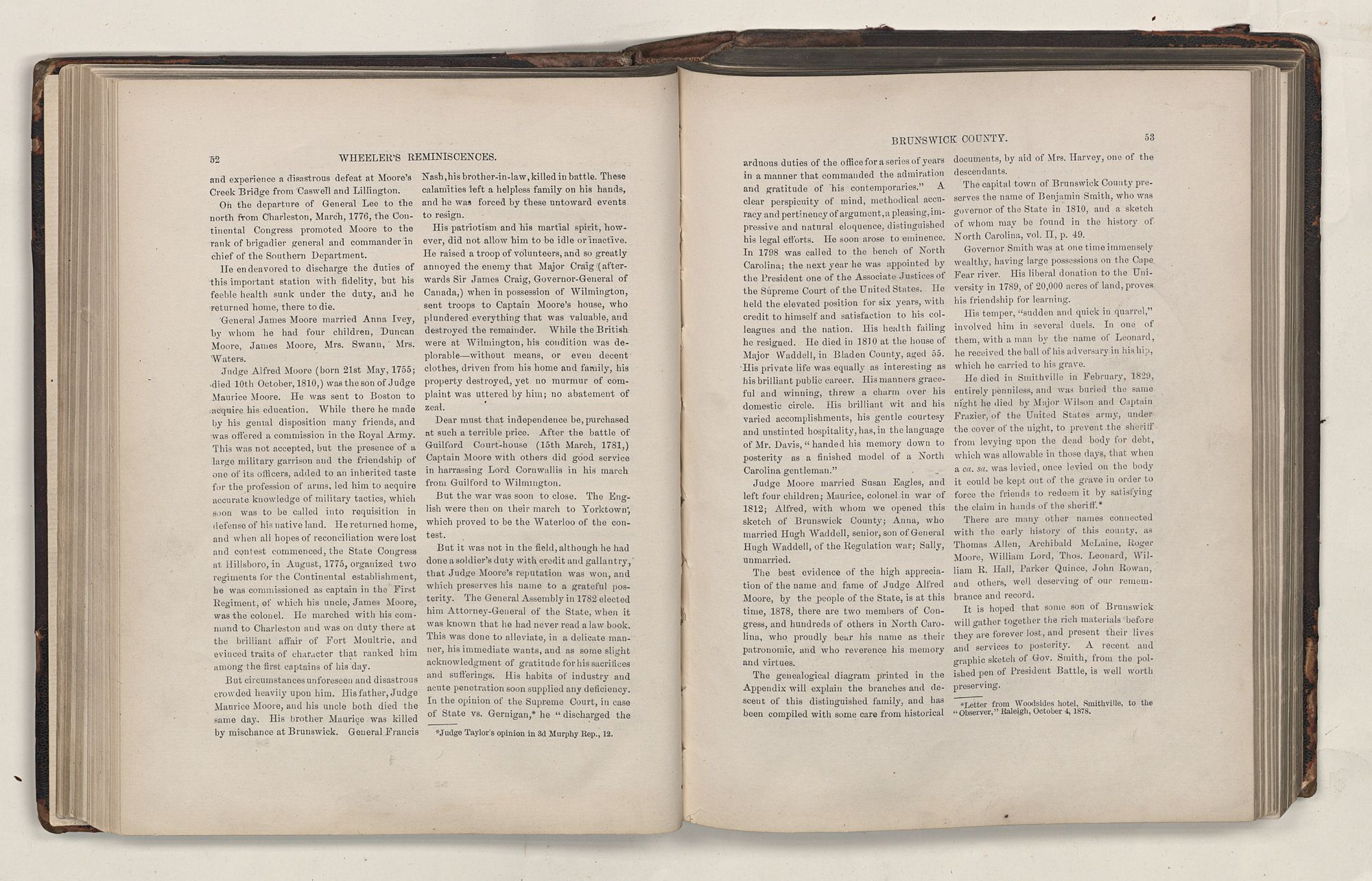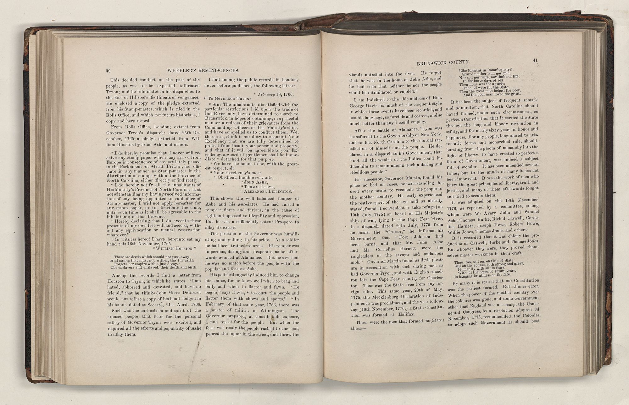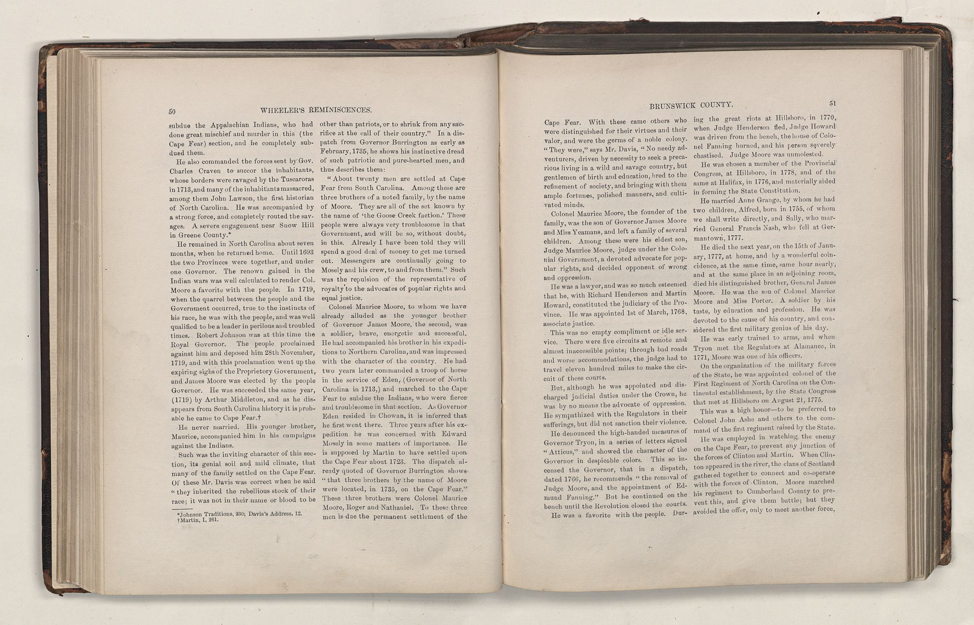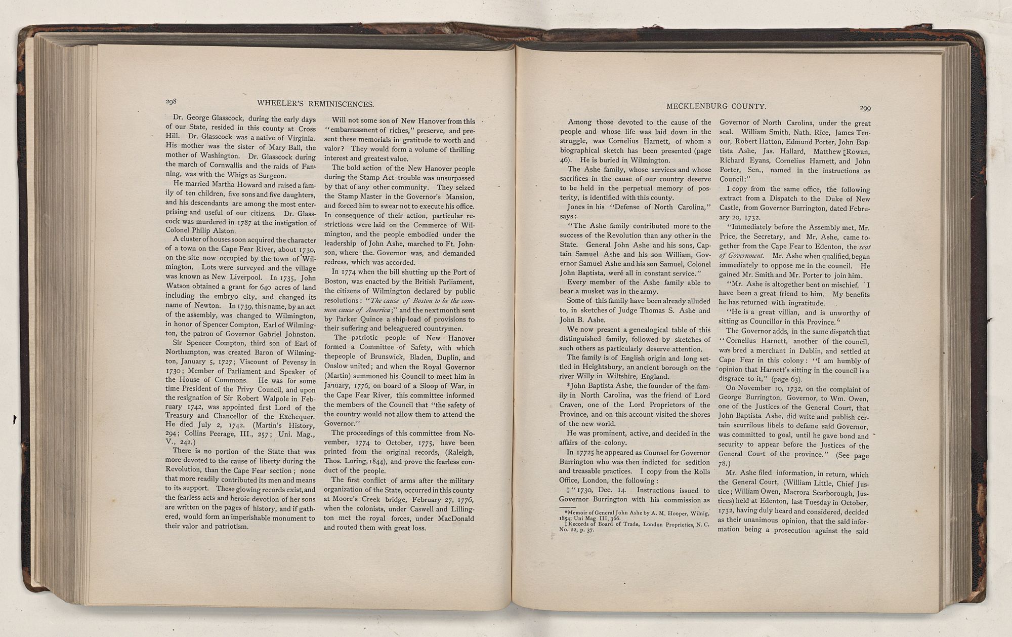 Early history and character of its people, opposed to oppression, drove the Royal Governor, [Martin] from the Country, July 10, 1775, seized the Stamp Master and destroyed the stamps sent to him from England; copy of the pledge given by the Stamp Master [William Houston]. Indignation of the people, and letter of Ashe, Lloyd and Lillington, offering to protect the Governor's person Sketch of General Robert Howe, his character as described by Governor Martin, who denounced him in a royal proclamation; appointed Colonel of the 2d Regiment of North Carolina troops in the Continental establishment; marches to Virginia and drives the Royal Governor, Lord Dunmore, from that Province. Sketch of Cornelius Harnett, his life and services; his character described by Governor Burrington, the Royal Governor; denounced by Governor Martin for the destruction of Fort Johnston. General John A. Lillington's Revolutionary services. The Moore family of Brunswick, Maurice Moore, Roger Moore and Nathaniel Moore, the early settlers of the Cape Fear region. Sketch of Judge Maurice Moore; of General James Moore; of Judge Alfred Moore, his legal character described. Life and services of Benjamin Smith.
