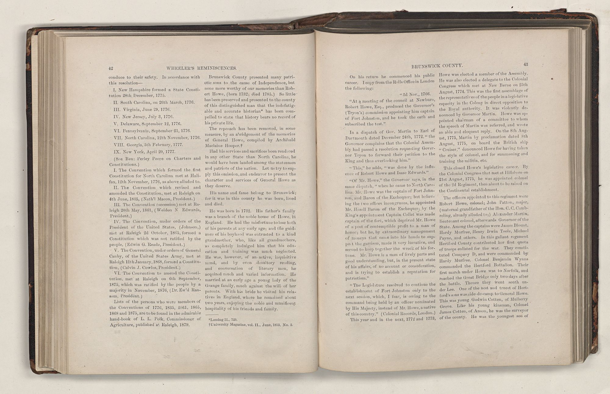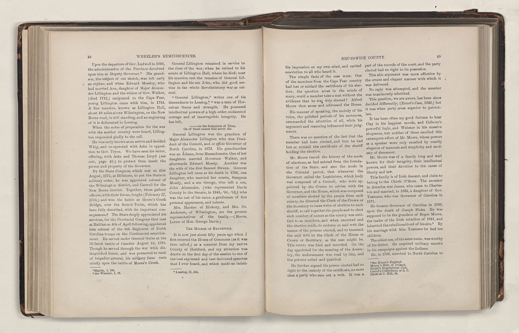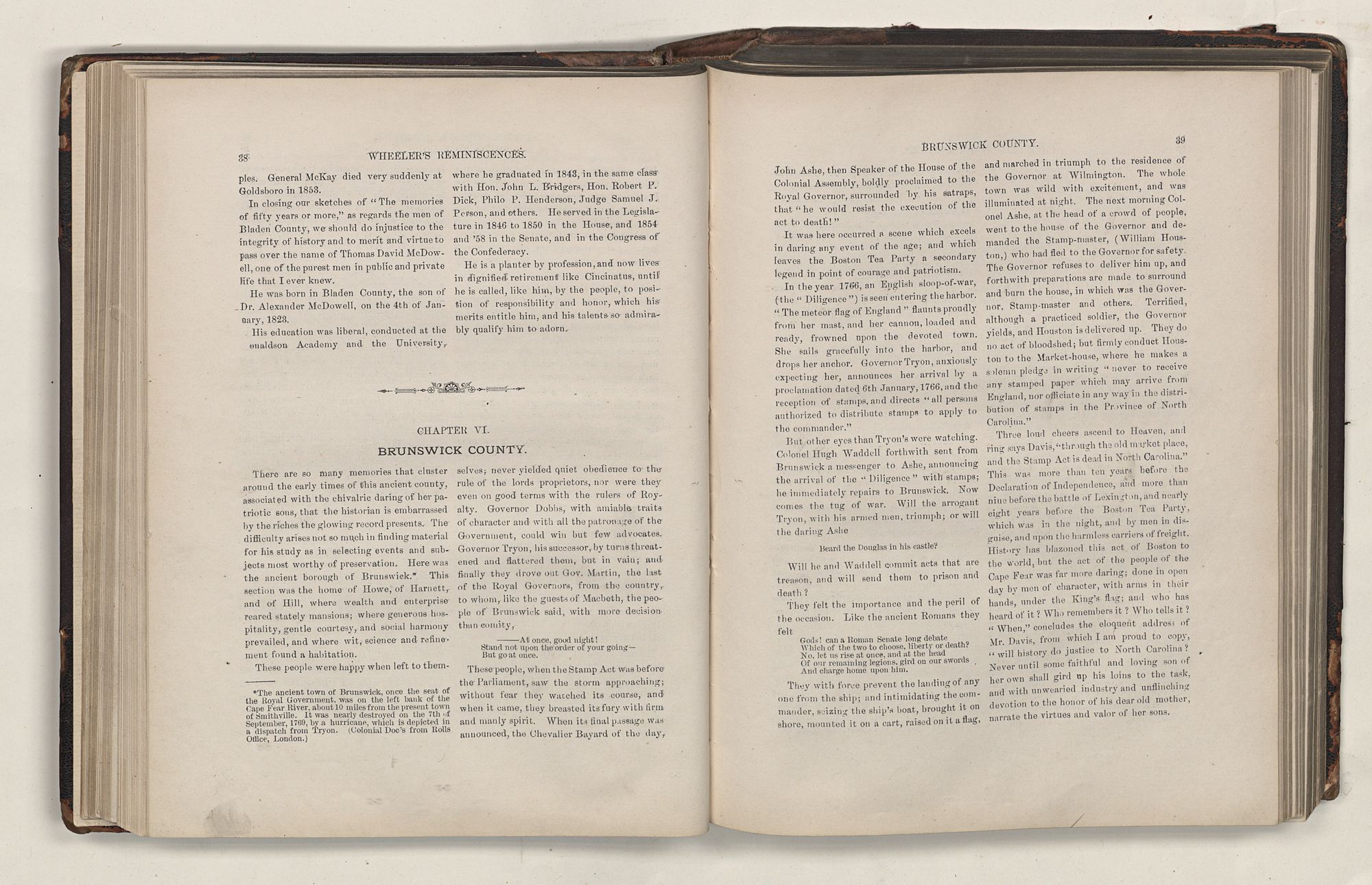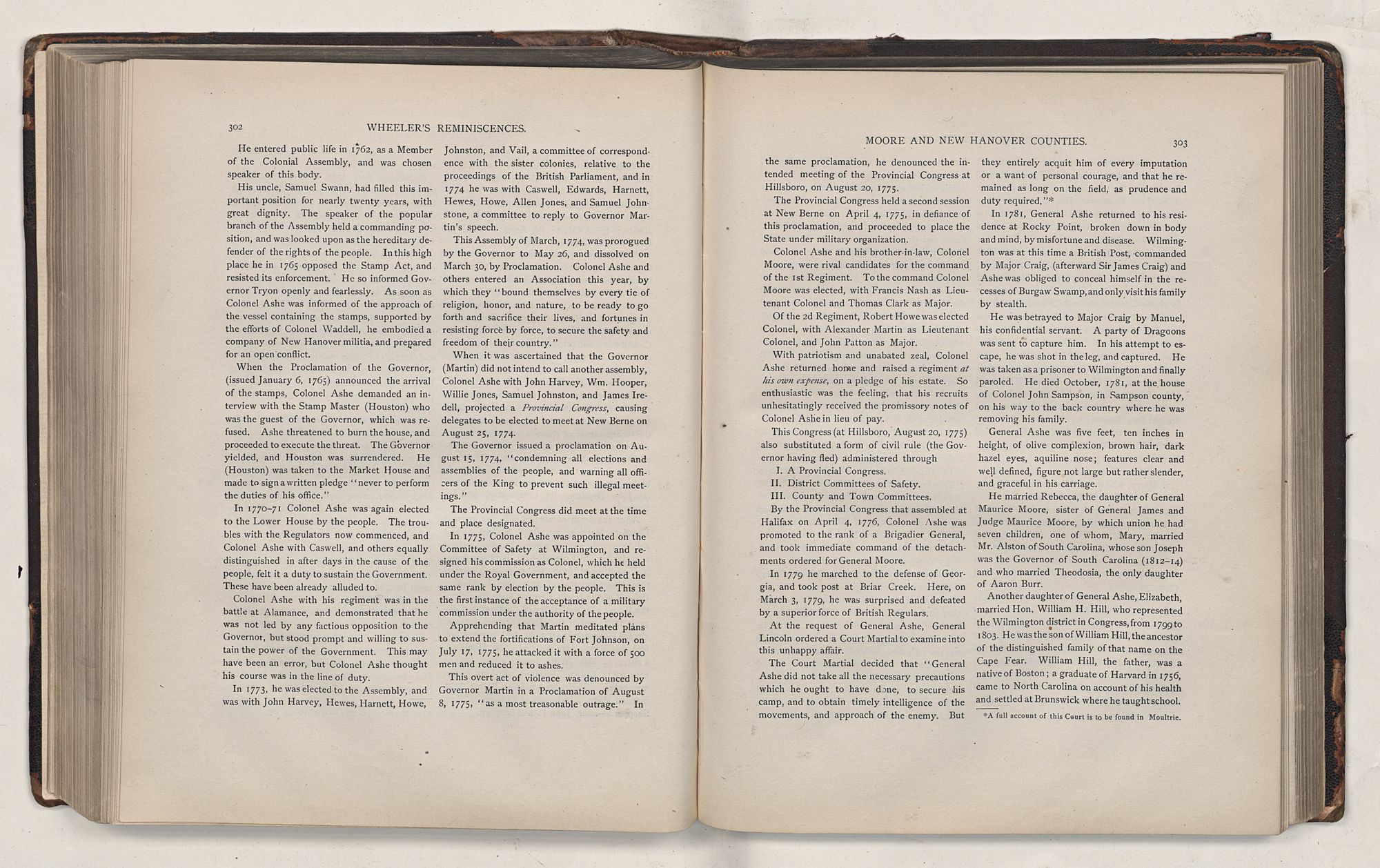 Early history and character of its people, opposed to oppression, drove the Royal Governor, [Martin] from the Country, July 10, 1775, seized the Stamp Master and destroyed the stamps sent to him from England; copy of the pledge given by the Stamp Master [William Houston]. Indignation of the people, and letter of Ashe, Lloyd and Lillington, offering to protect the Governor's person Sketch of General Robert Howe, his character as described by Governor Martin, who denounced him in a royal proclamation; appointed Colonel of the 2d Regiment of North Carolina troops in the Continental establishment; marches to Virginia and drives the Royal Governor, Lord Dunmore, from that Province. Sketch of Cornelius Harnett, his life and services; his character described by Governor Burrington, the Royal Governor; denounced by Governor Martin for the destruction of Fort Johnston. General John A. Lillington's Revolutionary services. The Moore family of Brunswick, Maurice Moore, Roger Moore and Nathaniel Moore, the early settlers of the Cape Fear region. Sketch of Judge Maurice Moore; of General James Moore; of Judge Alfred Moore, his legal character described. Life and services of Benjamin Smith.