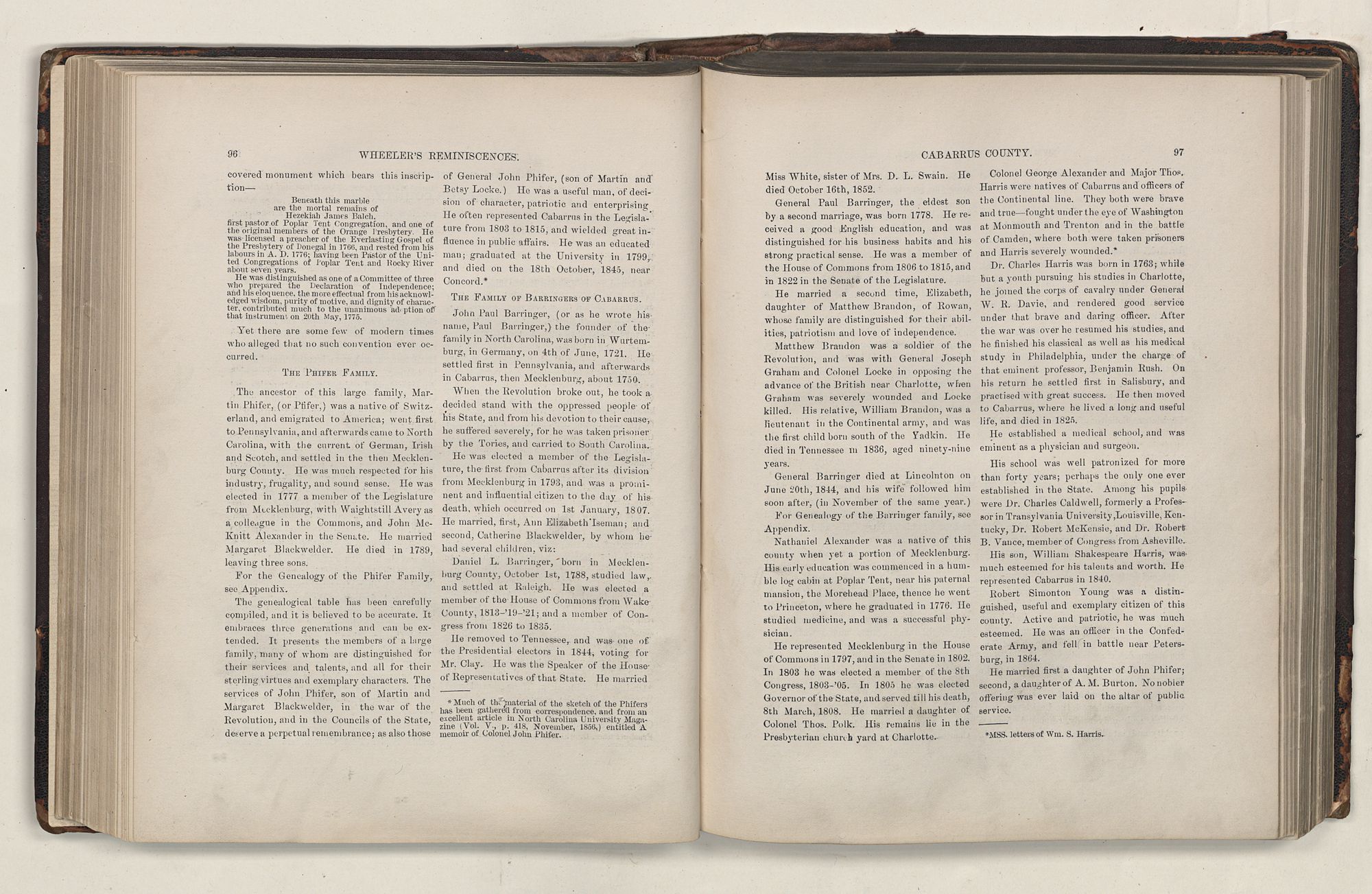 family, and their genealogy. Sketch of Nathaniel Alexander, a member of Congress and Governor of the State. Sketches of Dr. Charles Harris; Robert S. Young; of Daniel Coleman, of Cabarrus County; of Samuel F. Patterson; of James C. Harper; of Clinton A. Cilley and of George Nathaniel Folk of Caldwell County.