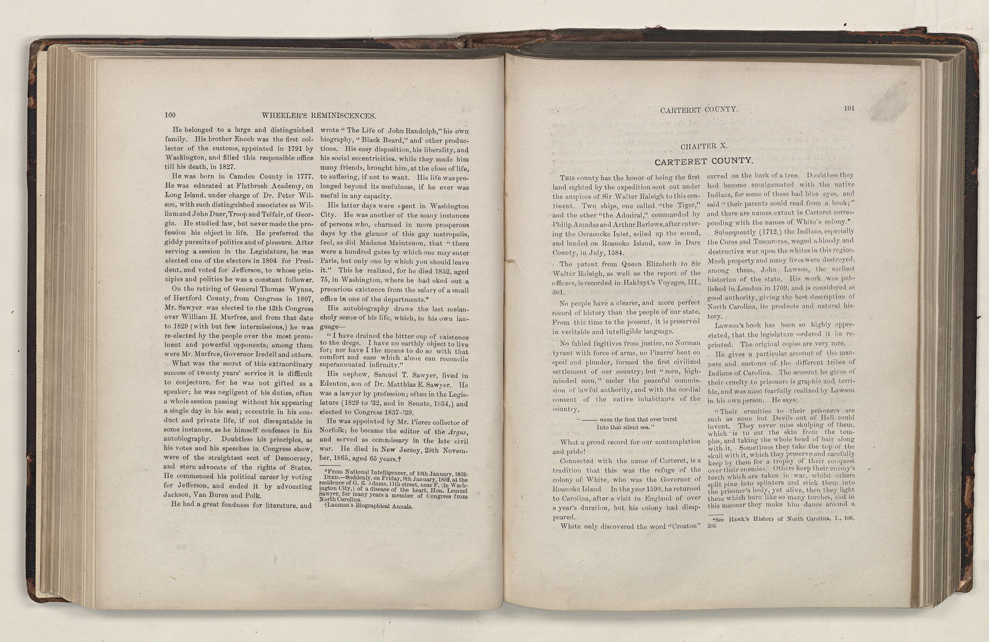 First land sighted by the English, 1584; the lost Colony of Governor White. Indian wars with the Cores and Tuscaroras; John Lawson, the first historian, murdered by them. Fort Hyde. Battle at Beaufort. Sketch of the life and services of Captian Otway Burns.